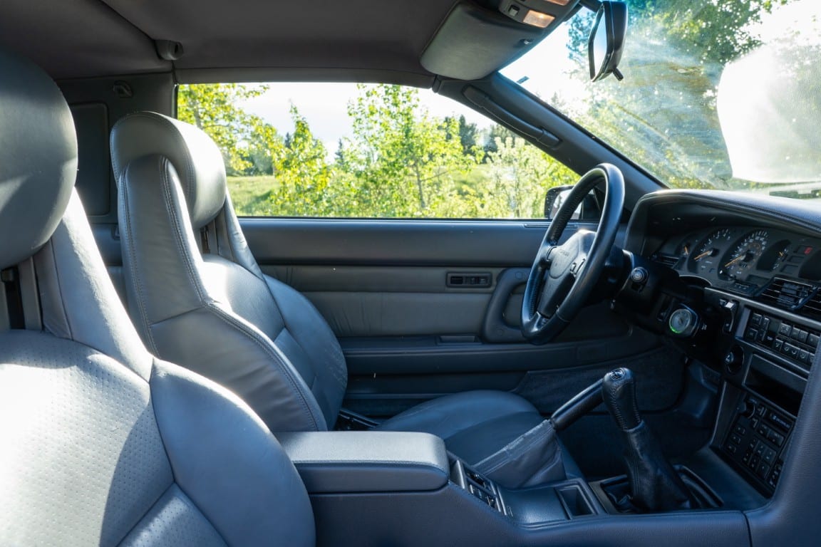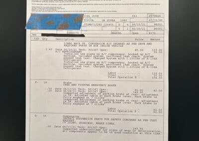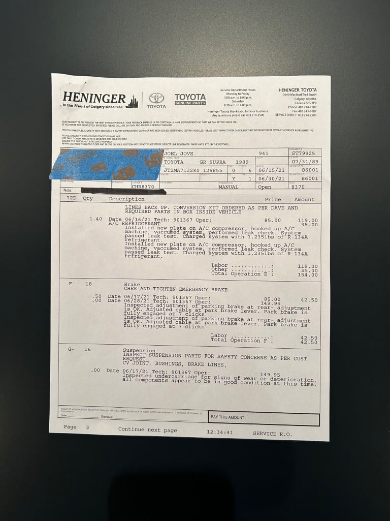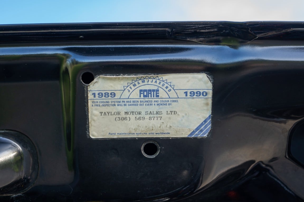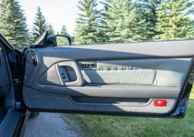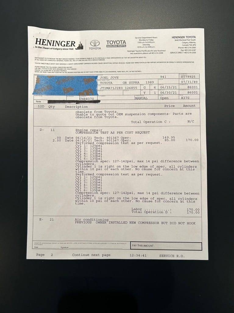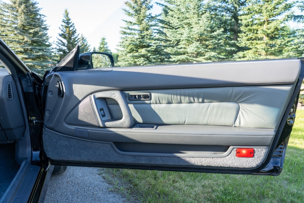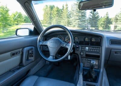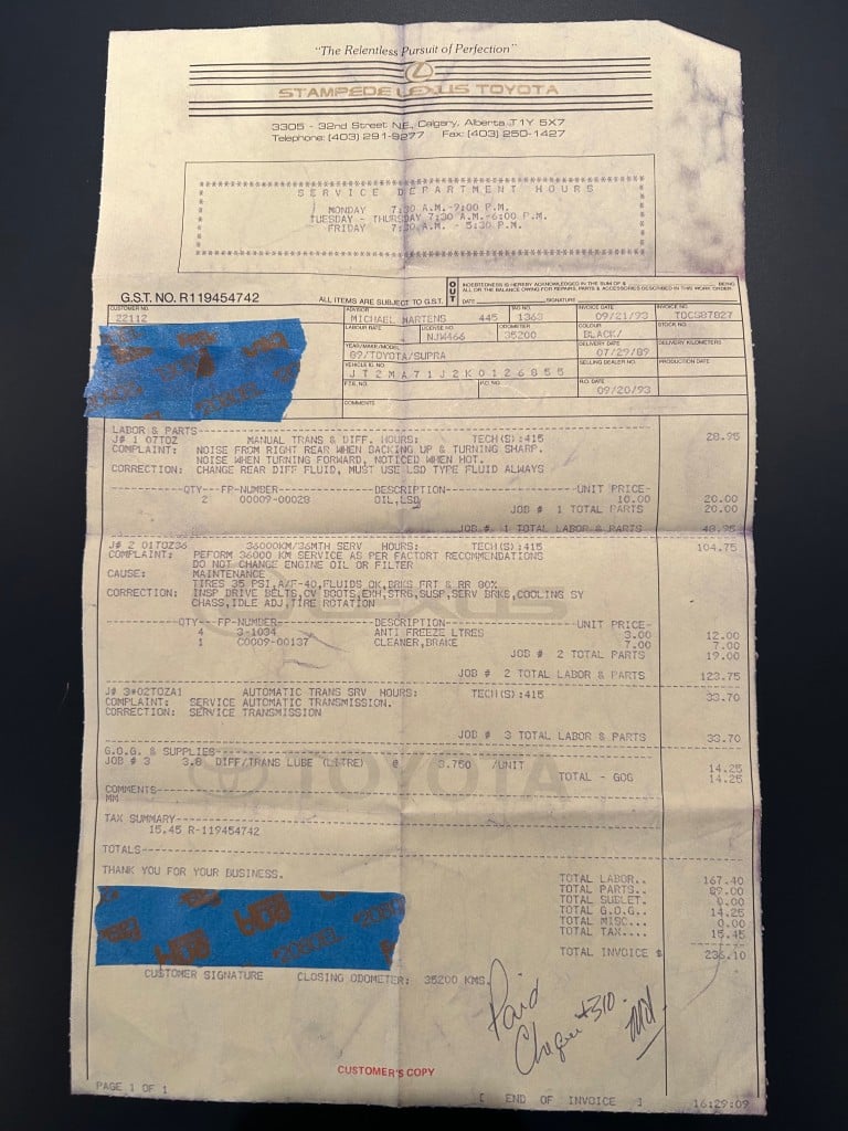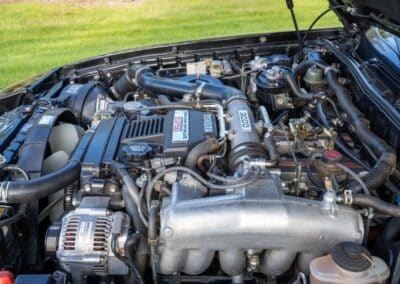 This Supra’s powerplant is a turbocharged 3.0-litre 24-valve inline six-cylinder engine, designated 7M-GTE by Toyota, producing a factory-rated 232 horsepower and 254 lb-ft of torque. It features electronic fuel injection and an air-to-air intercooler. Additional work performed approximately 17,000 kilometers ago under previous ownership includes a timing belt and head gasket replacement, along with an ARP head stud upgrade; confirmed replacement by Heninger Toyota in a 2021 vehicle service. Fluids changed at the time included power steering, transmission, differential and brake. A new A/C compressor installation and a conversion to R134A refrigerant was completed approximately 1500 kilometers ago under current ownership, along with the replacement of the valve cover gaskets and a compression test which are shown in the photo gallery.
