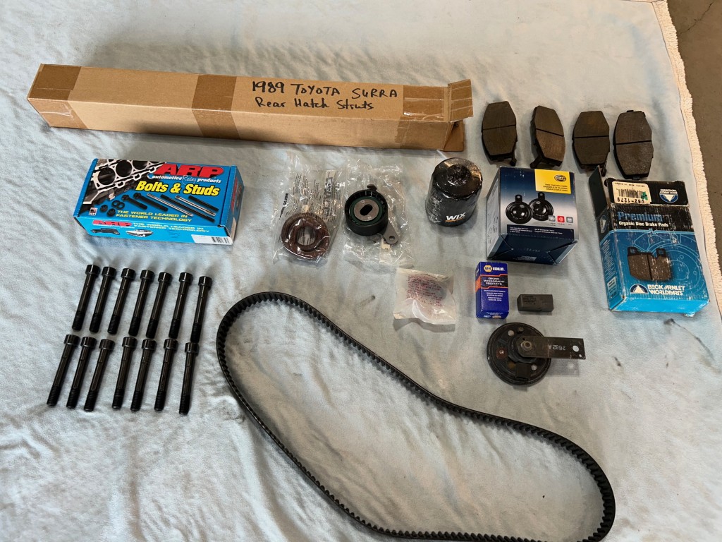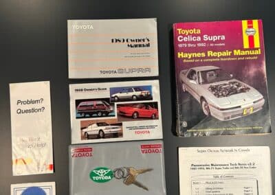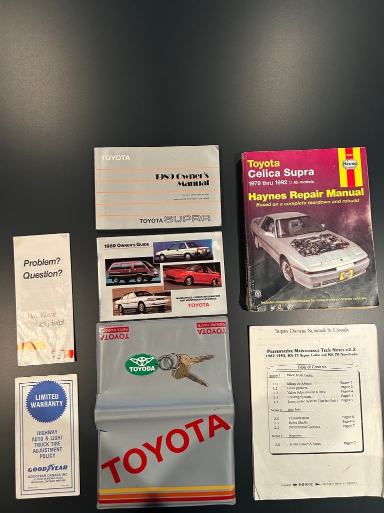 This 88K km 1989 Toyota Supra Turbo 5-Speed Sport Roof is offered by the seller with two keys, a removable Sport Roof panel, partial service records, spare parts, a spare tire, Supra floor mats, and factory manuals in Calgary, AB.