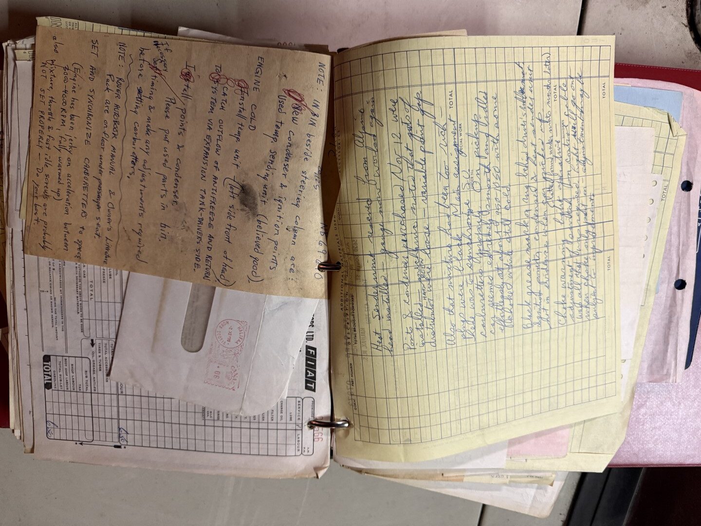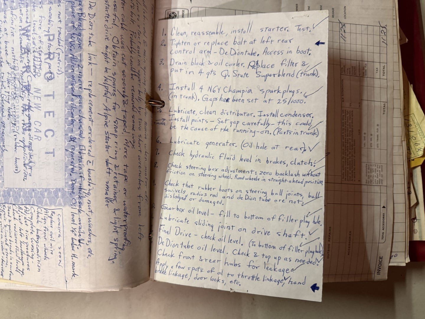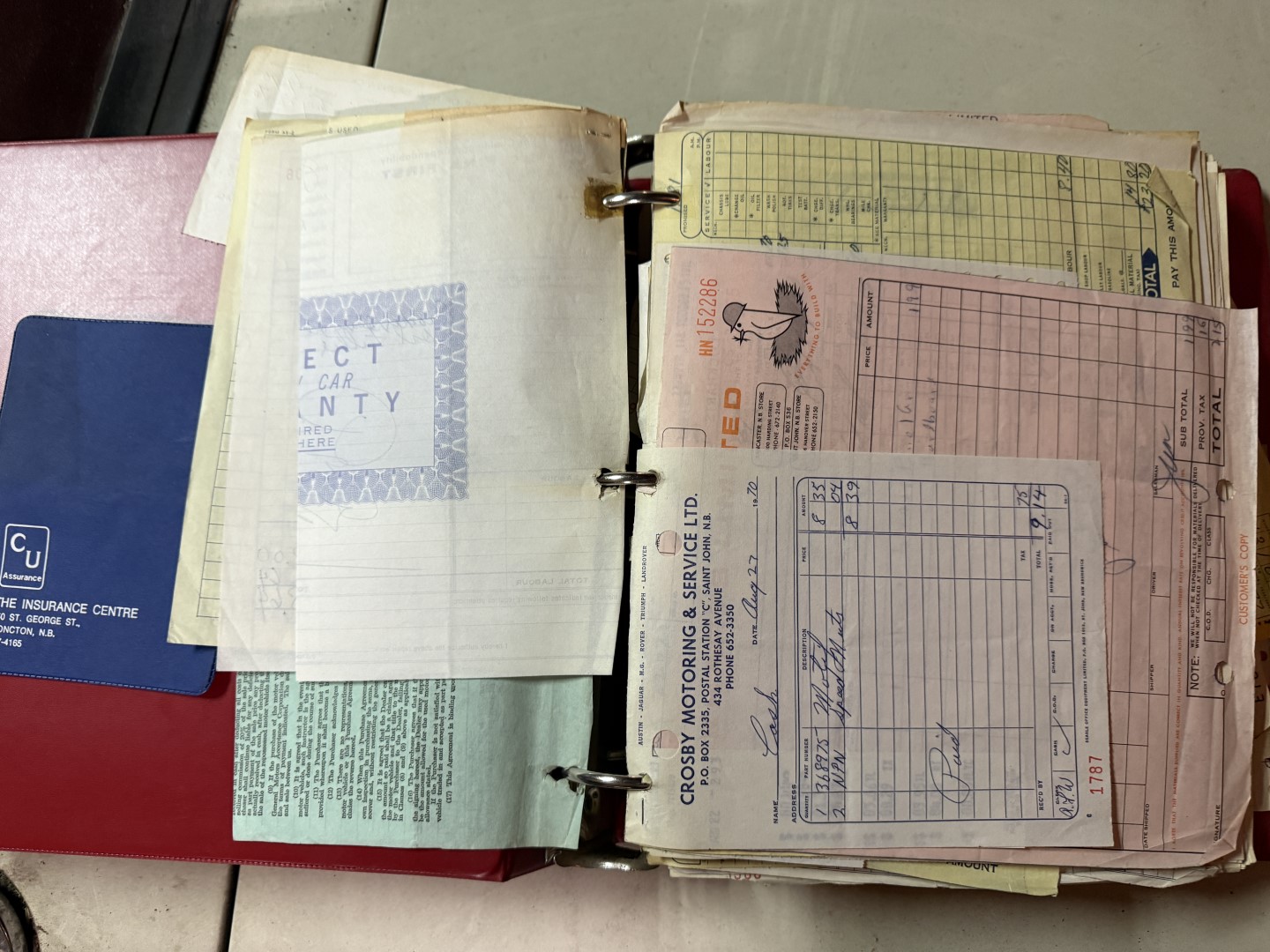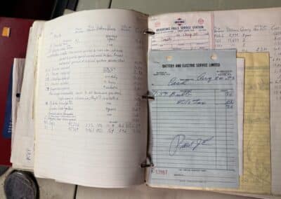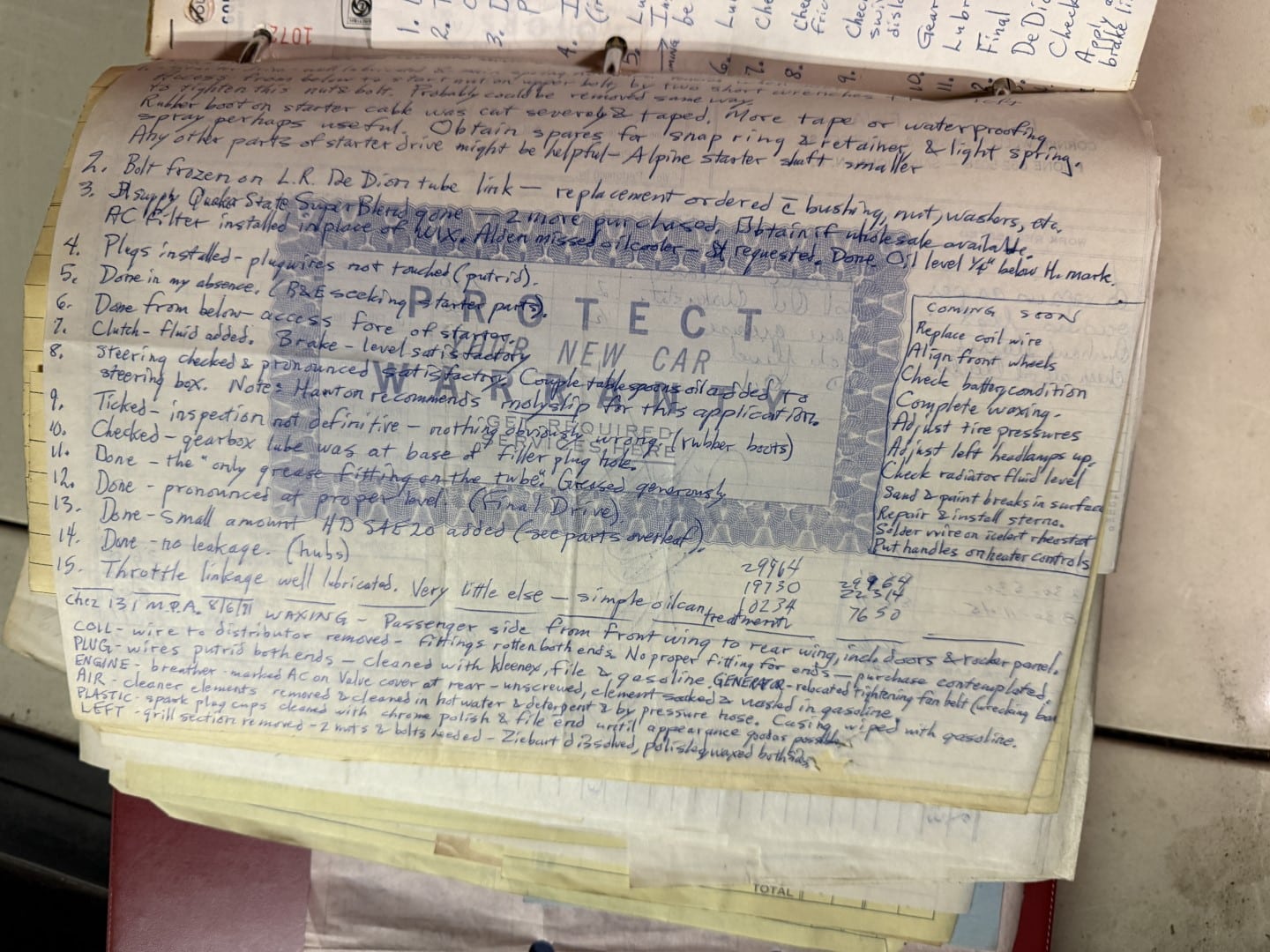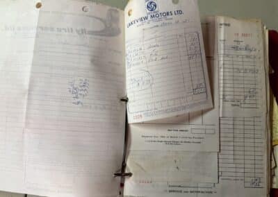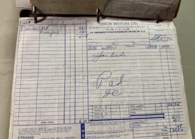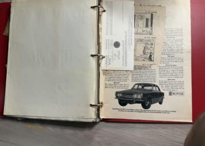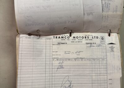 Power comes from a 2-litre single overhead cam inline-four equipped with twin SU carburetors and factory-rated at 124 HP at 5,500 RPM and 127 lb-ft of torque at 3,500 RPM. A four-speed manual gearbox with full synchromesh is complemented by rear wheel drive and a 3.54:1 final-drive ratio. The chassis employs De Dion rear suspension and was among the first production sedans to feature hydraulic servo-assisted disc brakes at all four corners. The five-digit odometer shows under 13,000 miles, though the total milage is unknown (TMU). The sale includes a binder of photographs and handwritten service records documenting decades of ownership by the seller. Additional notes cover routine servicing, fuel consumption, and seasonal driving, illustrating a long history of careful stewardship.
