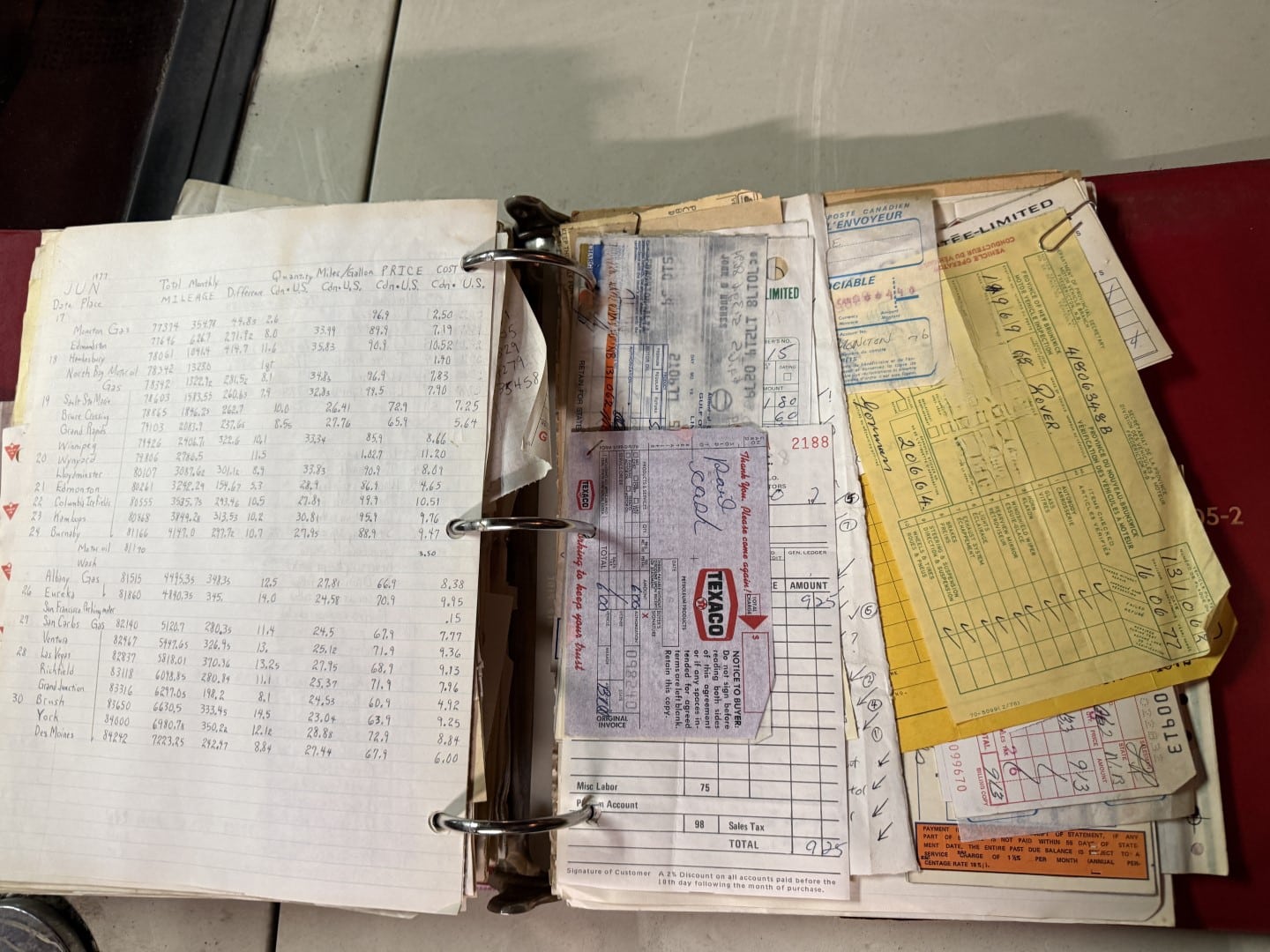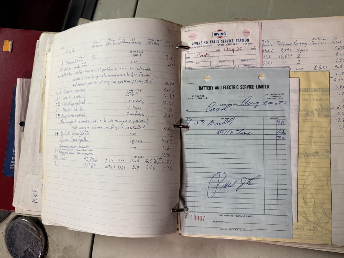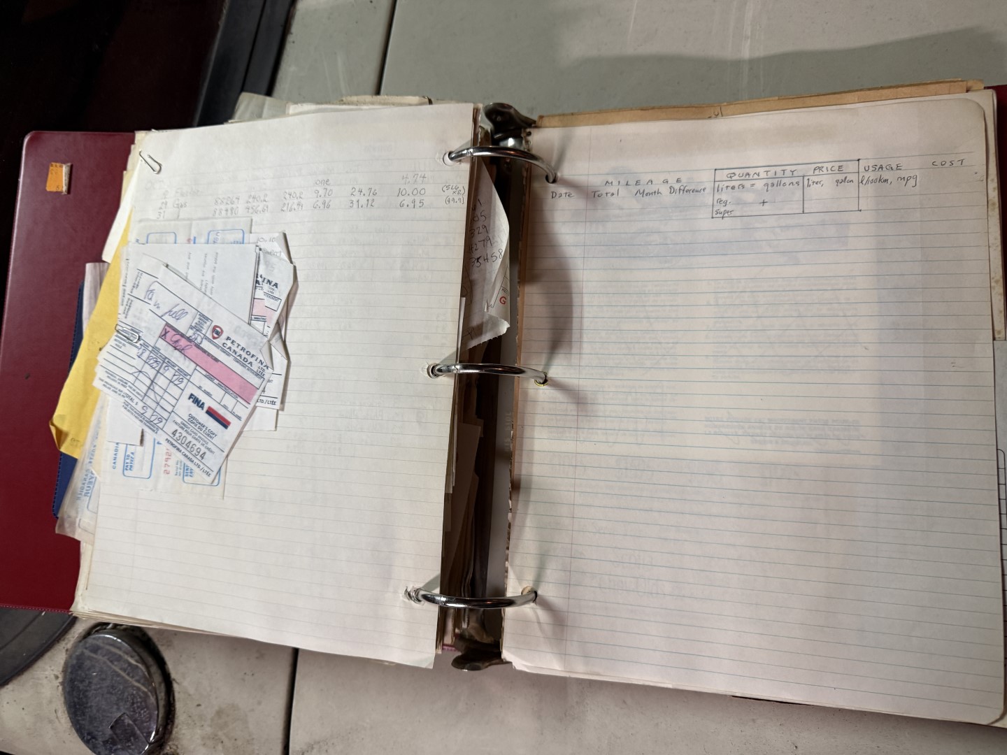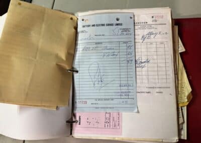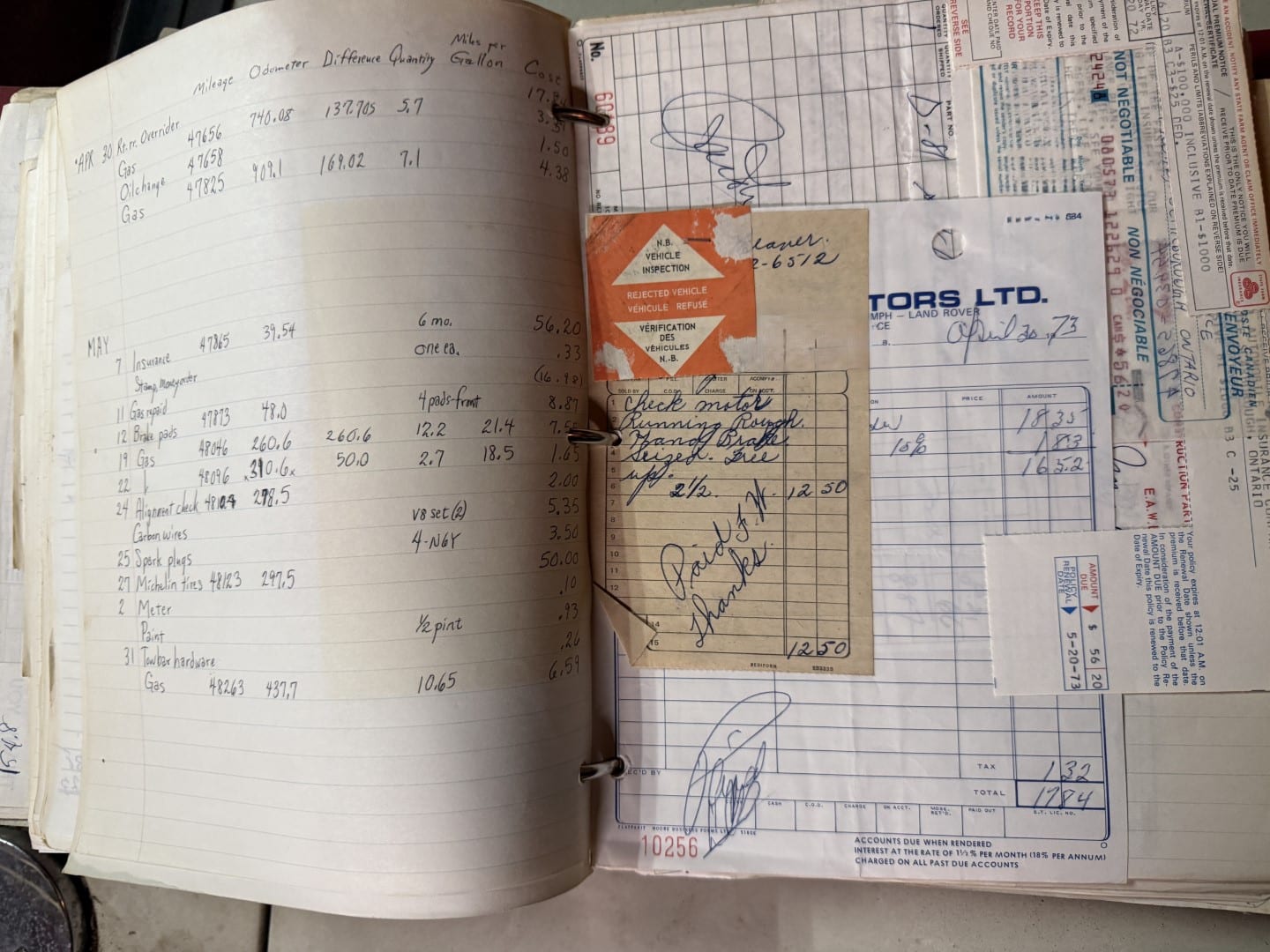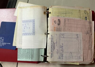 Power comes from a 2-litre single overhead cam inline-four equipped with twin SU carburetors and factory-rated at 124 HP at 5,500 RPM and 127 lb-ft of torque at 3,500 RPM. A four-speed manual gearbox with full synchromesh is complemented by rear wheel drive and a 3.54:1 final-drive ratio. The chassis employs De Dion rear suspension and was among the first production sedans to feature hydraulic servo-assisted disc brakes at all four corners. The five-digit odometer shows under 13,000 miles, though the total milage is unknown (TMU). The sale includes a binder of photographs and handwritten service records documenting decades of ownership by the seller. Additional notes cover routine servicing, fuel consumption, and seasonal driving, illustrating a long history of careful stewardship.