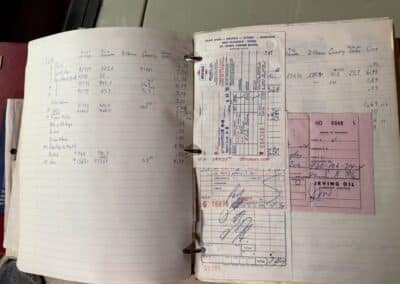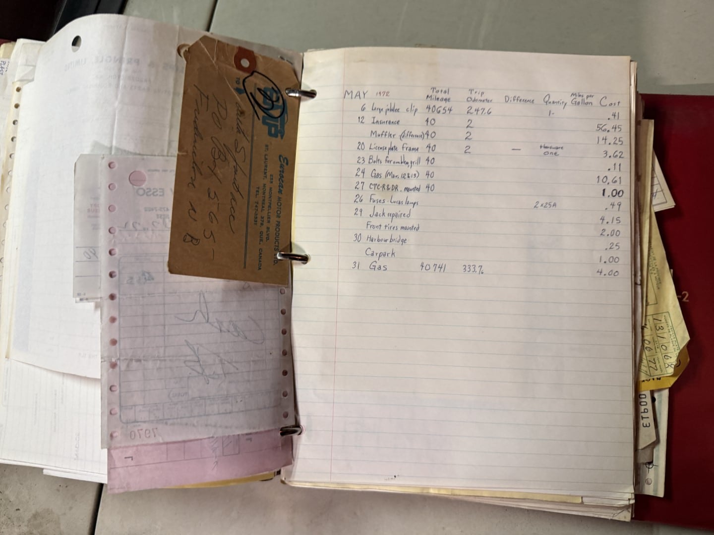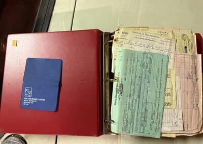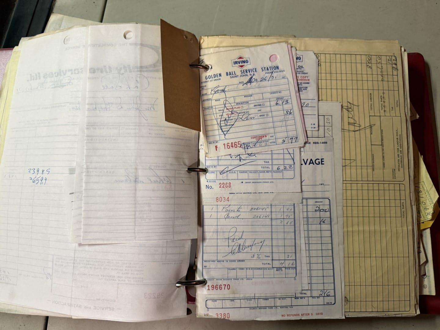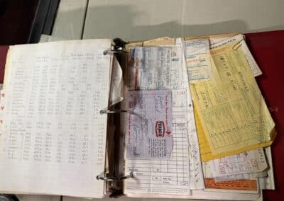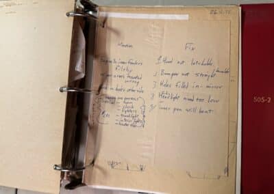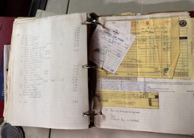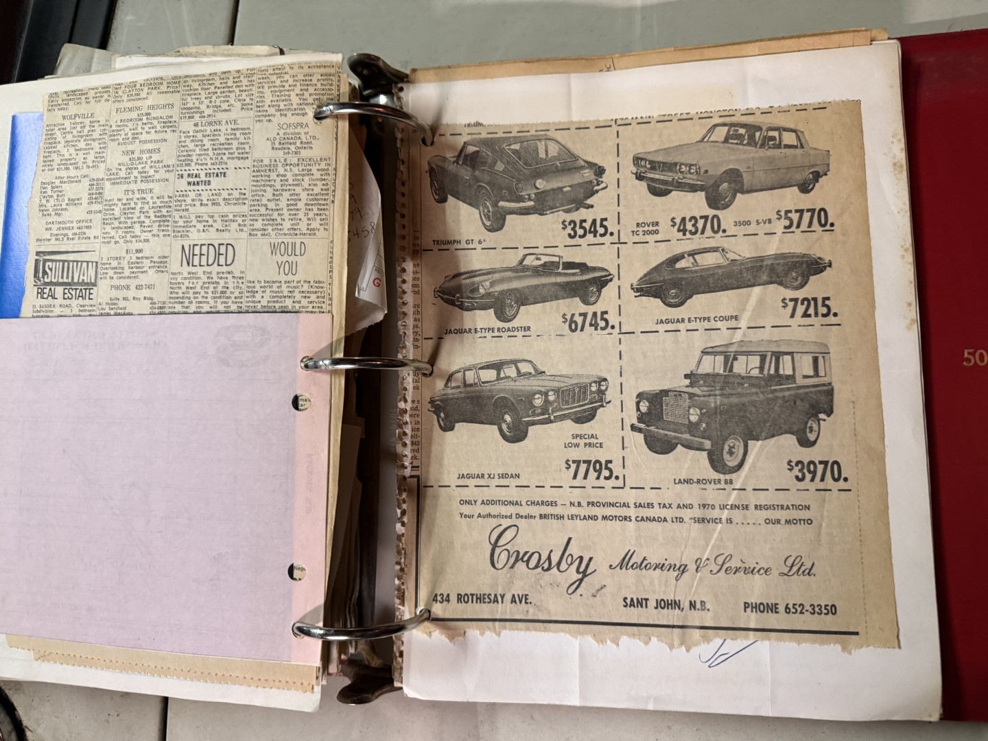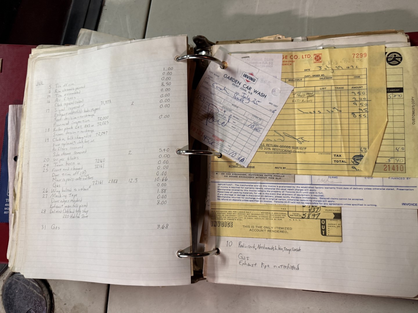 Power comes from a 2-litre single overhead cam inline-four equipped with twin SU carburetors and factory-rated at 124 HP at 5,500 RPM and 127 lb-ft of torque at 3,500 RPM. A four-speed manual gearbox with full synchromesh is complemented by rear wheel drive and a 3.54:1 final-drive ratio. The chassis employs De Dion rear suspension and was among the first production sedans to feature hydraulic servo-assisted disc brakes at all four corners. The five-digit odometer shows under 13,000 miles, though the total milage is unknown (TMU). The sale includes a binder of photographs and handwritten service records documenting decades of ownership by the seller. Additional notes cover routine servicing, fuel consumption, and seasonal driving, illustrating a long history of careful stewardship.