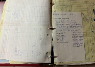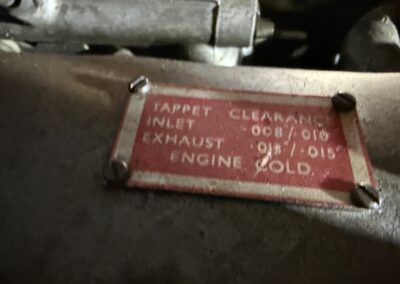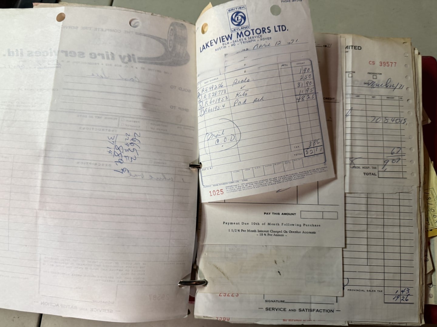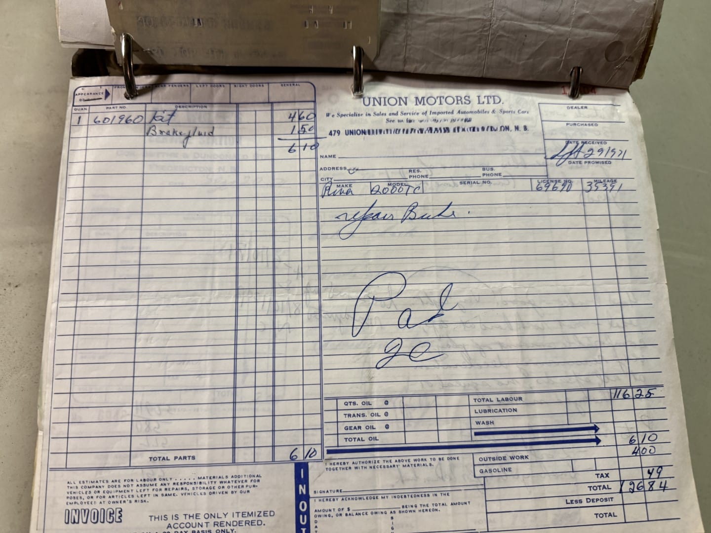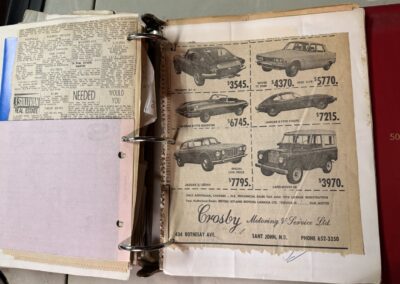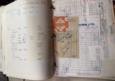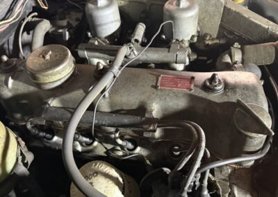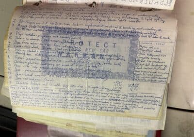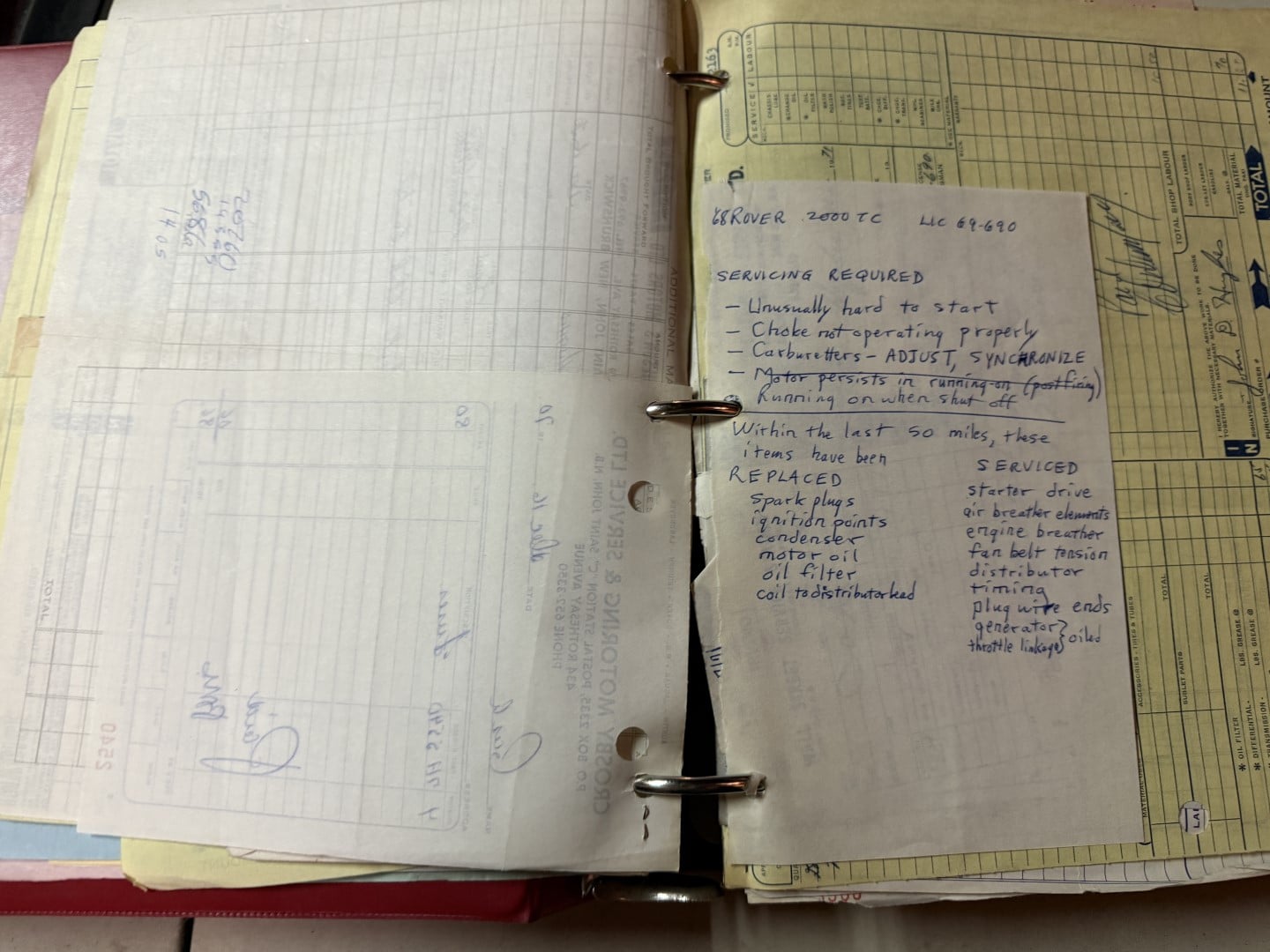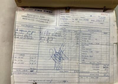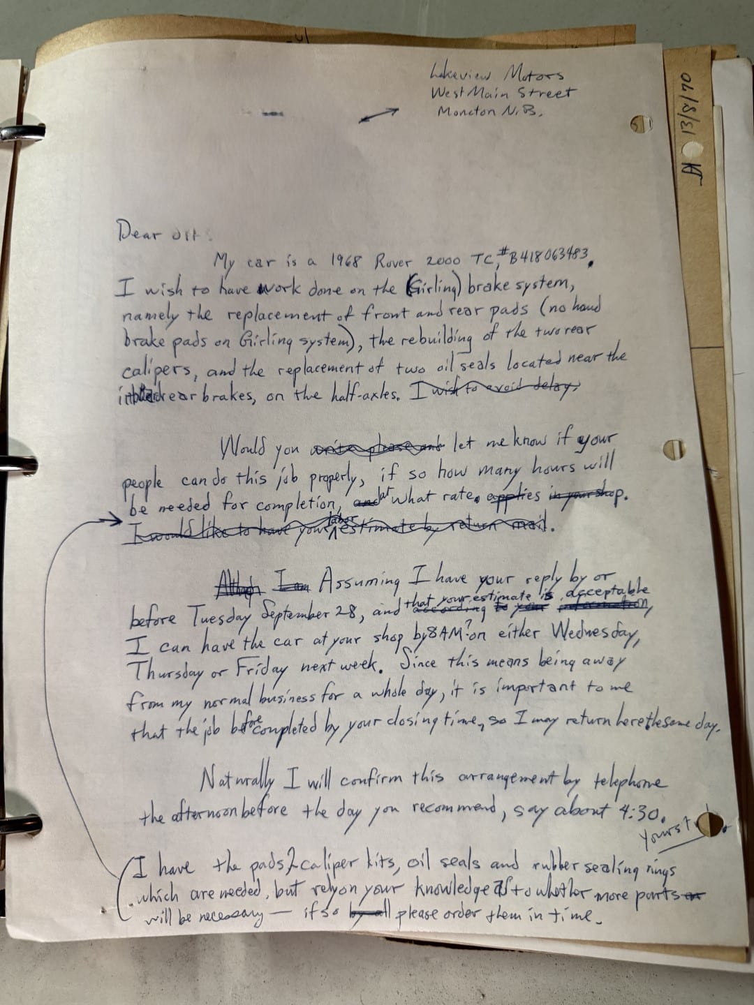 Power comes from a 2-litre single overhead cam inline-four equipped with twin SU carburetors and factory-rated at 124 HP at 5,500 RPM and 127 lb-ft of torque at 3,500 RPM. A four-speed manual gearbox with full synchromesh is complemented by rear wheel drive and a 3.54:1 final-drive ratio. The chassis employs De Dion rear suspension and was among the first production sedans to feature hydraulic servo-assisted disc brakes at all four corners. The five-digit odometer shows under 13,000 miles, though the total milage is unknown (TMU). The sale includes a binder of photographs and handwritten service records documenting decades of ownership by the seller. Additional notes cover routine servicing, fuel consumption, and seasonal driving, illustrating a long history of careful stewardship.