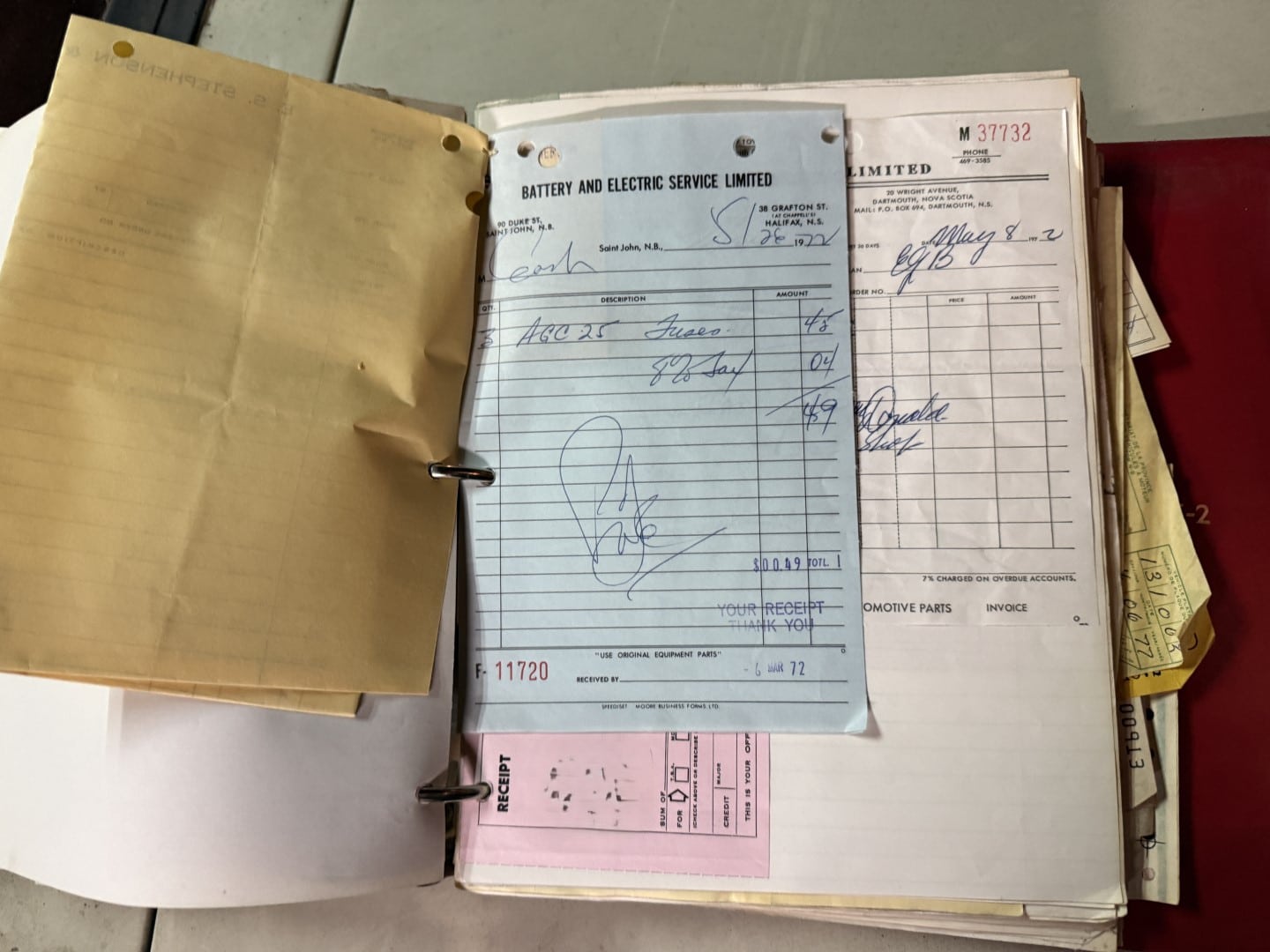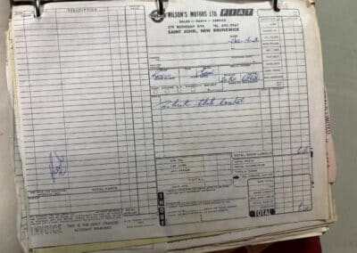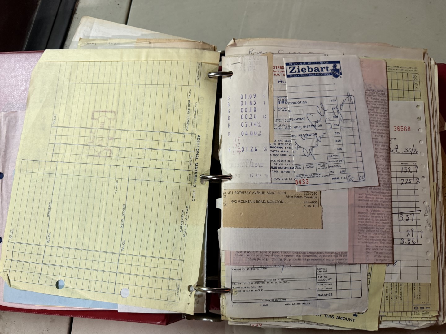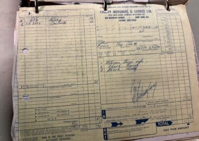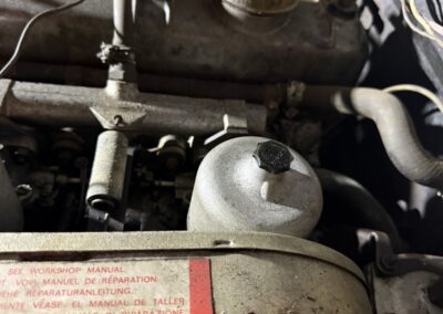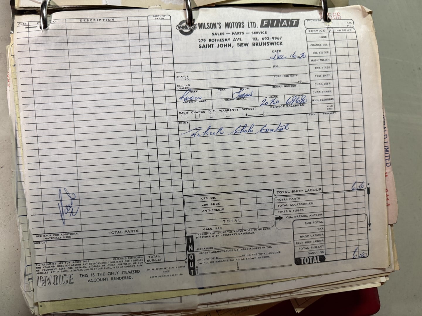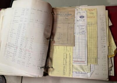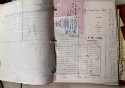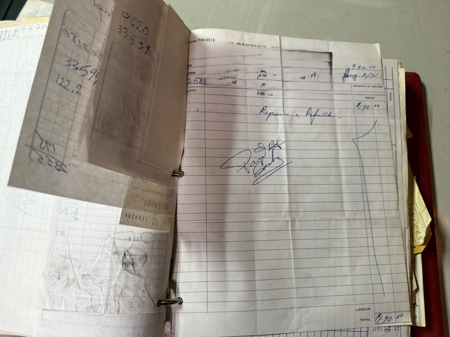 Power comes from a 2-litre single overhead cam inline-four equipped with twin SU carburetors and factory-rated at 124 HP at 5,500 RPM and 127 lb-ft of torque at 3,500 RPM. A four-speed manual gearbox with full synchromesh is complemented by rear wheel drive and a 3.54:1 final-drive ratio. The chassis employs De Dion rear suspension and was among the first production sedans to feature hydraulic servo-assisted disc brakes at all four corners. The five-digit odometer shows under 13,000 miles, though the total milage is unknown (TMU). The sale includes a binder of photographs and handwritten service records documenting decades of ownership by the seller. Additional notes cover routine servicing, fuel consumption, and seasonal driving, illustrating a long history of careful stewardship.