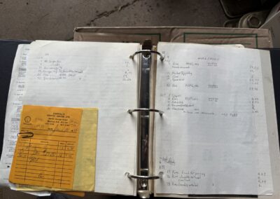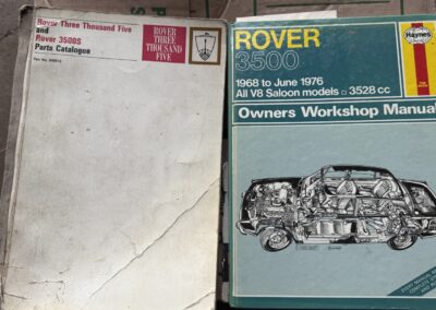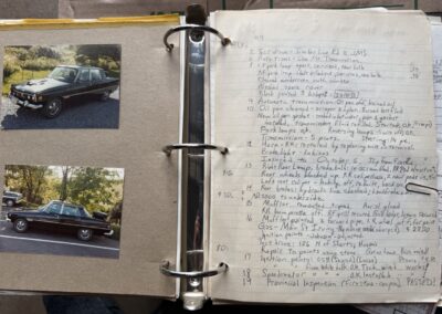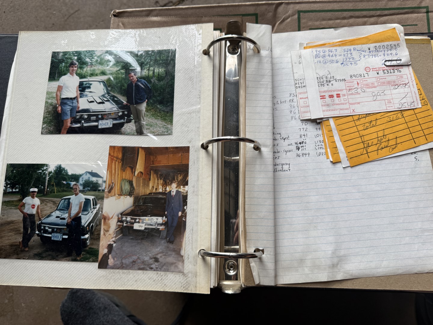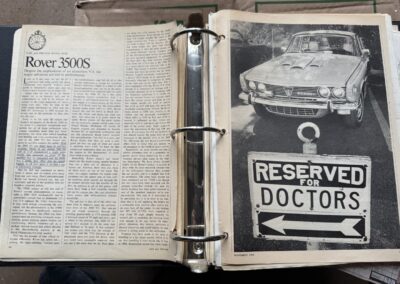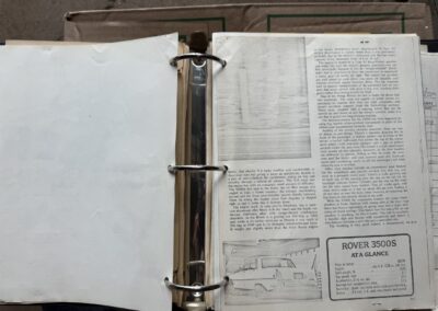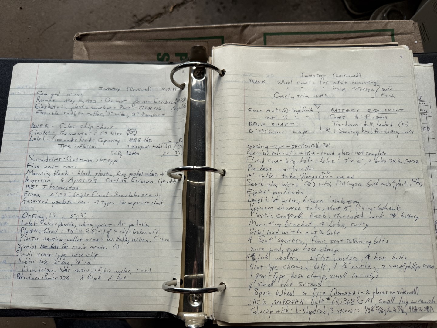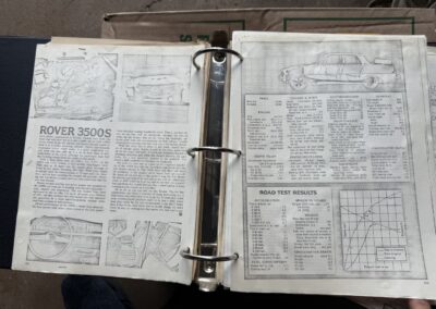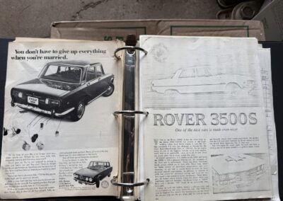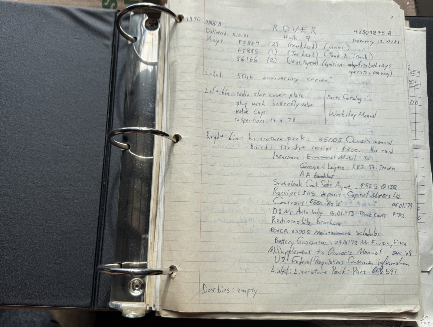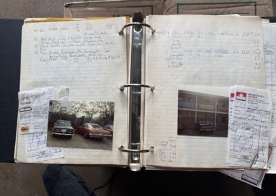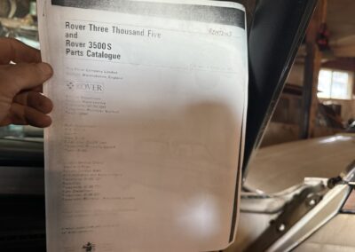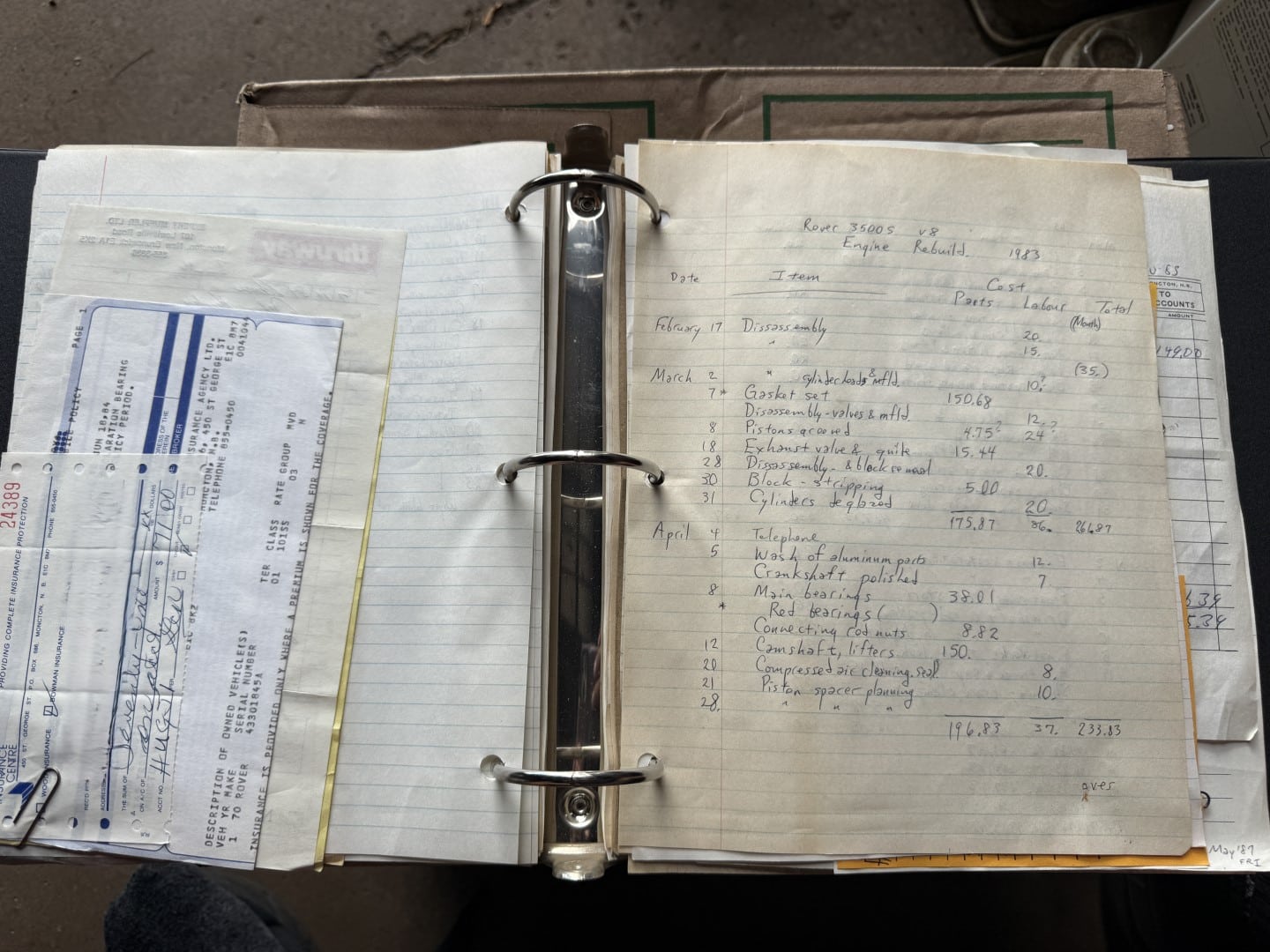 The original aluminum 3.5-litre overhead-valve V8 is in place, having produced 210 lb-ft of torque at 3,000 RPM out of the factory. Induction is via twin SU carburetors, and power is sento the rear wheels via a 3.08:1 limited-slip differential. The V8 sits cleanly in the engine bay with space for maintenance access. Accompanying the sale is a binder with ownership records dating back to the ‘70s. It highlights a complete engine rebuild in 1983, documented with detailed handwritten notes, receipts and period photographs.