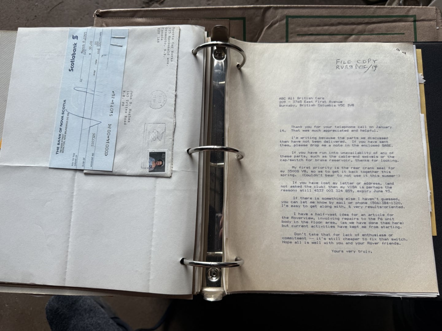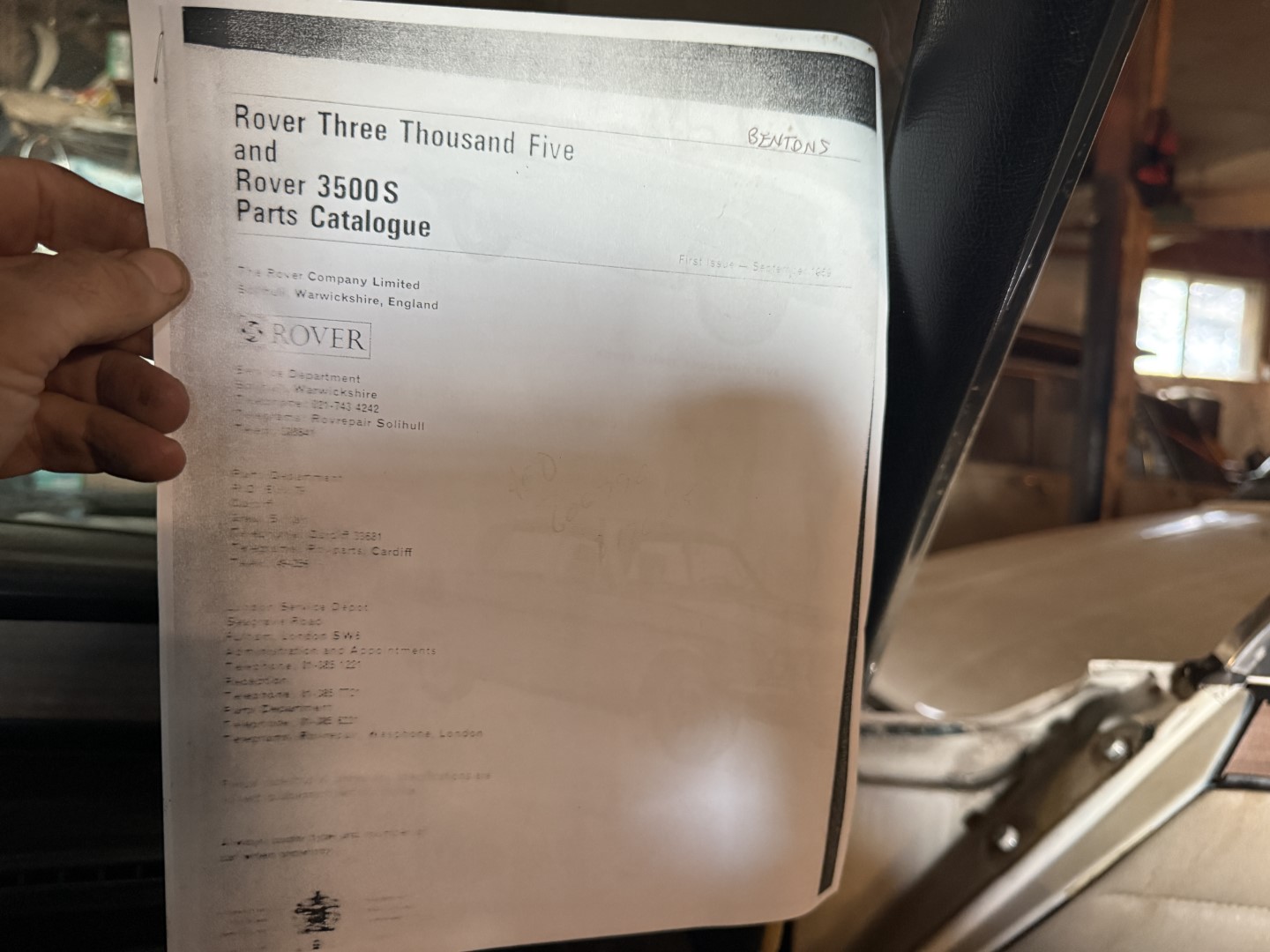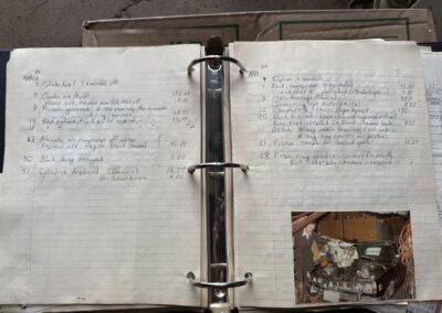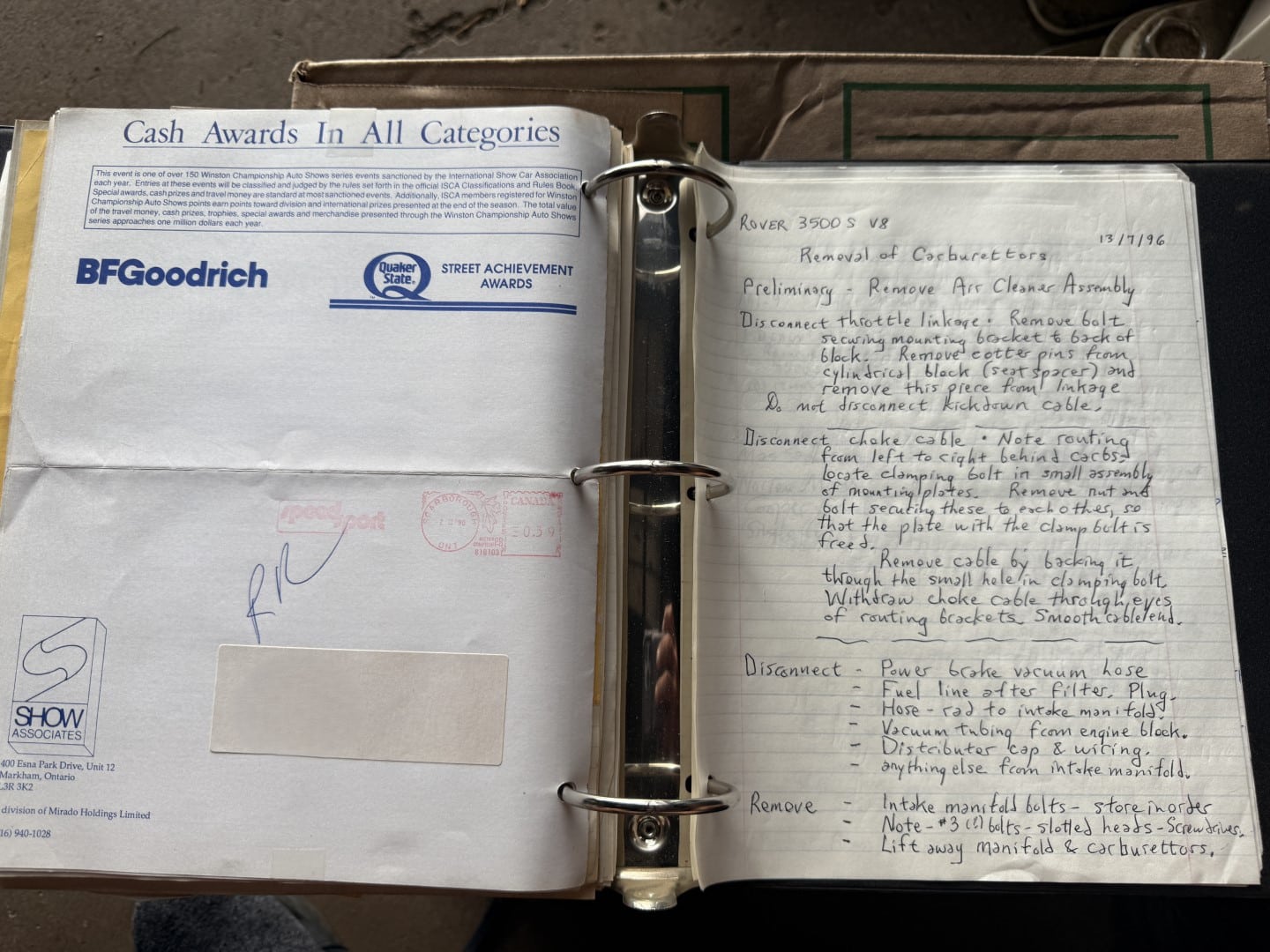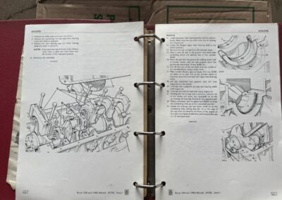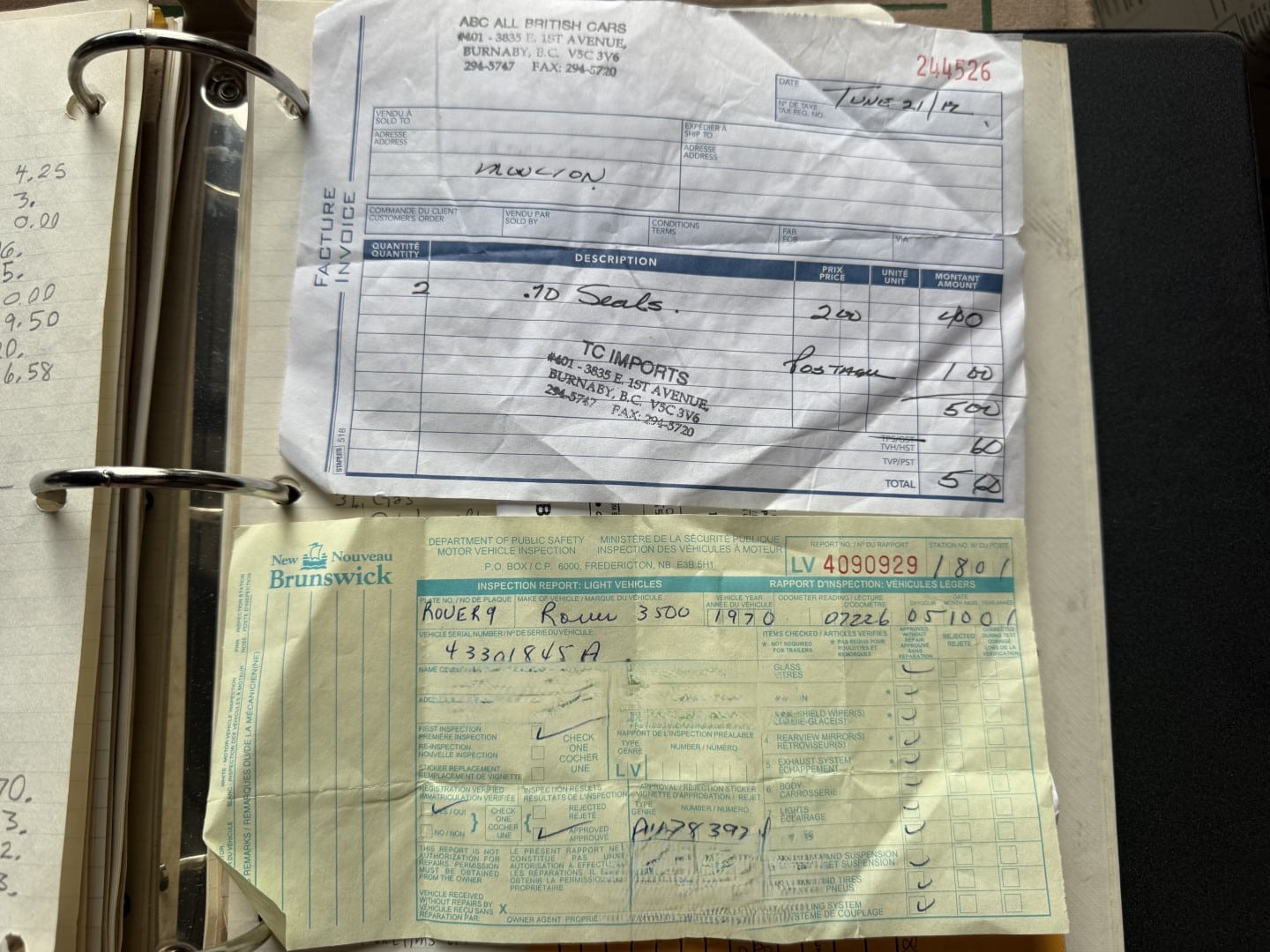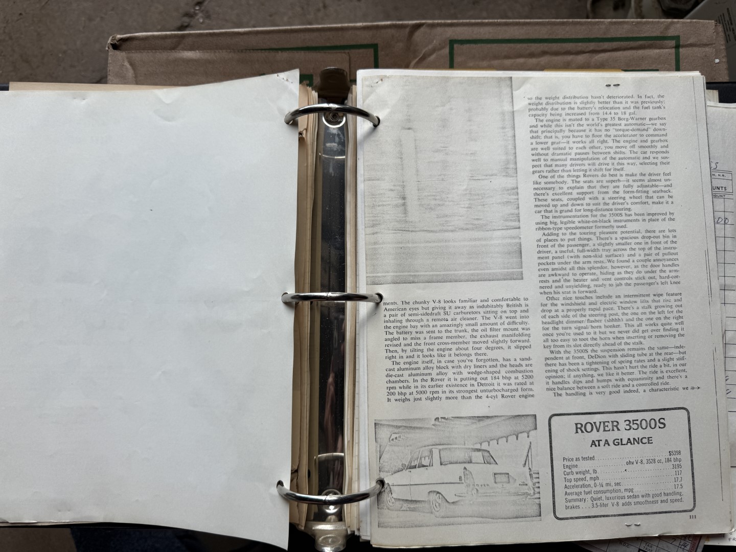 The original aluminum 3.5-litre overhead-valve V8 is in place, having produced 210 lb-ft of torque at 3,000 RPM out of the factory. Induction is via twin SU carburetors, and power is sento the rear wheels via a 3.08:1 limited-slip differential. The V8 sits cleanly in the engine bay with space for maintenance access. Accompanying the sale is a binder with ownership records dating back to the ‘70s. It highlights a complete engine rebuild in 1983, documented with detailed handwritten notes, receipts and period photographs.