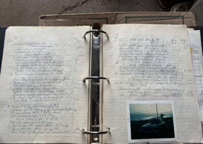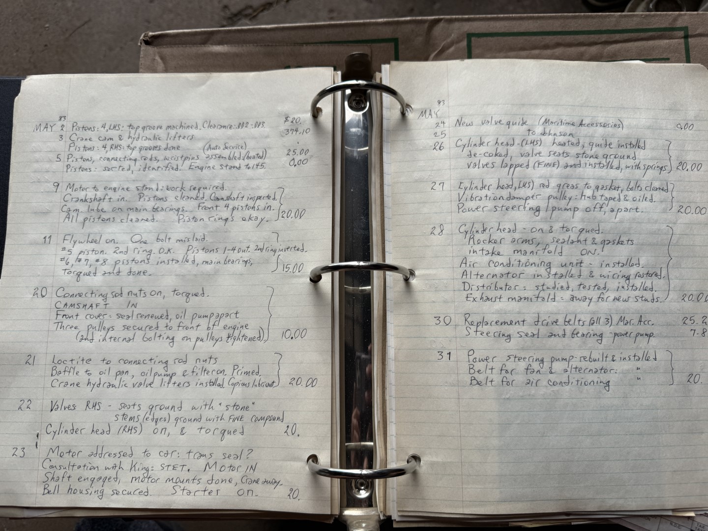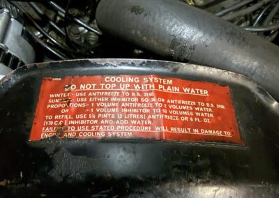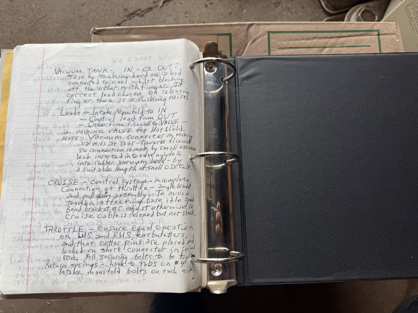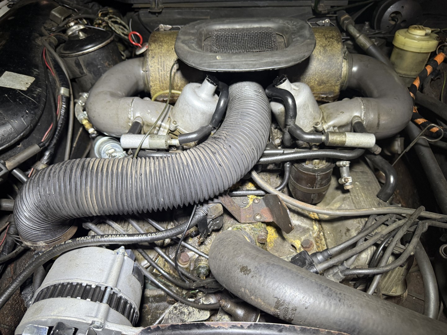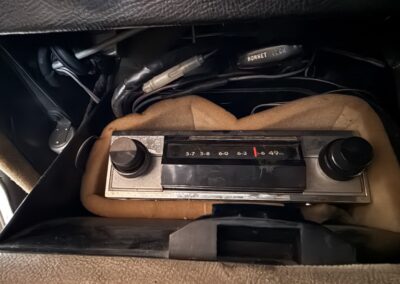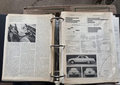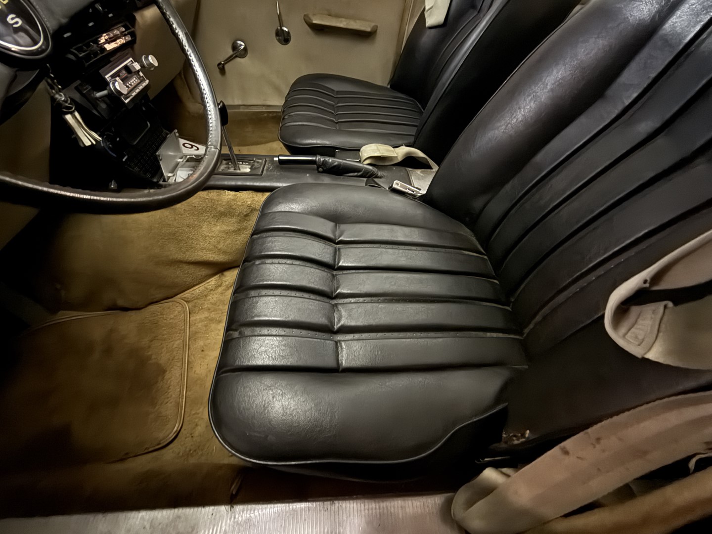 The original aluminum 3.5-litre overhead-valve V8 is in place, having produced 210 lb-ft of torque at 3,000 RPM out of the factory. Induction is via twin SU carburetors, and power is sento the rear wheels via a 3.08:1 limited-slip differential. The V8 sits cleanly in the engine bay with space for maintenance access. Accompanying the sale is a binder with ownership records dating back to the ‘70s. It highlights a complete engine rebuild in 1983, documented with detailed handwritten notes, receipts and period photographs.