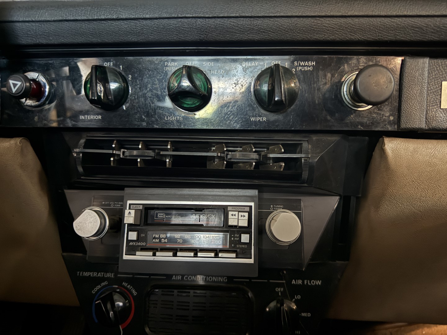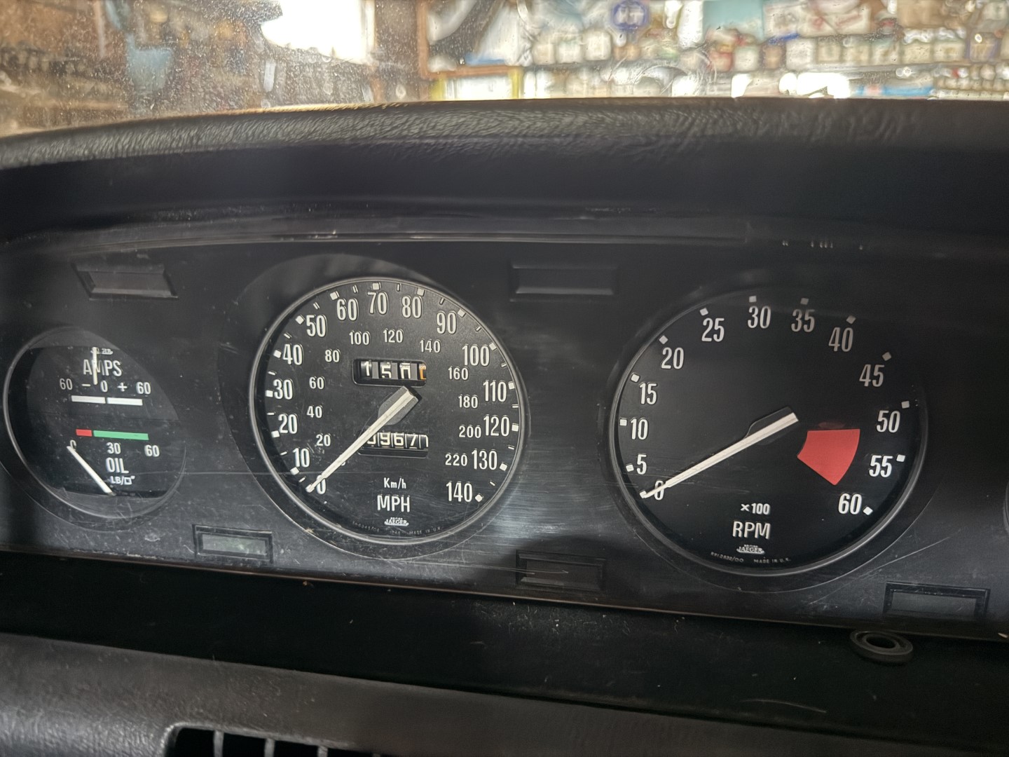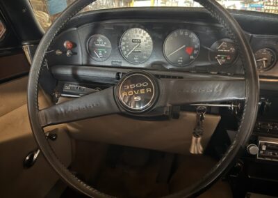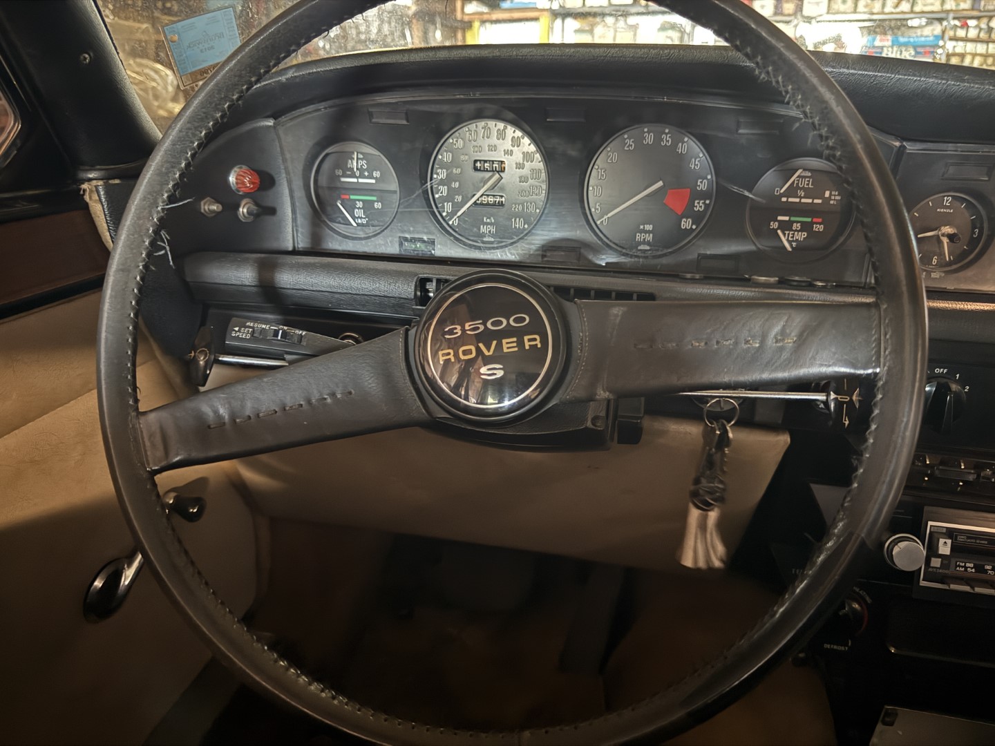Inside, front bucket seats are trimmed in black leather with tan headrests and matching sand-coloured door cards that carry wood-veneer cappings. A wood-veneer dashboard is in place while the wooden centre console houses a floor-mounted shifter for the three-speed automatic gearbox. Equipment includes an AM/FM radio, manual windows, leather-wrapped adjustable two-spoke steering wheel with central Rover 3500 S emblem, and adjustable front seats. Instrumentation consists of a 140 MPH speedometer, a 6,000 RPM tachometer with a 5,200 RPM redline, and a five-digit odometer that shows under 10,000 miles (TMU).