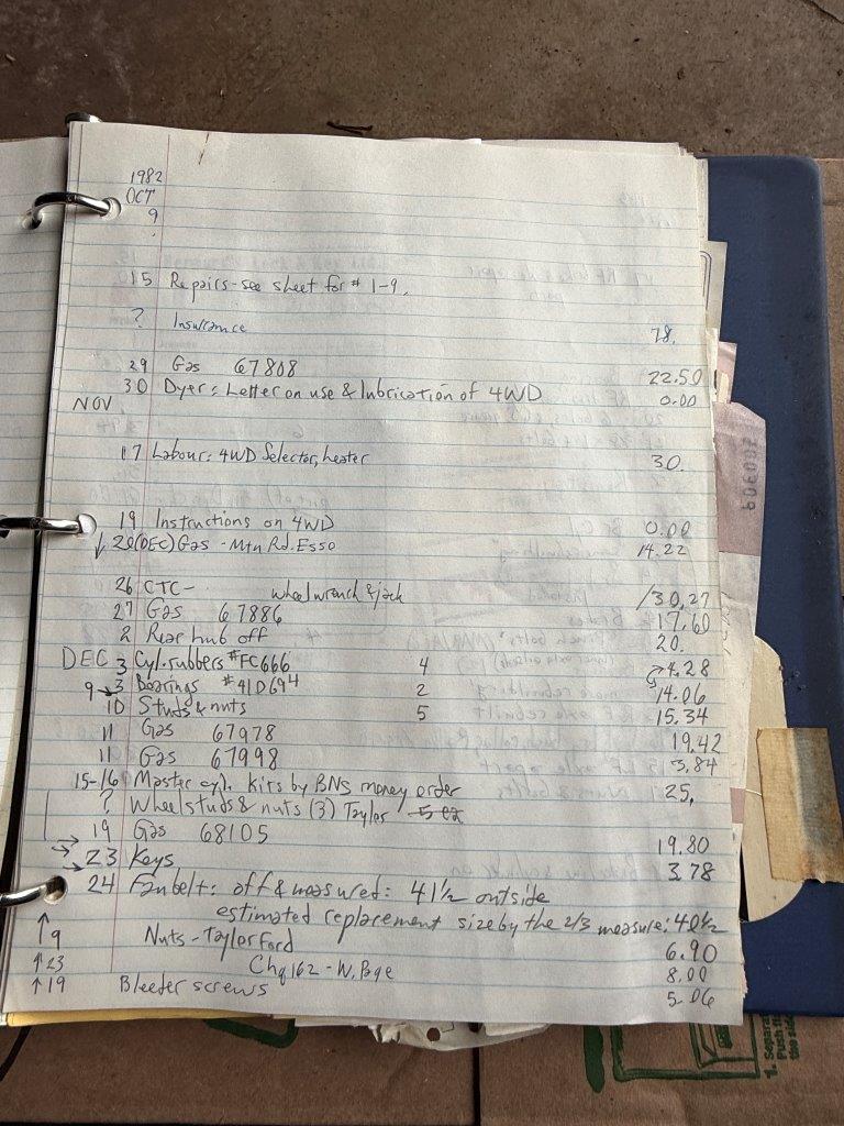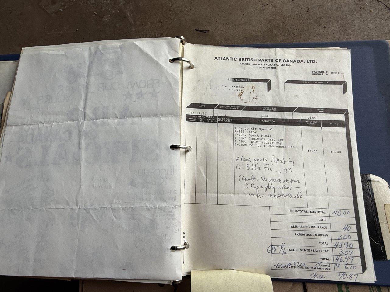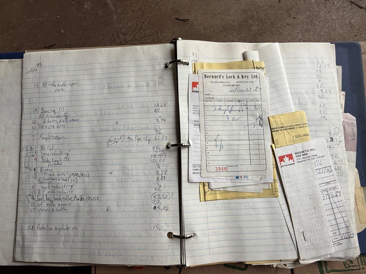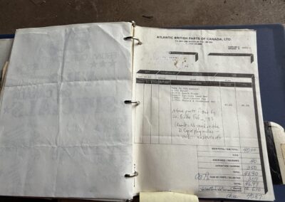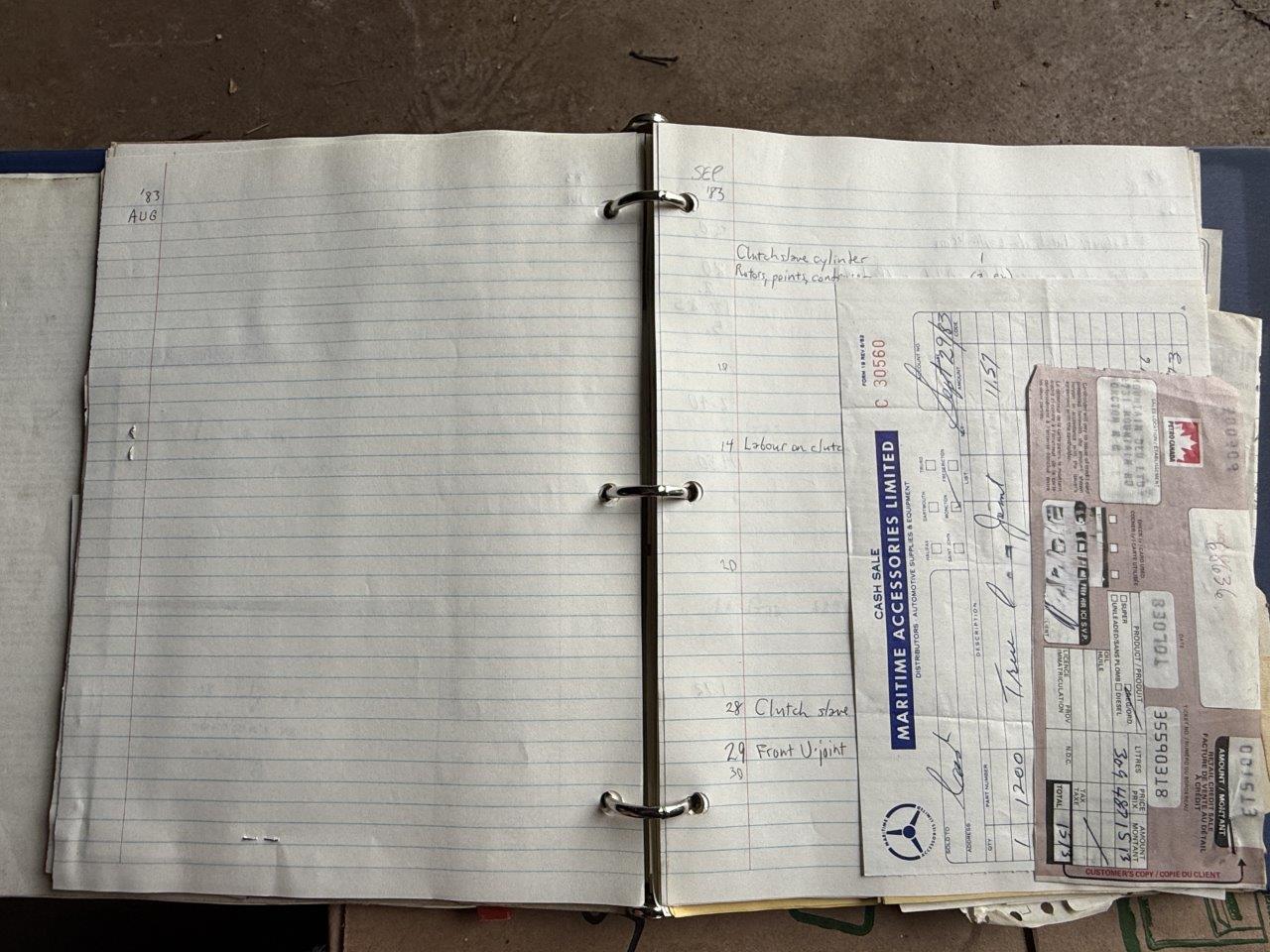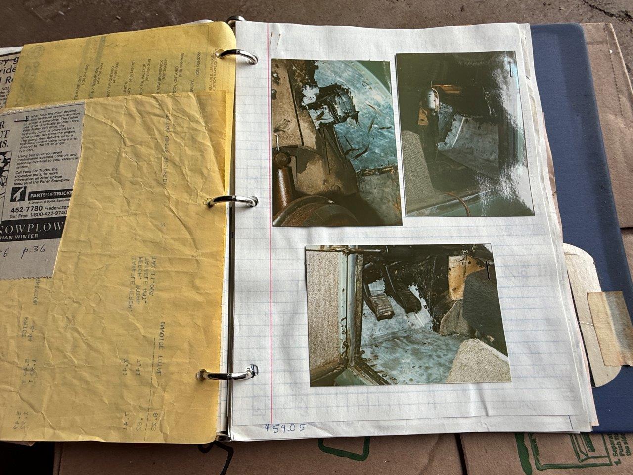 Power comes from a 2.3-litre gasoline inline-four (engine no. 307003344) paired with a four-speed manual gearbox, getting power to the rear or all four wheels, depending on how the dual range transfer case with locking hubs is set. The vehicle’s long-stored condition and lack of battery imply that mechanical status is unknown; buyers should plan for inspection and recommissioning before road use. The book of records includes photos of the vehicle when purchased from the previous owner, a sign of seller’s excitement at time of purchase. Other records include literature, seller notes, correspondence to various parts suppliers.