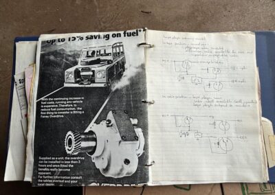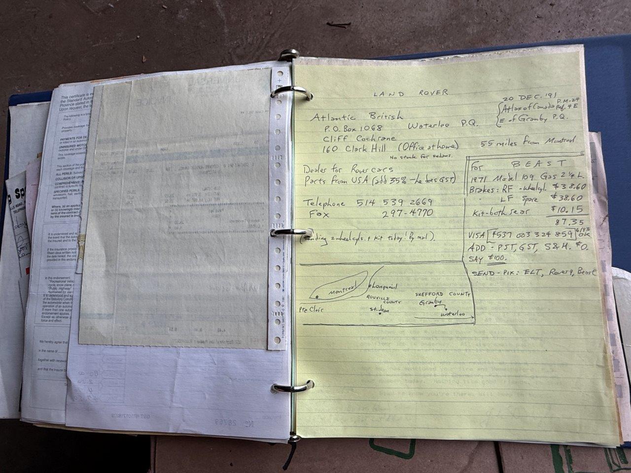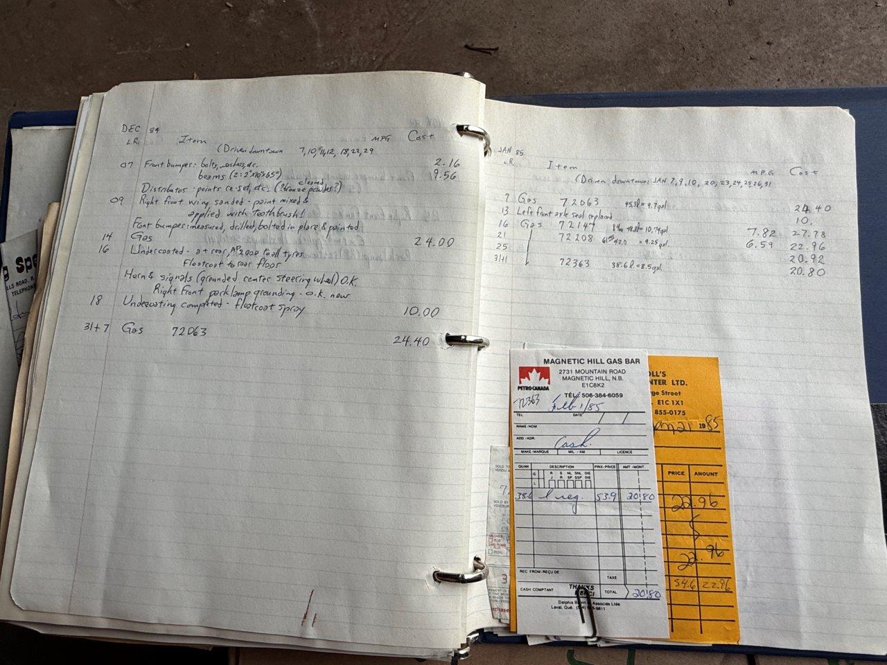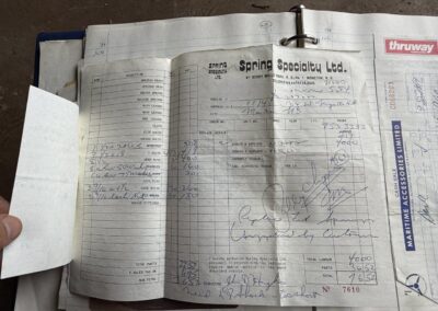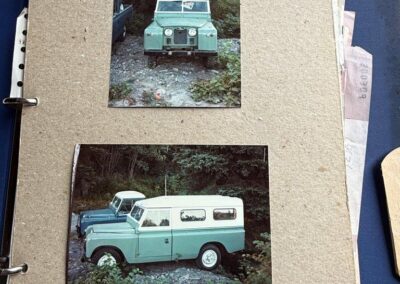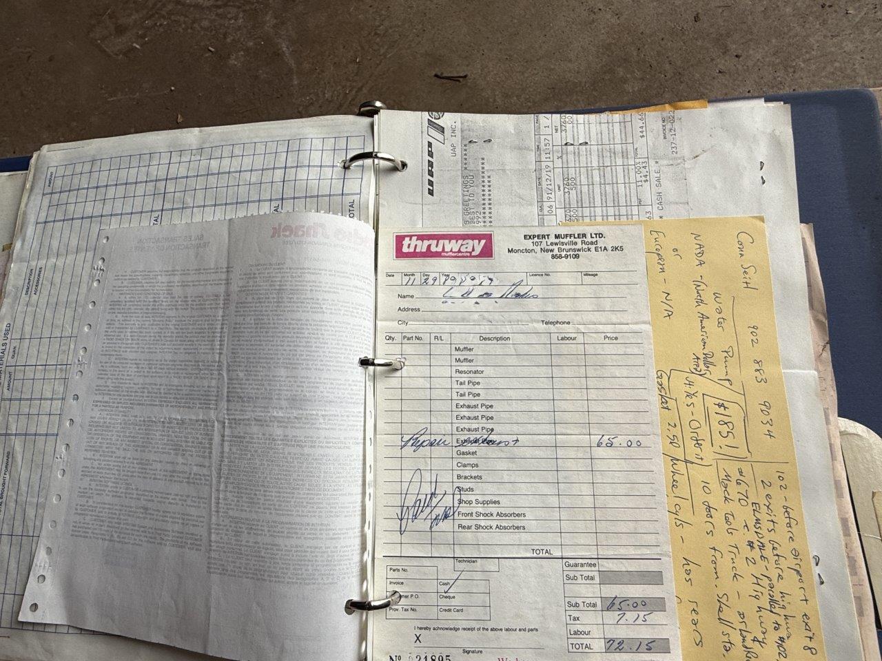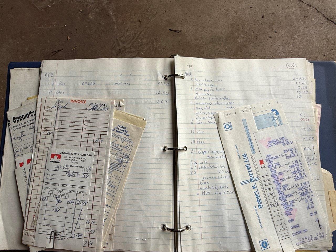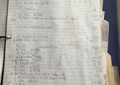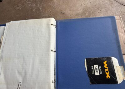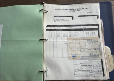 Power comes from a 2.3-litre gasoline inline-four (engine no. 307003344) paired with a four-speed manual gearbox, getting power to the rear or all four wheels, depending on how the dual range transfer case with locking hubs is set. The vehicle’s long-stored condition and lack of battery imply that mechanical status is unknown; buyers should plan for inspection and recommissioning before road use. The book of records includes photos of the vehicle when purchased from the previous owner, a sign of seller’s excitement at time of purchase. Other records include literature, seller notes, correspondence to various parts suppliers.