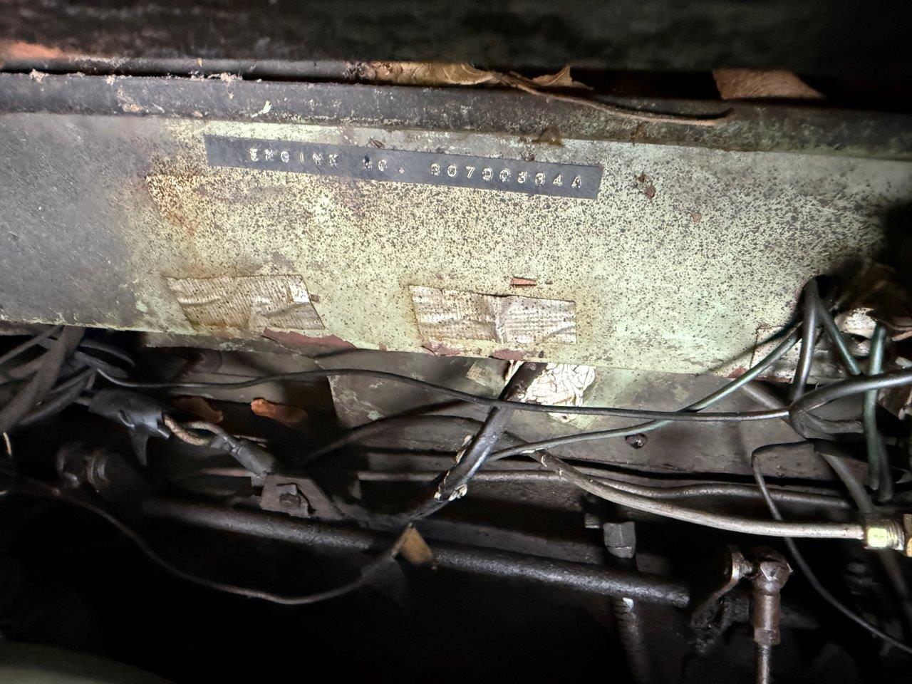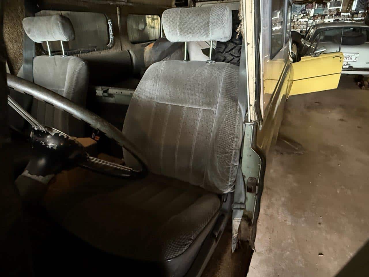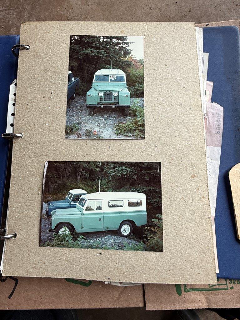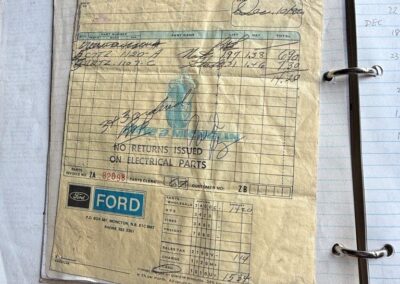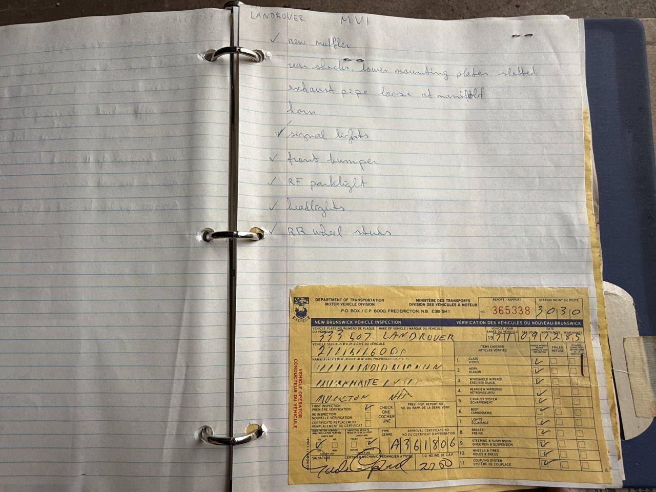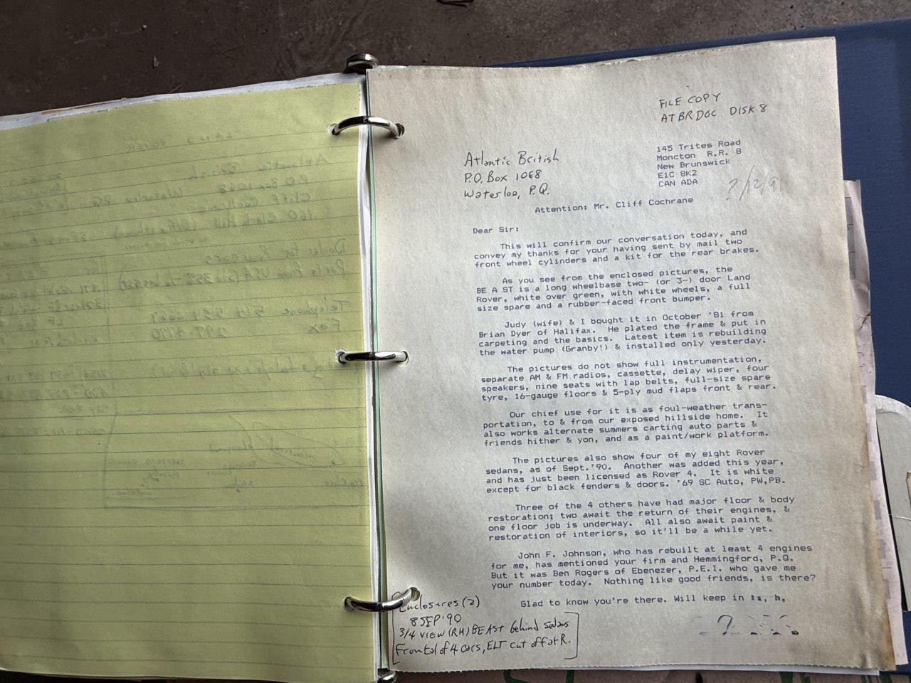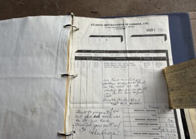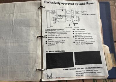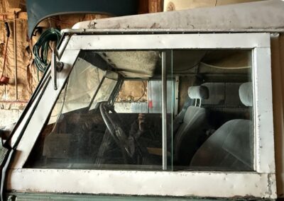 Power comes from a 2.3-litre gasoline inline-four (engine no. 307003344) paired with a four-speed manual gearbox, getting power to the rear or all four wheels, depending on how the dual range transfer case with locking hubs is set. The vehicle’s long-stored condition and lack of battery imply that mechanical status is unknown; buyers should plan for inspection and recommissioning before road use. The book of records includes photos of the vehicle when purchased from the previous owner, a sign of seller’s excitement at time of purchase. Other records include literature, seller notes, correspondence to various parts suppliers.