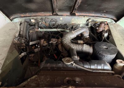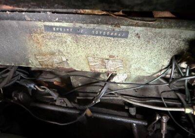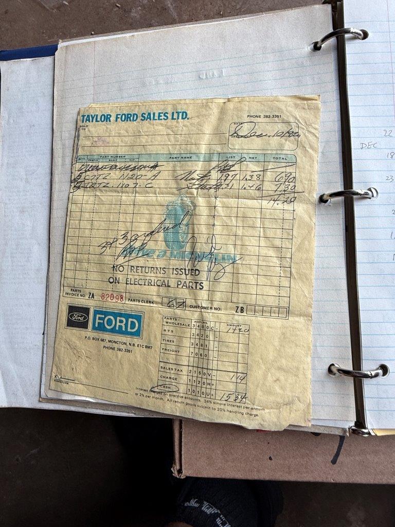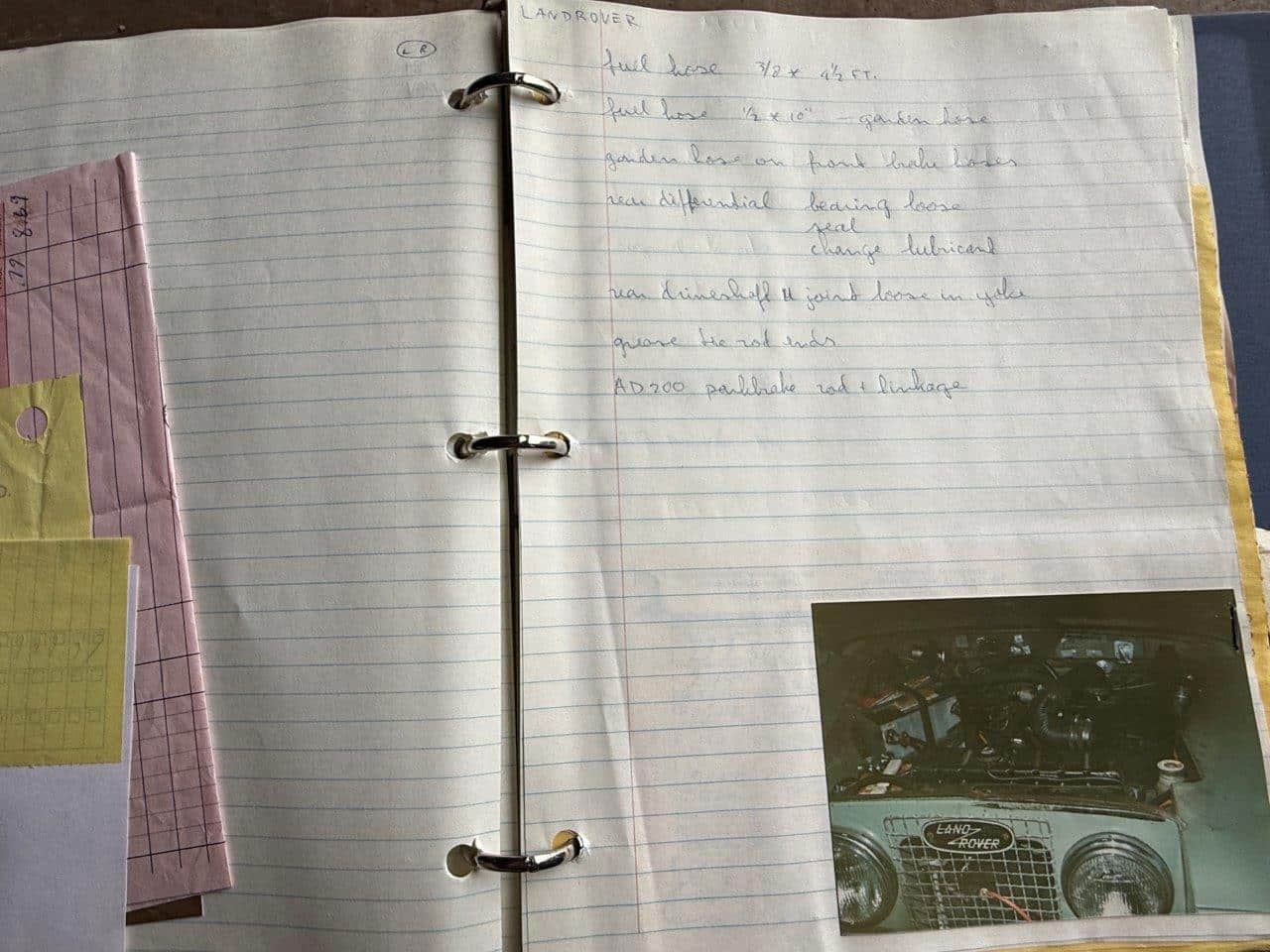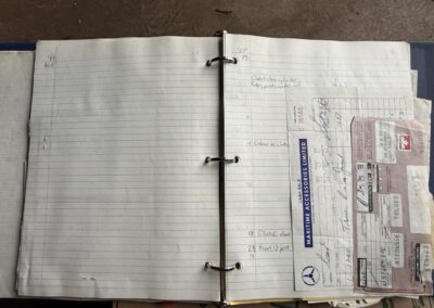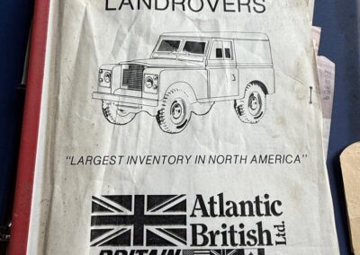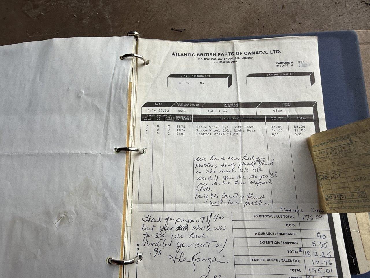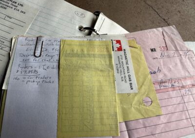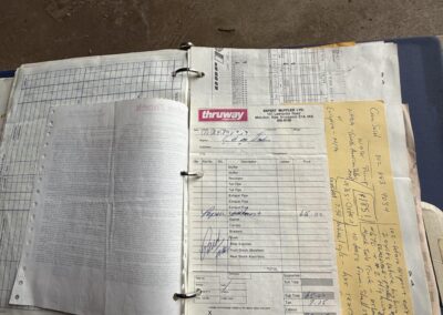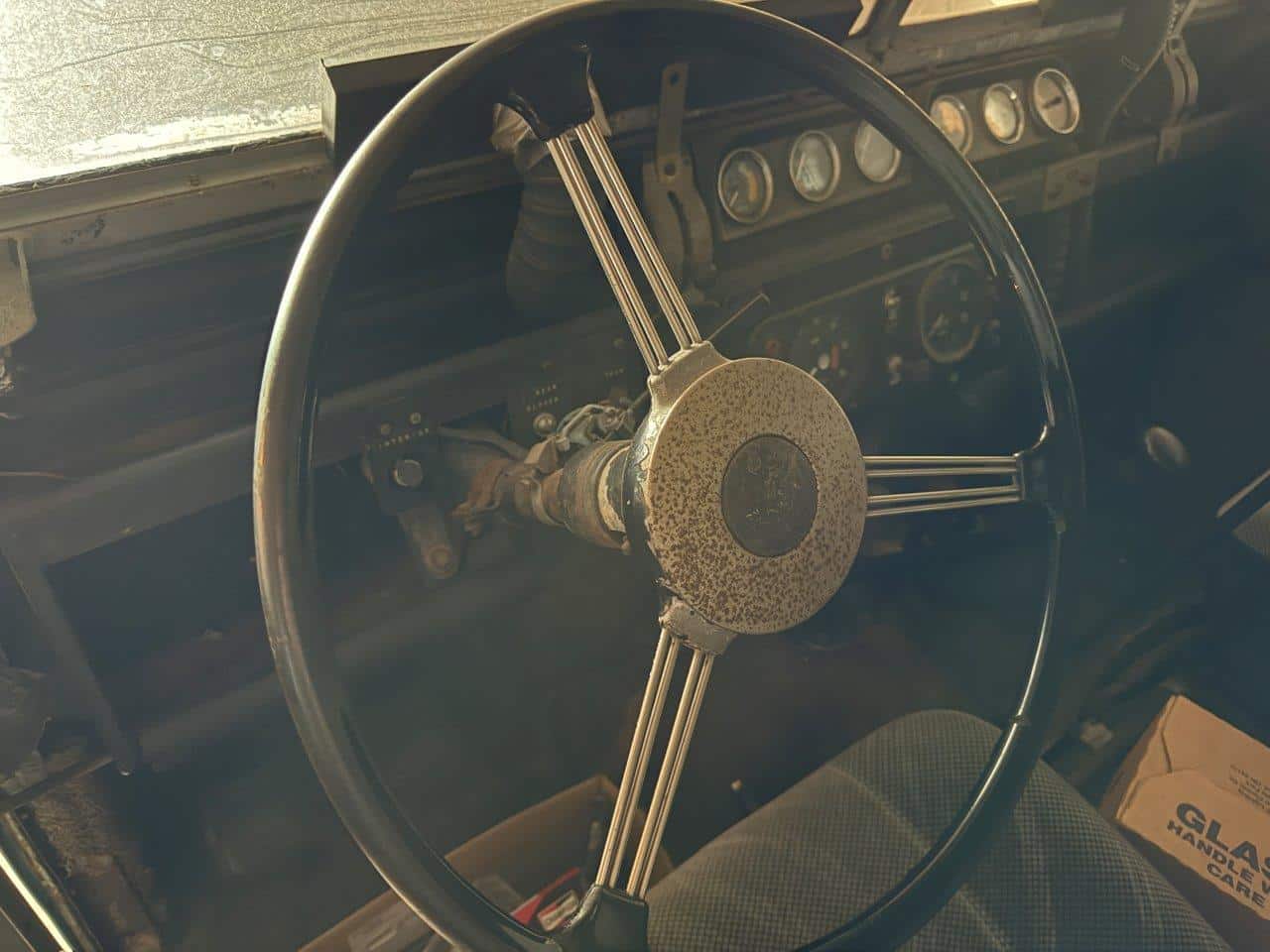 Power comes from a 2.3-litre gasoline inline-four (engine no. 307003344) paired with a four-speed manual gearbox, getting power to the rear or all four wheels, depending on how the dual range transfer case with locking hubs is set. The vehicle’s long-stored condition and lack of battery imply that mechanical status is unknown; buyers should plan for inspection and recommissioning before road use. The book of records includes photos of the vehicle when purchased from the previous owner, a sign of seller’s excitement at time of purchase. Other records include literature, seller notes, correspondence to various parts suppliers.