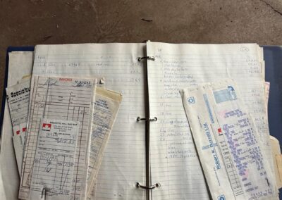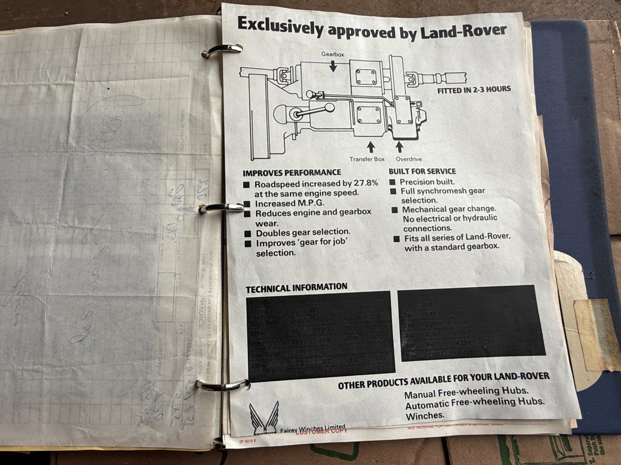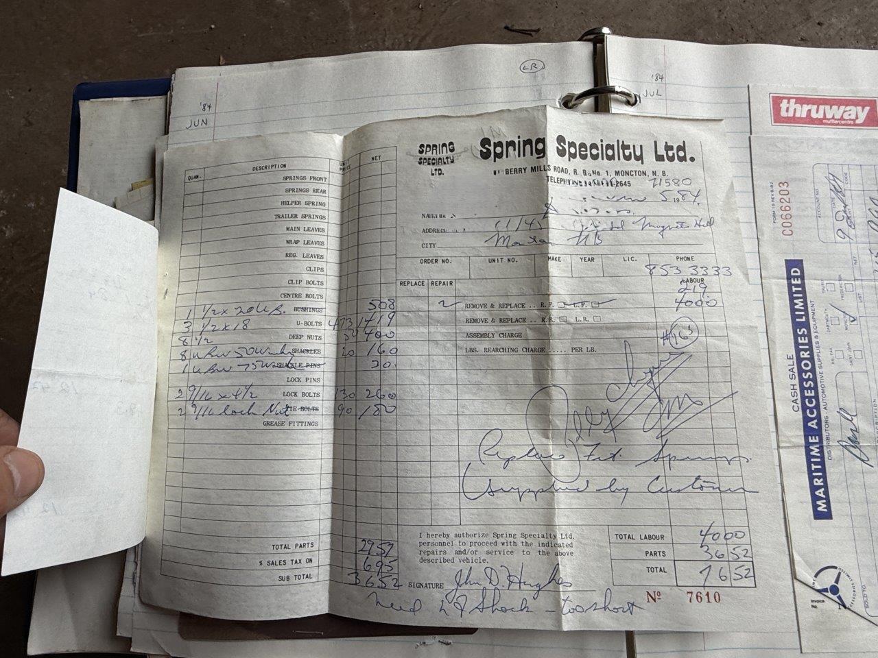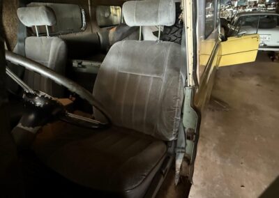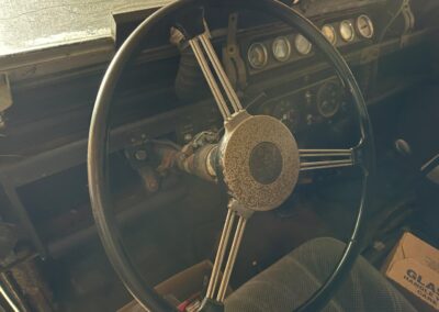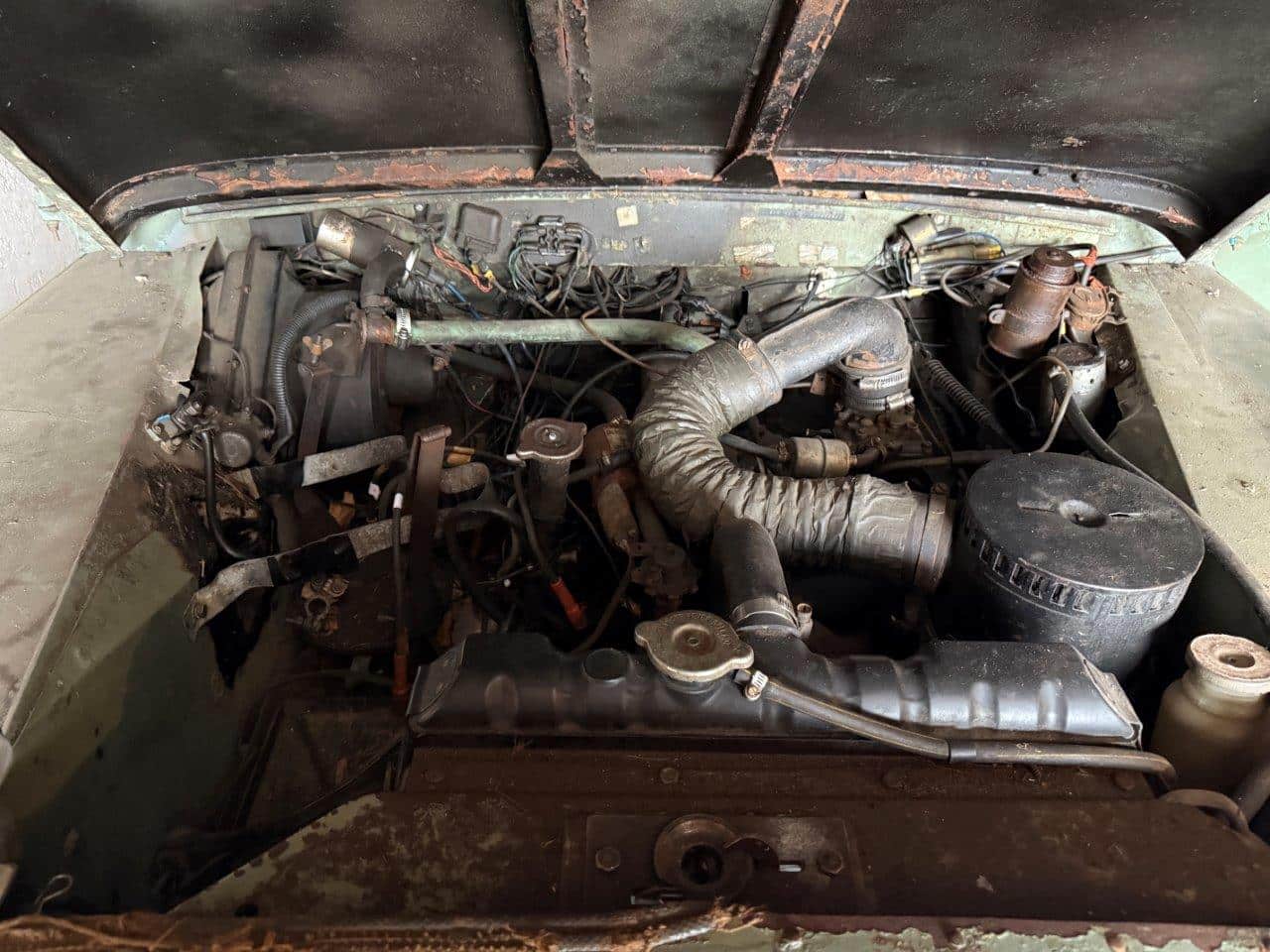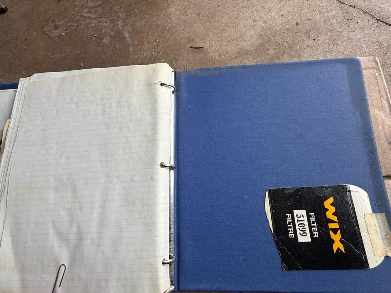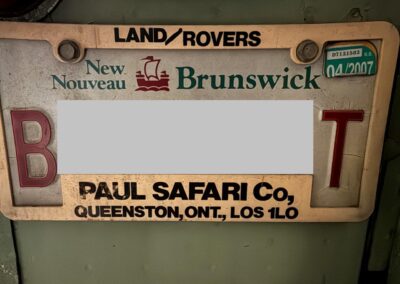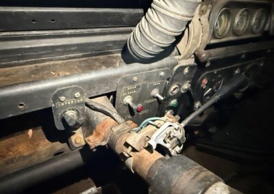 Power comes from a 2.3-litre gasoline inline-four (engine no. 307003344) paired with a four-speed manual gearbox, getting power to the rear or all four wheels, depending on how the dual range transfer case with locking hubs is set. The vehicle’s long-stored condition and lack of battery imply that mechanical status is unknown; buyers should plan for inspection and recommissioning before road use. The book of records includes photos of the vehicle when purchased from the previous owner, a sign of seller’s excitement at time of purchase. Other records include literature, seller notes, correspondence to various parts suppliers.