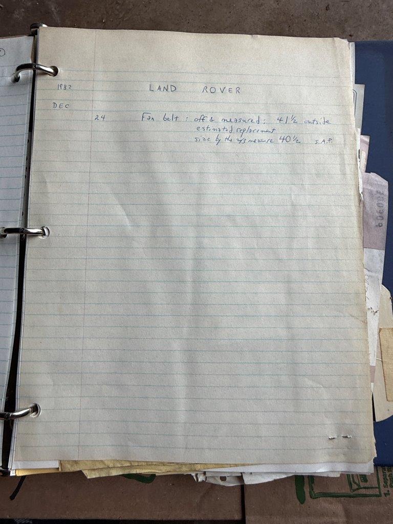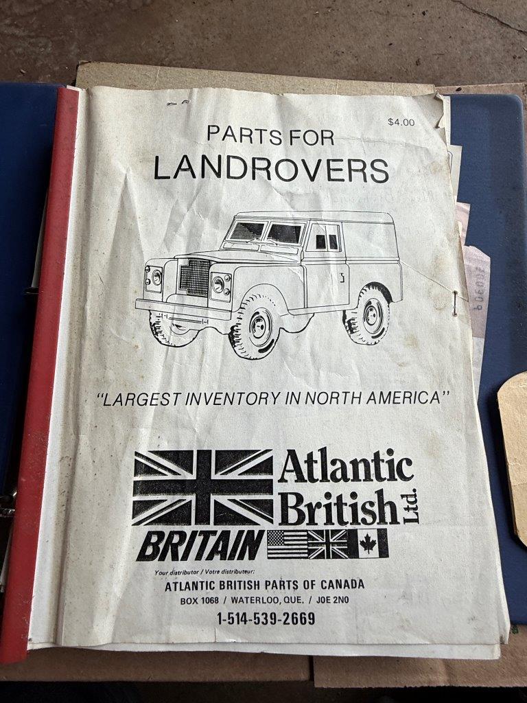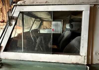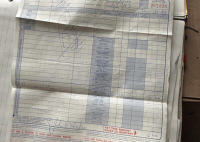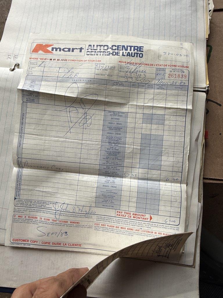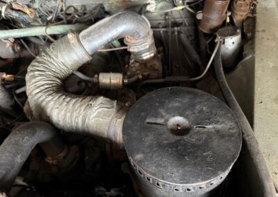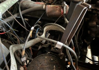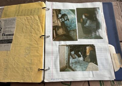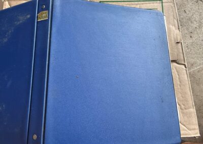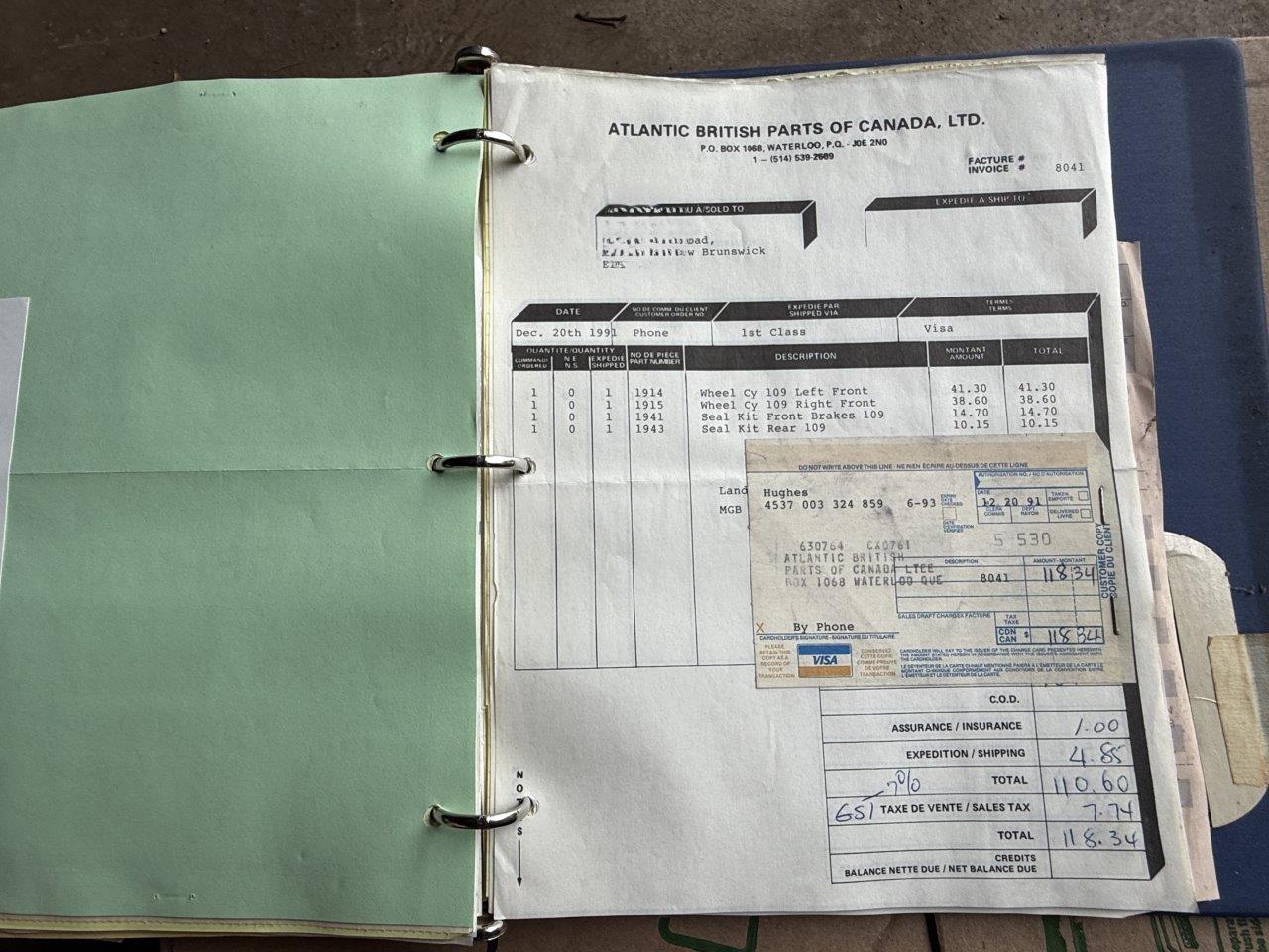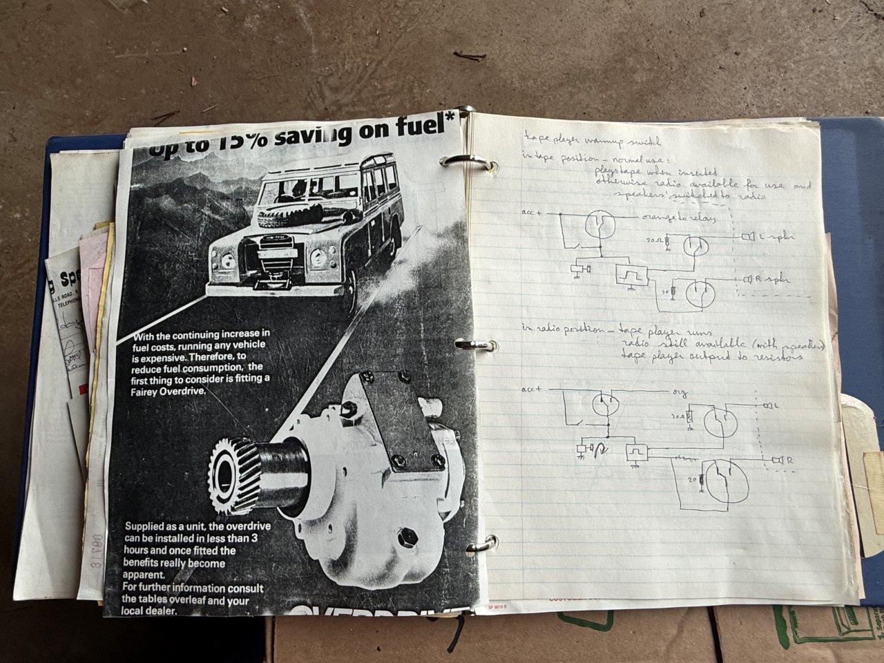 Power comes from a 2.3-litre gasoline inline-four (engine no. 307003344) paired with a four-speed manual gearbox, getting power to the rear or all four wheels, depending on how the dual range transfer case with locking hubs is set. The vehicle’s long-stored condition and lack of battery imply that mechanical status is unknown; buyers should plan for inspection and recommissioning before road use. The book of records includes photos of the vehicle when purchased from the previous owner, a sign of seller’s excitement at time of purchase. Other records include literature, seller notes, correspondence to various parts suppliers.