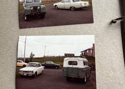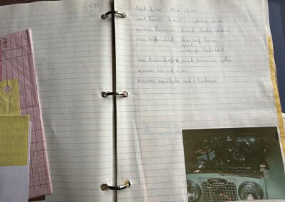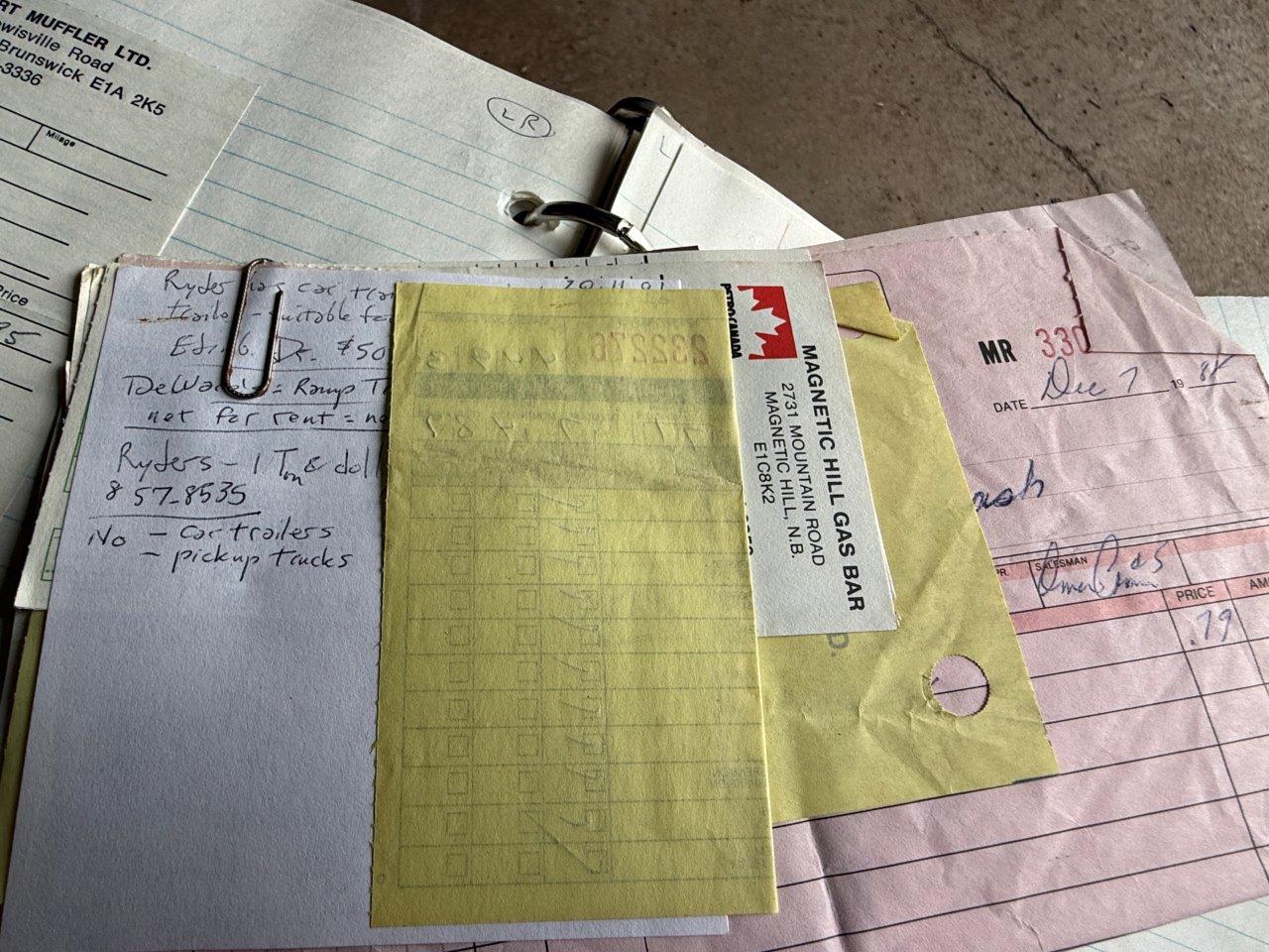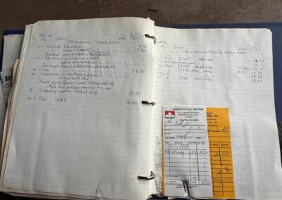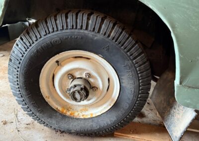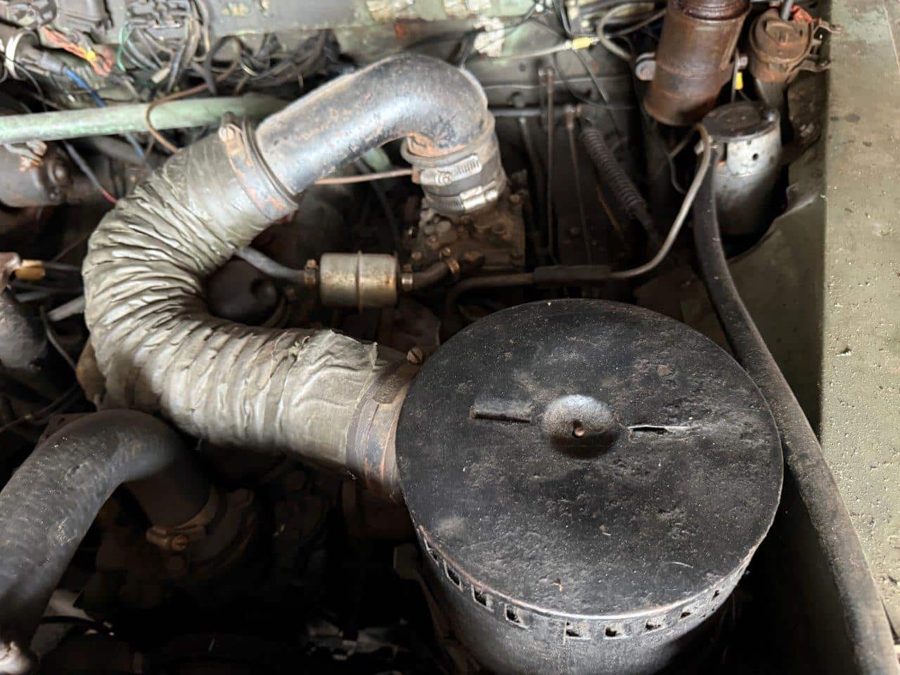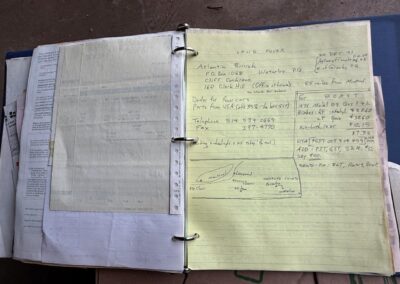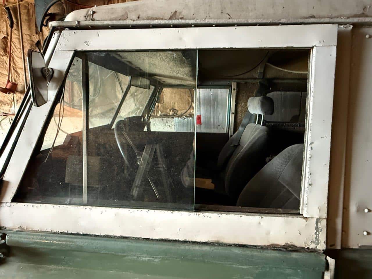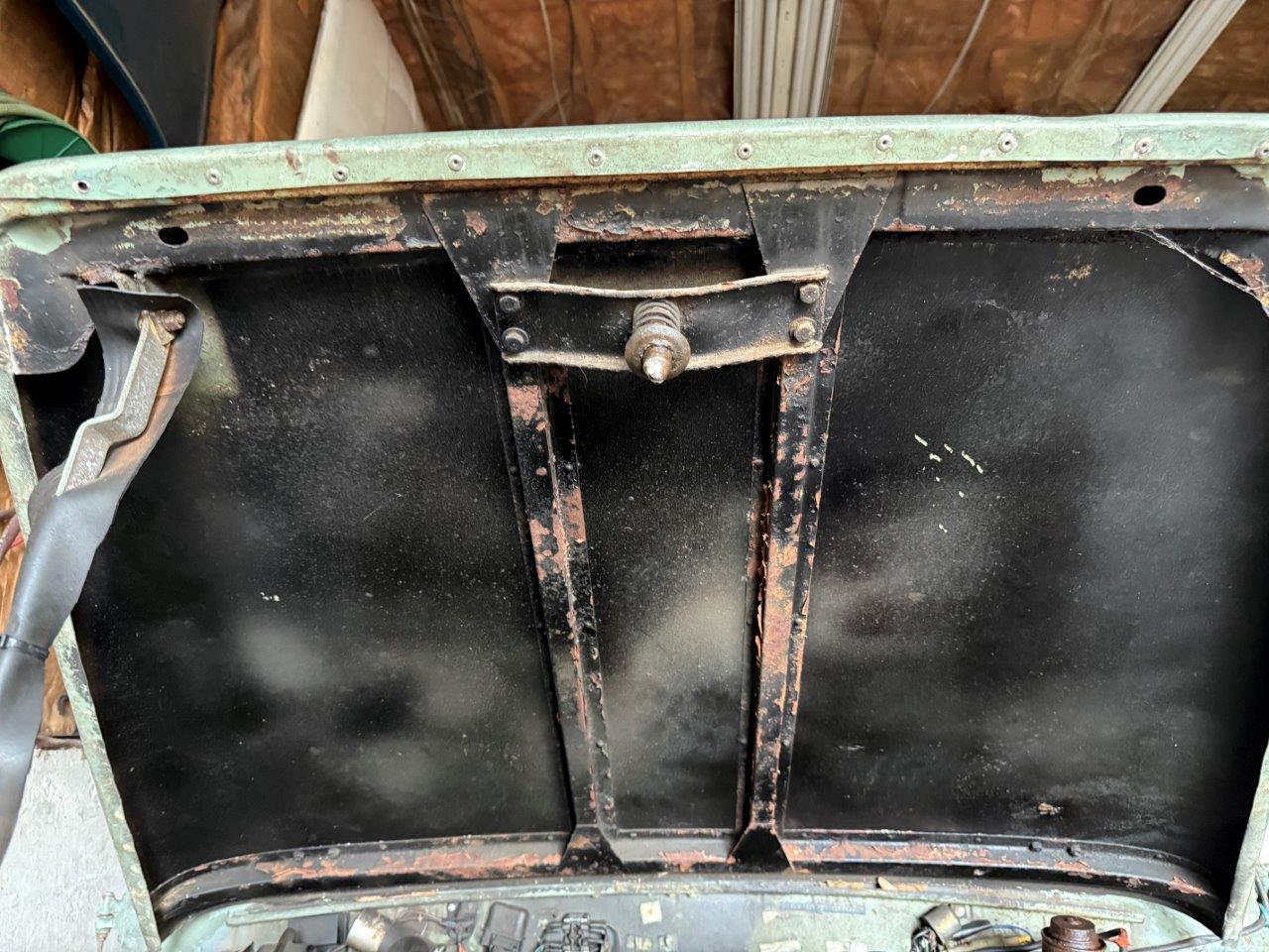 Power comes from a 2.3-litre gasoline inline-four (engine no. 307003344) paired with a four-speed manual gearbox, getting power to the rear or all four wheels, depending on how the dual range transfer case with locking hubs is set. The vehicle’s long-stored condition and lack of battery imply that mechanical status is unknown; buyers should plan for inspection and recommissioning before road use. The book of records includes photos of the vehicle when purchased from the previous owner, a sign of seller’s excitement at time of purchase. Other records include literature, seller notes, correspondence to various parts suppliers.