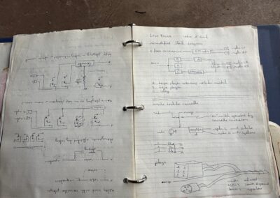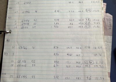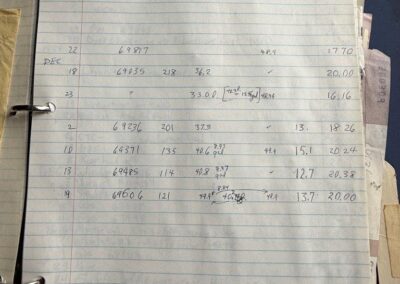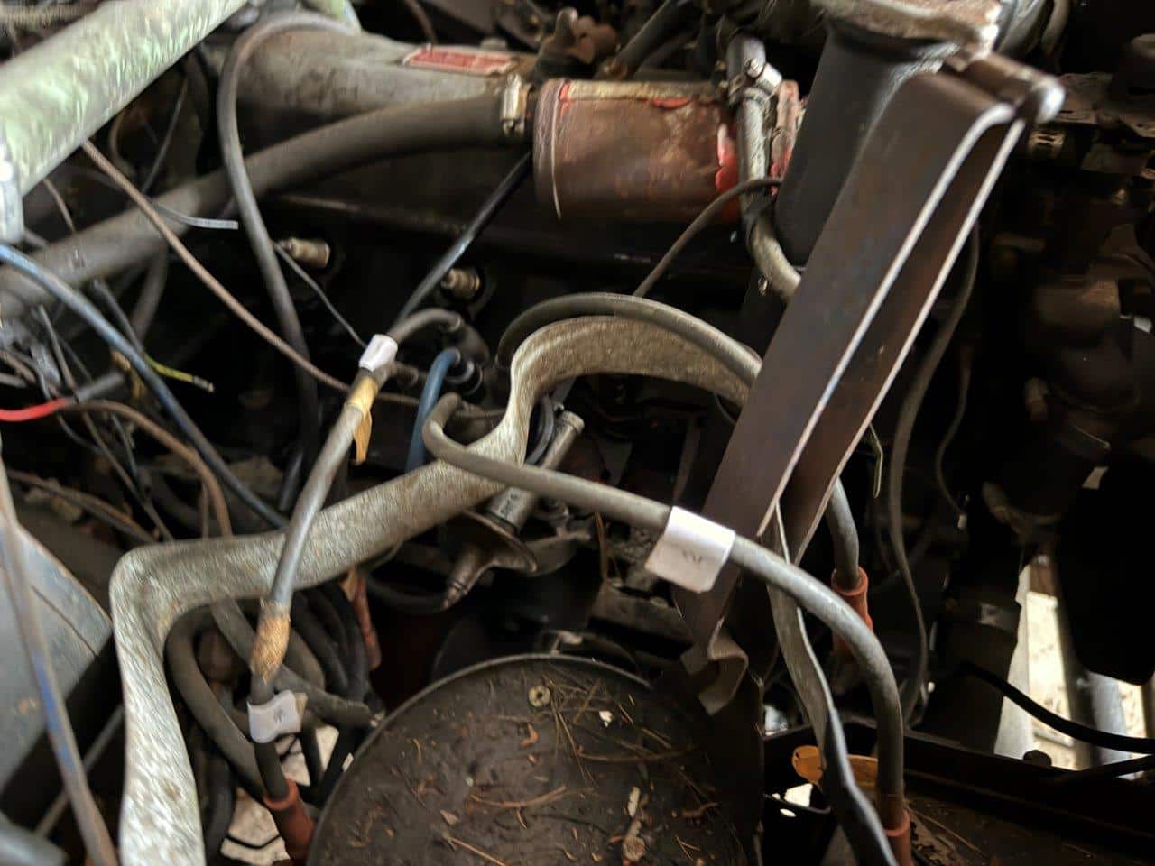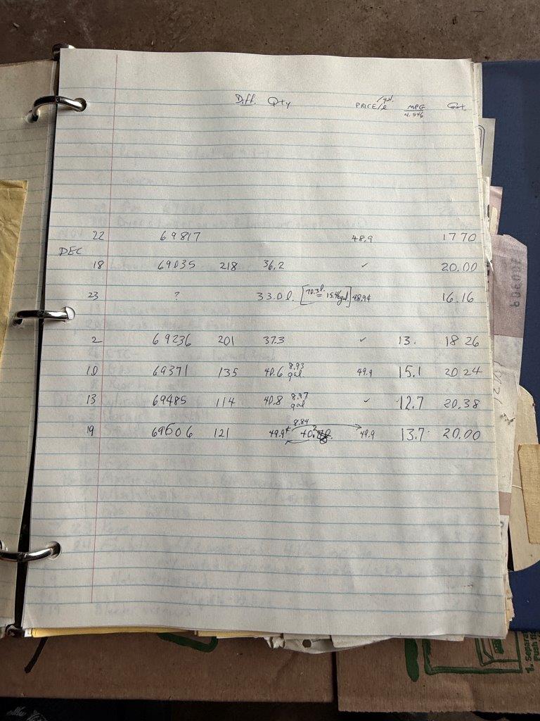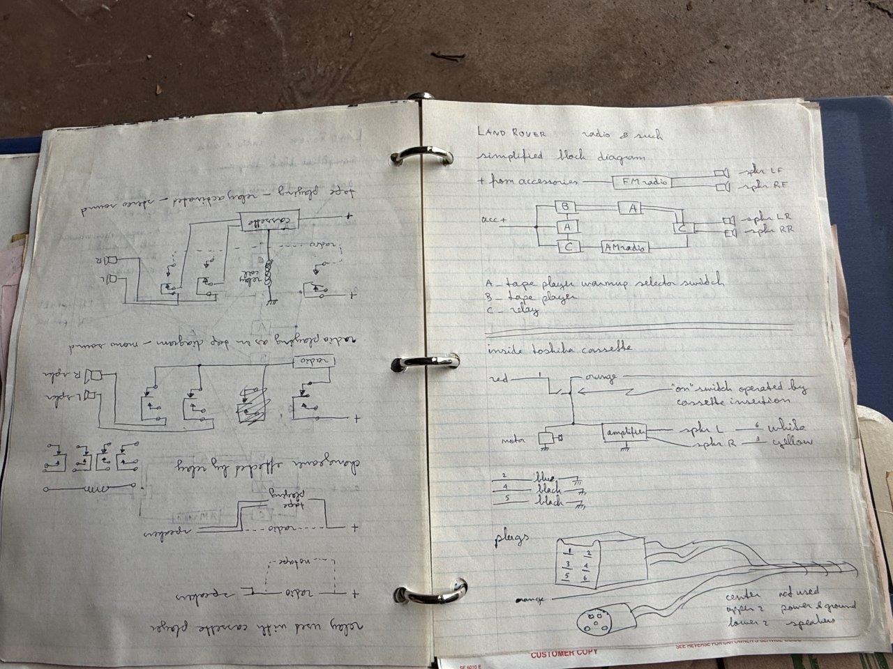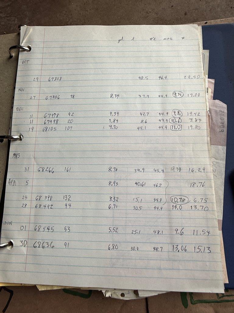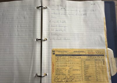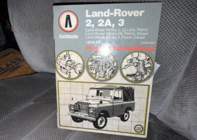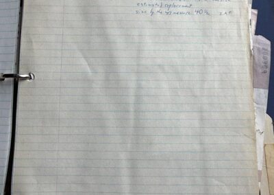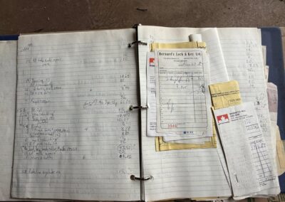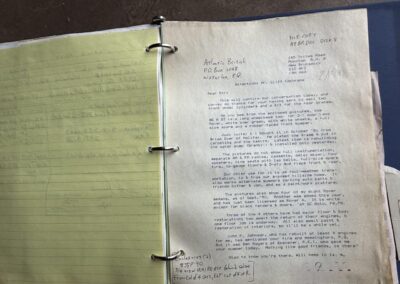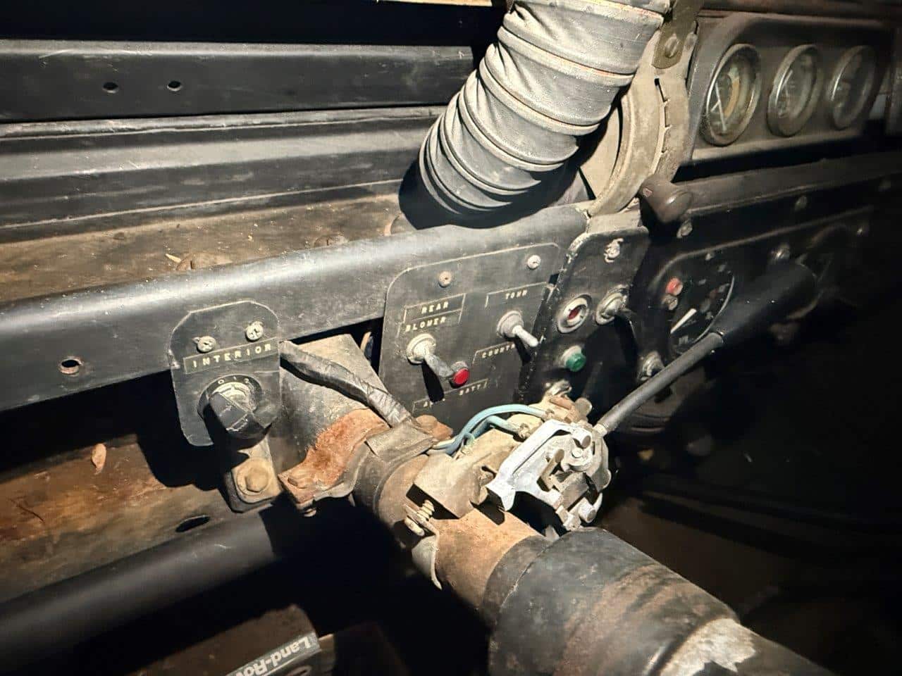 Power comes from a 2.3-litre gasoline inline-four (engine no. 307003344) paired with a four-speed manual gearbox, getting power to the rear or all four wheels, depending on how the dual range transfer case with locking hubs is set. The vehicle’s long-stored condition and lack of battery imply that mechanical status is unknown; buyers should plan for inspection and recommissioning before road use. The book of records includes photos of the vehicle when purchased from the previous owner, a sign of seller’s excitement at time of purchase. Other records include literature, seller notes, correspondence to various parts suppliers.