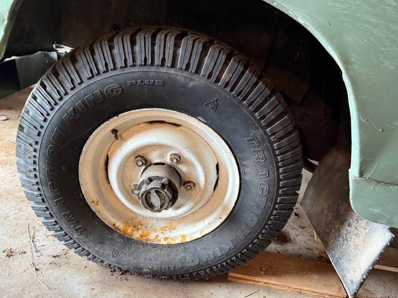 This 1971 Land Rover 109 Series IIA is finished in Green over a beige-carpeted interior and is offered with its long wheelbase at NO RESERVE. The unmodified utility vehicle retains factory Land Rover badging and its finish has been altered with a brush-applied green repaint to produce a distressed, patina look. Features include a removable hardtop with sliding side windows, dual side mirrors with chrome caps, and 16-inch white-painted steel wheels wrapped in Traction King Plus 235/85R16 tires. A side-hinged rear door and stock exterior lighting are in place, and the truck remains equipped with its factory drip rails, displaying minimalist style.