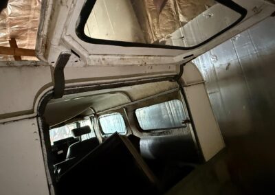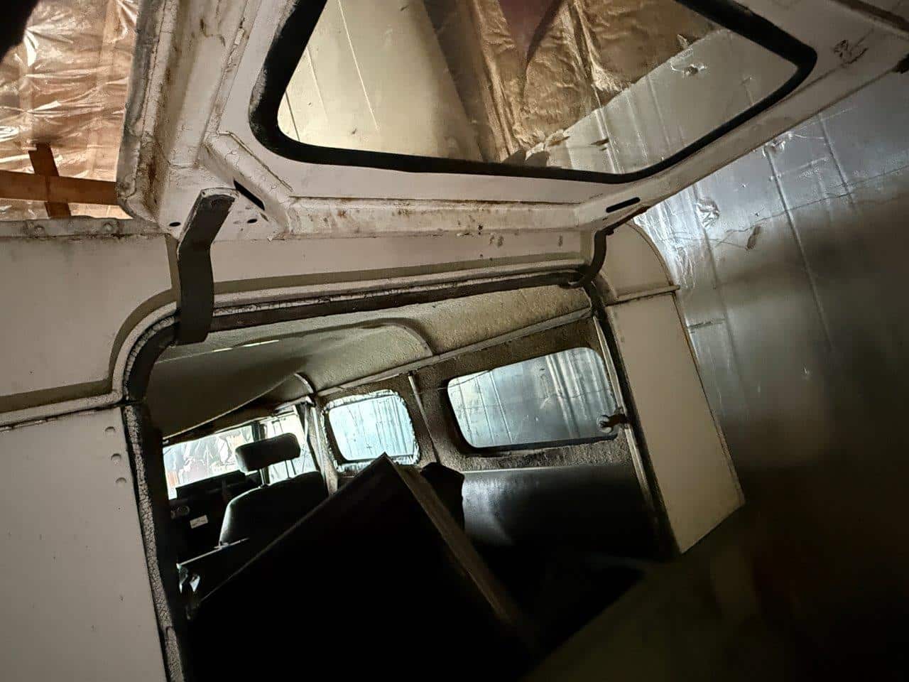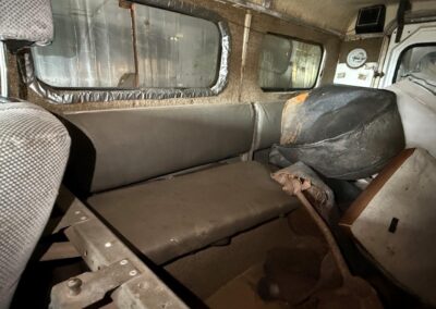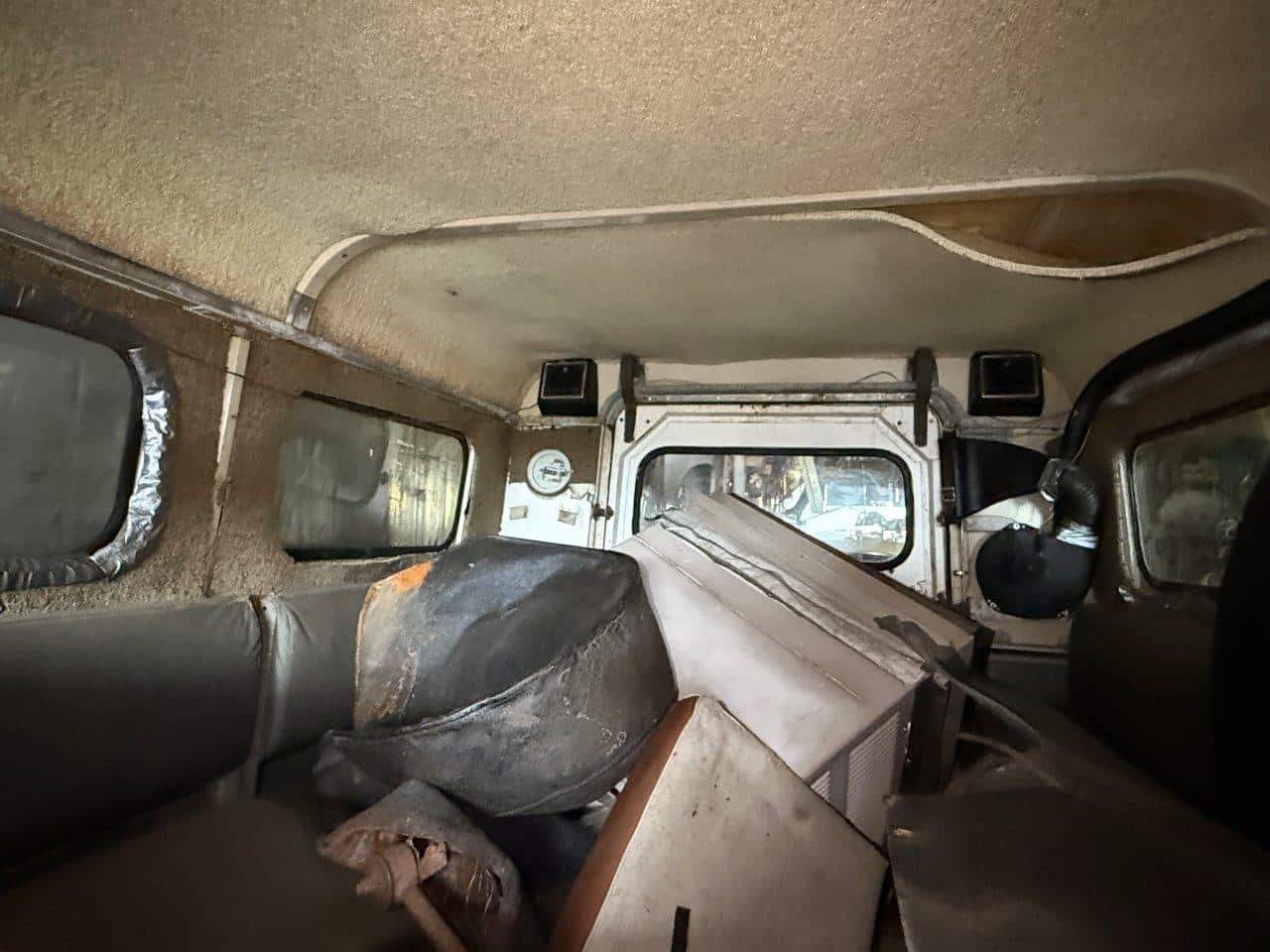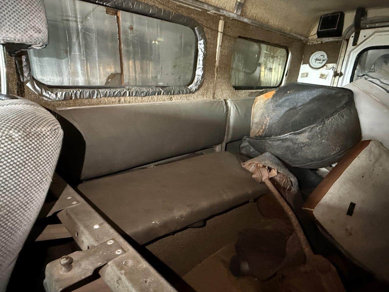 Inside this long wheelbase model, the owner has added homemade labels to supplement switchgear and has lined the inner walls and crafted a headliner with beige household carpet for soundproofing; some of which has come unglued. Seating consists of aftermarket cloth-upholstered front buckets with recline function and black vinyl inward facing side-mounted benches in the rear. The black three-spoke steering wheel fronts a 6,000-RPM tachometer (7,000-RPM max) and a speedometer maxing out at 70 MPH, with the integrated five-digit odometer indicating under 85,000 miles. Roof-mounted windshield-wiper controls, auxiliary gauges and rear roof-mounted speakers are also included in the vehicle’s interior.
