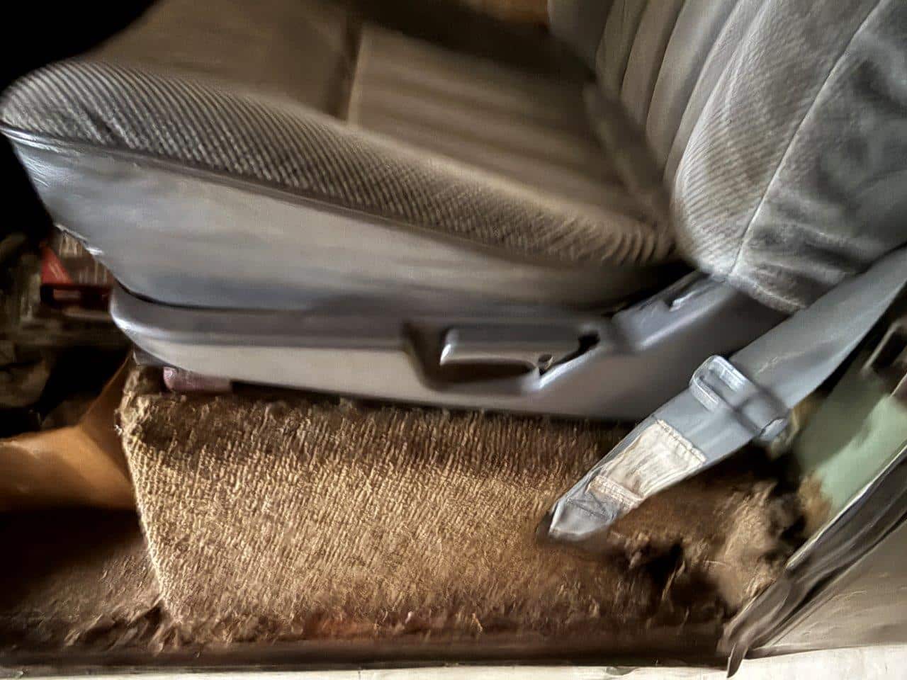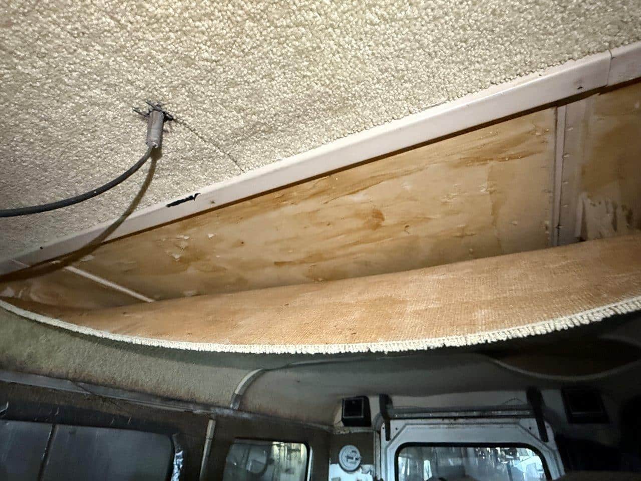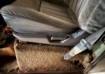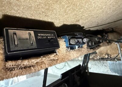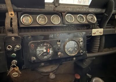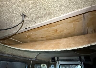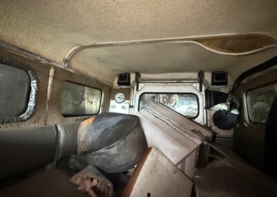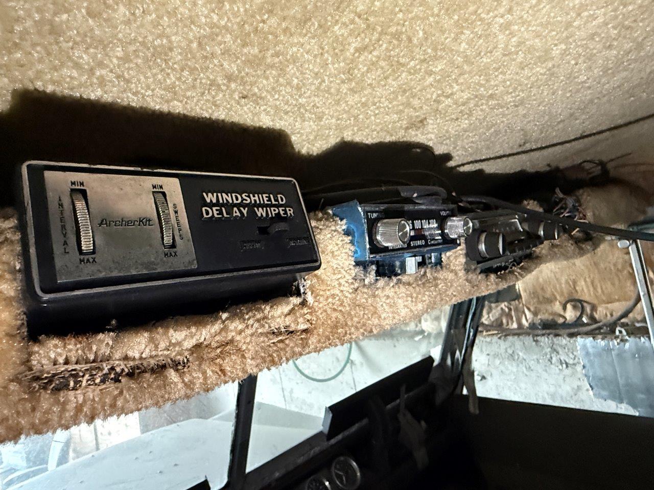 Inside this long wheelbase model, the owner has added homemade labels to supplement switchgear and has lined the inner walls and crafted a headliner with beige household carpet for soundproofing; some of which has come unglued. Seating consists of aftermarket cloth-upholstered front buckets with recline function and black vinyl inward facing side-mounted benches in the rear. The black three-spoke steering wheel fronts a 6,000-RPM tachometer (7,000-RPM max) and a speedometer maxing out at 70 MPH, with the integrated five-digit odometer indicating under 85,000 miles. Roof-mounted windshield-wiper controls, auxiliary gauges and rear roof-mounted speakers are also included in the vehicle’s interior.