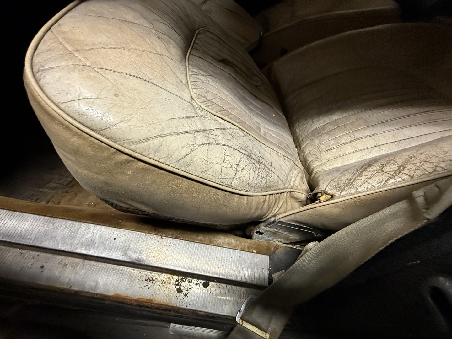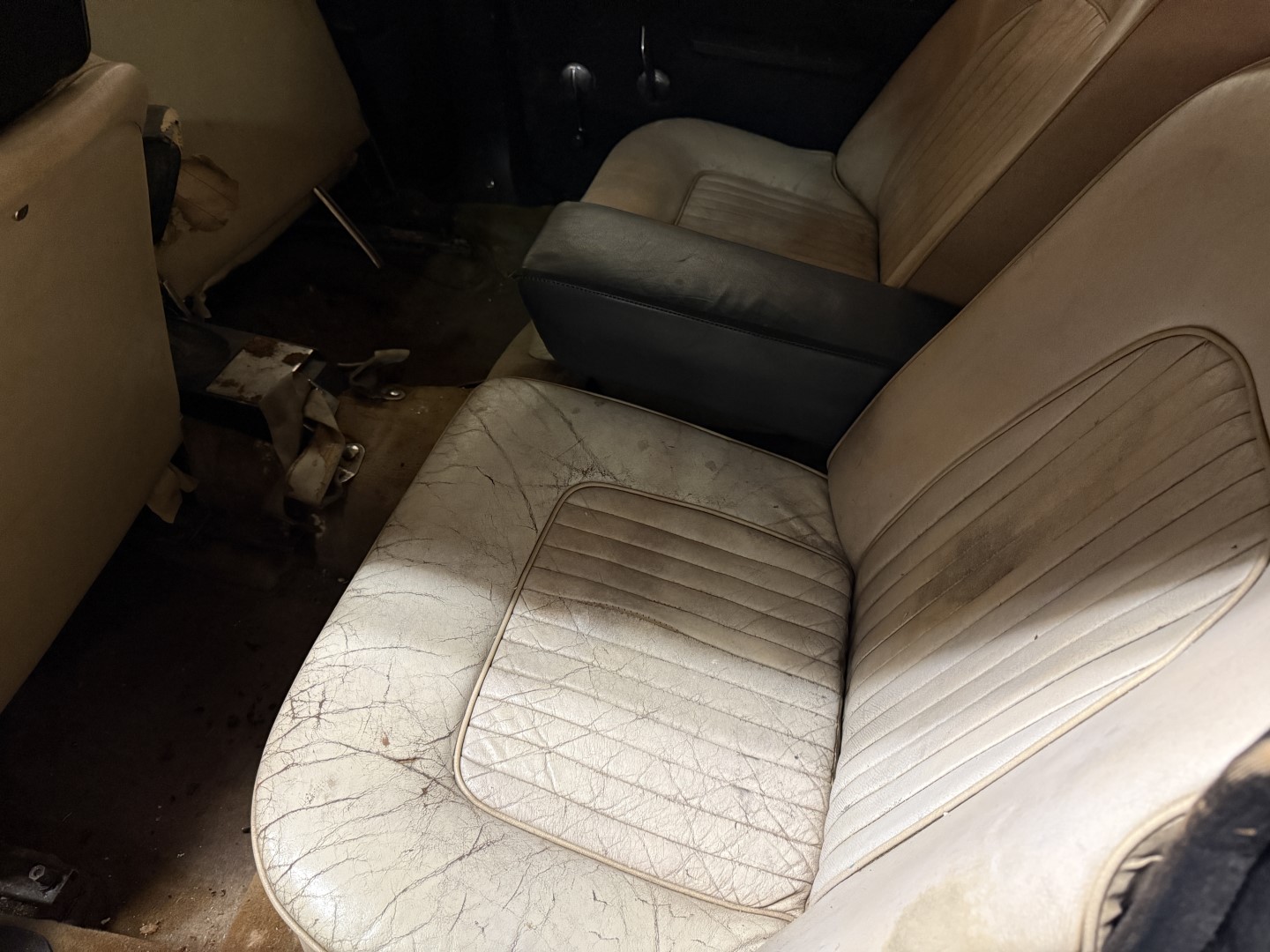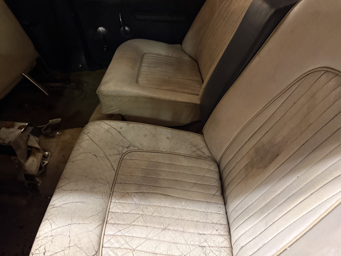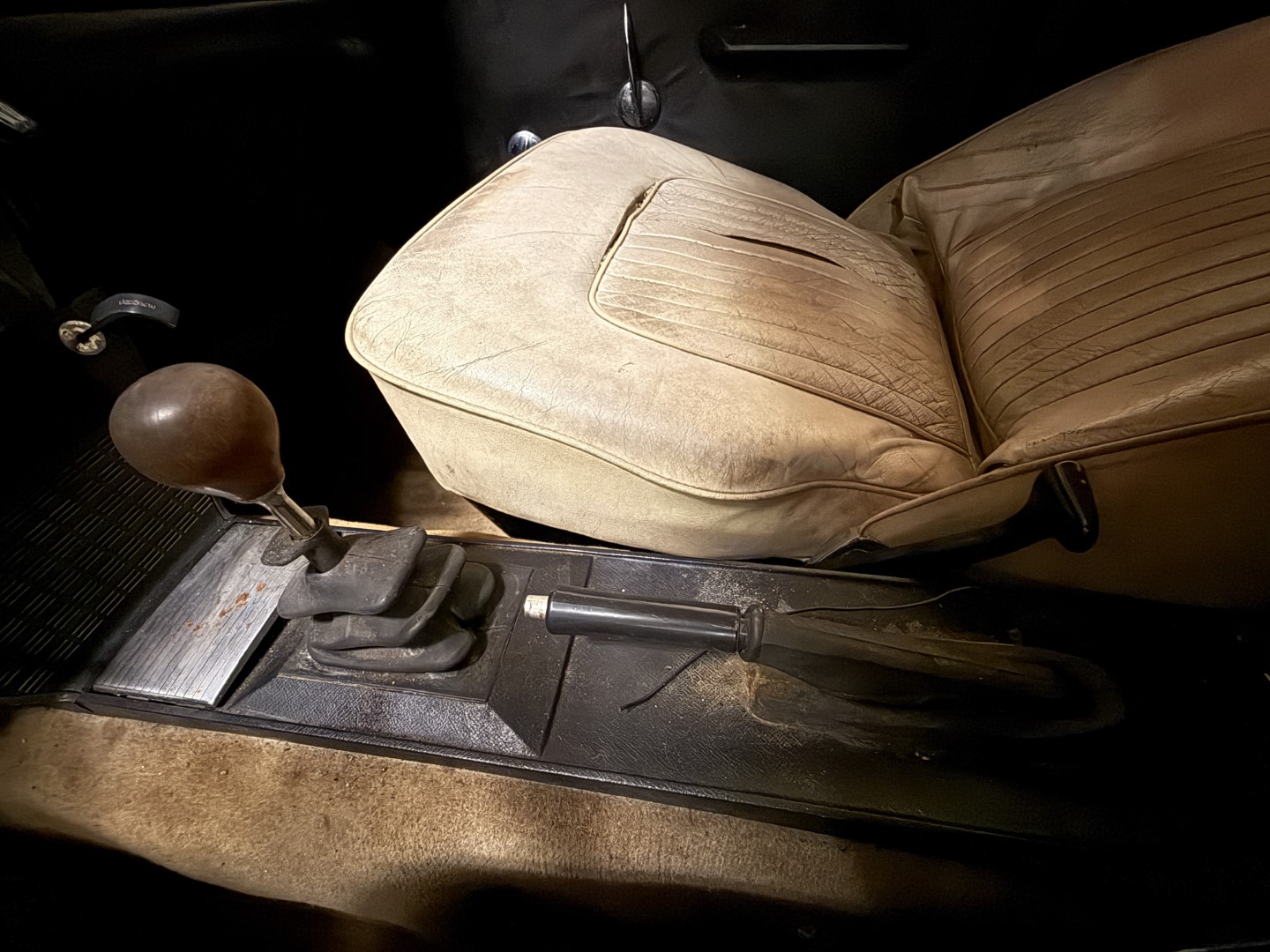 The cabin is trimmed in black interior panels, sand coloured carpet and white leather seating. Front bucket seats are not bolted in, showing wear, creasing, and small splits in the material, while wood-veneer trim accents the dashboard and upper door cards. A two-spoke wood-rim steering wheel fronts a horizontal ribbon speedometer marked to 120 MPH, accompanied by a tachometer with a 7,000 RPM maximum and a 6,000 RPM redline. Additional features include manual windows and a floor-mounted shifter for the manual gearbox.