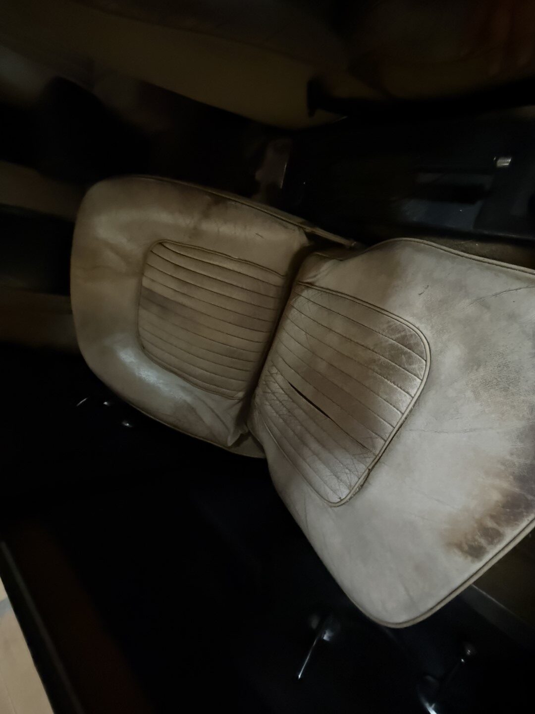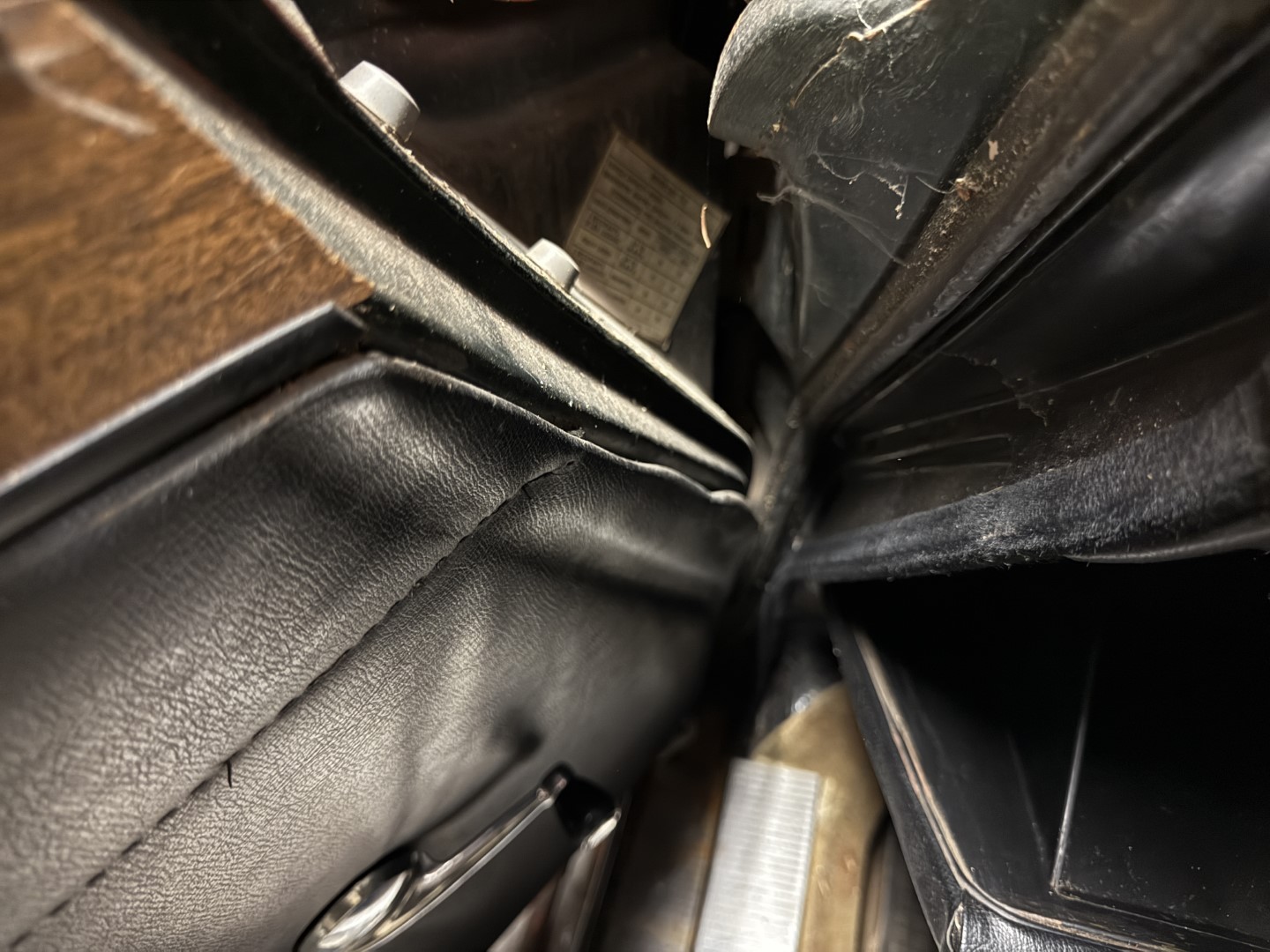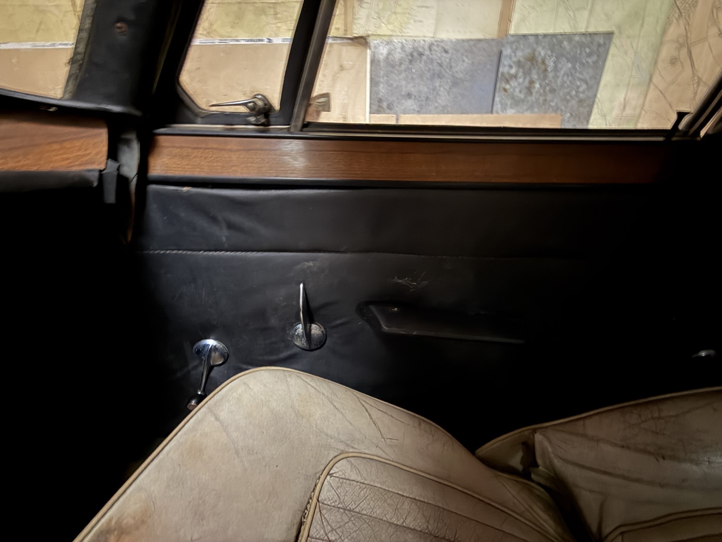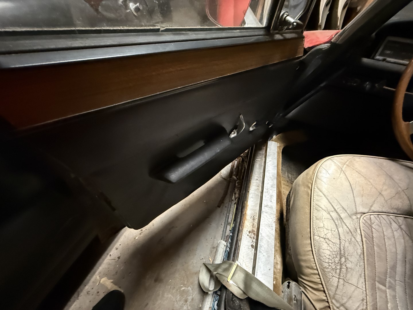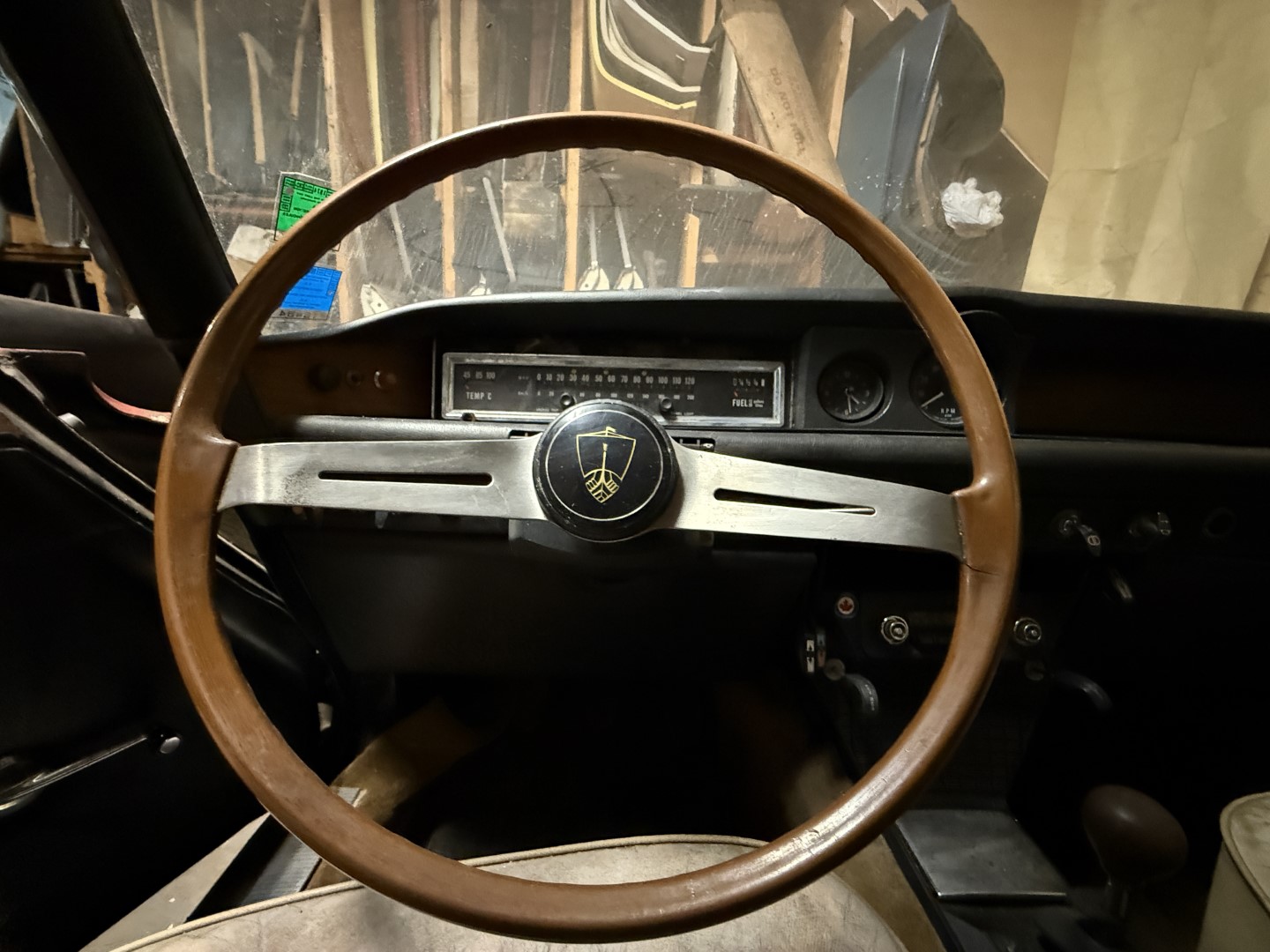 The cabin is trimmed in black interior panels, sand coloured carpet and white leather seating. Front bucket seats are not bolted in, showing wear, creasing, and small splits in the material, while wood-veneer trim accents the dashboard and upper door cards. A two-spoke wood-rim steering wheel fronts a horizontal ribbon speedometer marked to 120 MPH, accompanied by a tachometer with a 7,000 RPM maximum and a 6,000 RPM redline. Additional features include manual windows and a floor-mounted shifter for the manual gearbox.