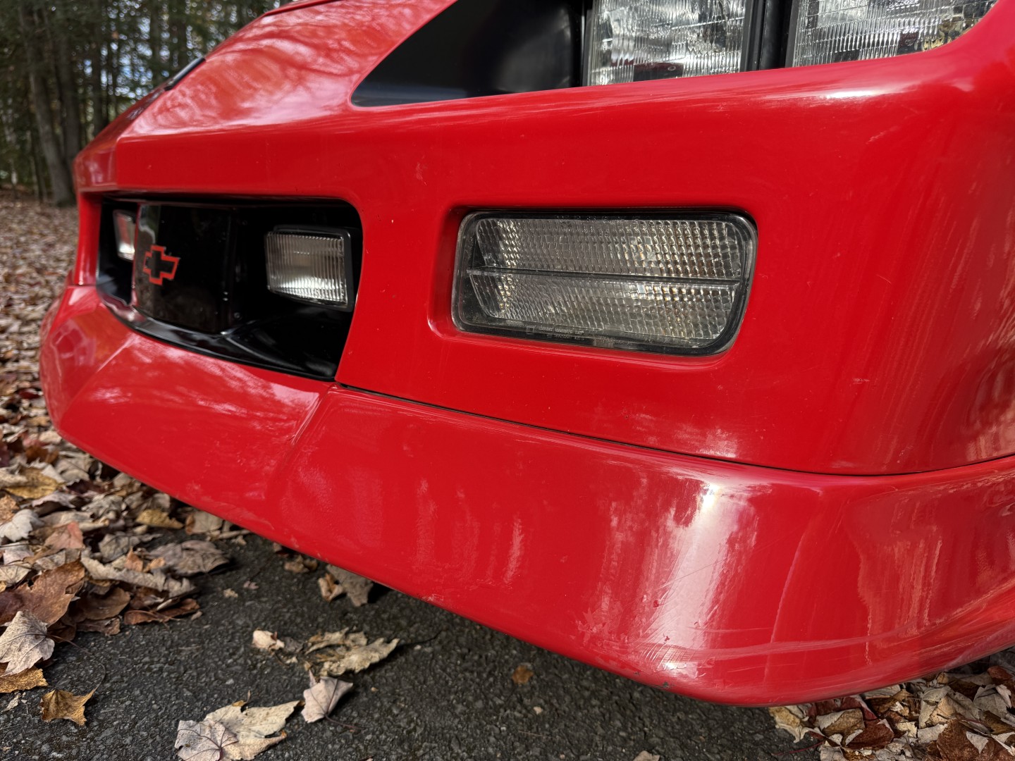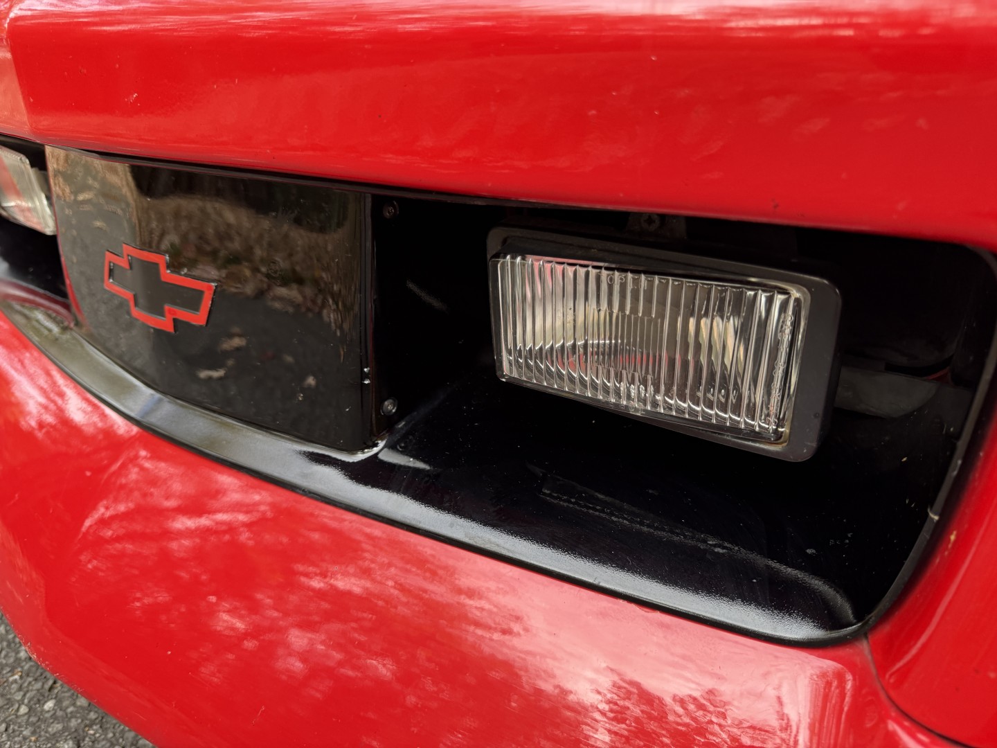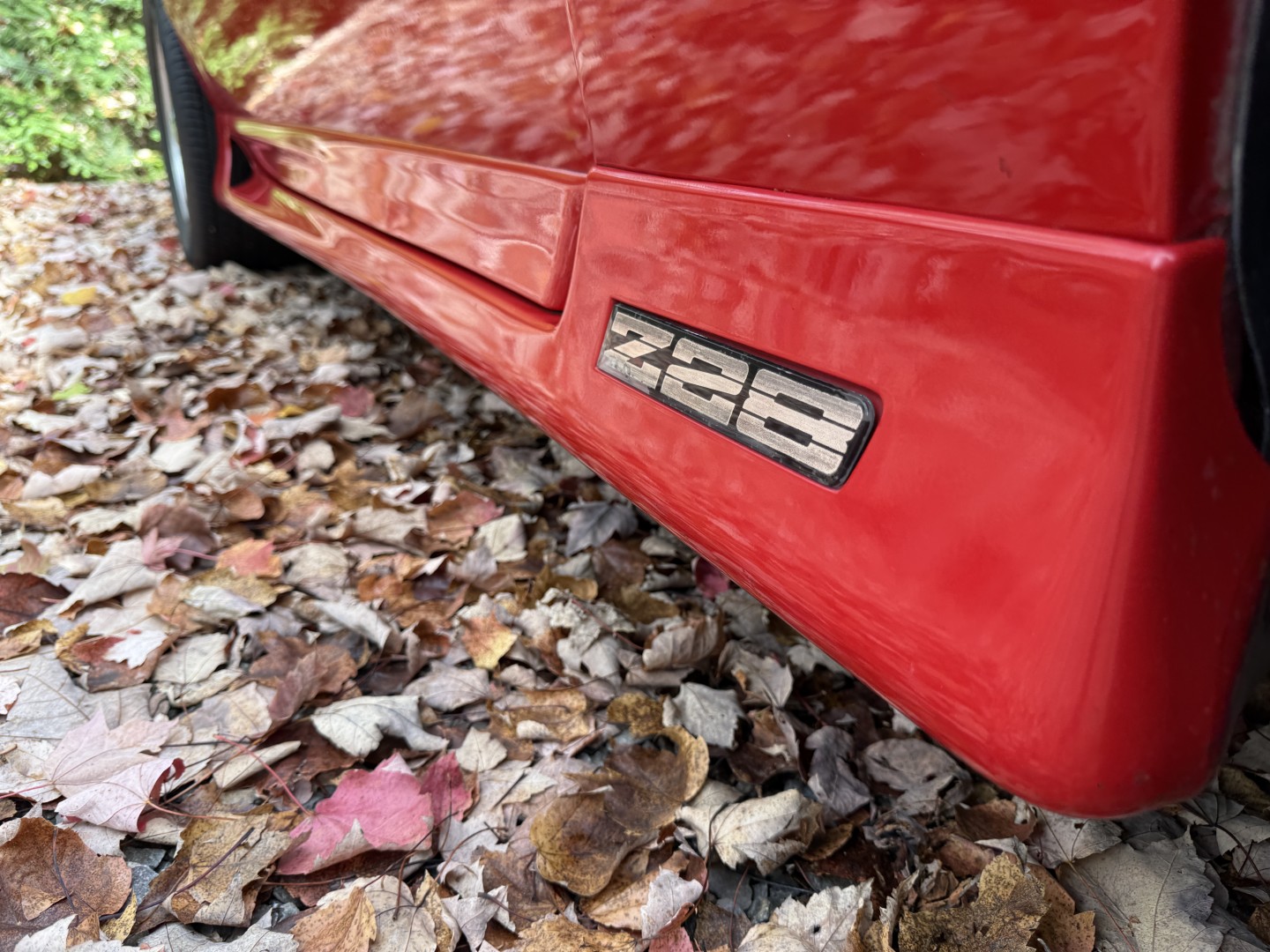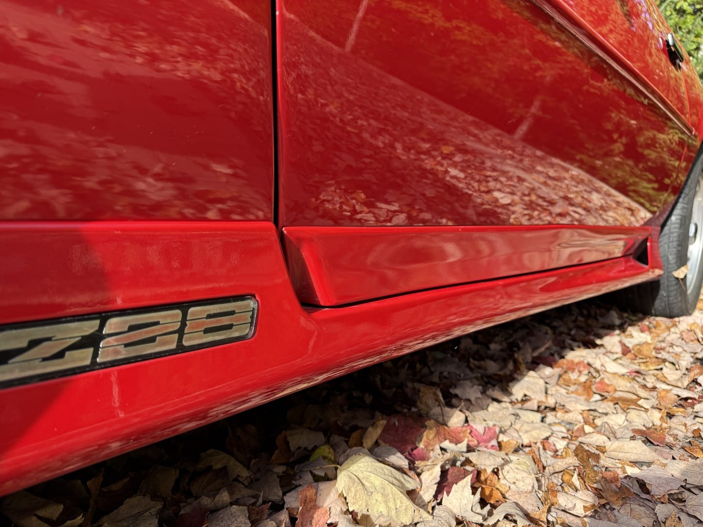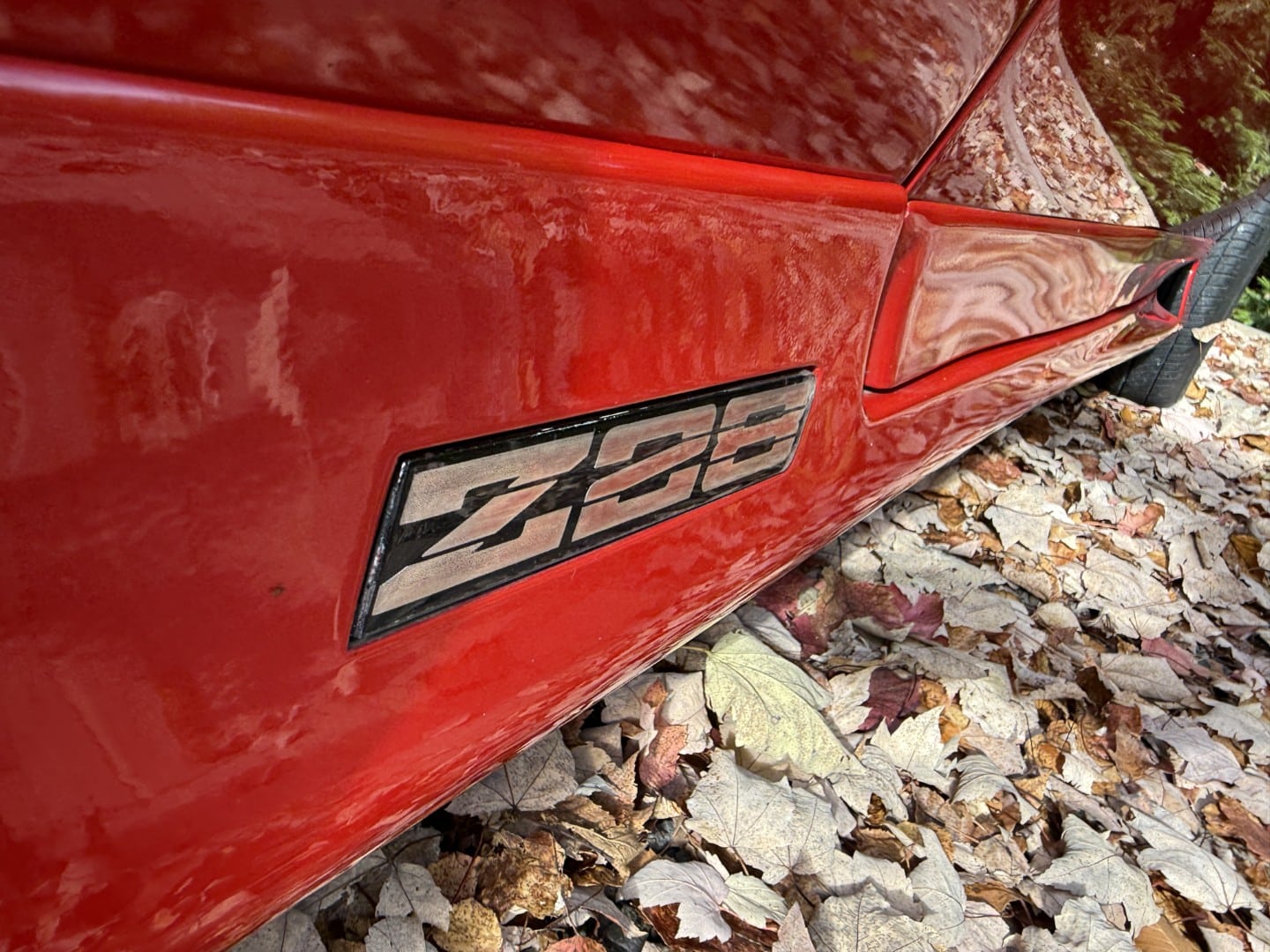 Finished in Bright Red, the GM paint code for the car is 81. Other exterior features include fog lights surrounding the undrilled Chevy emblem portion of the bumper cover intended for a front licence plate; T-Tops, whose covers are made of lighter plexiglass, a rear aero wing, faux hood louvers, power-adjustable side mirrors, and Z28 badges on the body-color side skirts and rear bumper.