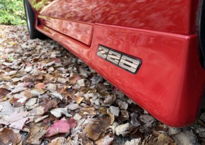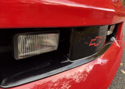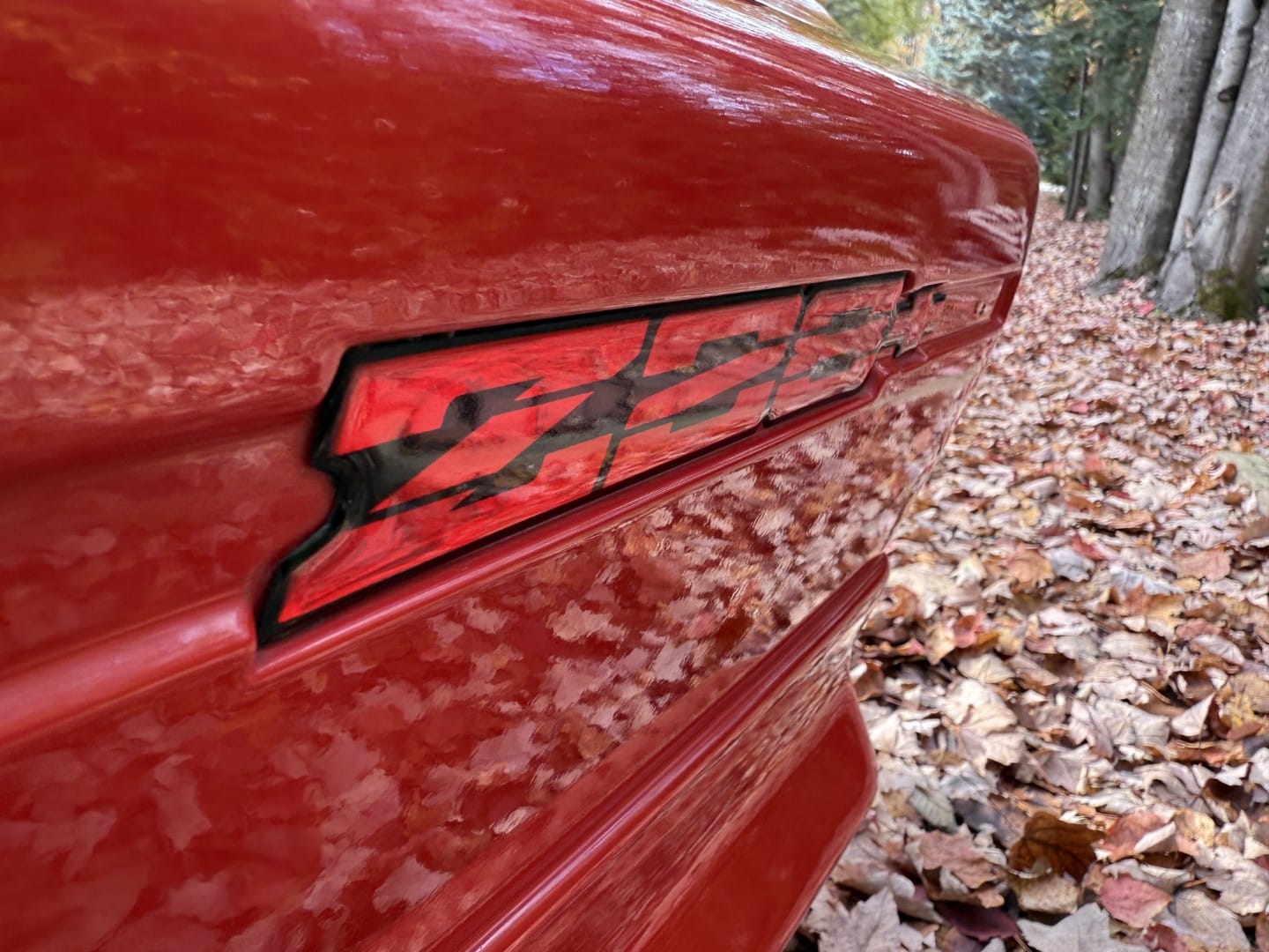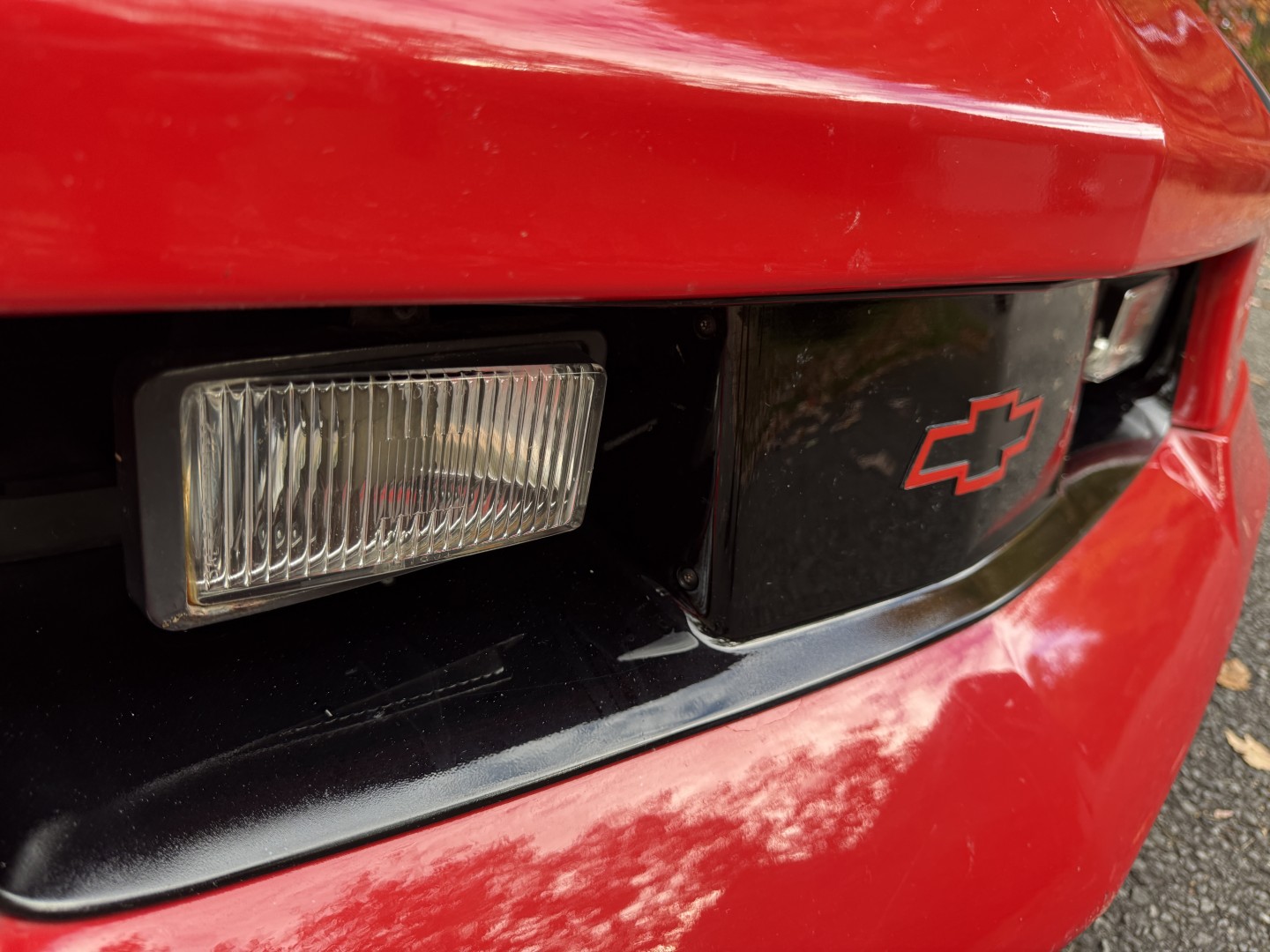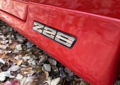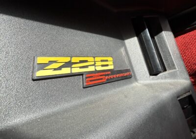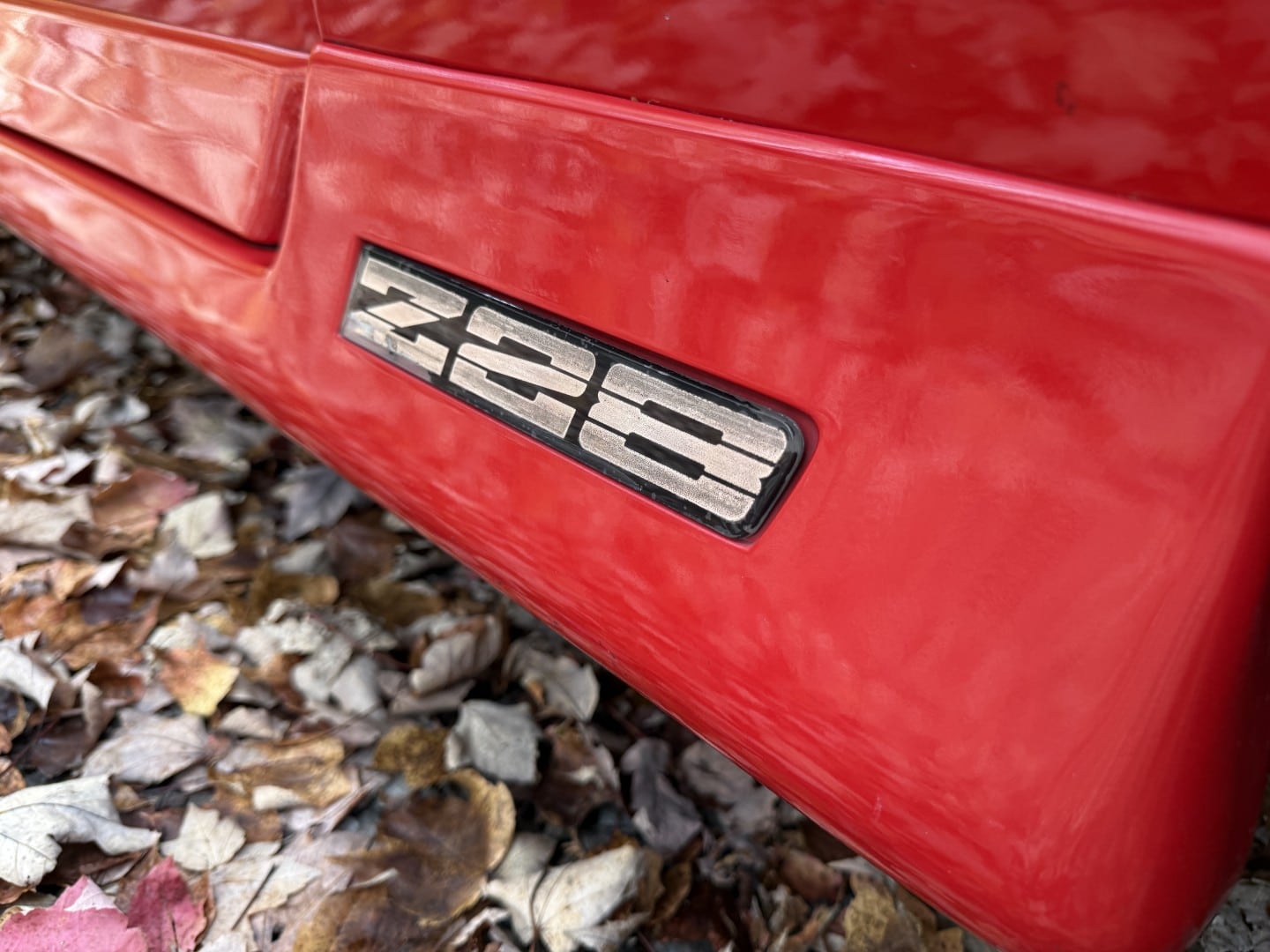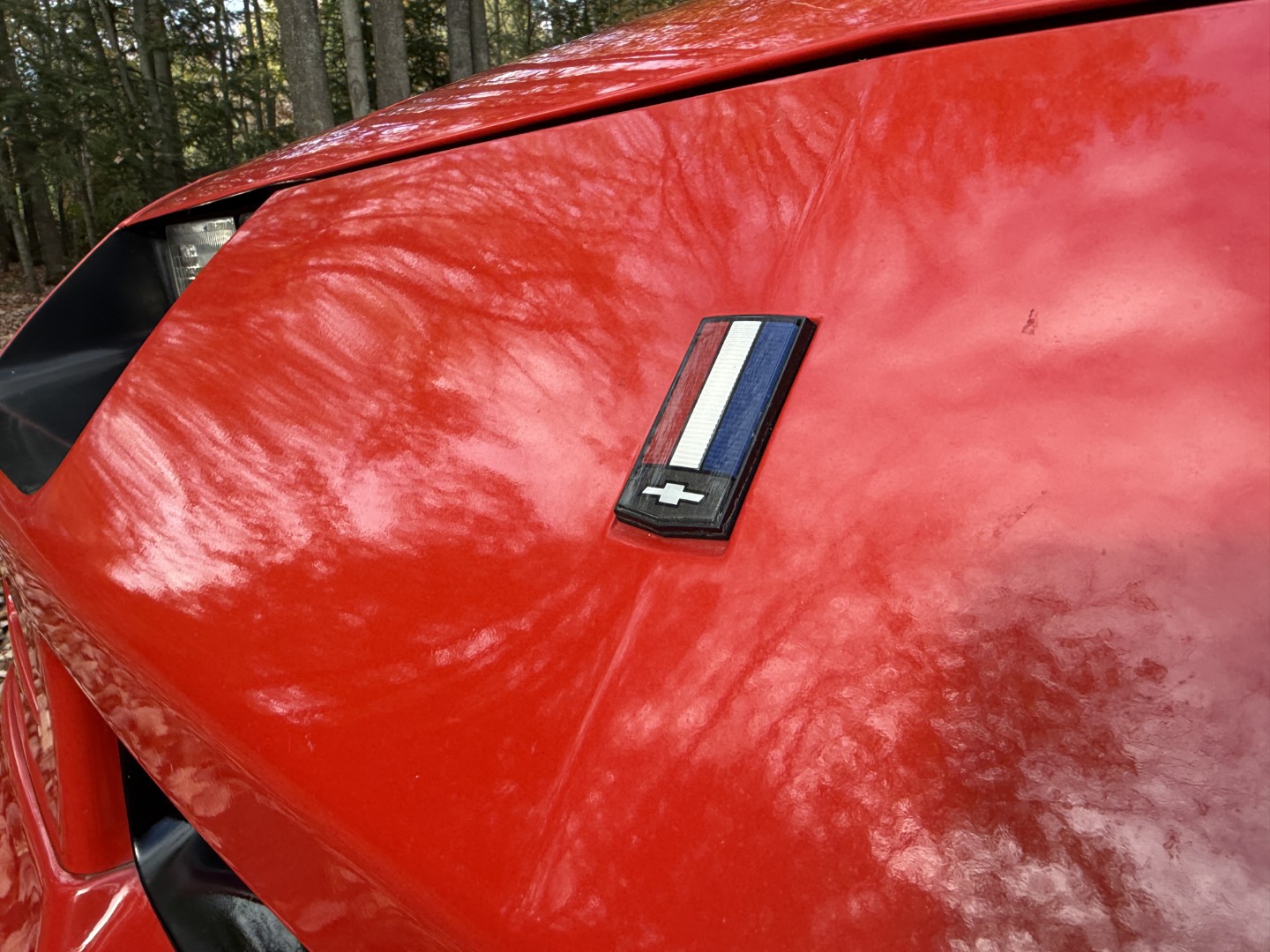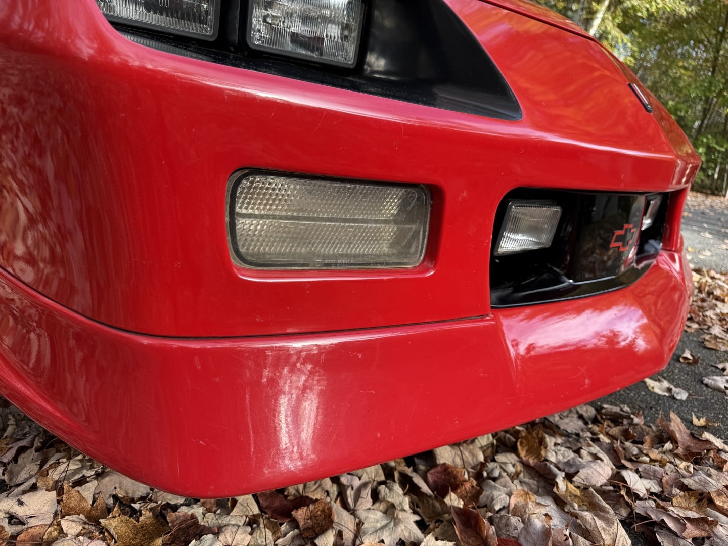 Finished in Bright Red, the GM paint code for the car is 81. Other exterior features include fog lights surrounding the undrilled Chevy emblem portion of the bumper cover intended for a front licence plate; T-Tops, whose covers are made of lighter plexiglass, a rear aero wing, faux hood louvers, power-adjustable side mirrors, and Z28 badges on the body-color side skirts and rear bumper.