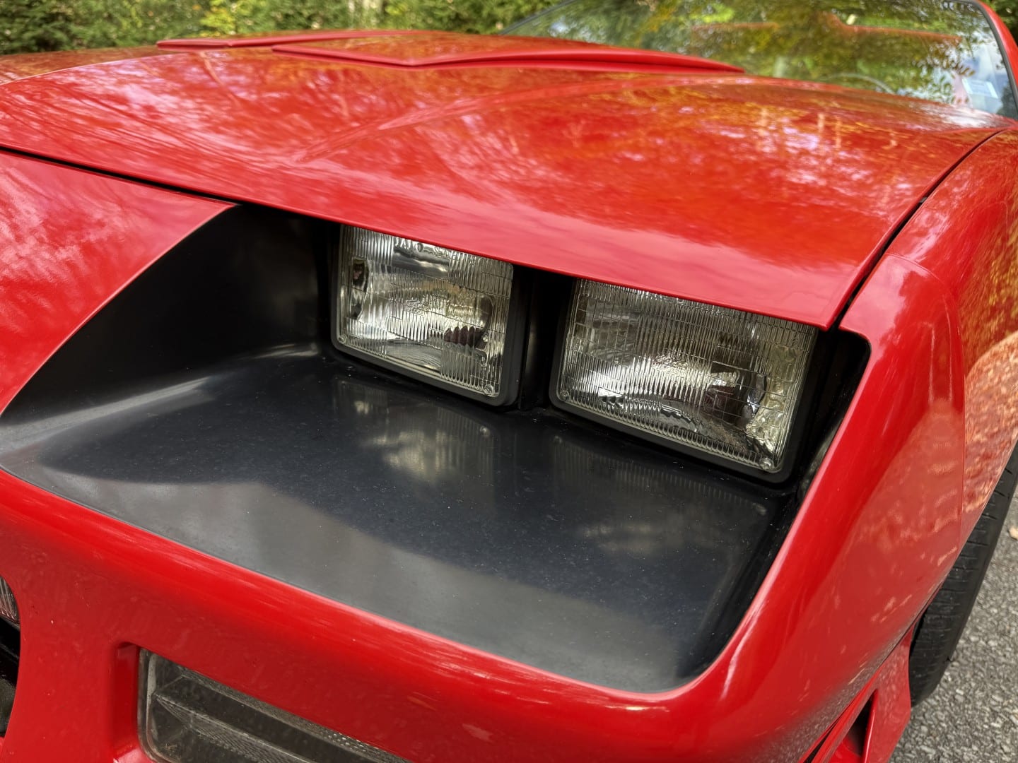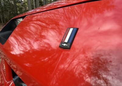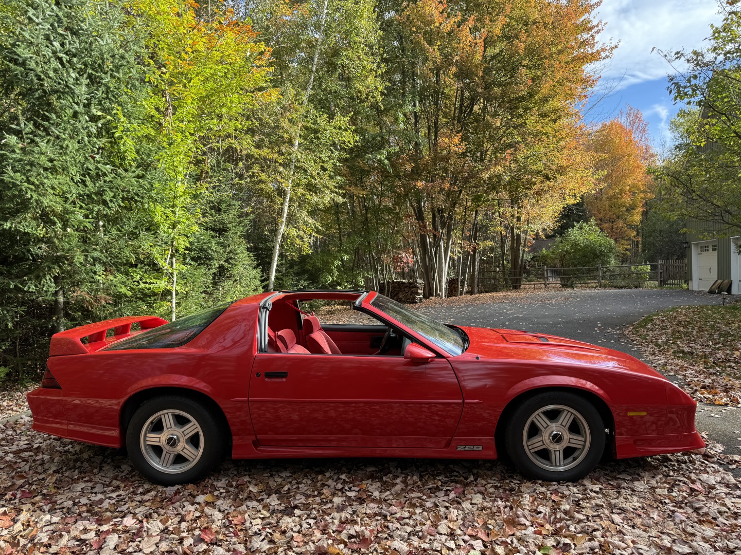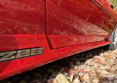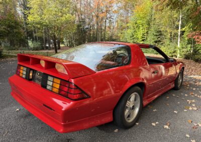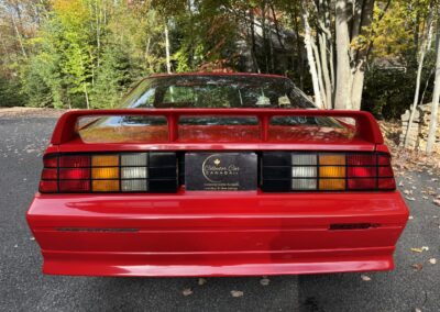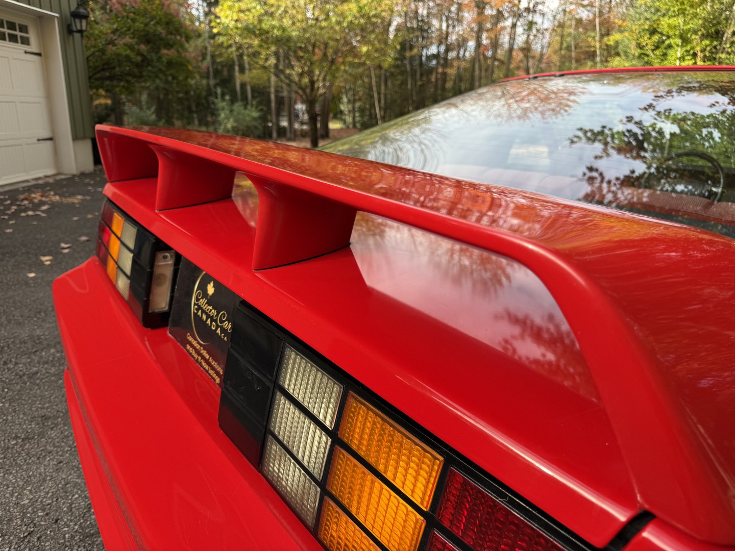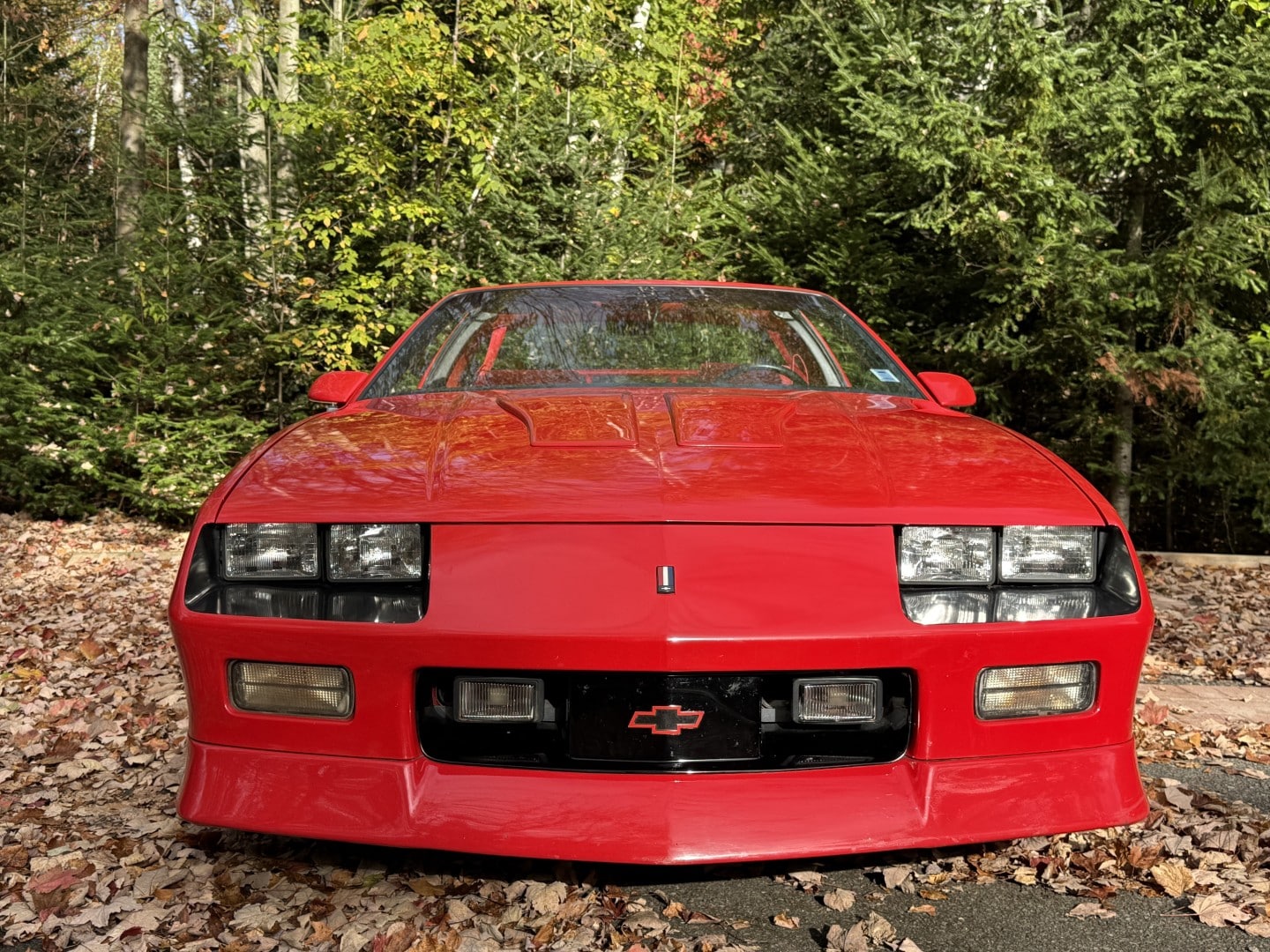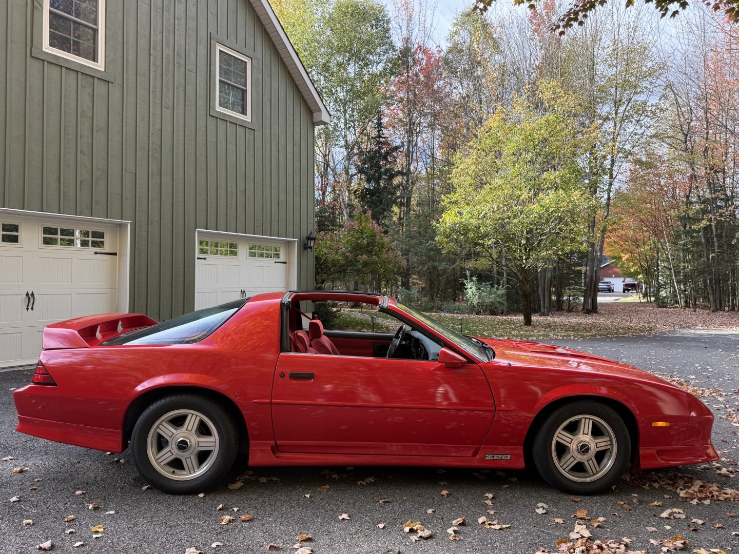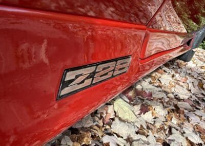 Finished in Bright Red, the GM paint code for the car is 81. Other exterior features include fog lights surrounding the undrilled Chevy emblem portion of the bumper cover intended for a front licence plate; T-Tops, whose covers are made of lighter plexiglass, a rear aero wing, faux hood louvers, power-adjustable side mirrors, and Z28 badges on the body-color side skirts and rear bumper.