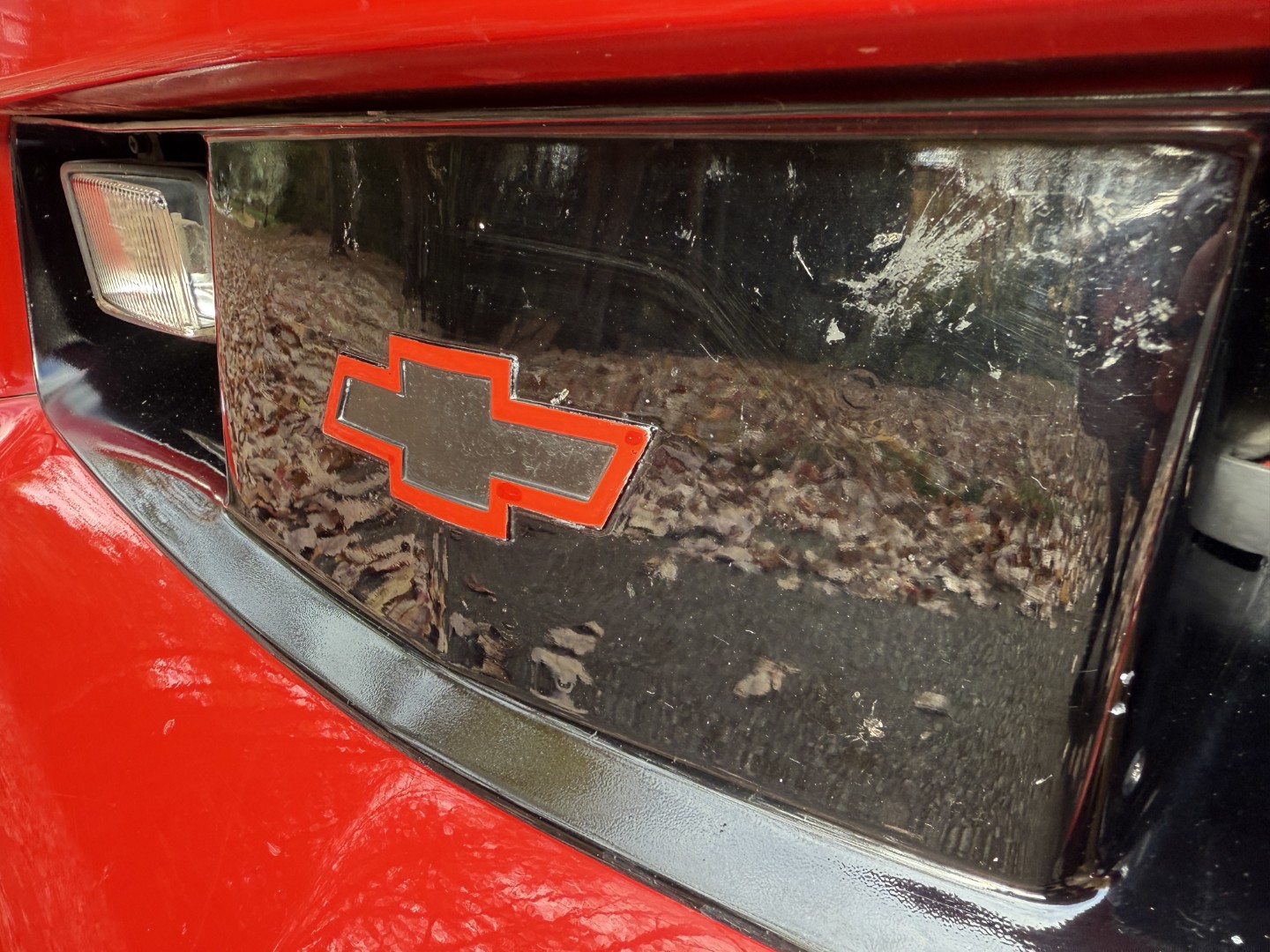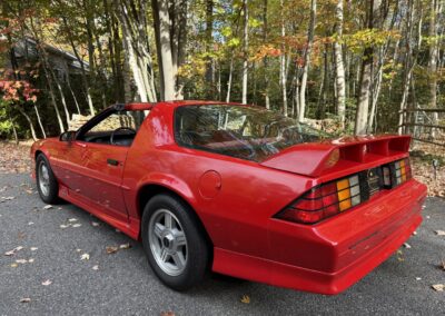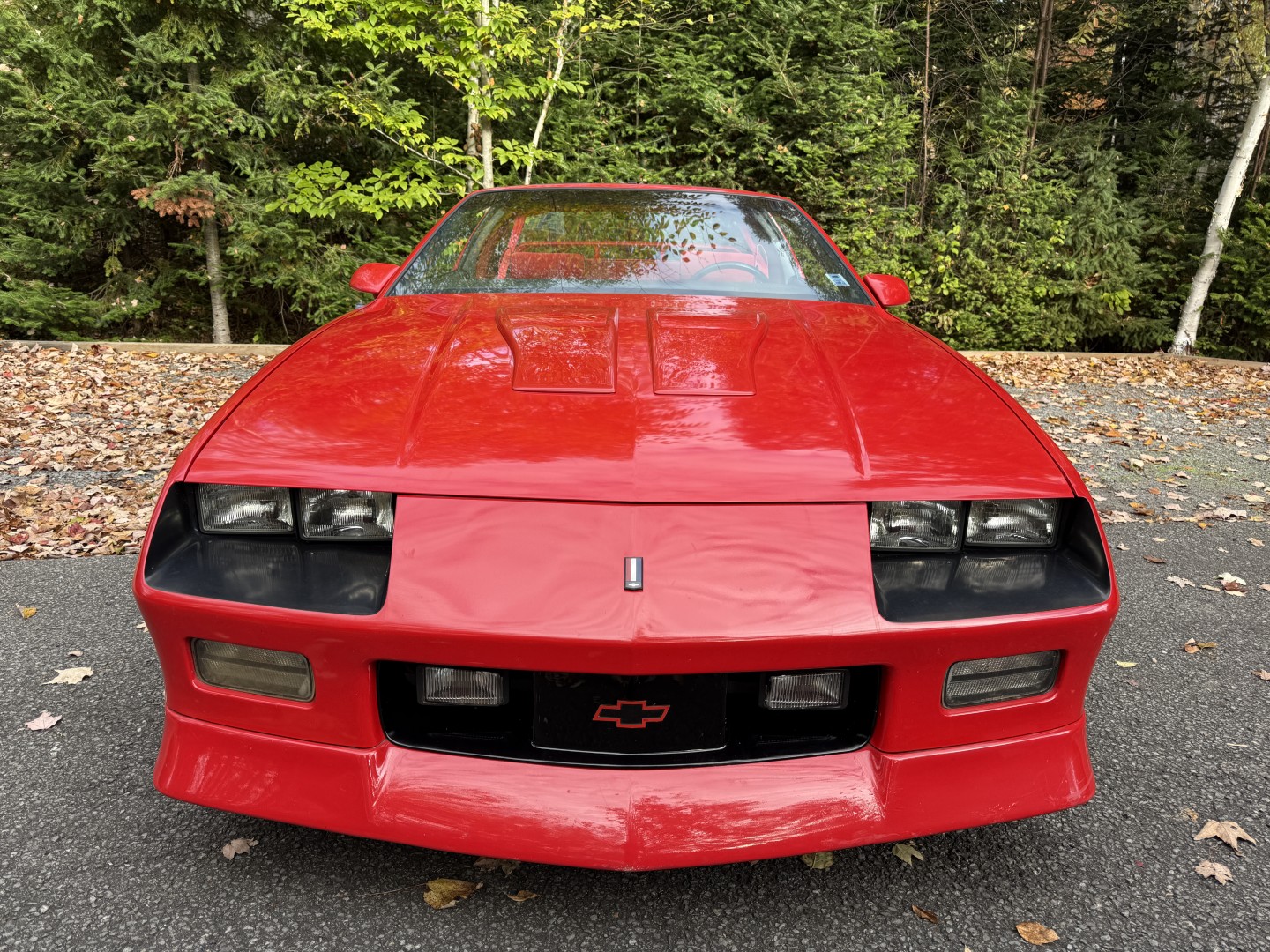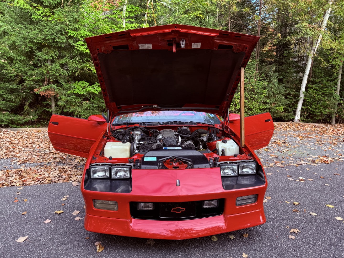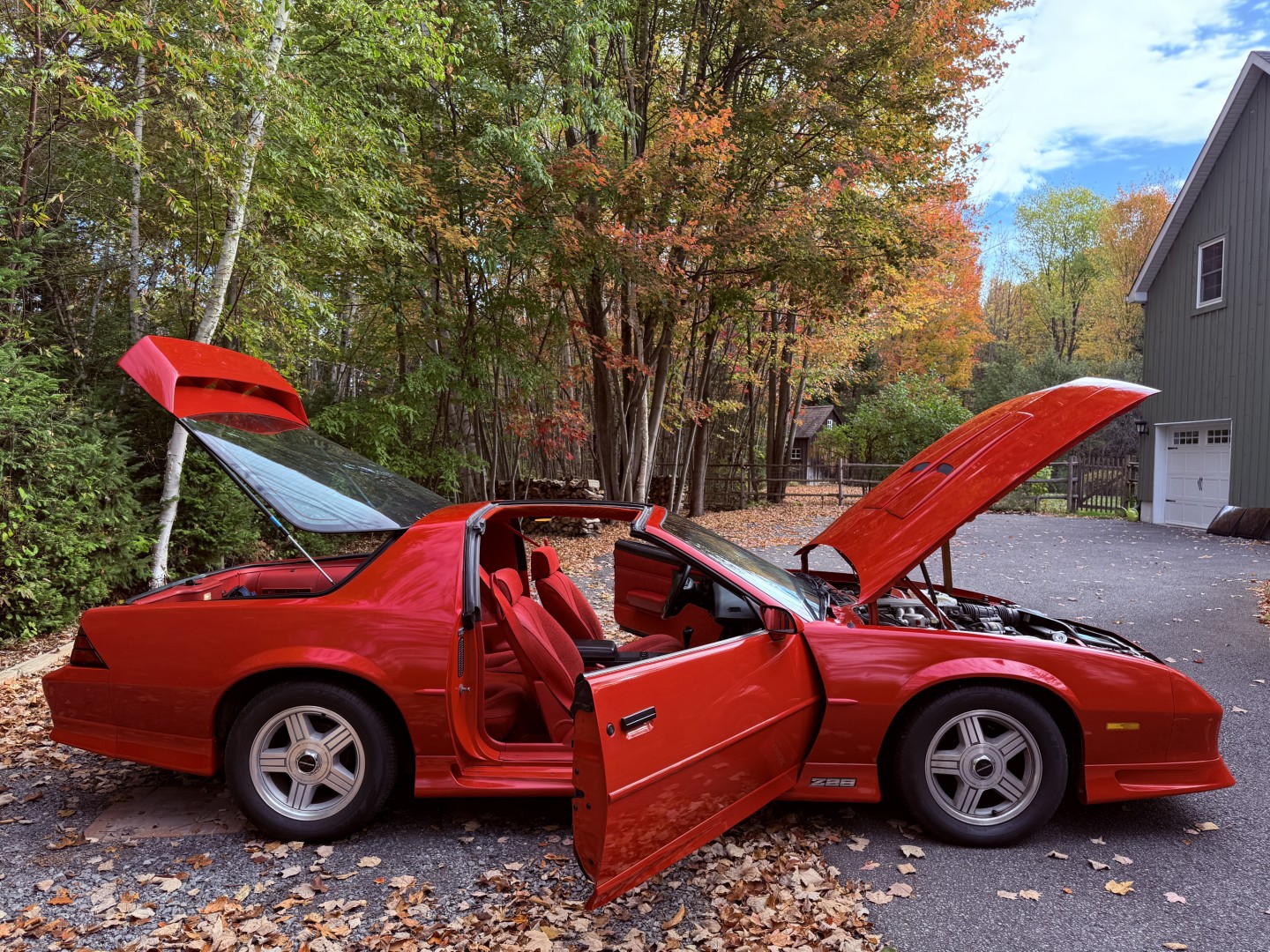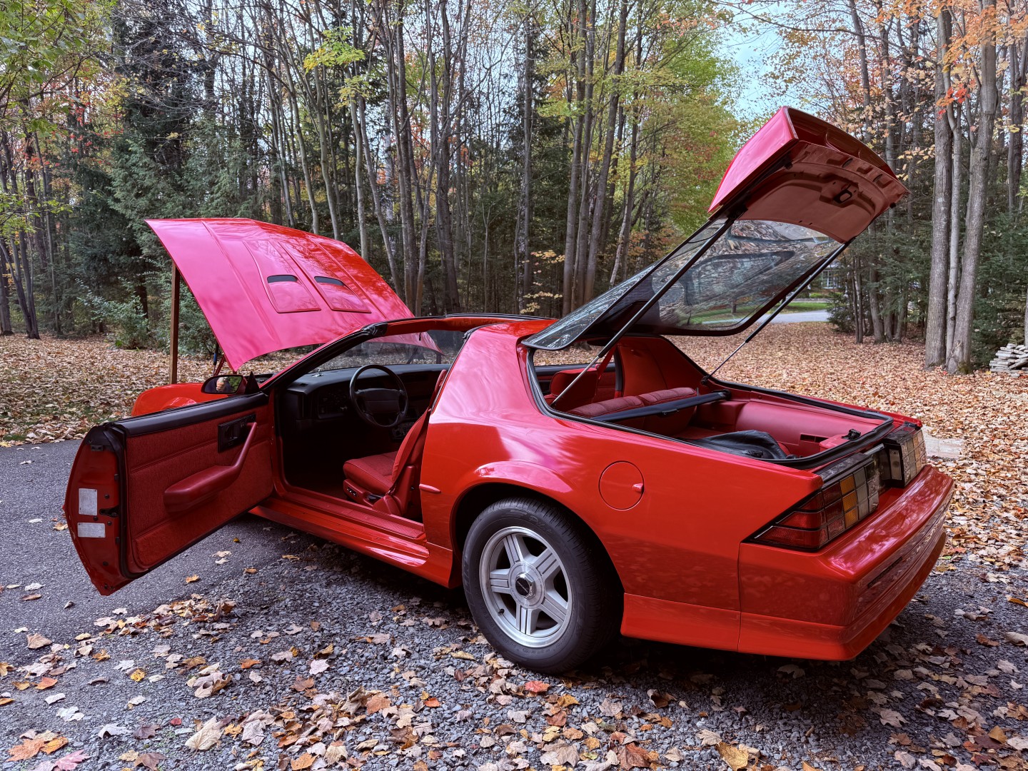 Finished in Bright Red, the GM paint code for the car is 81. Other exterior features include fog lights surrounding the undrilled Chevy emblem portion of the bumper cover intended for a front licence plate; T-Tops, whose covers are made of lighter plexiglass, a rear aero wing, faux hood louvers, power-adjustable side mirrors, and Z28 badges on the body-color side skirts and rear bumper.