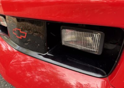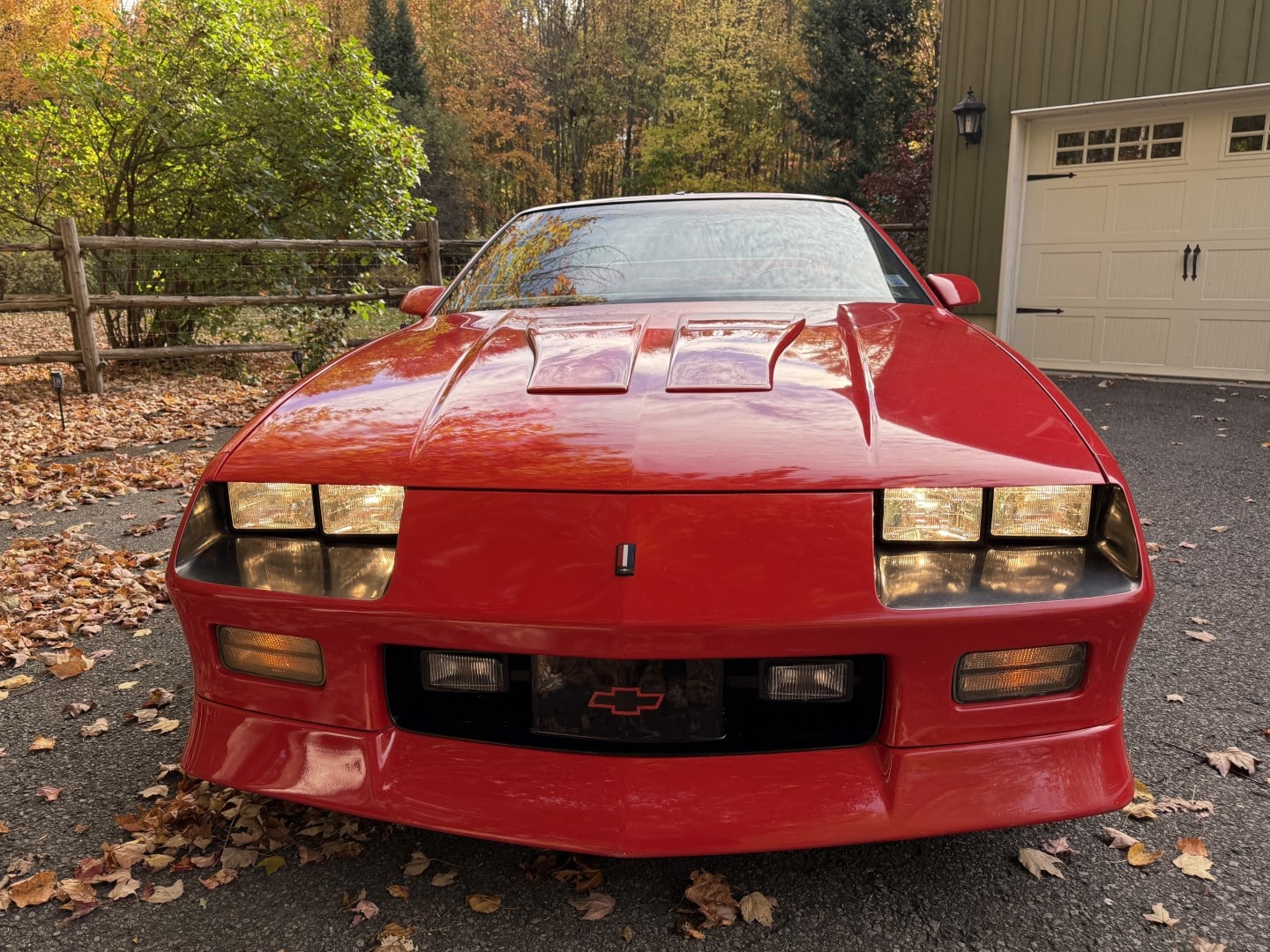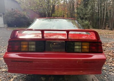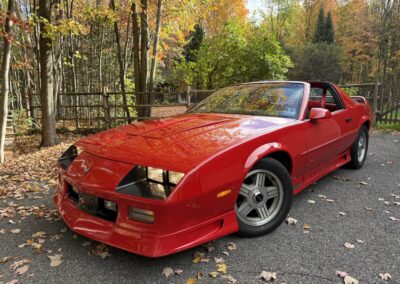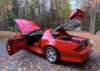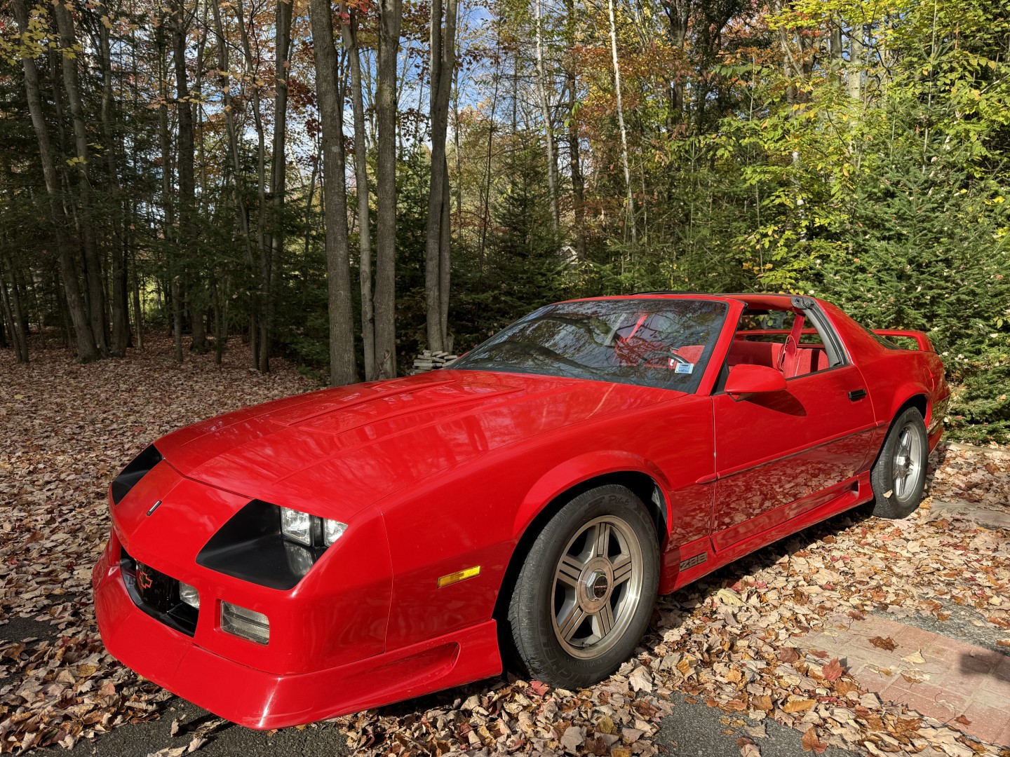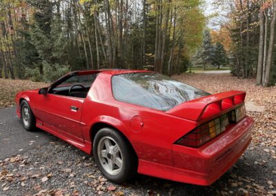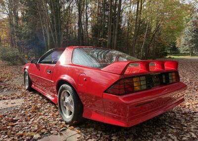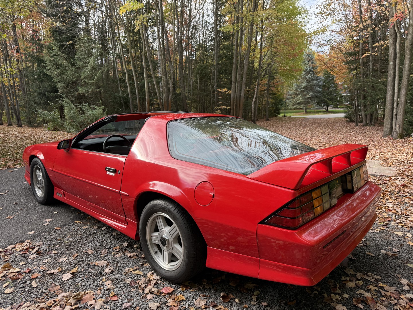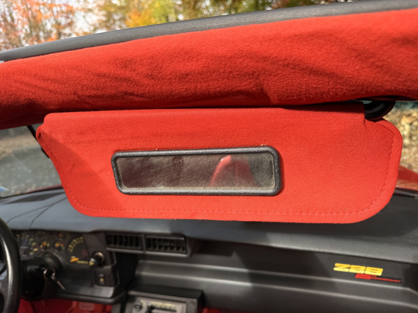 Finished in Bright Red, the GM paint code for the car is 81. Other exterior features include fog lights surrounding the undrilled Chevy emblem portion of the bumper cover intended for a front licence plate; T-Tops, whose covers are made of lighter plexiglass, a rear aero wing, faux hood louvers, power-adjustable side mirrors, and Z28 badges on the body-color side skirts and rear bumper.