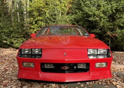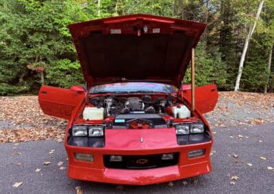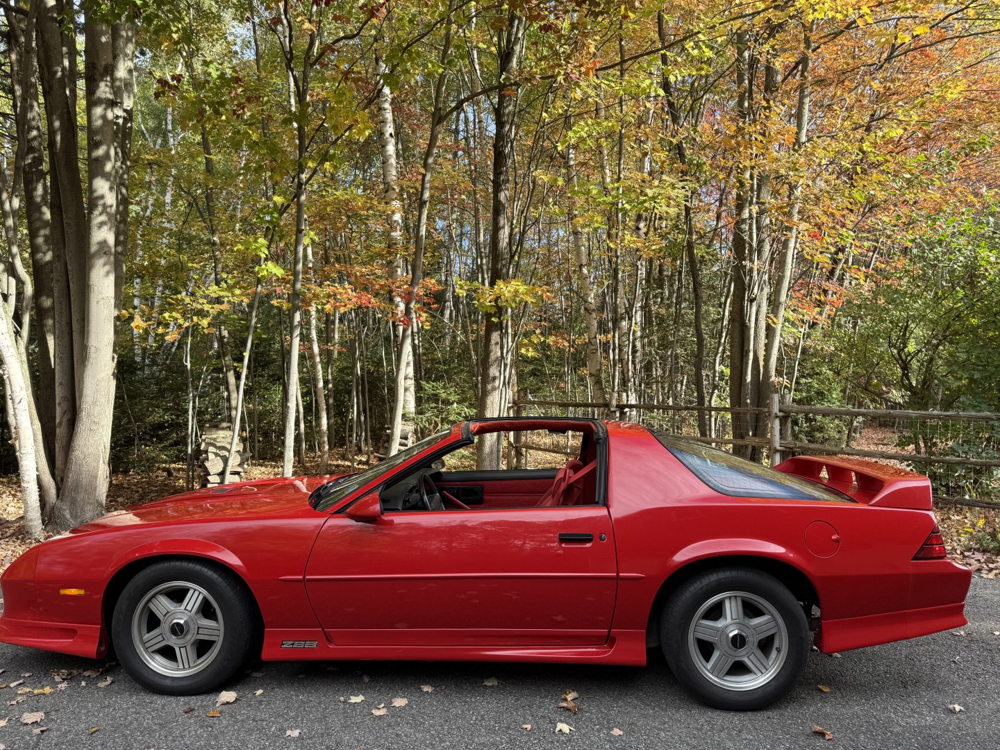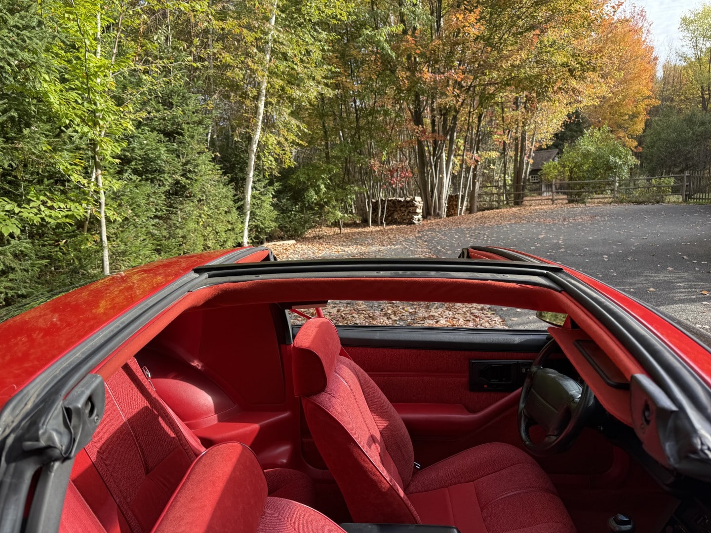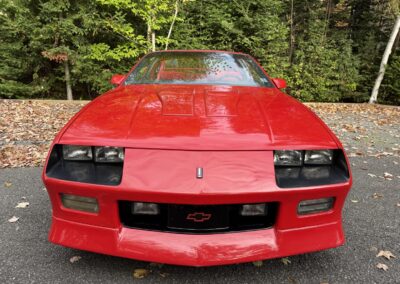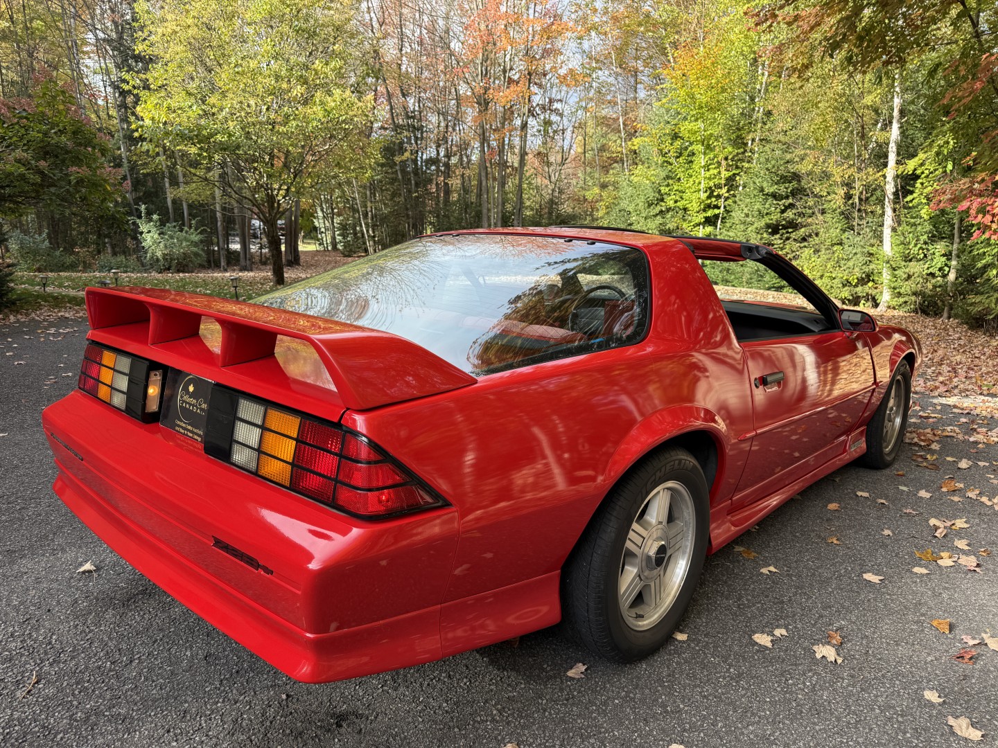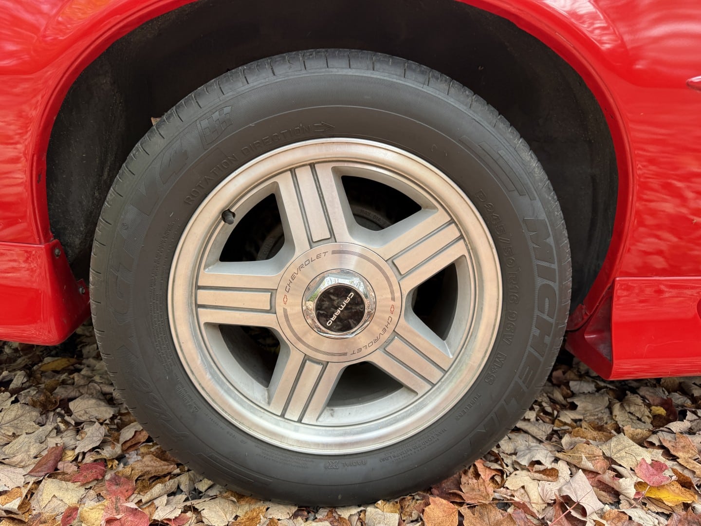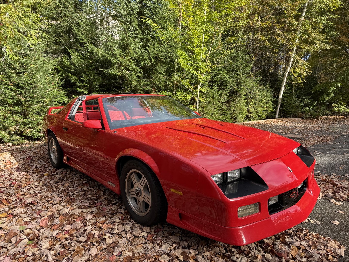 Finished in Bright Red, the GM paint code for the car is 81. Other exterior features include fog lights surrounding the undrilled Chevy emblem portion of the bumper cover intended for a front licence plate; T-Tops, whose covers are made of lighter plexiglass, a rear aero wing, faux hood louvers, power-adjustable side mirrors, and Z28 badges on the body-color side skirts and rear bumper.