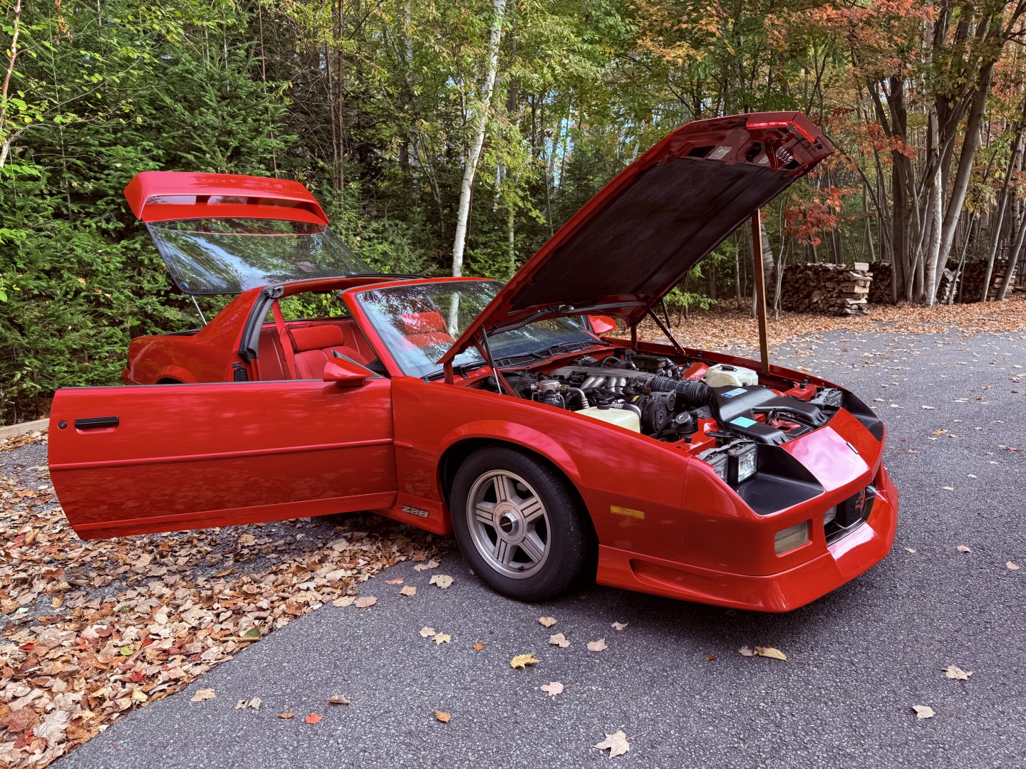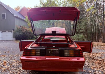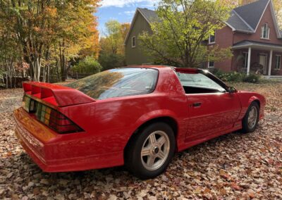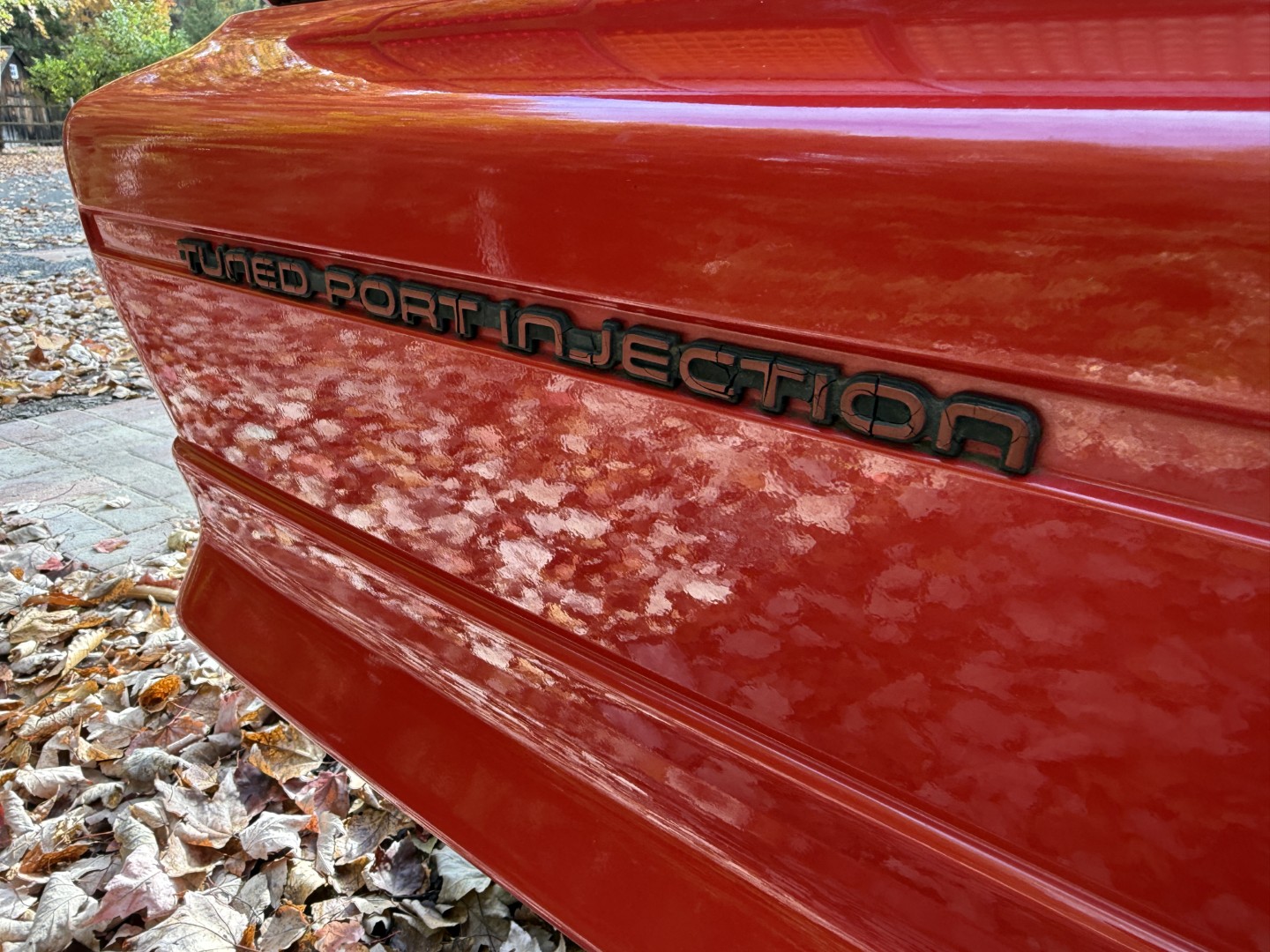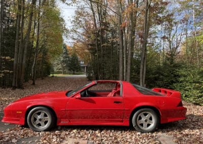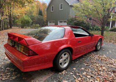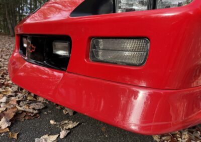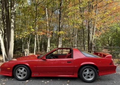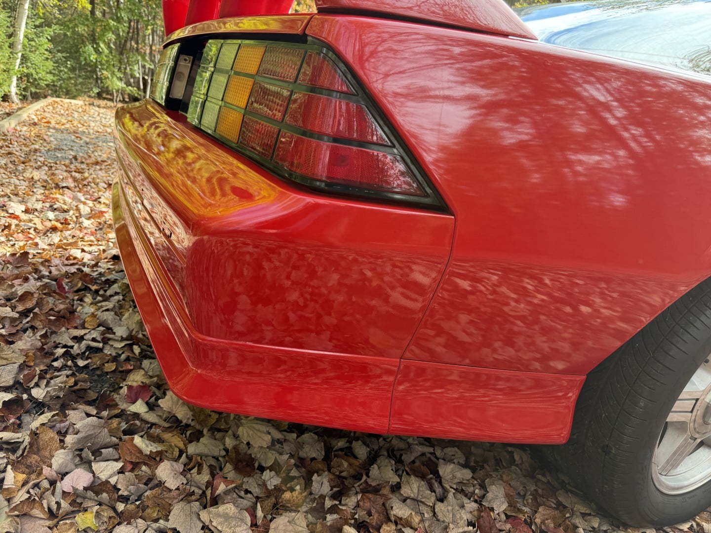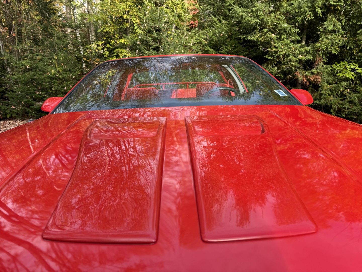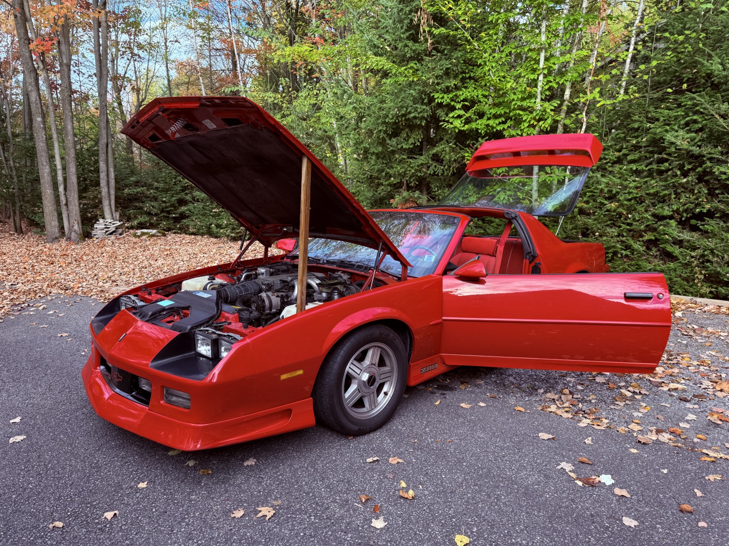 Finished in Bright Red, the GM paint code for the car is 81. Other exterior features include fog lights surrounding the undrilled Chevy emblem portion of the bumper cover intended for a front licence plate; T-Tops, whose covers are made of lighter plexiglass, a rear aero wing, faux hood louvers, power-adjustable side mirrors, and Z28 badges on the body-color side skirts and rear bumper.