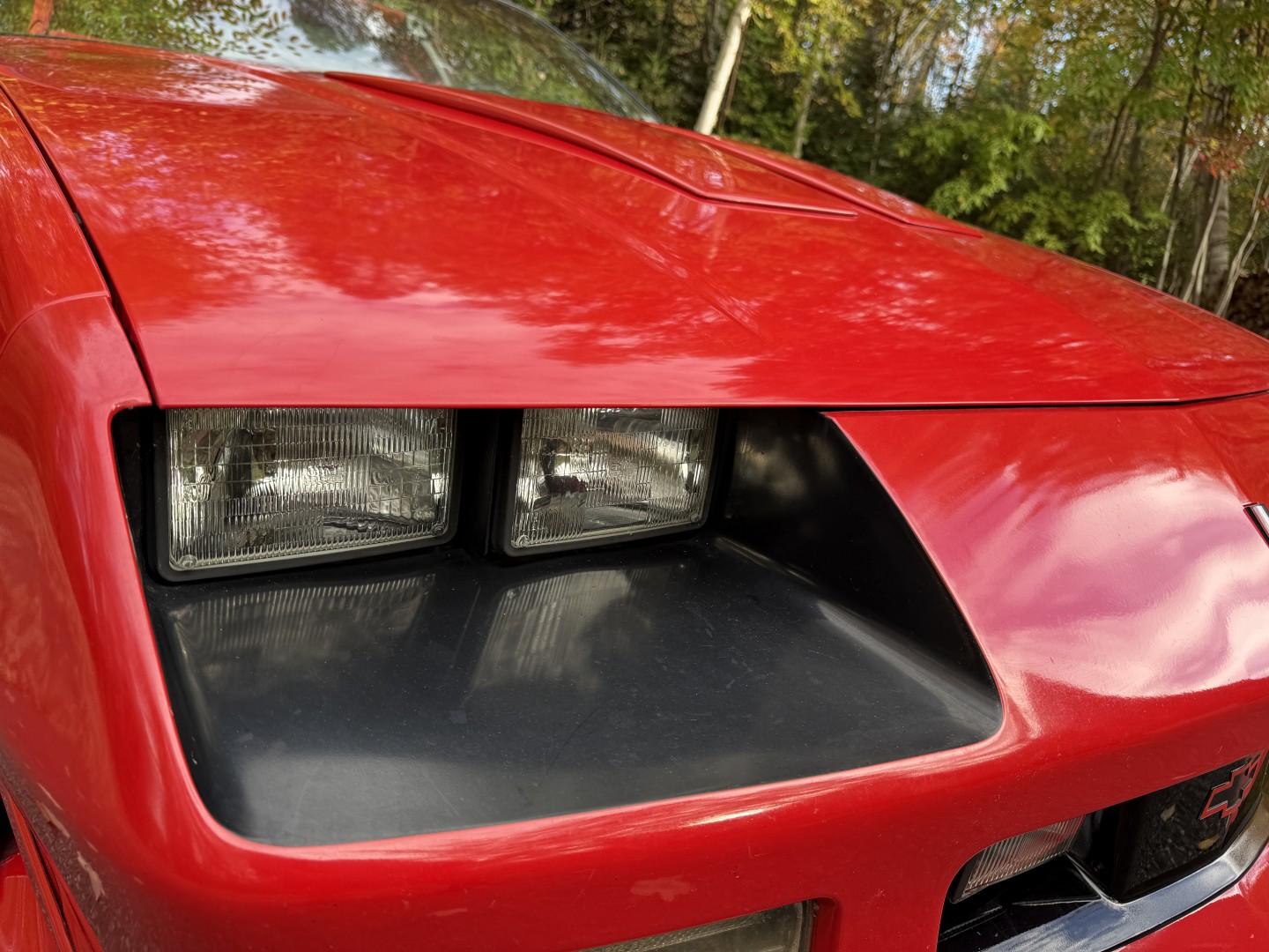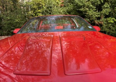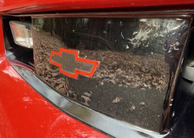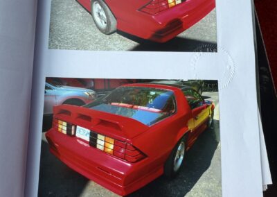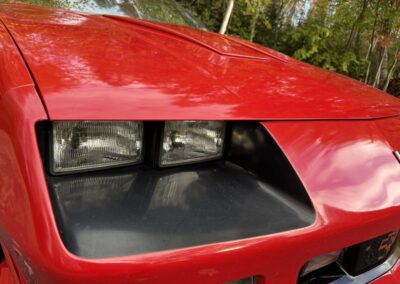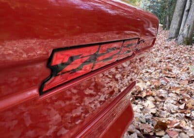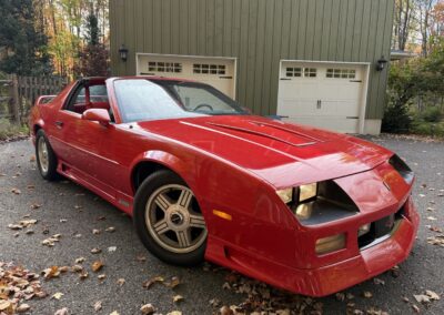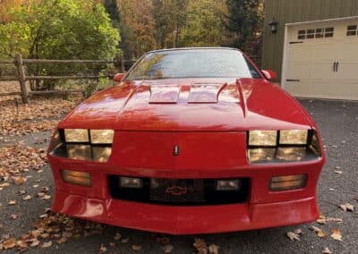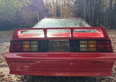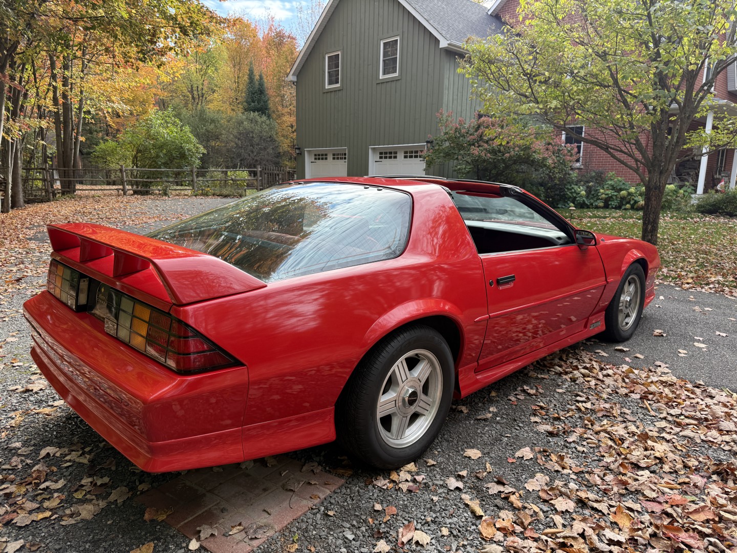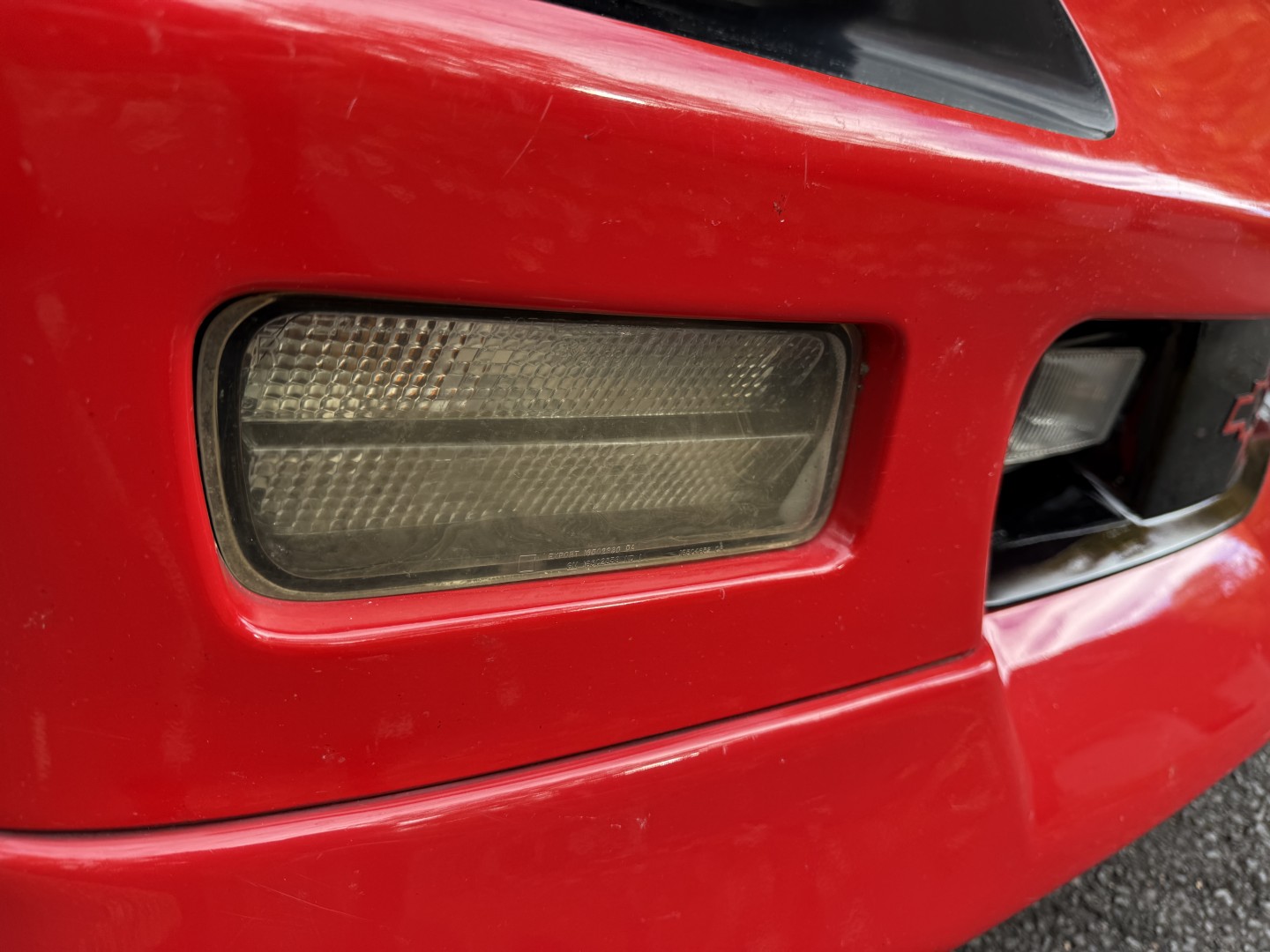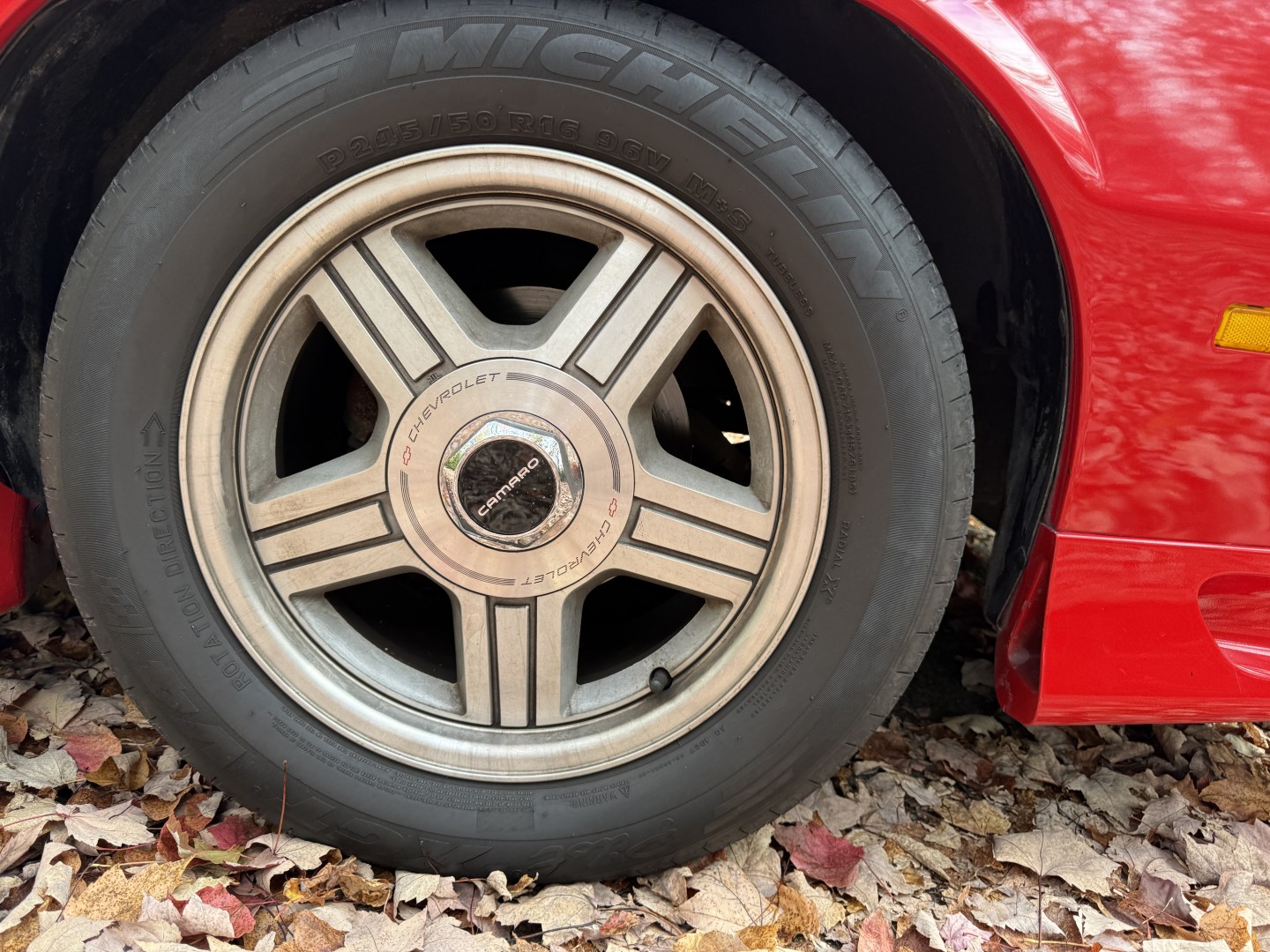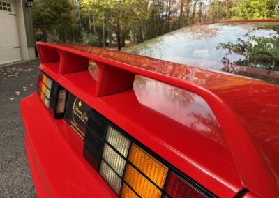 Finished in Bright Red, the GM paint code for the car is 81. Other exterior features include fog lights surrounding the undrilled Chevy emblem portion of the bumper cover intended for a front licence plate; T-Tops, whose covers are made of lighter plexiglass, a rear aero wing, faux hood louvers, power-adjustable side mirrors, and Z28 badges on the body-color side skirts and rear bumper.