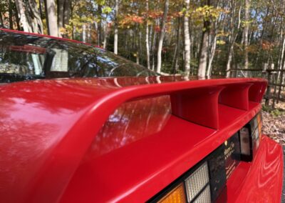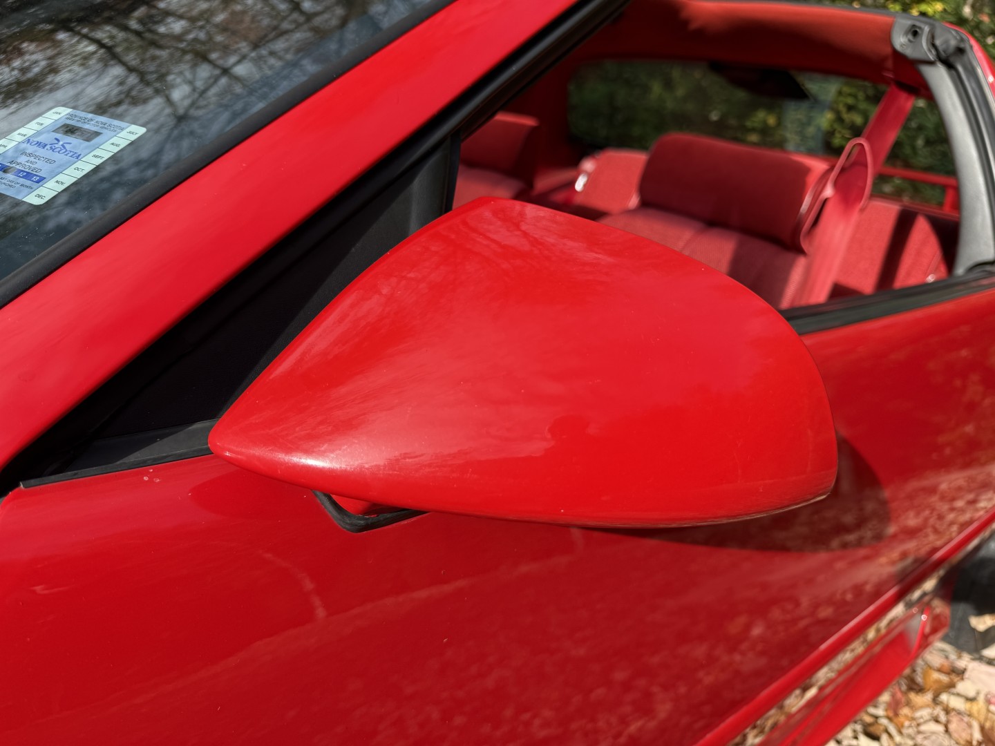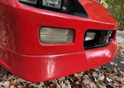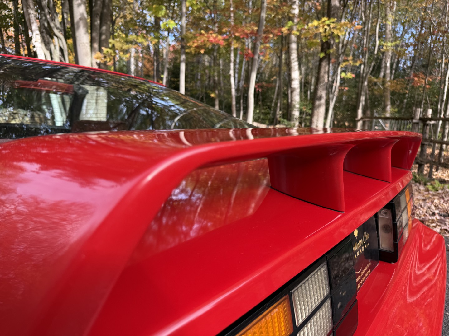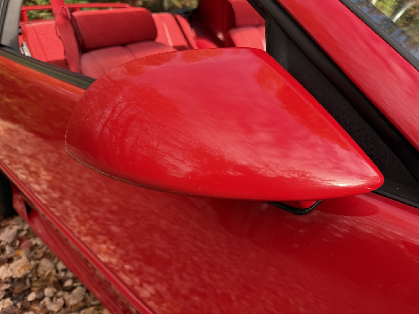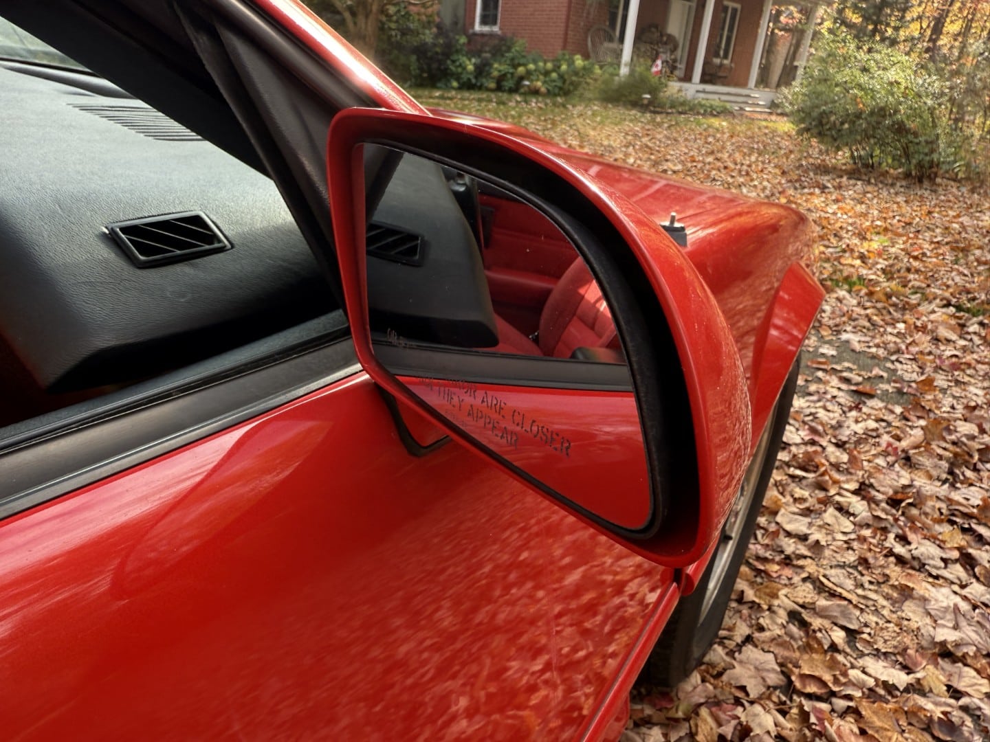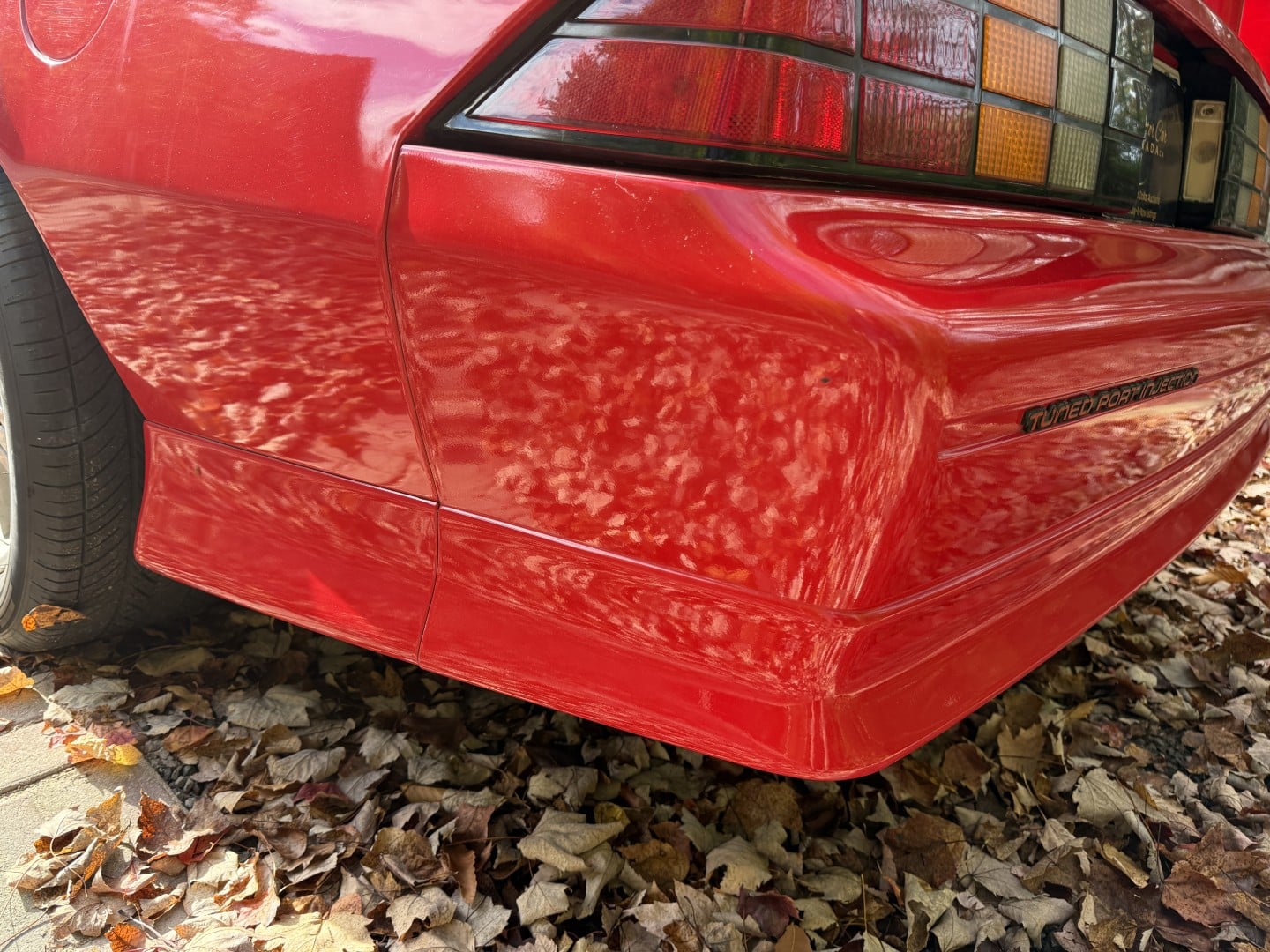 Finished in Bright Red, the GM paint code for the car is 81. Other exterior features include fog lights surrounding the undrilled Chevy emblem portion of the bumper cover intended for a front licence plate; T-Tops, whose covers are made of lighter plexiglass, a rear aero wing, faux hood louvers, power-adjustable side mirrors, and Z28 badges on the body-color side skirts and rear bumper.