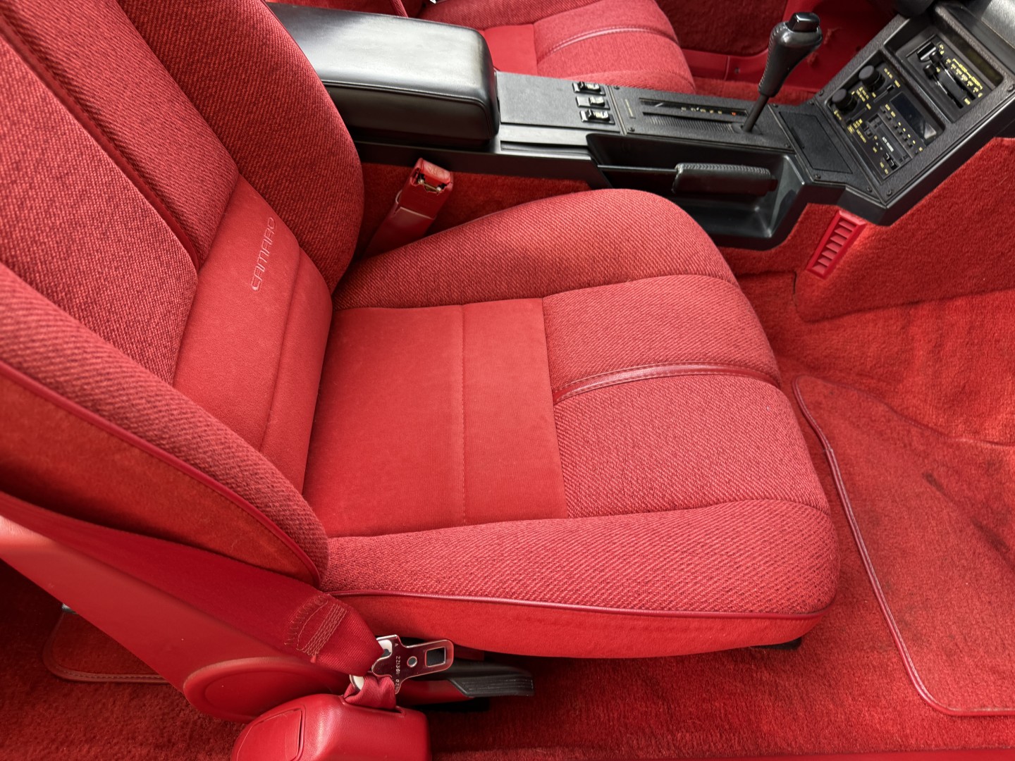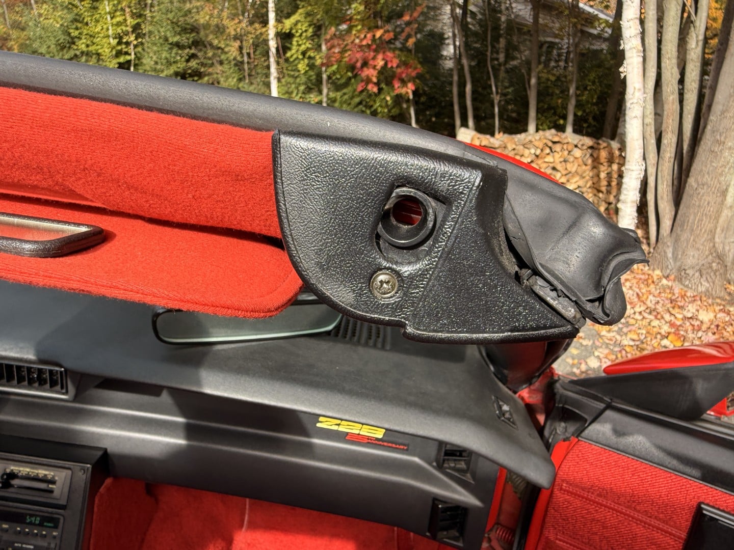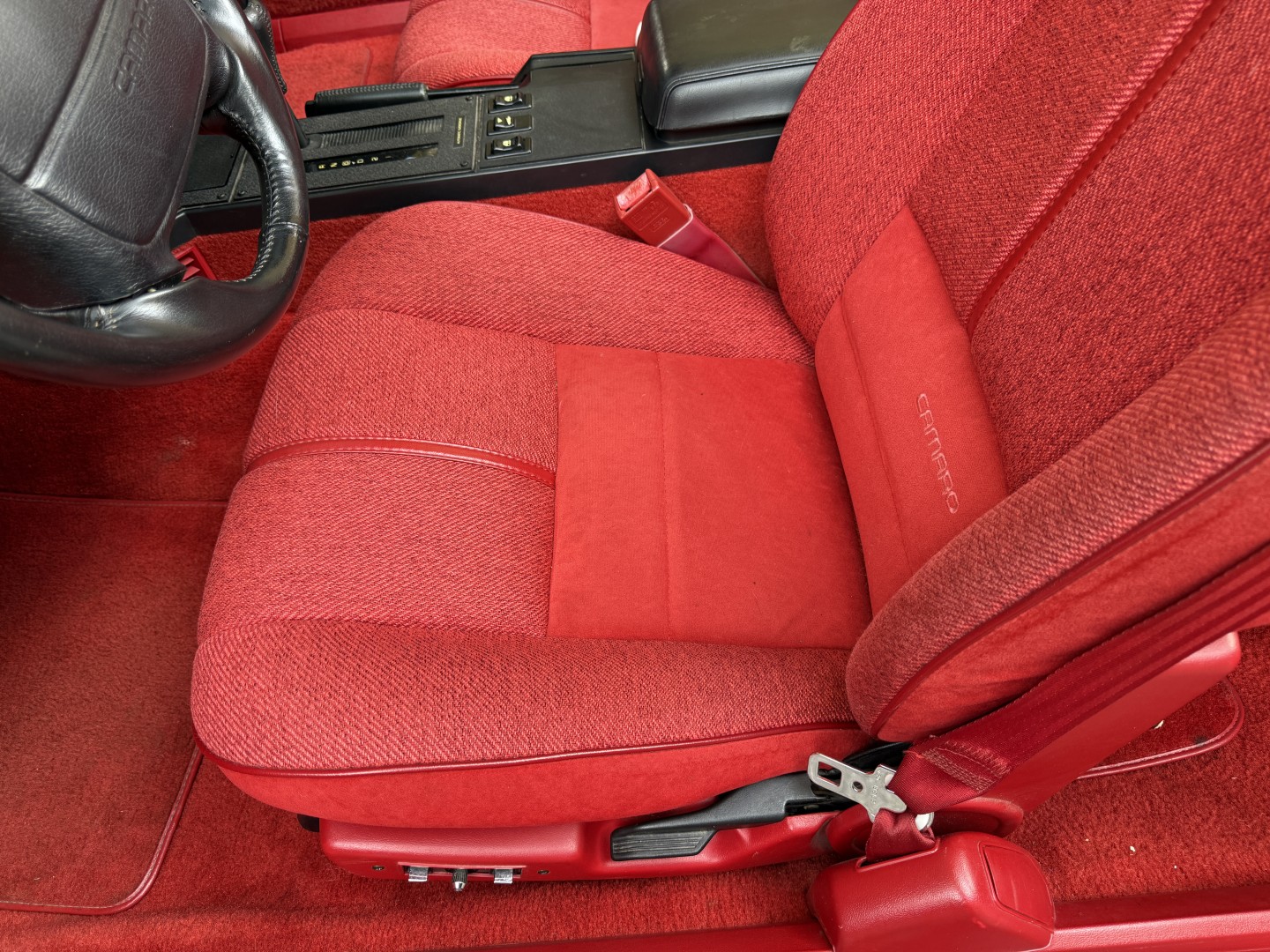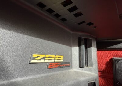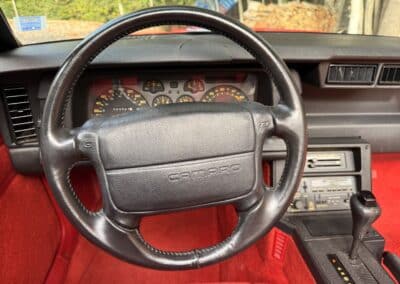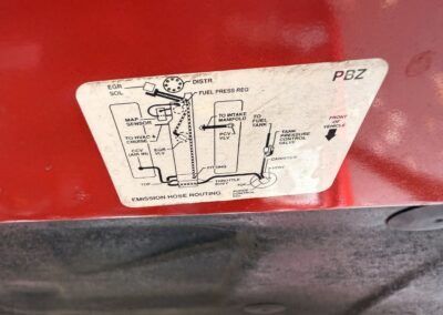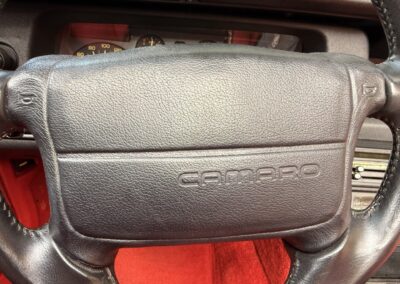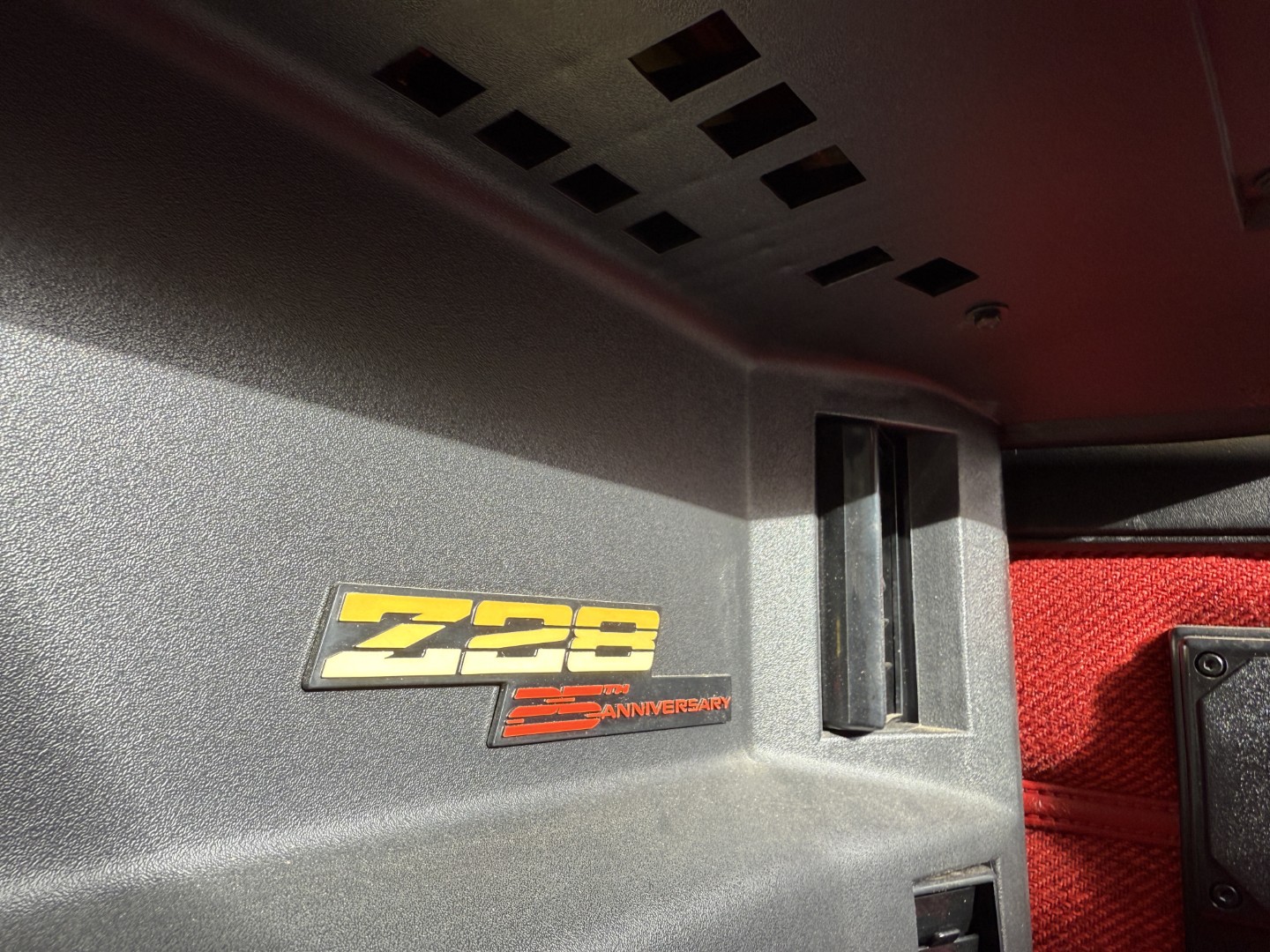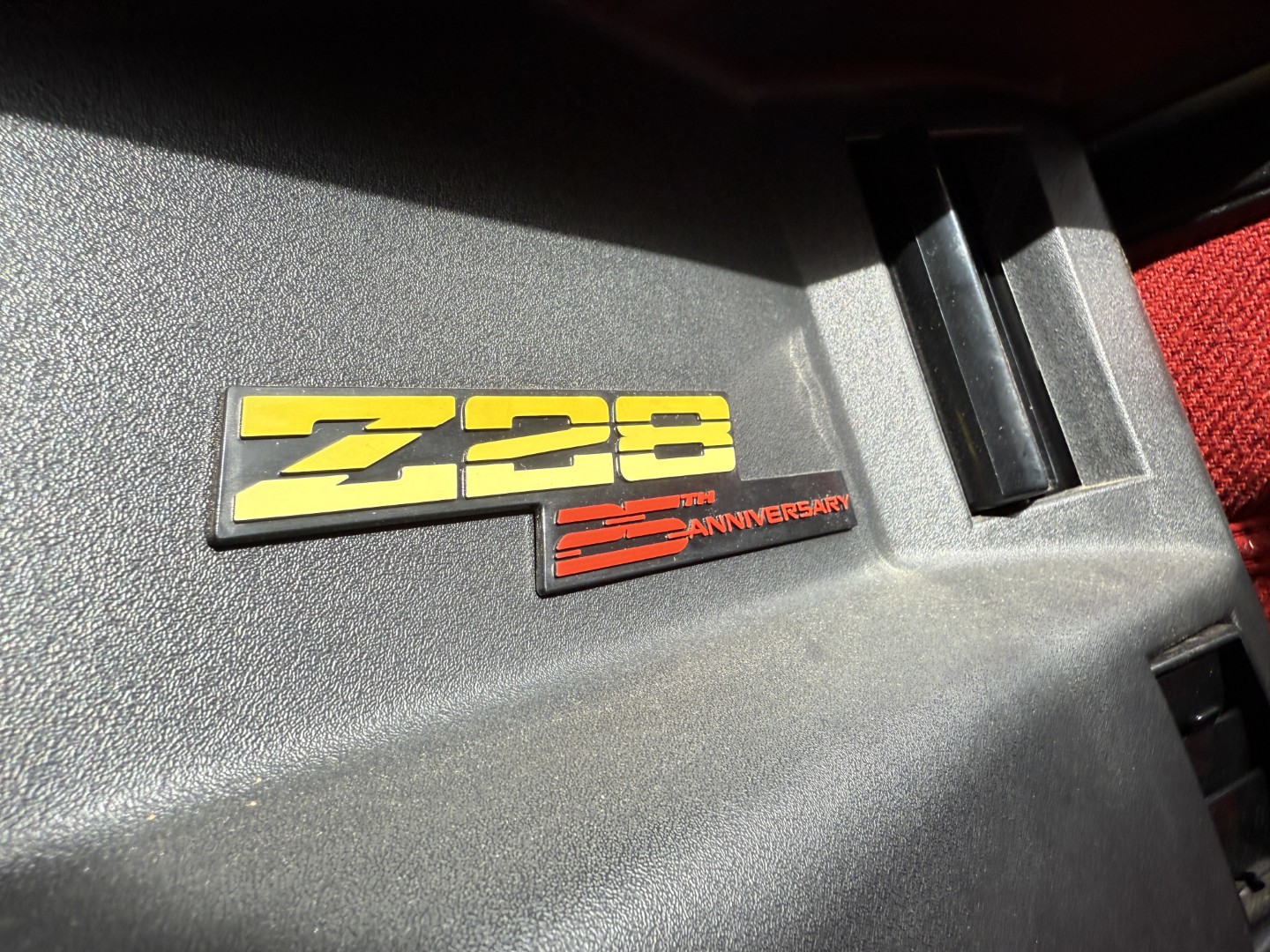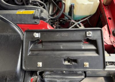 The four seats feature CAMARO-embroidered buckets up front, power-adjustable for the driver, and are upholstered in Red Custom cloth (GM Code 73C) and are matched by the door cards, floor mats with GM emblems and carpeting. Features include a Z28 25th Anniversary badging on the dashboard – the first Camaro was a 1967 model, cruise control, air conditioning, a power hatch release with motorized latch, factory ETR AM/FM/cassette with seek/scan for cassette tracks, with power windows, locks, and mirrors. We note cracking in the dash above instrumentation. There is a generous storage compartment under the arm rest while the owner had the rear-view mirror re-adhered at the time of its Ontario safety check appointment (since the Gallery photos were taken).