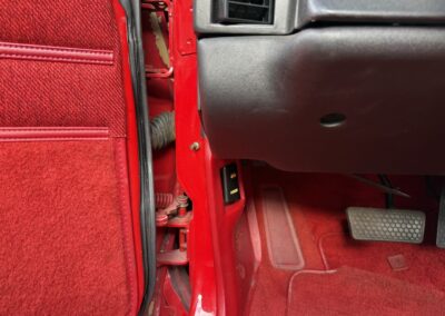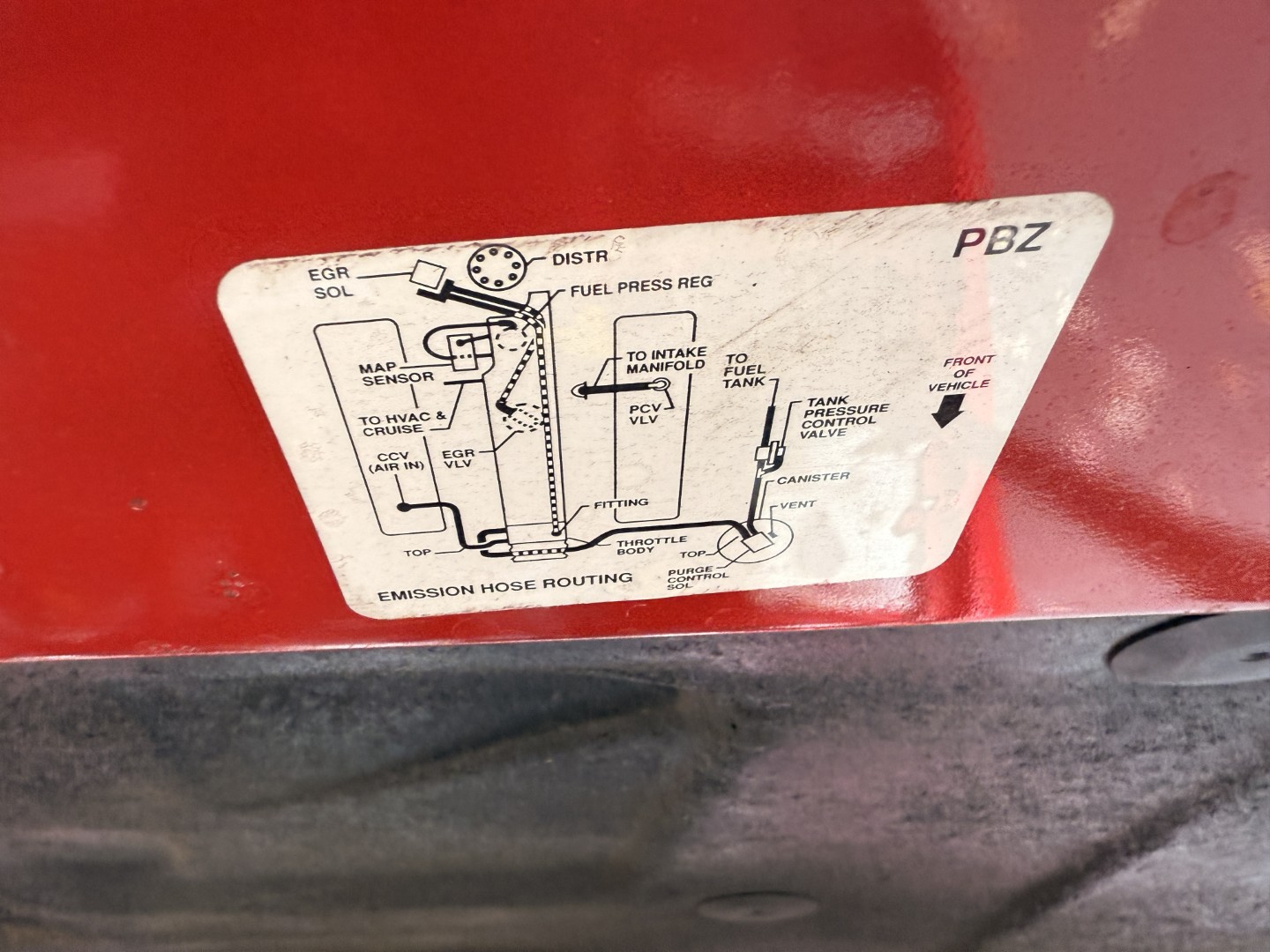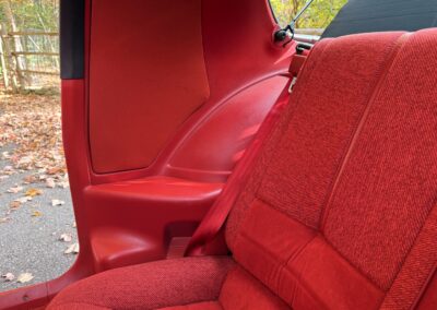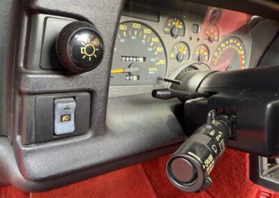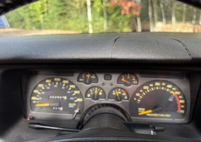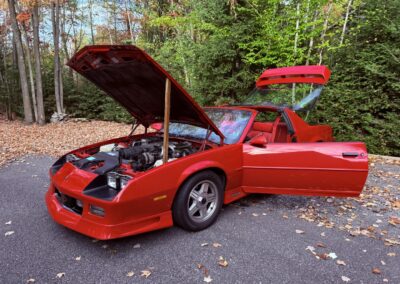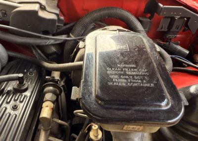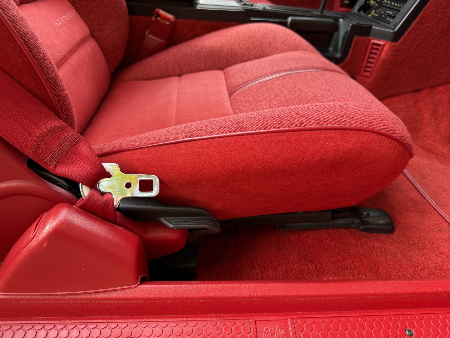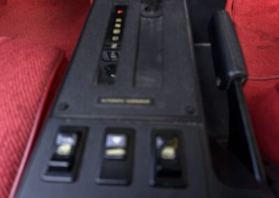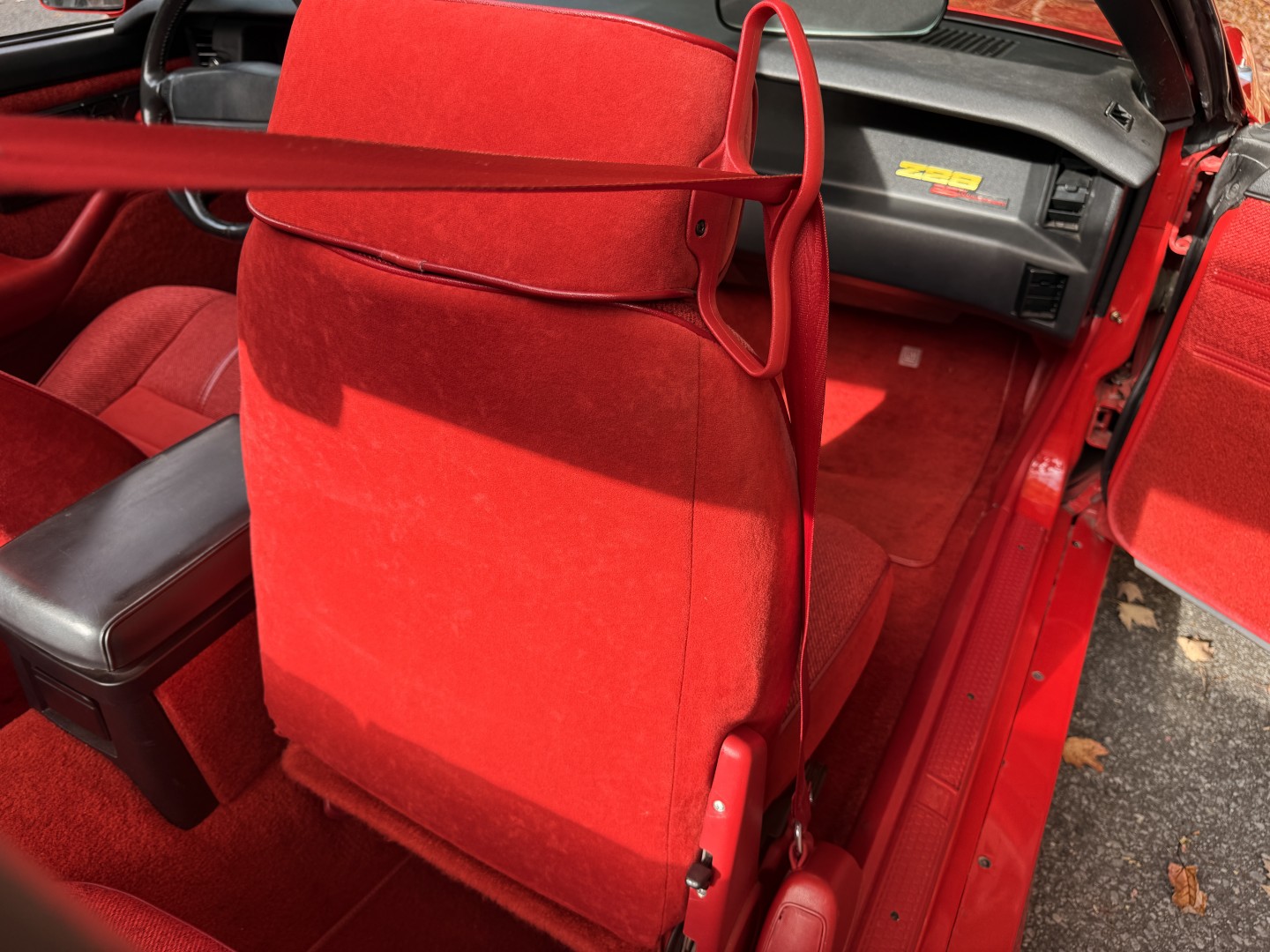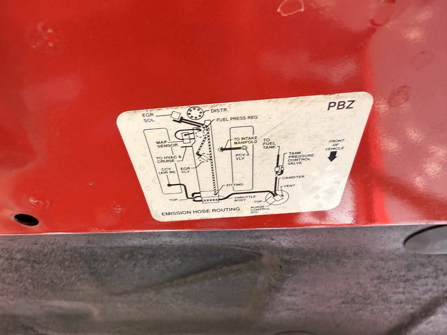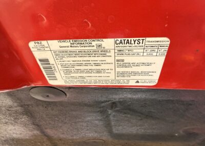 The four seats feature CAMARO-embroidered buckets up front, power-adjustable for the driver, and are upholstered in Red Custom cloth (GM Code 73C) and are matched by the door cards, floor mats with GM emblems and carpeting. Features include a Z28 25th Anniversary badging on the dashboard – the first Camaro was a 1967 model, cruise control, air conditioning, a power hatch release with motorized latch, factory ETR AM/FM/cassette with seek/scan for cassette tracks, with power windows, locks, and mirrors. We note cracking in the dash above instrumentation. There is a generous storage compartment under the arm rest while the owner had the rear-view mirror re-adhered at the time of its Ontario safety check appointment (since the Gallery photos were taken).