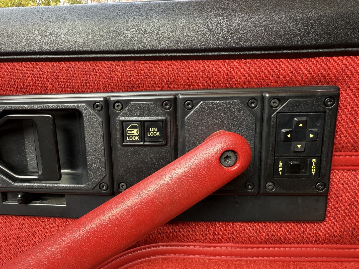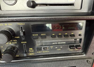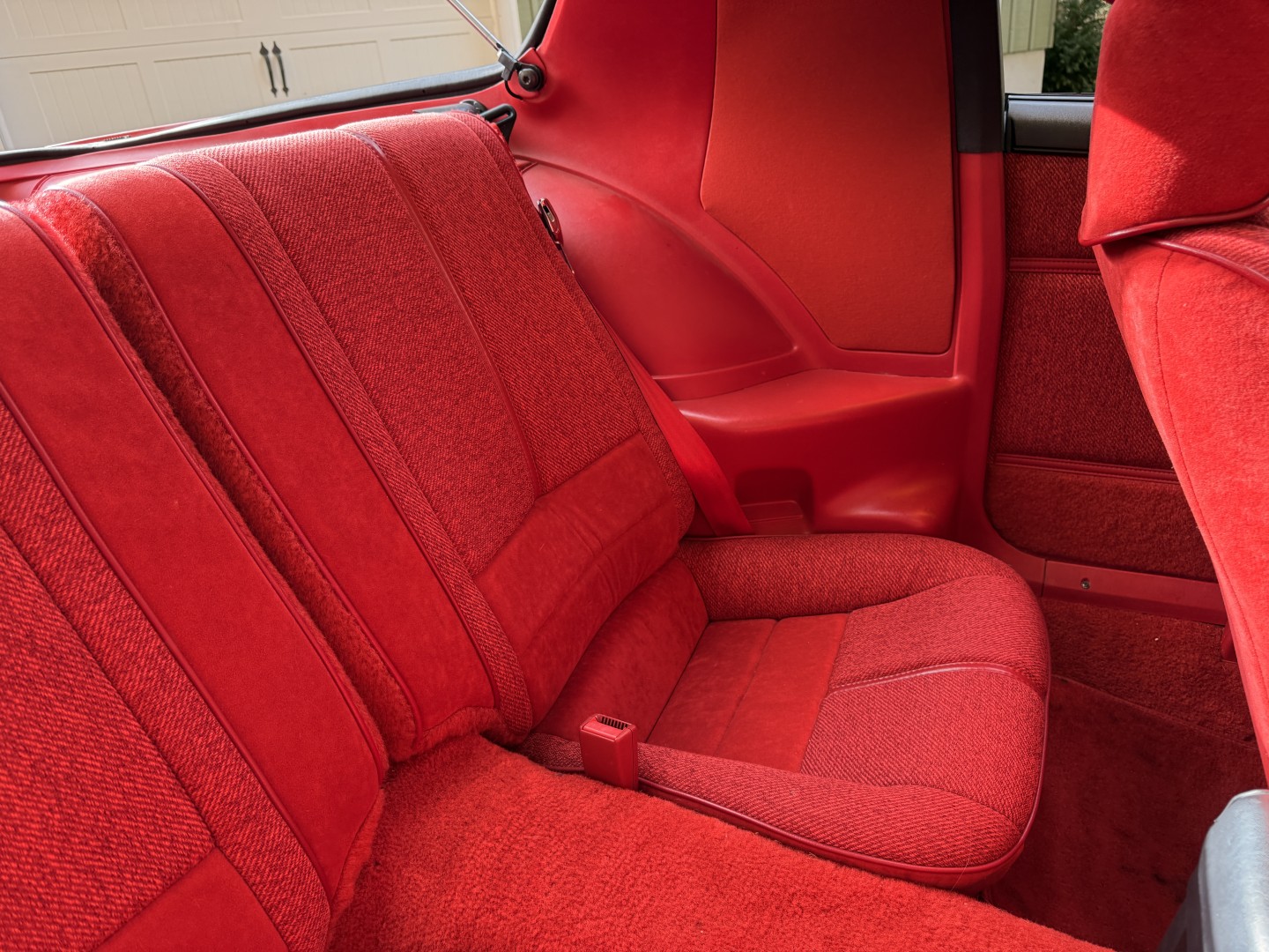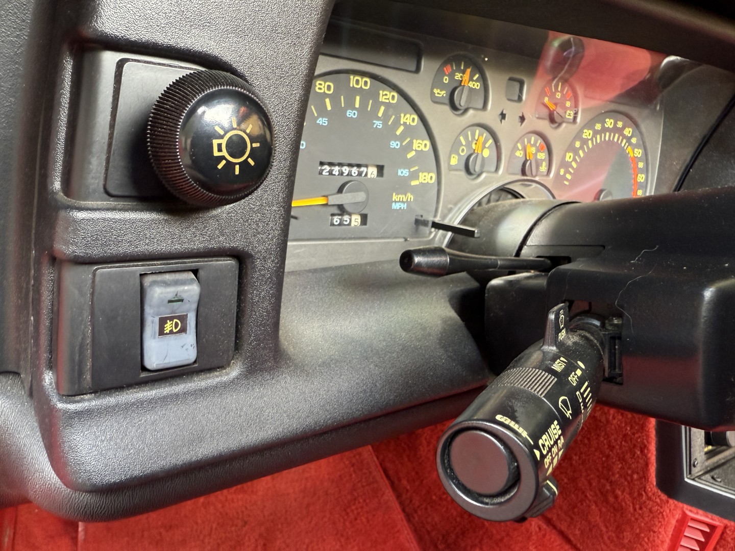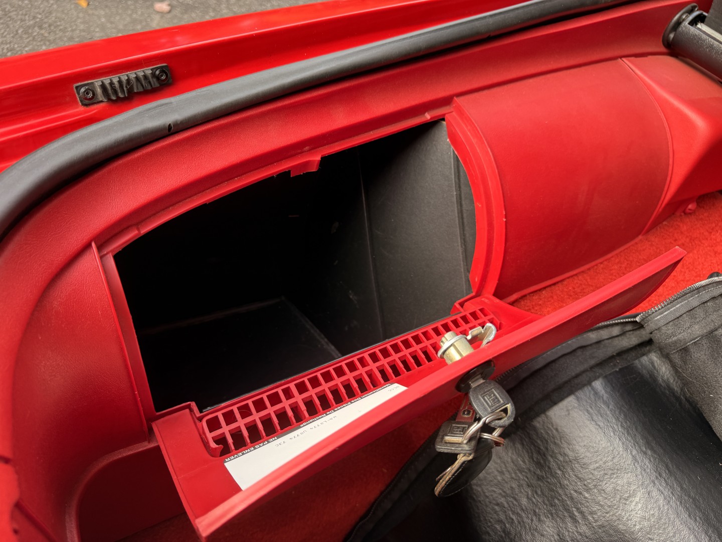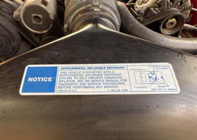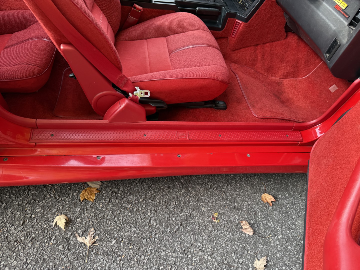 The four seats feature CAMARO-embroidered buckets up front, power-adjustable for the driver, and are upholstered in Red Custom cloth (GM Code 73C) and are matched by the door cards, floor mats with GM emblems and carpeting. Features include a Z28 25th Anniversary badging on the dashboard – the first Camaro was a 1967 model, cruise control, air conditioning, a power hatch release with motorized latch, factory ETR AM/FM/cassette with seek/scan for cassette tracks, with power windows, locks, and mirrors. We note cracking in the dash above instrumentation. There is a generous storage compartment under the arm rest while the owner had the rear-view mirror re-adhered at the time of its Ontario safety check appointment (since the Gallery photos were taken).