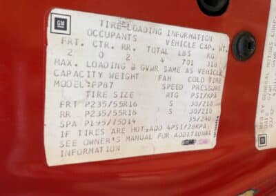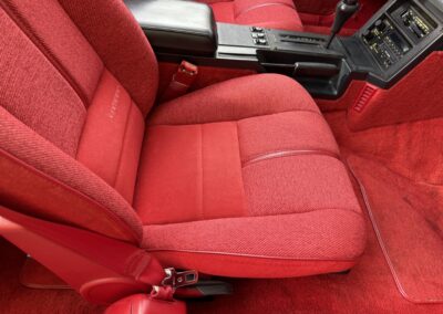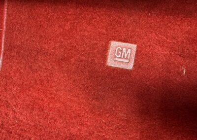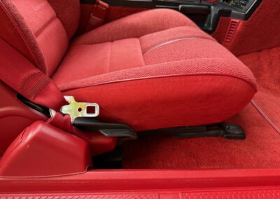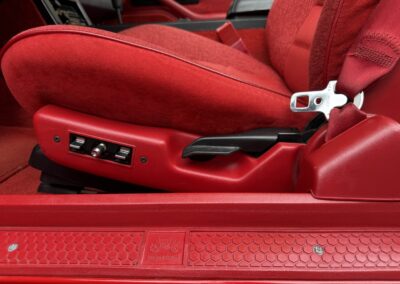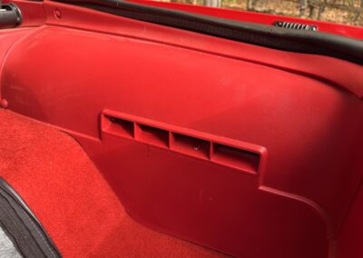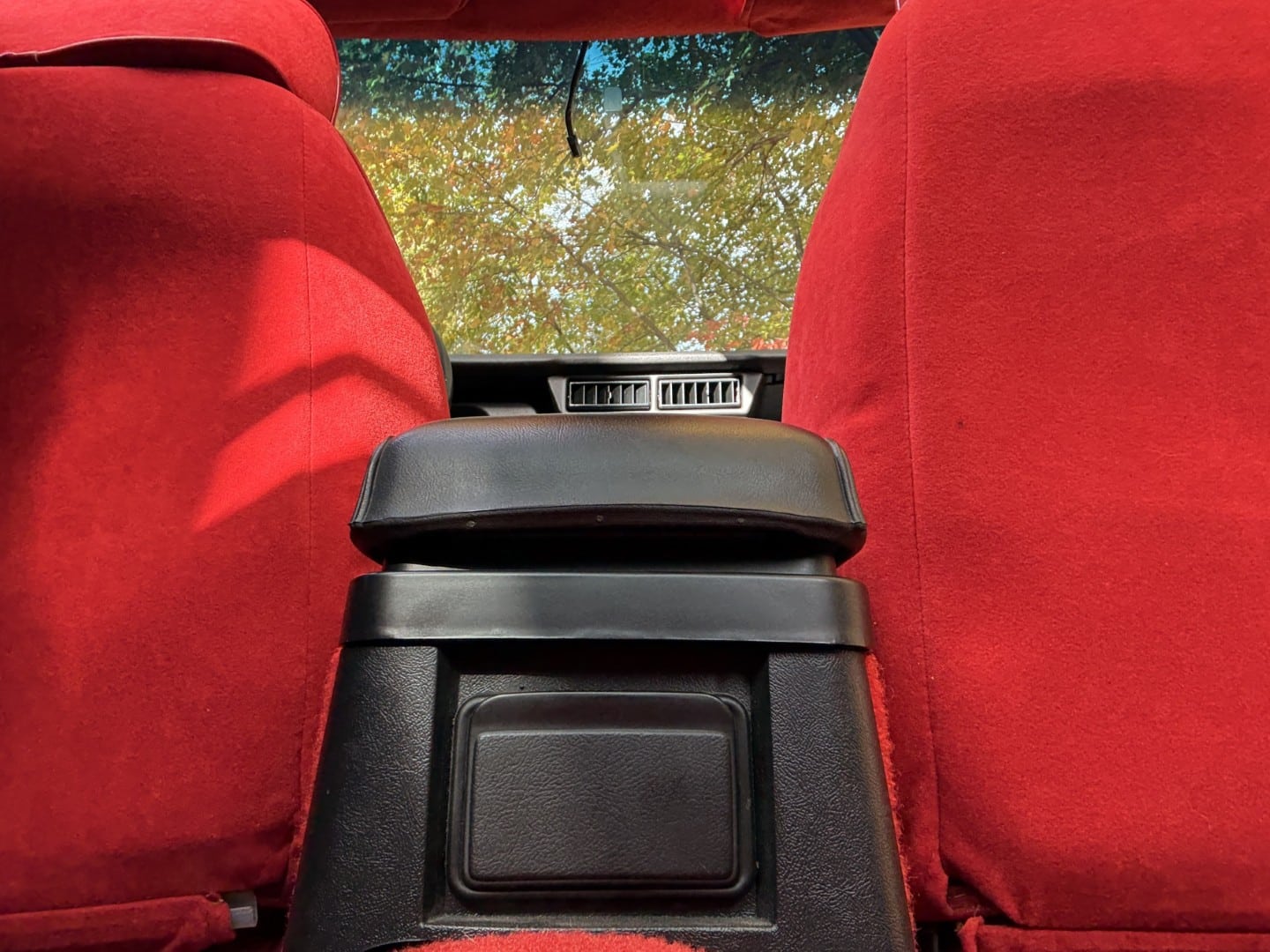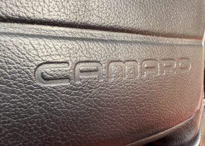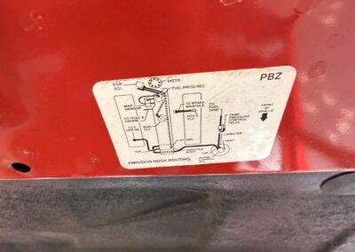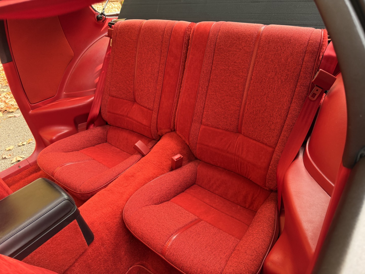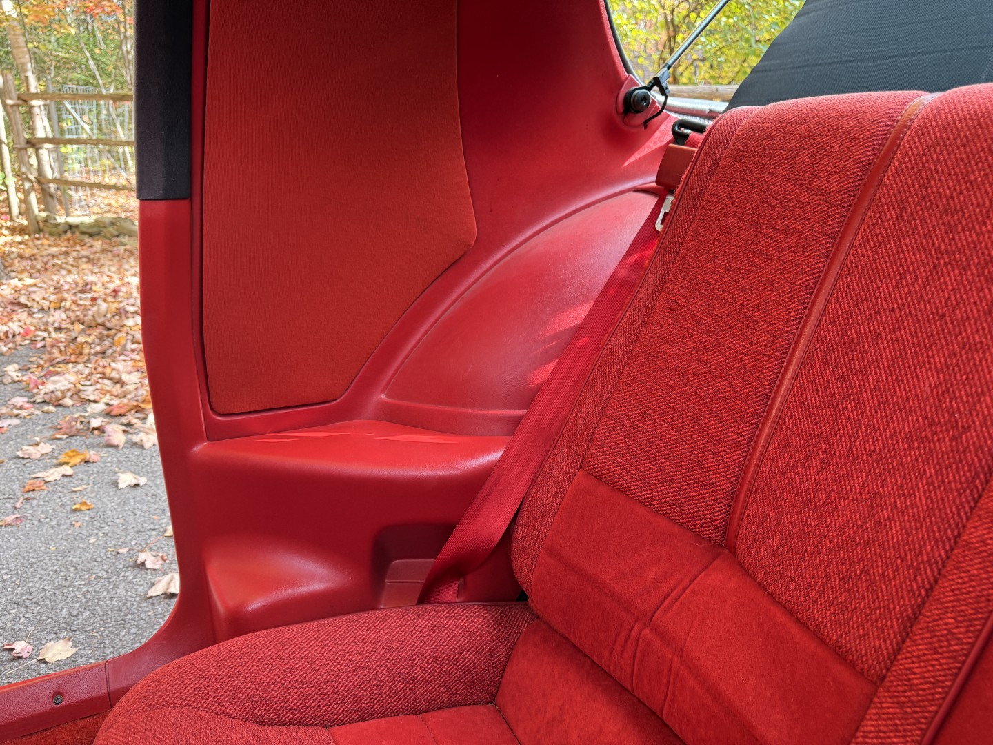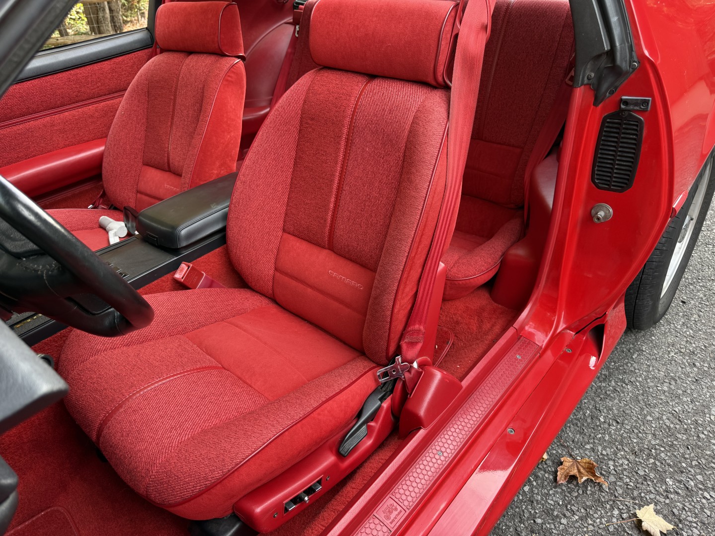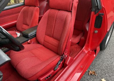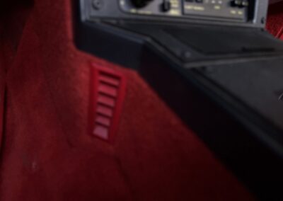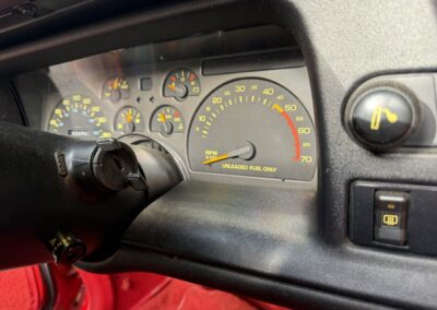 The four seats feature CAMARO-embroidered buckets up front, power-adjustable for the driver, and are upholstered in Red Custom cloth (GM Code 73C) and are matched by the door cards, floor mats with GM emblems and carpeting. Features include a Z28 25th Anniversary badging on the dashboard – the first Camaro was a 1967 model, cruise control, air conditioning, a power hatch release with motorized latch, factory ETR AM/FM/cassette with seek/scan for cassette tracks, with power windows, locks, and mirrors. We note cracking in the dash above instrumentation. There is a generous storage compartment under the arm rest while the owner had the rear-view mirror re-adhered at the time of its Ontario safety check appointment (since the Gallery photos were taken).