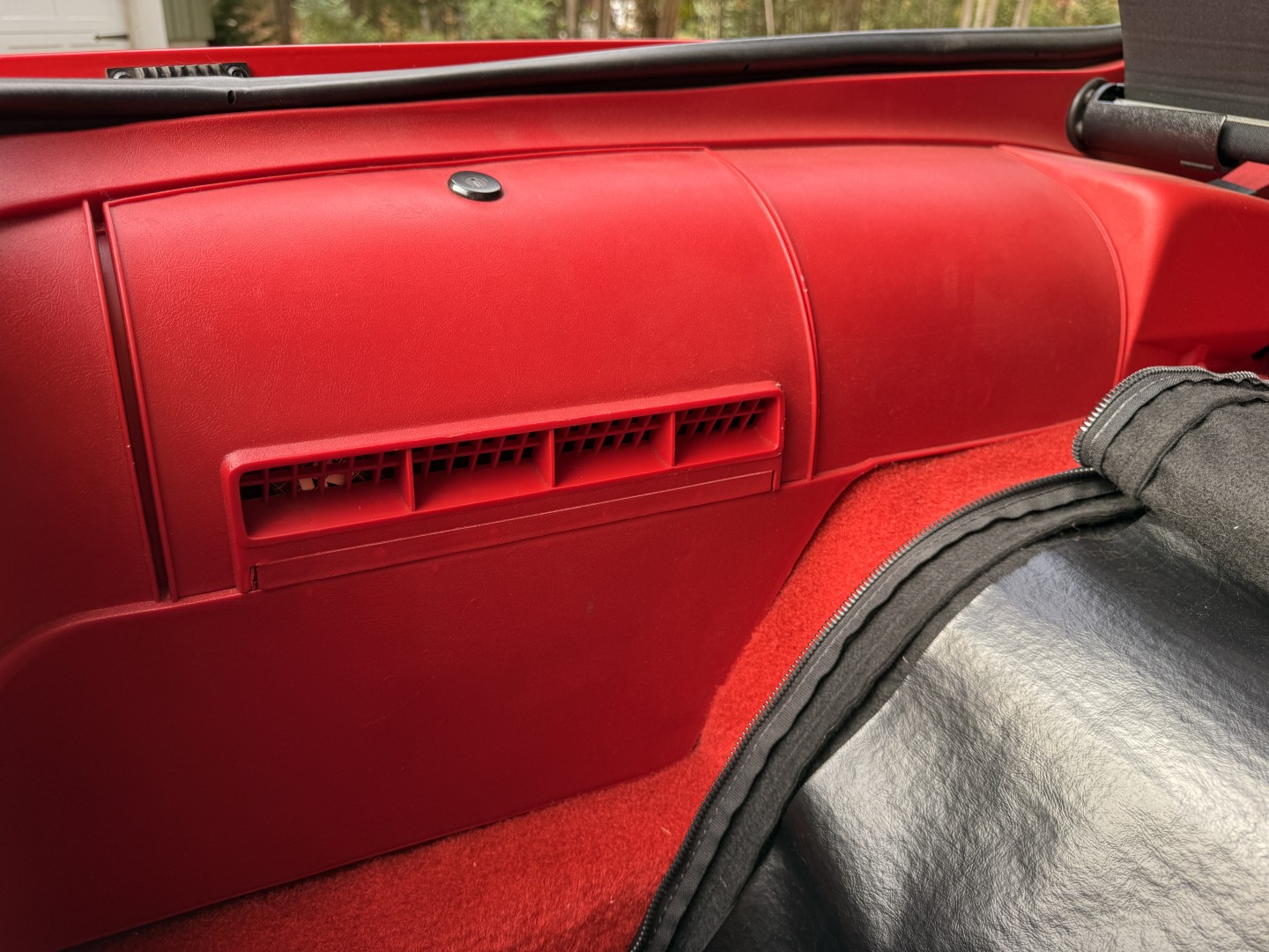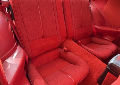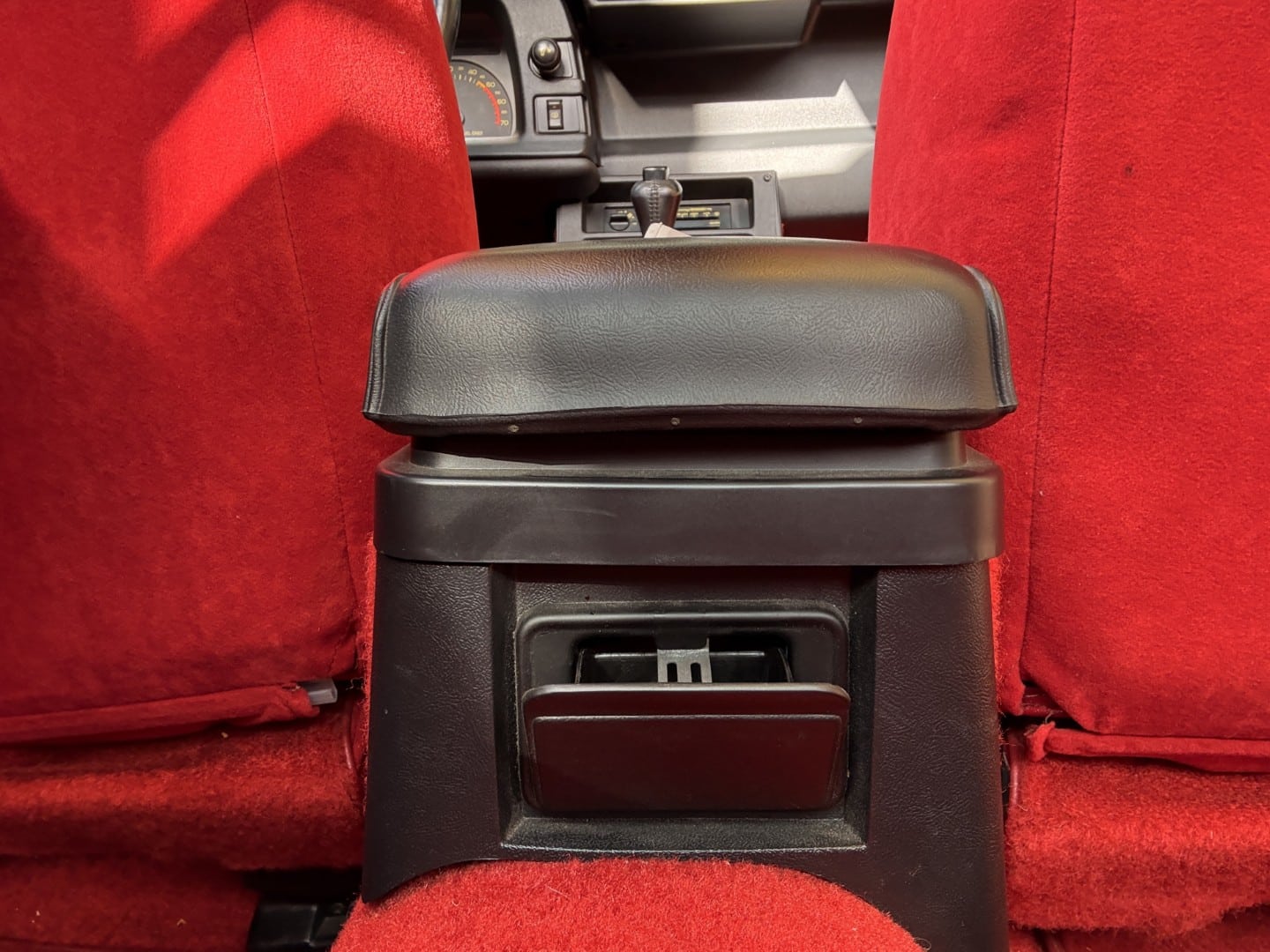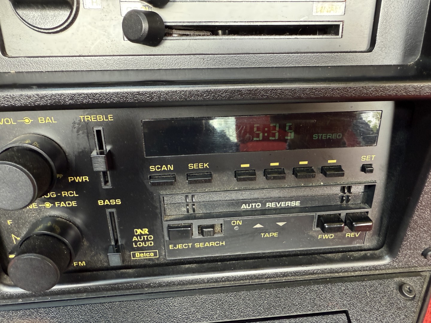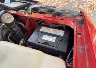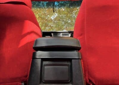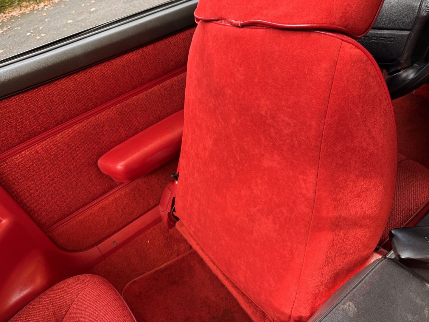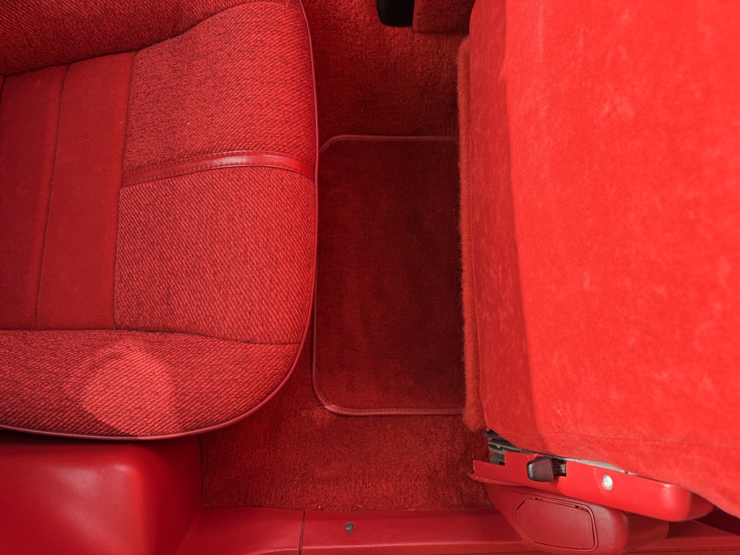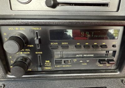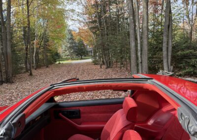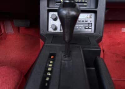 The four seats feature CAMARO-embroidered buckets up front, power-adjustable for the driver, and are upholstered in Red Custom cloth (GM Code 73C) and are matched by the door cards, floor mats with GM emblems and carpeting. Features include a Z28 25th Anniversary badging on the dashboard – the first Camaro was a 1967 model, cruise control, air conditioning, a power hatch release with motorized latch, factory ETR AM/FM/cassette with seek/scan for cassette tracks, with power windows, locks, and mirrors. We note cracking in the dash above instrumentation. There is a generous storage compartment under the arm rest while the owner had the rear-view mirror re-adhered at the time of its Ontario safety check appointment (since the Gallery photos were taken).