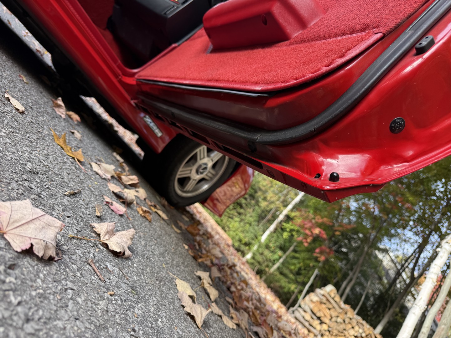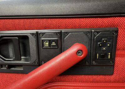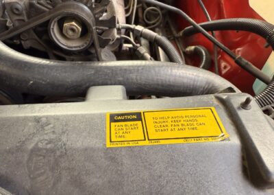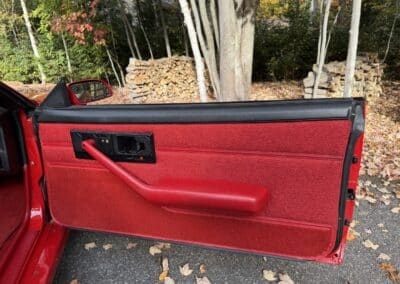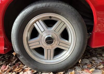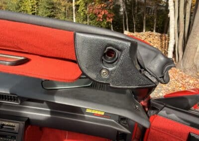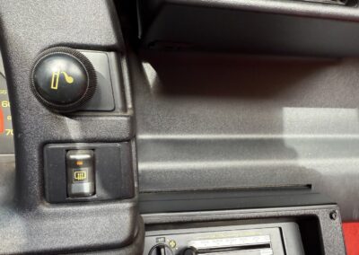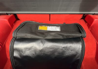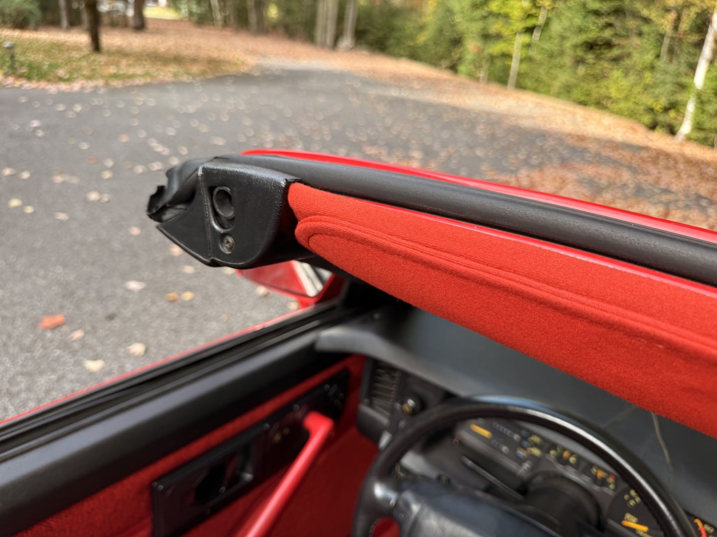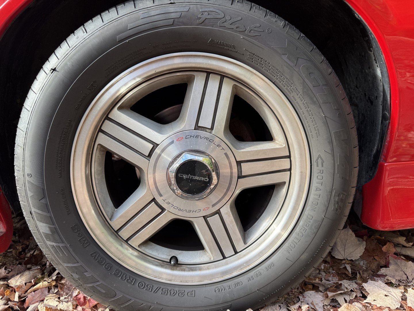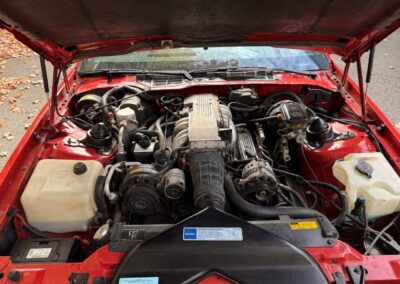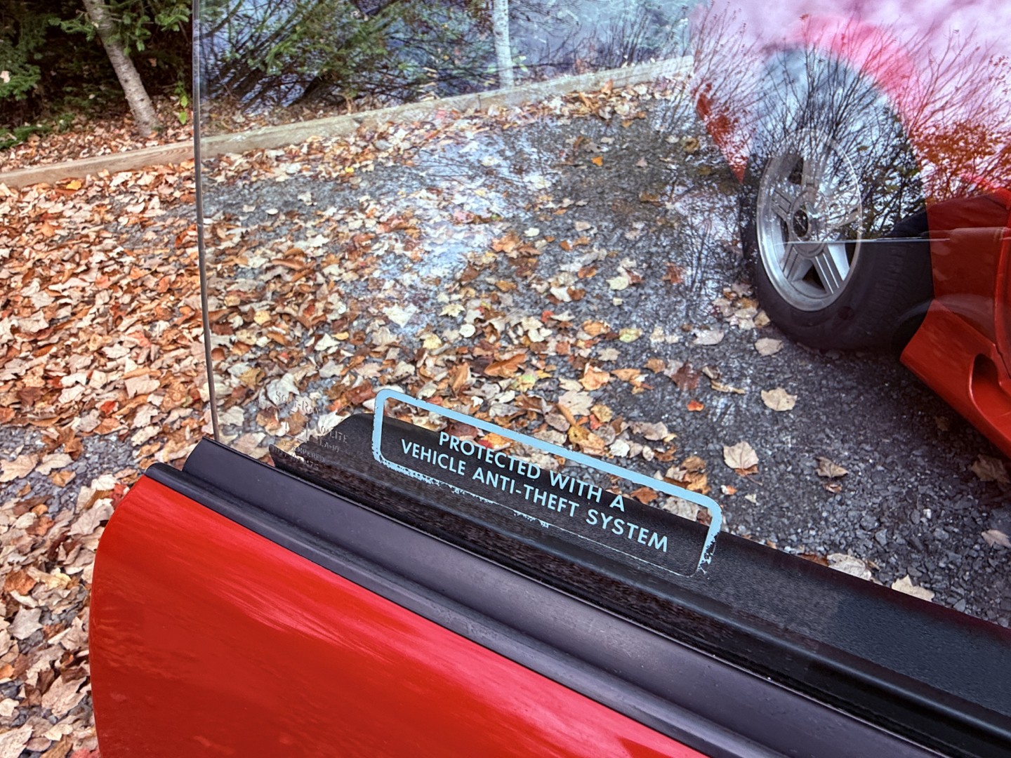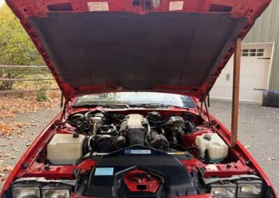 The four seats feature CAMARO-embroidered buckets up front, power-adjustable for the driver, and are upholstered in Red Custom cloth (GM Code 73C) and are matched by the door cards, floor mats with GM emblems and carpeting. Features include a Z28 25th Anniversary badging on the dashboard – the first Camaro was a 1967 model, cruise control, air conditioning, a power hatch release with motorized latch, factory ETR AM/FM/cassette with seek/scan for cassette tracks, with power windows, locks, and mirrors. We note cracking in the dash above instrumentation. There is a generous storage compartment under the arm rest while the owner had the rear-view mirror re-adhered at the time of its Ontario safety check appointment (since the Gallery photos were taken).