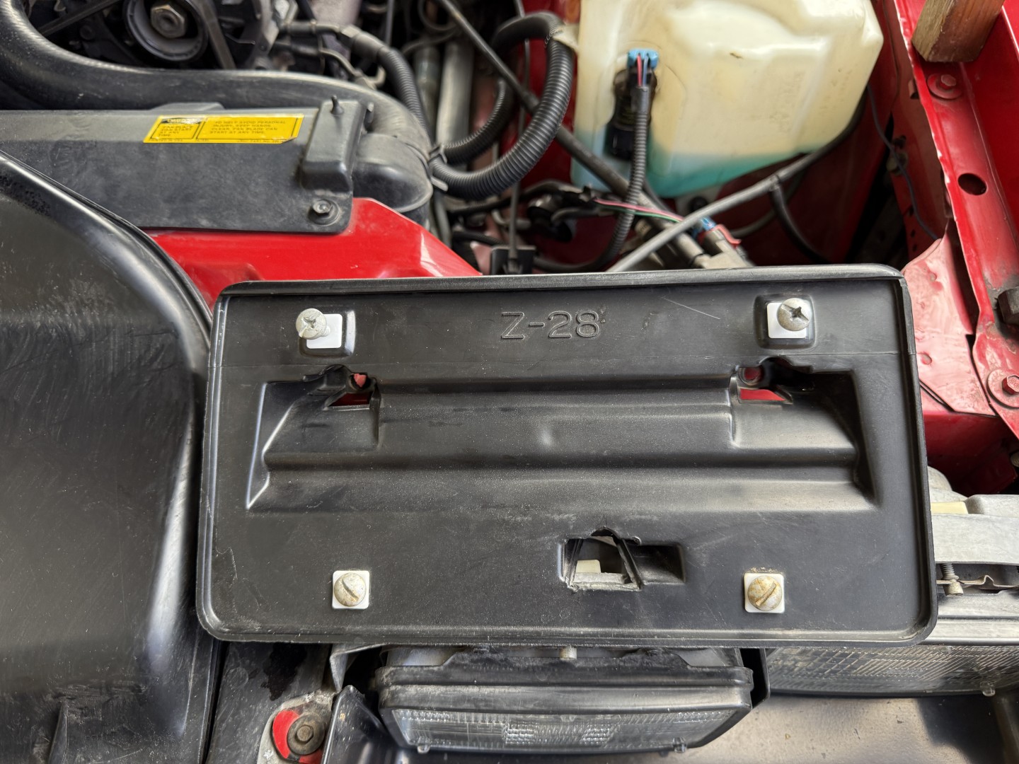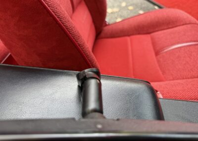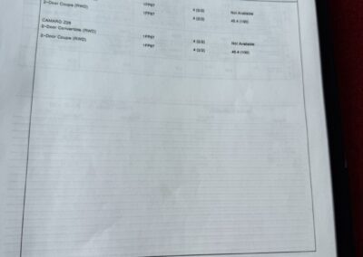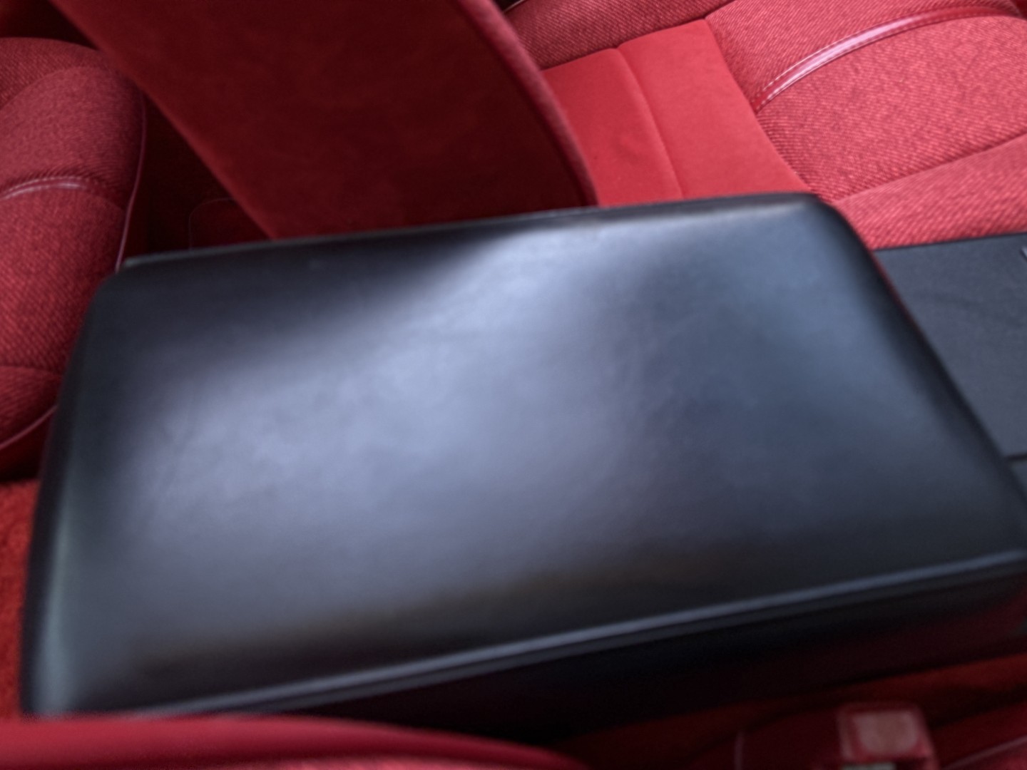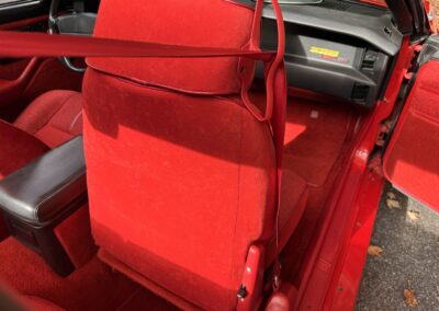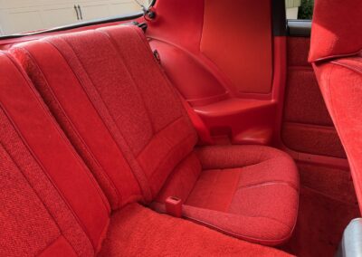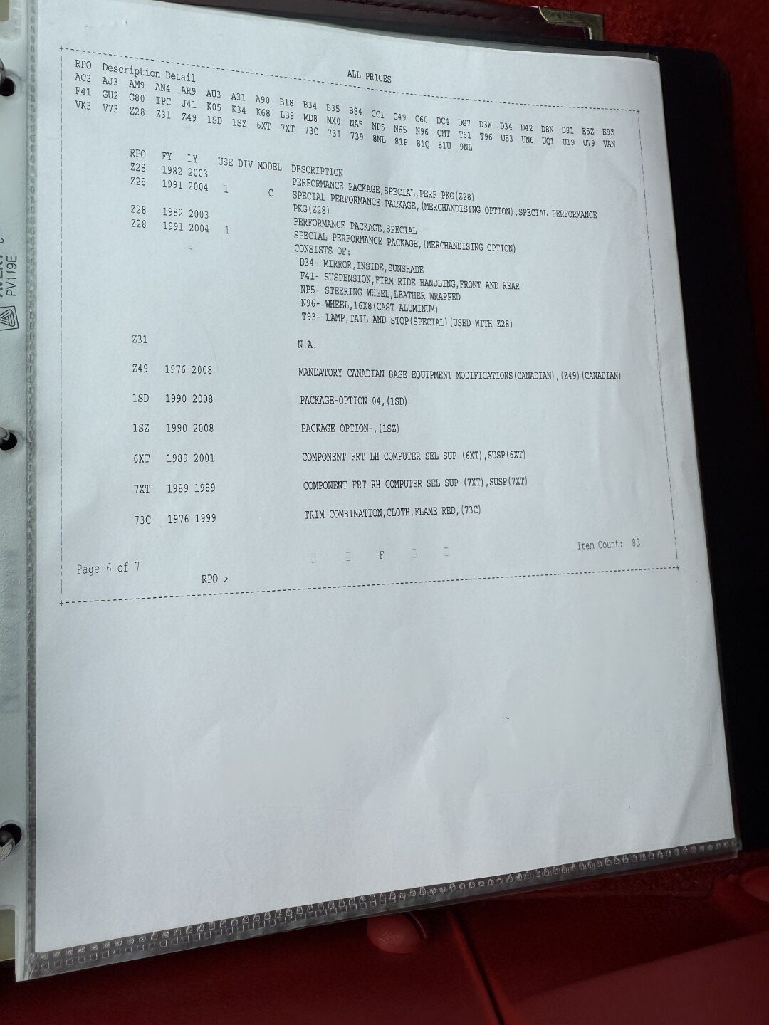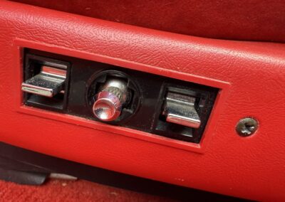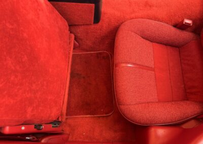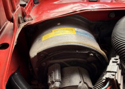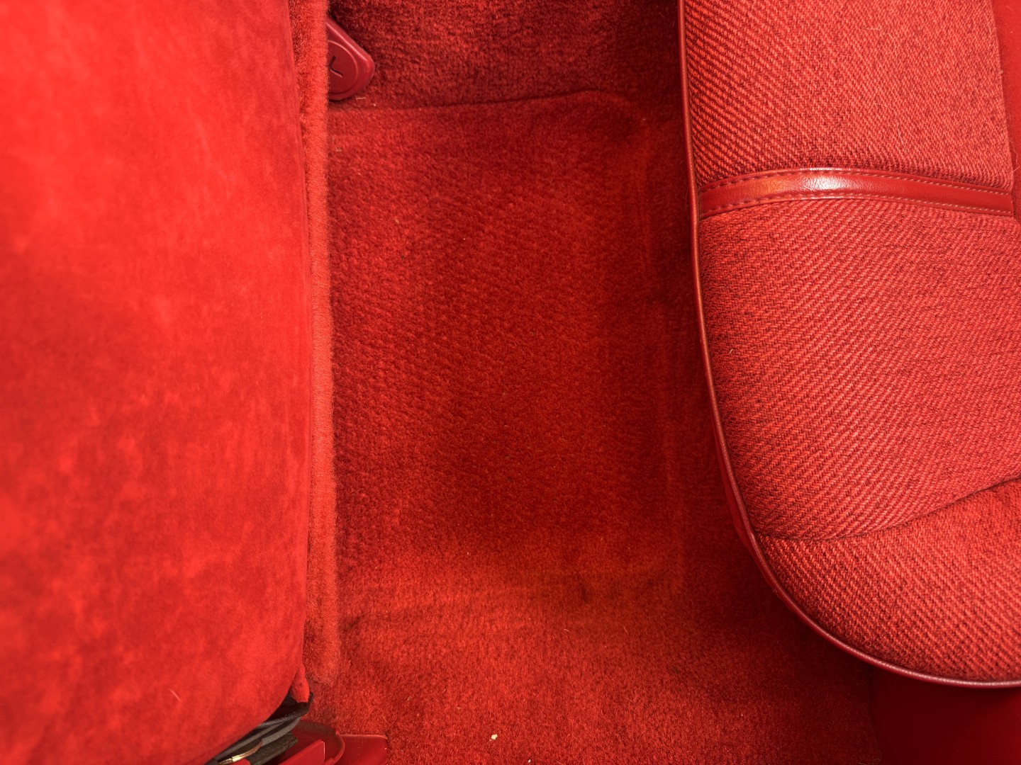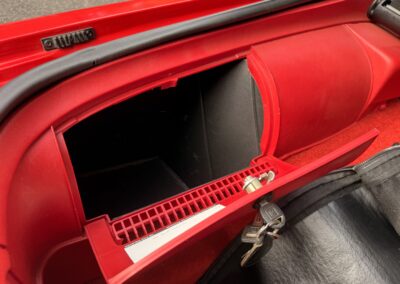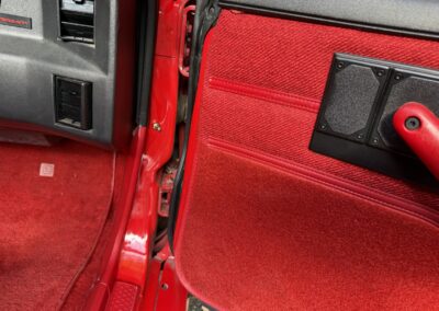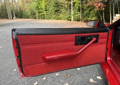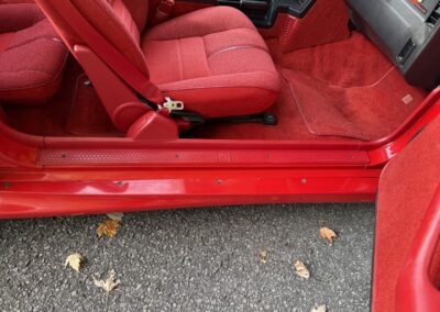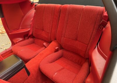 The four seats feature CAMARO-embroidered buckets up front, power-adjustable for the driver, and are upholstered in Red Custom cloth (GM Code 73C) and are matched by the door cards, floor mats with GM emblems and carpeting. Features include a Z28 25th Anniversary badging on the dashboard – the first Camaro was a 1967 model, cruise control, air conditioning, a power hatch release with motorized latch, factory ETR AM/FM/cassette with seek/scan for cassette tracks, with power windows, locks, and mirrors. We note cracking in the dash above instrumentation. There is a generous storage compartment under the arm rest while the owner had the rear-view mirror re-adhered at the time of its Ontario safety check appointment (since the Gallery photos were taken).