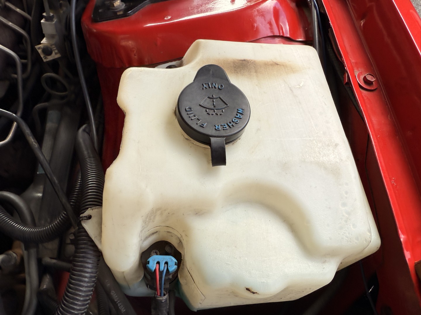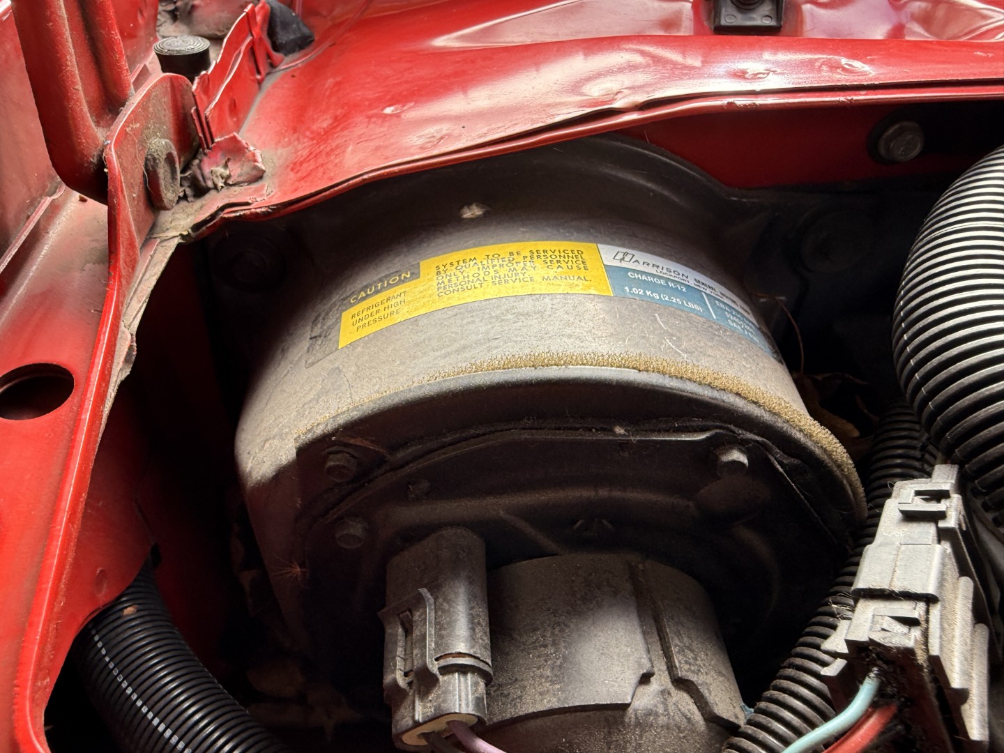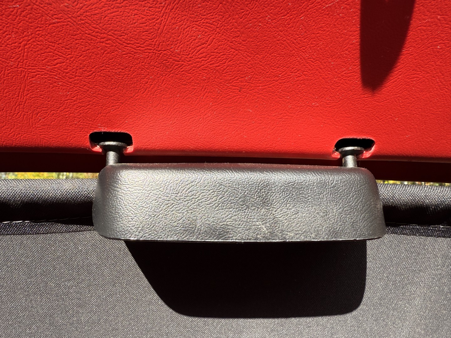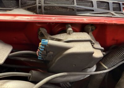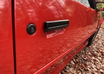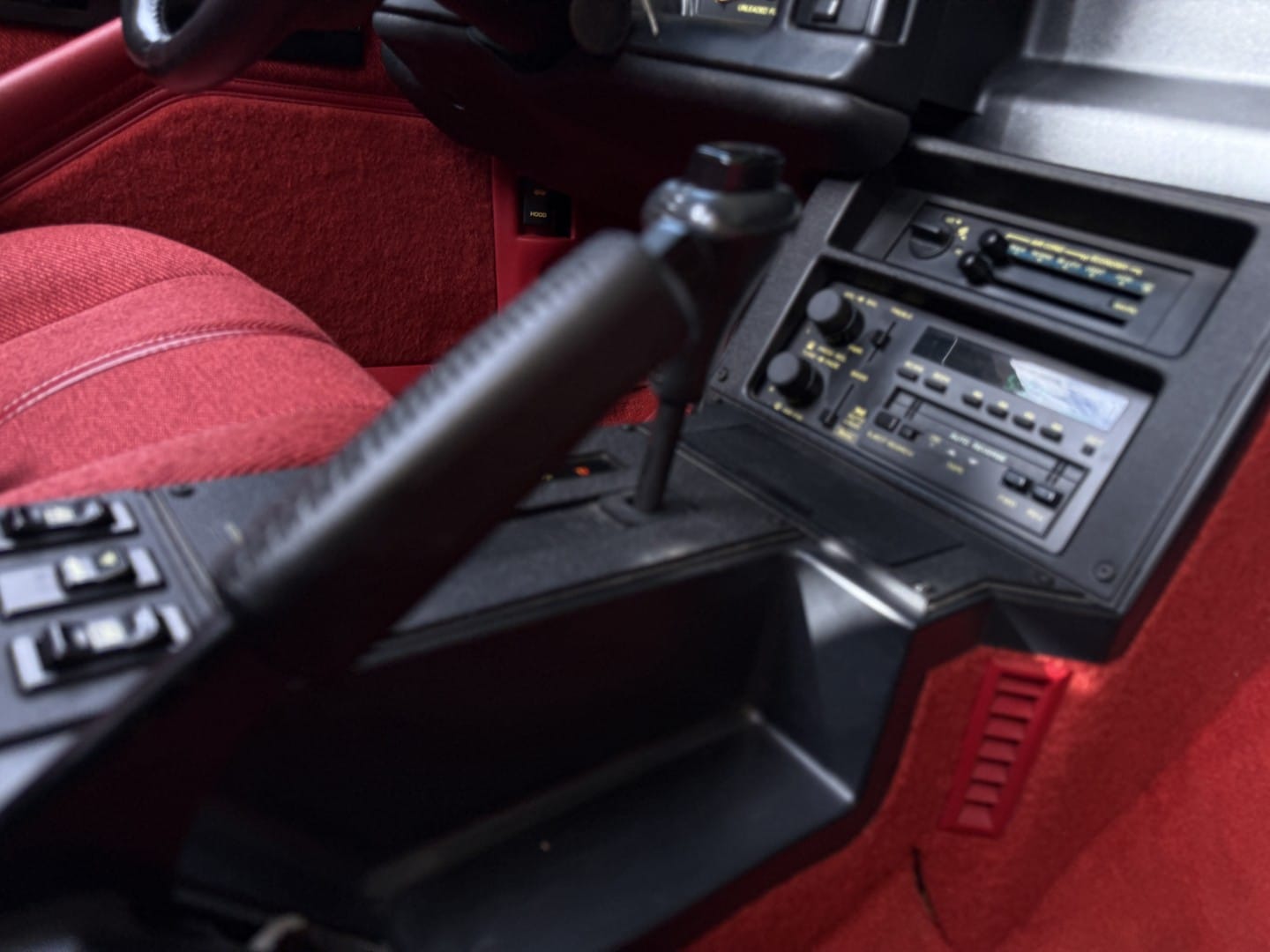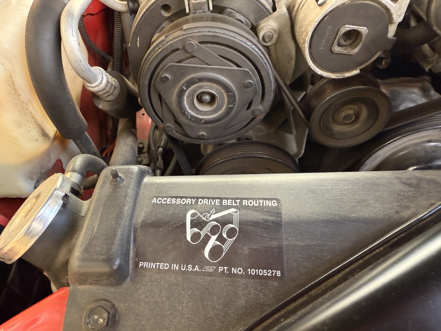 The four seats feature CAMARO-embroidered buckets up front, power-adjustable for the driver, and are upholstered in Red Custom cloth (GM Code 73C) and are matched by the door cards, floor mats with GM emblems and carpeting. Features include a Z28 25th Anniversary badging on the dashboard – the first Camaro was a 1967 model, cruise control, air conditioning, a power hatch release with motorized latch, factory ETR AM/FM/cassette with seek/scan for cassette tracks, with power windows, locks, and mirrors. We note cracking in the dash above instrumentation. There is a generous storage compartment under the arm rest while the owner had the rear-view mirror re-adhered at the time of its Ontario safety check appointment (since the Gallery photos were taken).