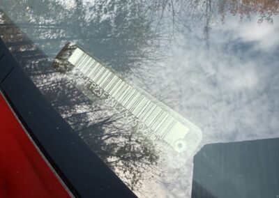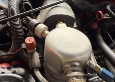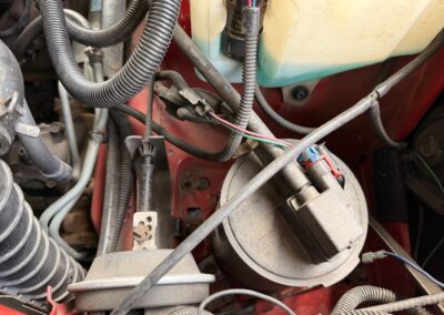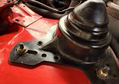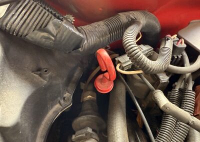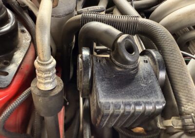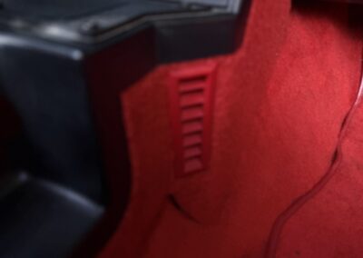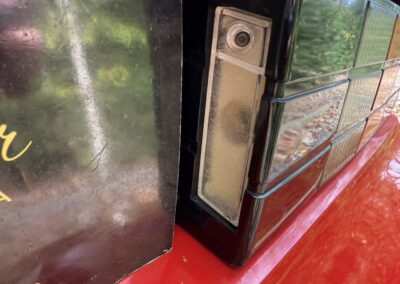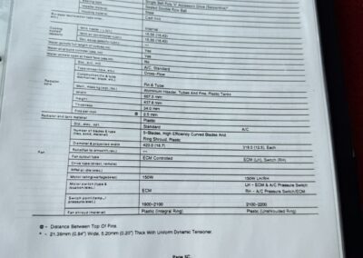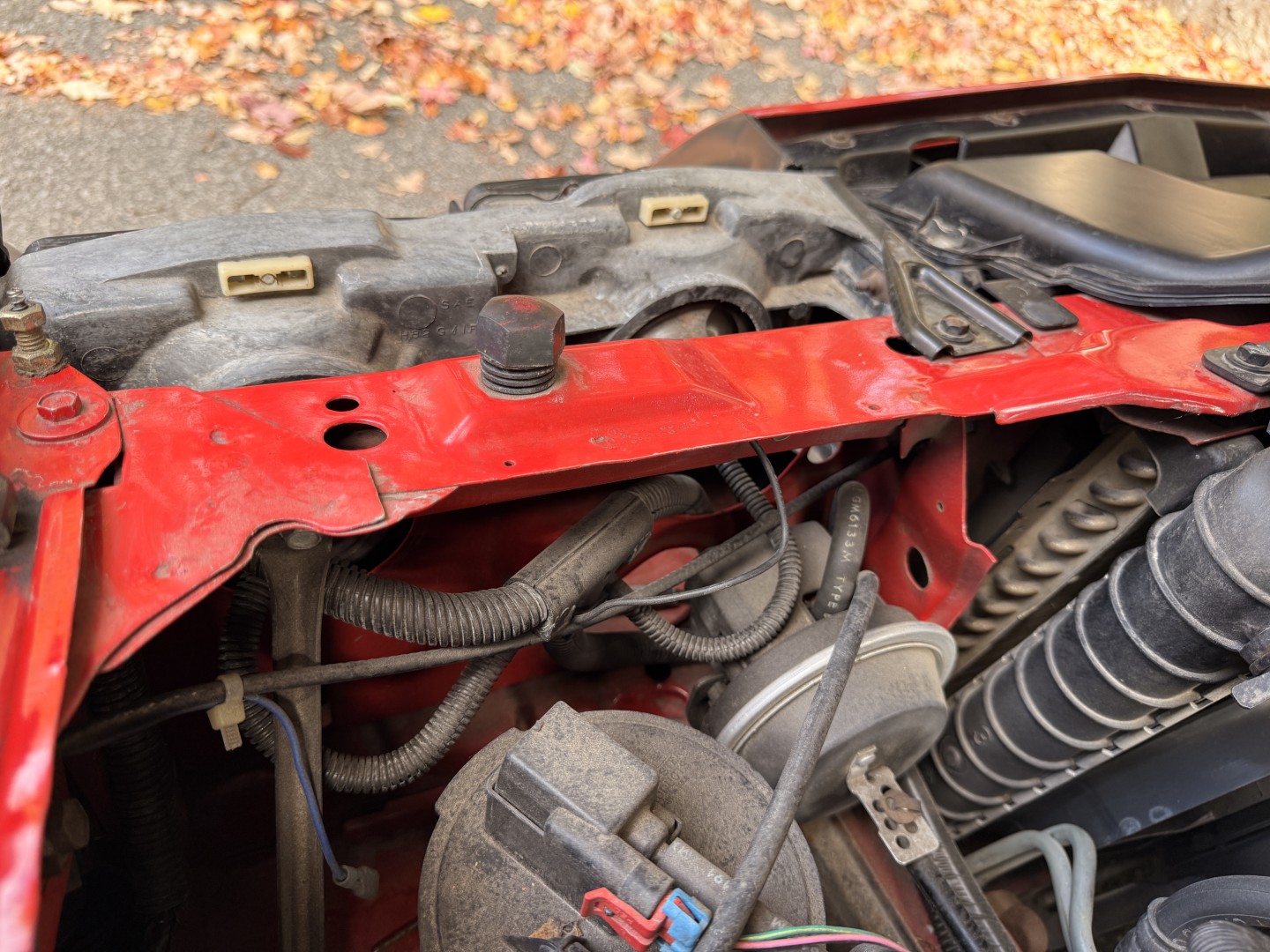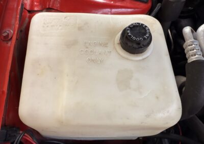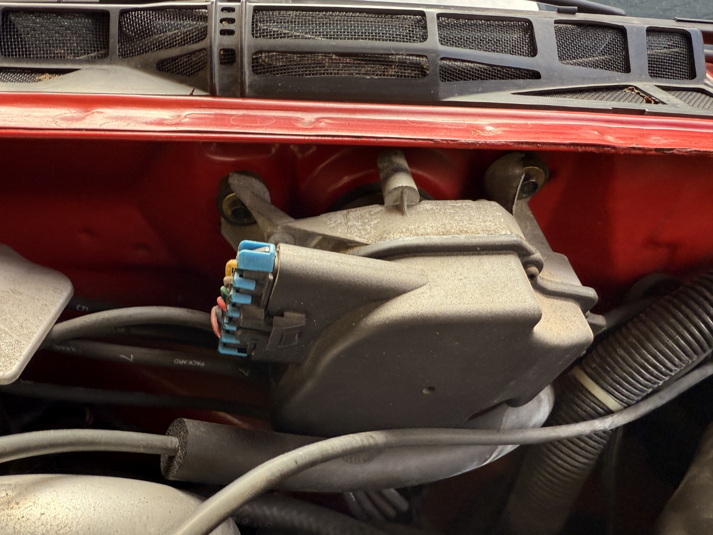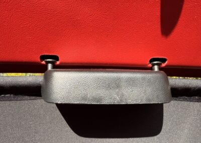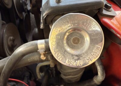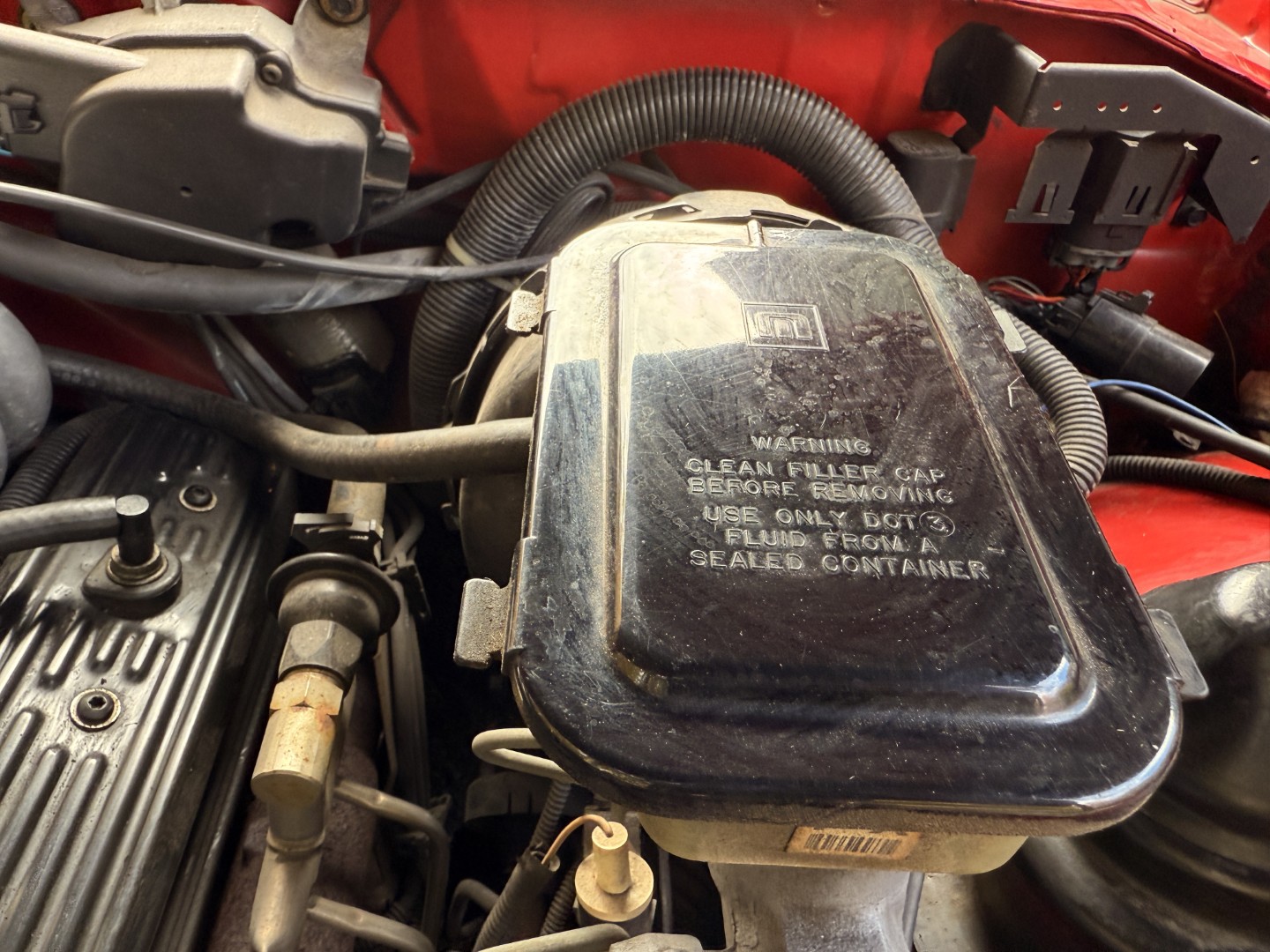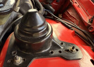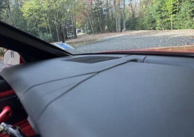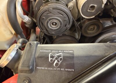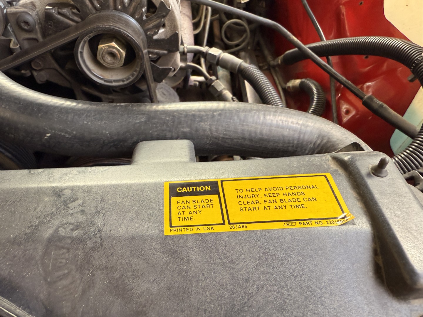 The four seats feature CAMARO-embroidered buckets up front, power-adjustable for the driver, and are upholstered in Red Custom cloth (GM Code 73C) and are matched by the door cards, floor mats with GM emblems and carpeting. Features include a Z28 25th Anniversary badging on the dashboard – the first Camaro was a 1967 model, cruise control, air conditioning, a power hatch release with motorized latch, factory ETR AM/FM/cassette with seek/scan for cassette tracks, with power windows, locks, and mirrors. We note cracking in the dash above instrumentation. There is a generous storage compartment under the arm rest while the owner had the rear-view mirror re-adhered at the time of its Ontario safety check appointment (since the Gallery photos were taken).