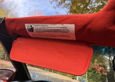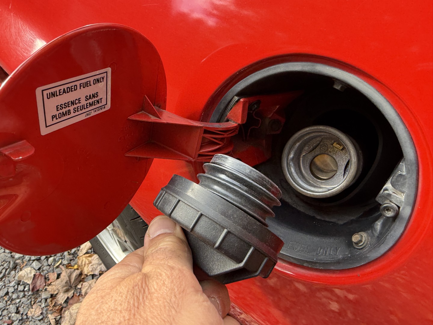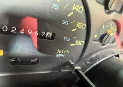 A leather-wrapped four-spoke steering wheel with an integrated airbag fronts an instrument cluster with a 180 km/h speedometer, a tachometer with a 7000 RPM maximum reading and a 5500 RPM red line. There are supplementary gauges for oil pressure, voltage, coolant temperature, and fuel level. The six-digit analog odometer showed under 25,000 km at the time of our recording the Car Review video opposite “CCC Vital Info”. Approximately 9,500 km were added under current ownership since 2011, including transporting the car to the owner’s home in Ottawa from the selling dealer in Halifax.