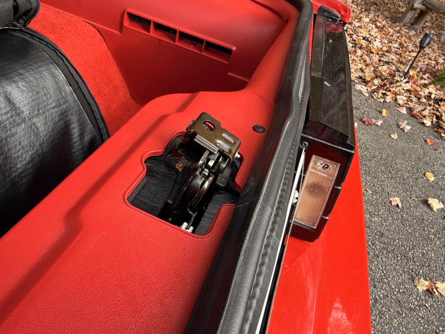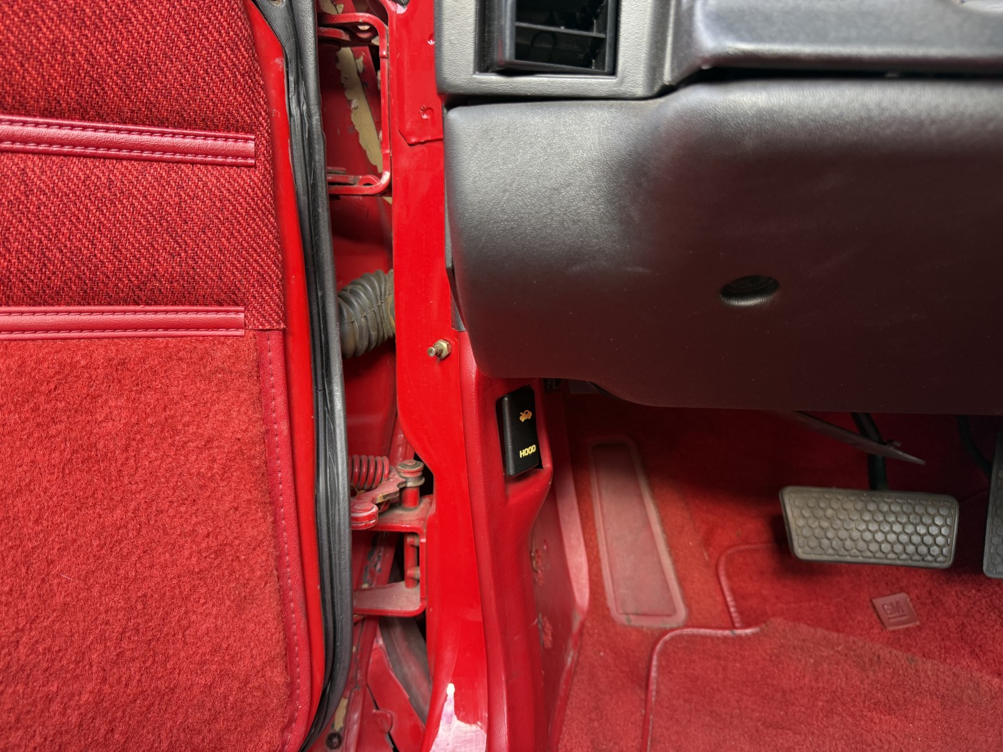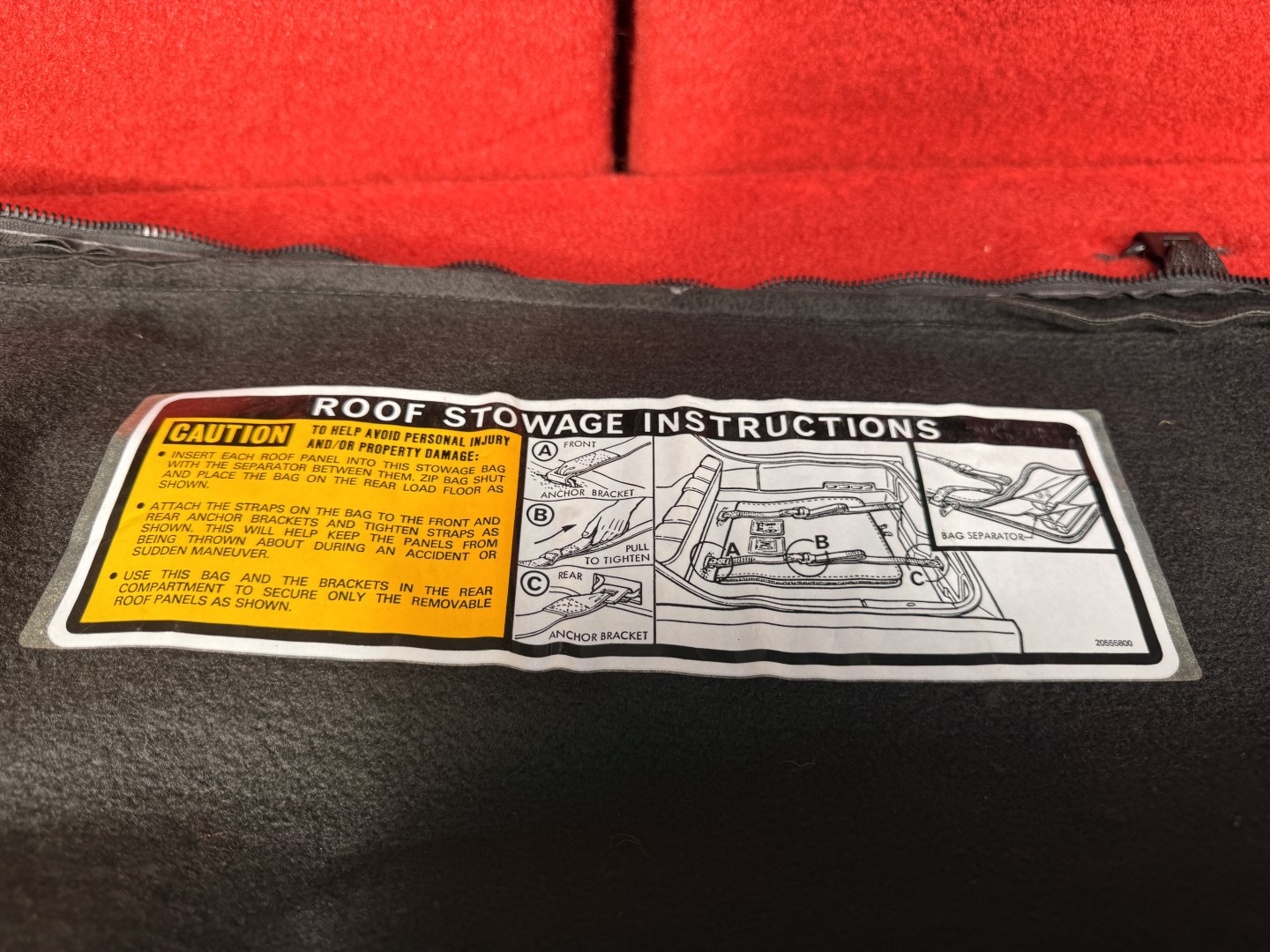 The 5.0 litre LB9 V8 was factory rated at 205 horsepower and 285 lb.-ft. of torque, achieved at 4200 and 3200 RPM, respectively. Power from the 305 goes to the rear wheels through a four-speed automatic transmission with automatic overdrive. Supplementing the factory documentation in our gallery are several service invoices accumulated during the low km’s driven under current ownership. The oxygen sensor and thermostat were replaced in 2019. Please note that the hood stays have been replaced since the photos were taken and now properly keep the hood in the upright position, this was remedied when the car was Ontario safety-checked. In the hatch, there is a motorized latch, fitted T-Top stowage covers, a lockable glove box-shaped storage area above the driver’s side wheel well and a retractable cargo cover.