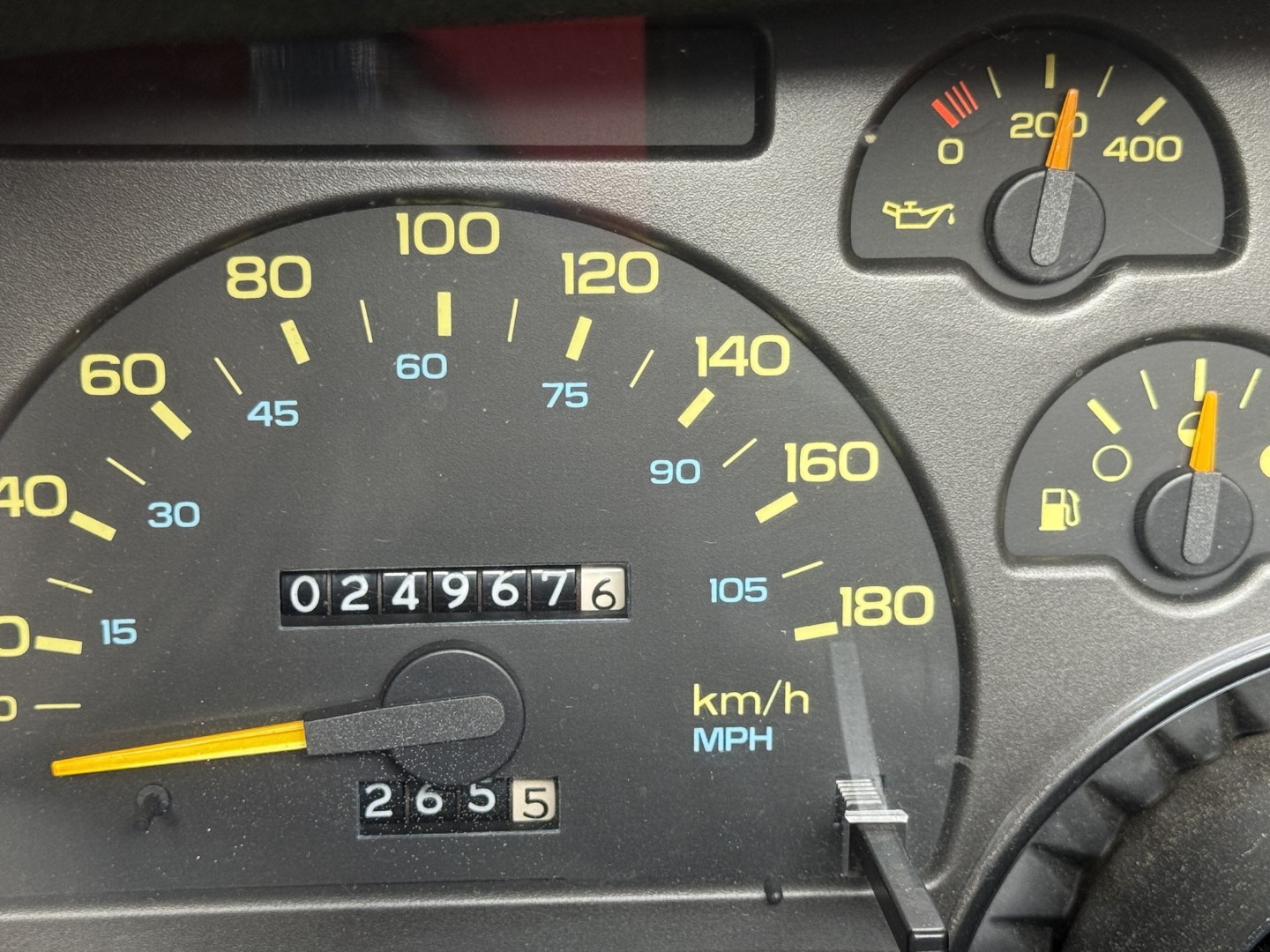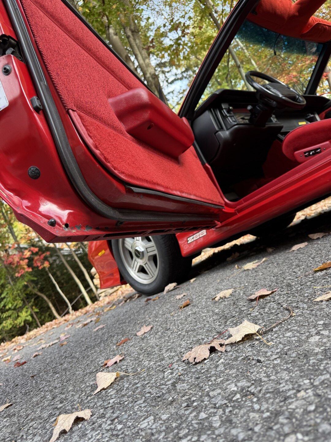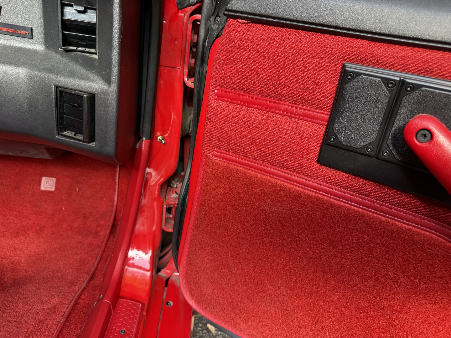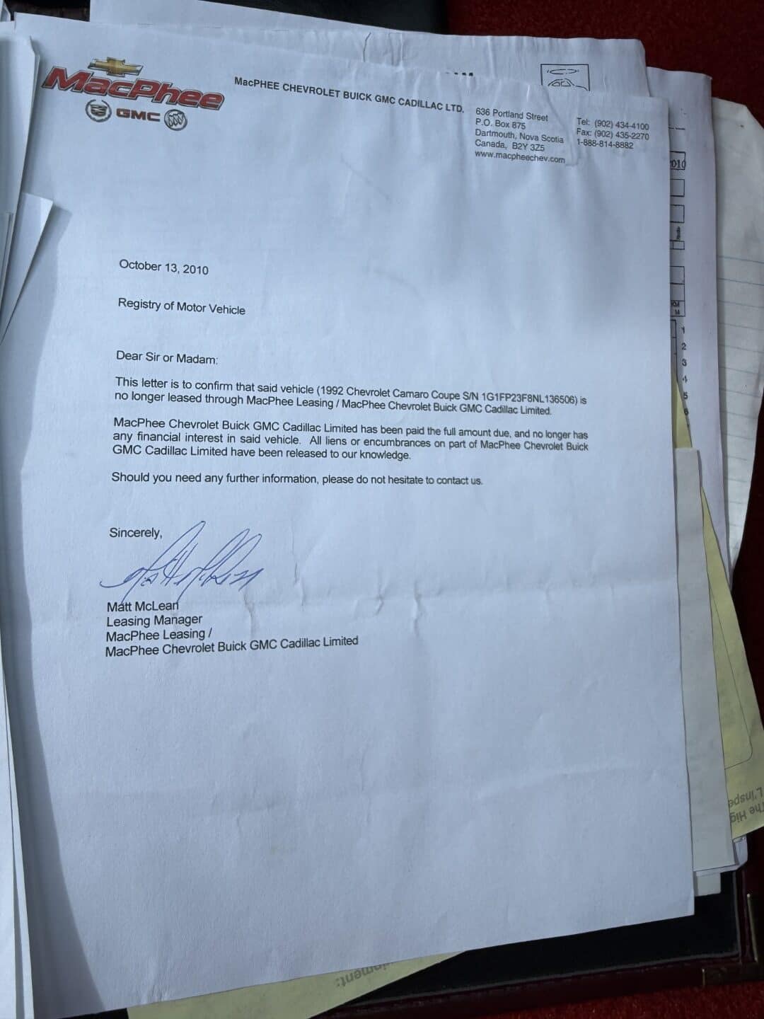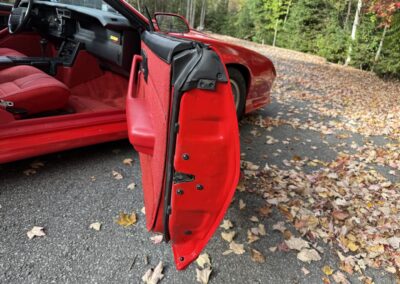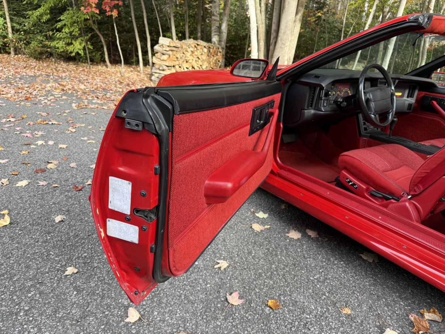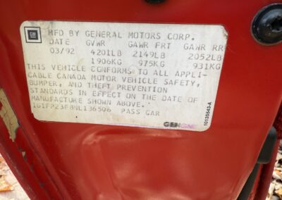 Here is a 26K km 1992 Chevrolet Camaro Z28 25th Anniversary finished in its original Bright red over Red Custom cloth. With the current owner the last 14 years, it is originally a Canadian market car and spent it previous 19 years in Nova Scotia. A Nova Scotia franchised GM dealer’s bill of sale appears in our gallery and the original selling dealer, also in Halifax, is representing on a key ring for one of the two sets of keys included. It is powered by the GB9 engine, a 5.0 litre V8 with tuned port injection, mated to a four-speed automatic transmission complemented by automatic overdrive. This final year 3rd-generation Z28 is equipped with stock 16″ aluminum wheels, cruise control, a rear aero wing, air conditioning that blows cold, a power-adjustable driver’s seat, as well as power windows, locks, and mirrors. This F-body has rolled an exceptionally low number of kilometres, just over 25,000. It comes with manufacturer’s literature, a reproduced GM build sheet, and a collision-free Carfax report. Ontario buyers, please note: this car will include an Ontario Safety Standards Certificate.