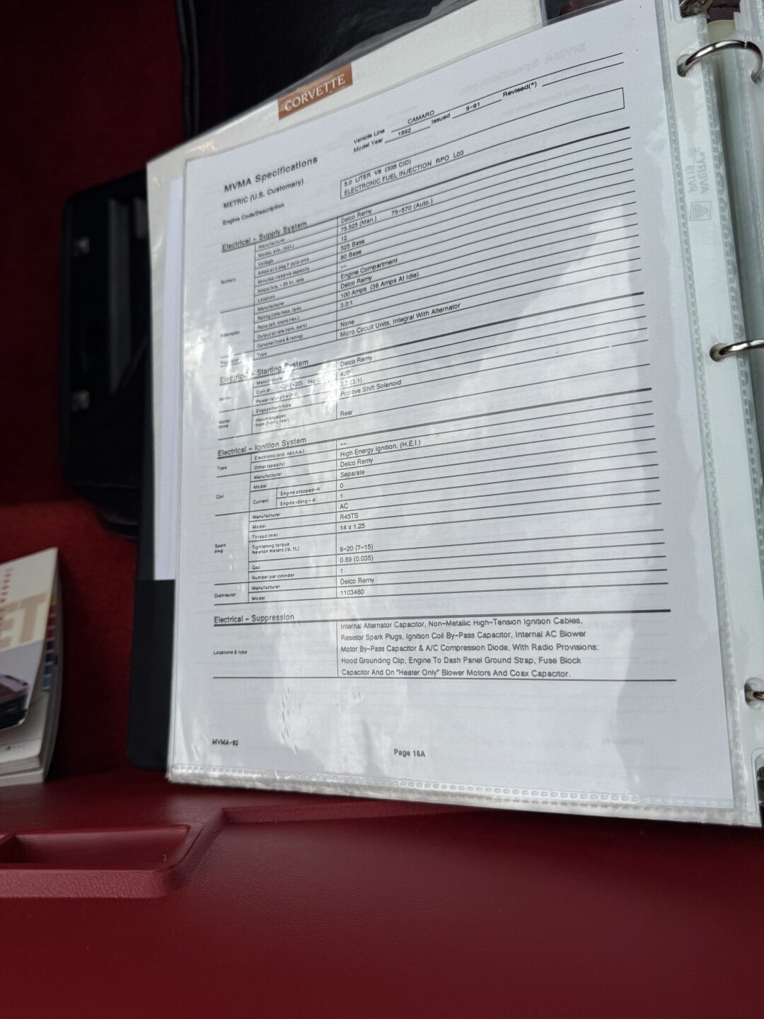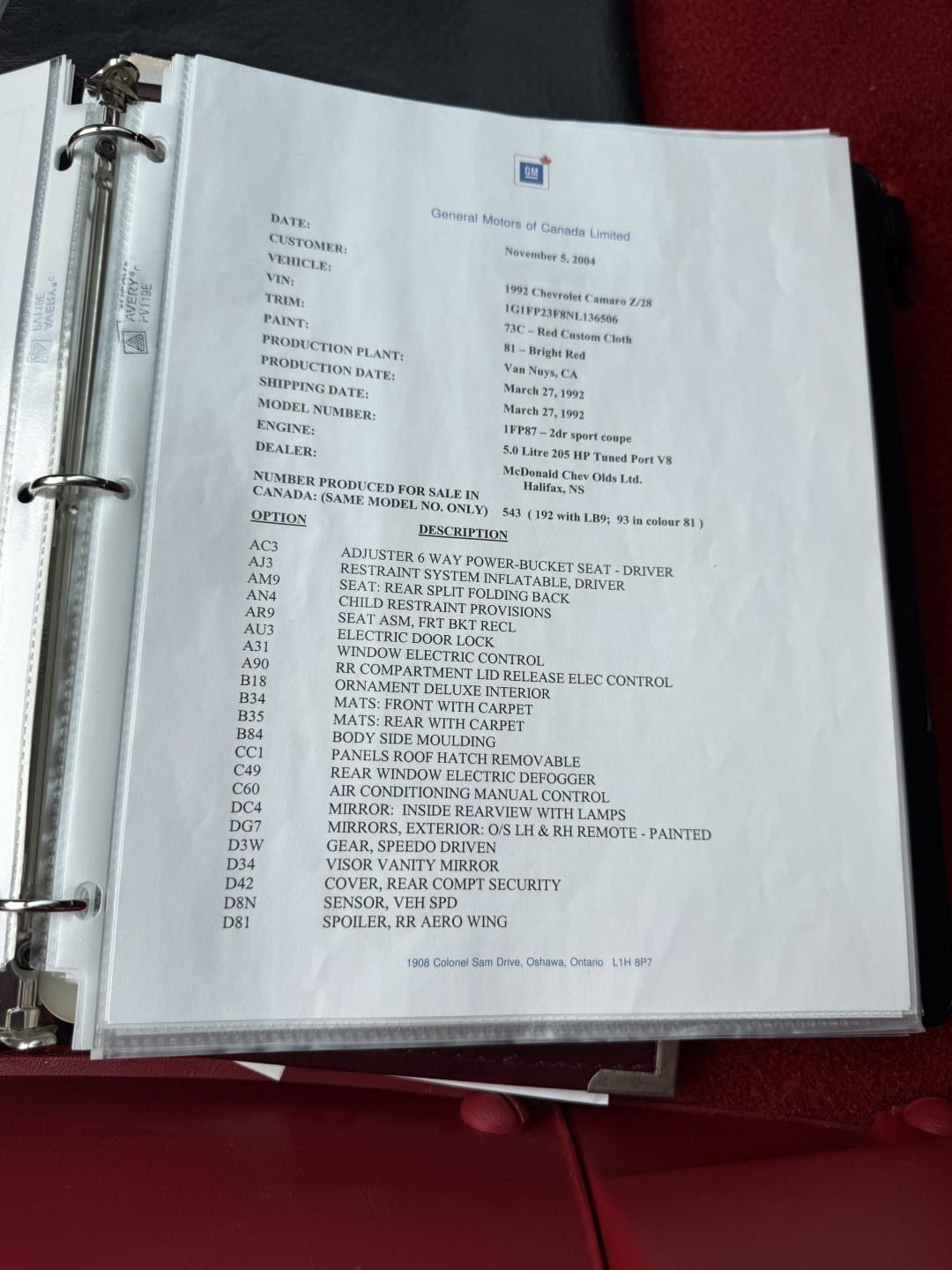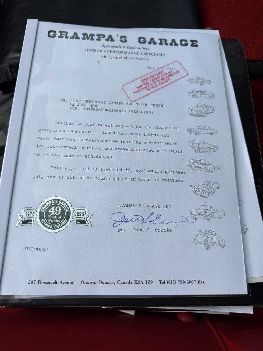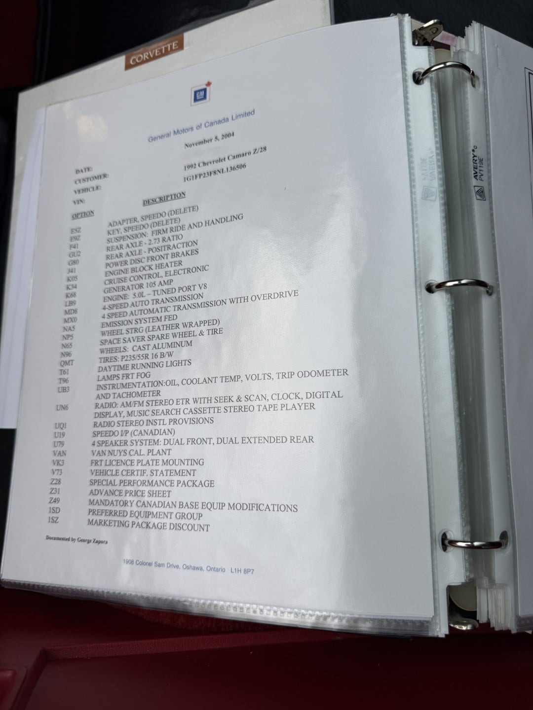 This 26K km 1992 Chevrolet Camaro Z28 25th Anniversary is available with factory documentation, re-created GM build sheet, T-tops, collision-free Carfax, and Ontario Safety Standards Certificate from the 14-year owner in Ottawa, Ontario.
