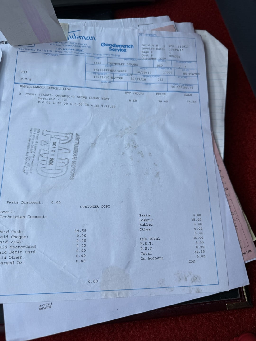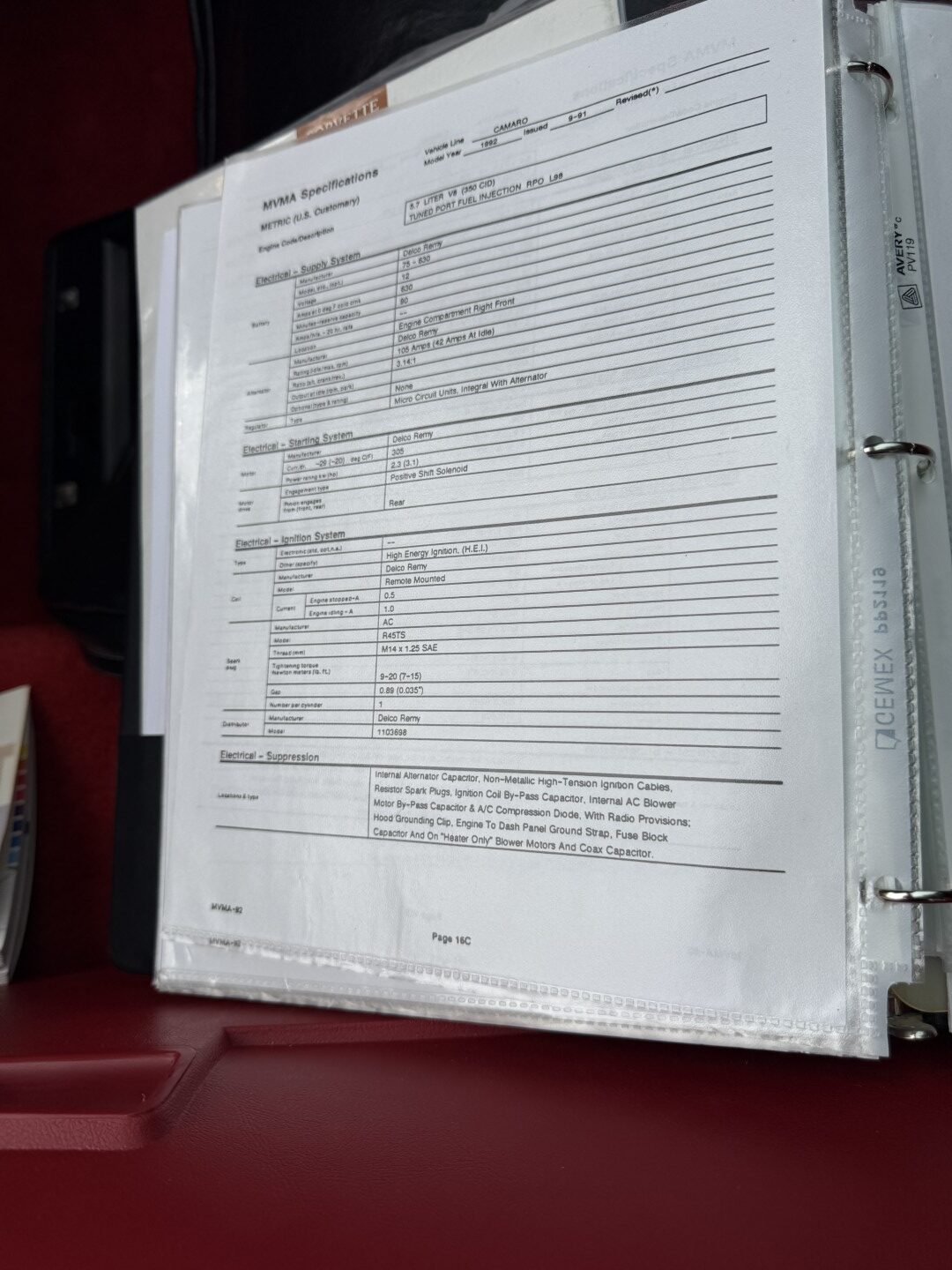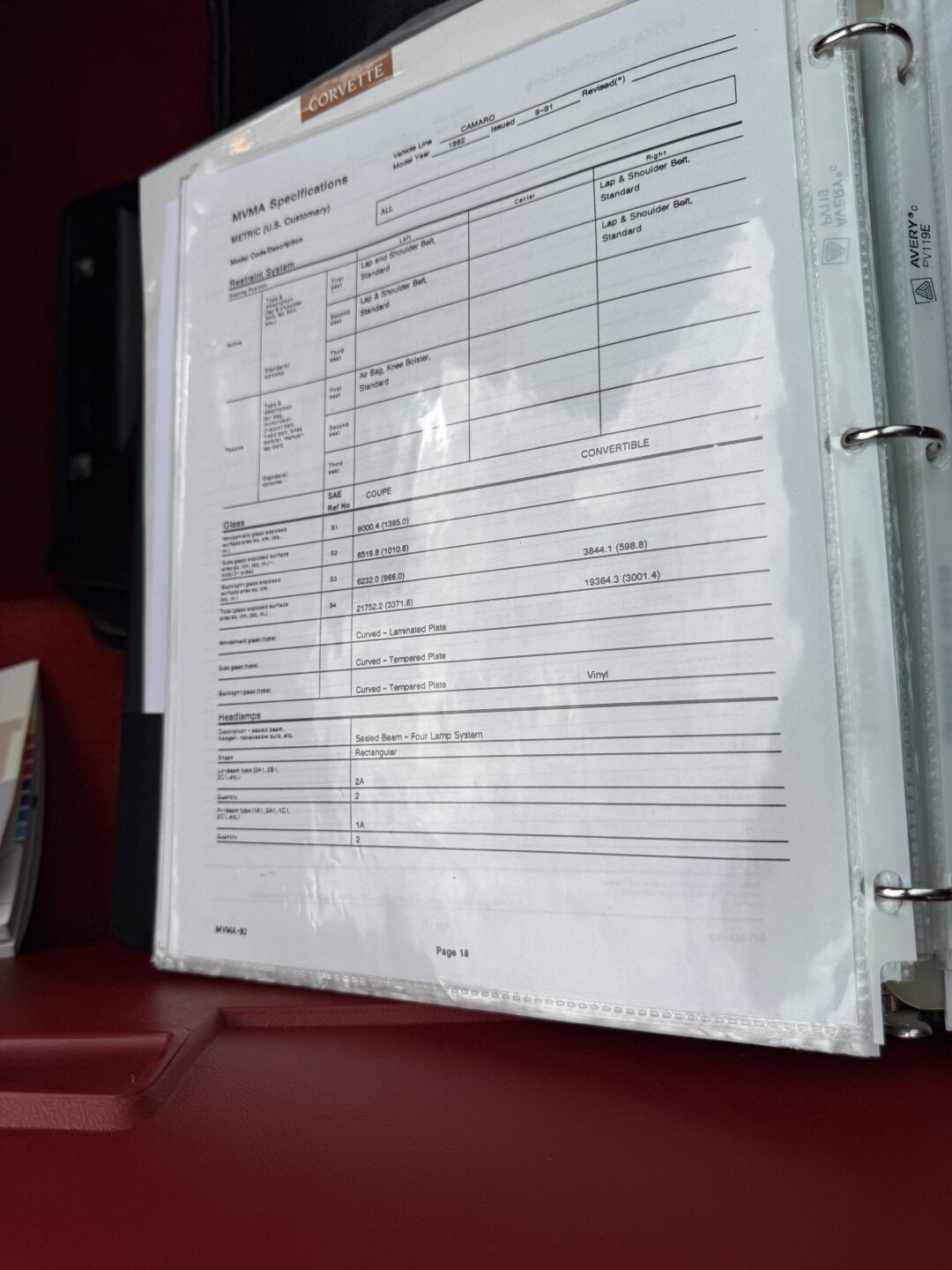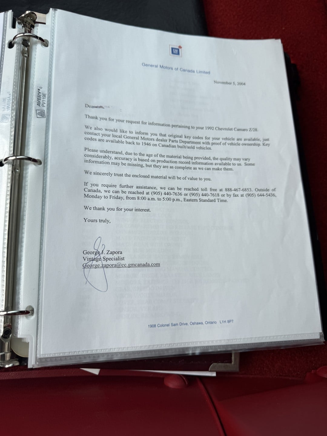 This 26K km 1992 Chevrolet Camaro Z28 25th Anniversary is available with factory documentation, re-created GM build sheet, T-tops, collision-free Carfax, and Ontario Safety Standards Certificate from the 14-year owner in Ottawa, Ontario.