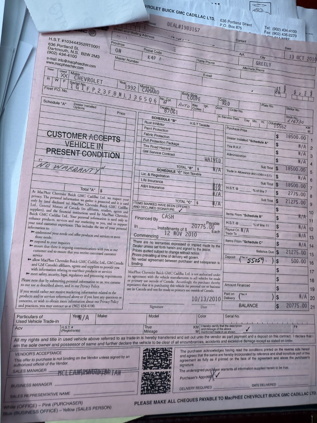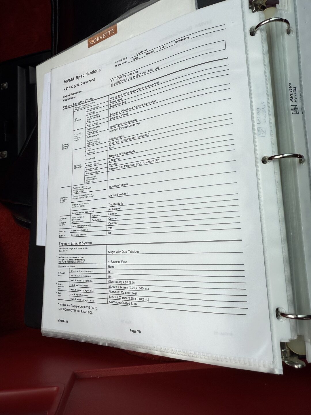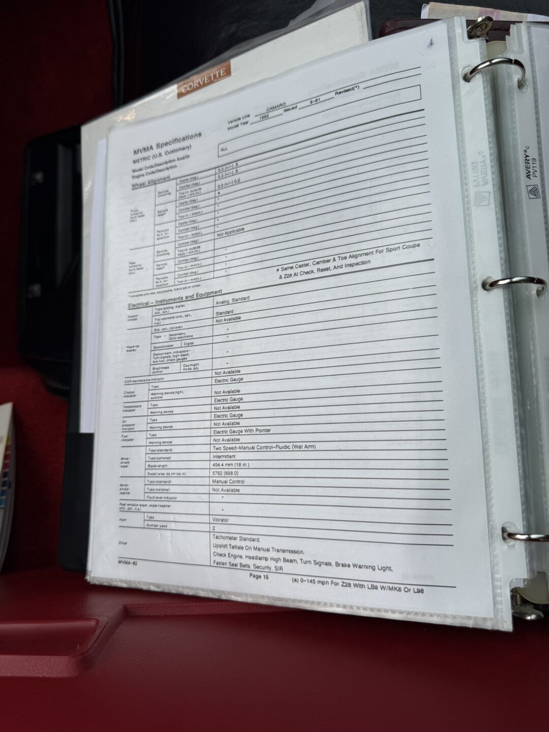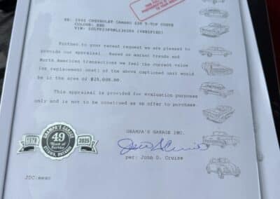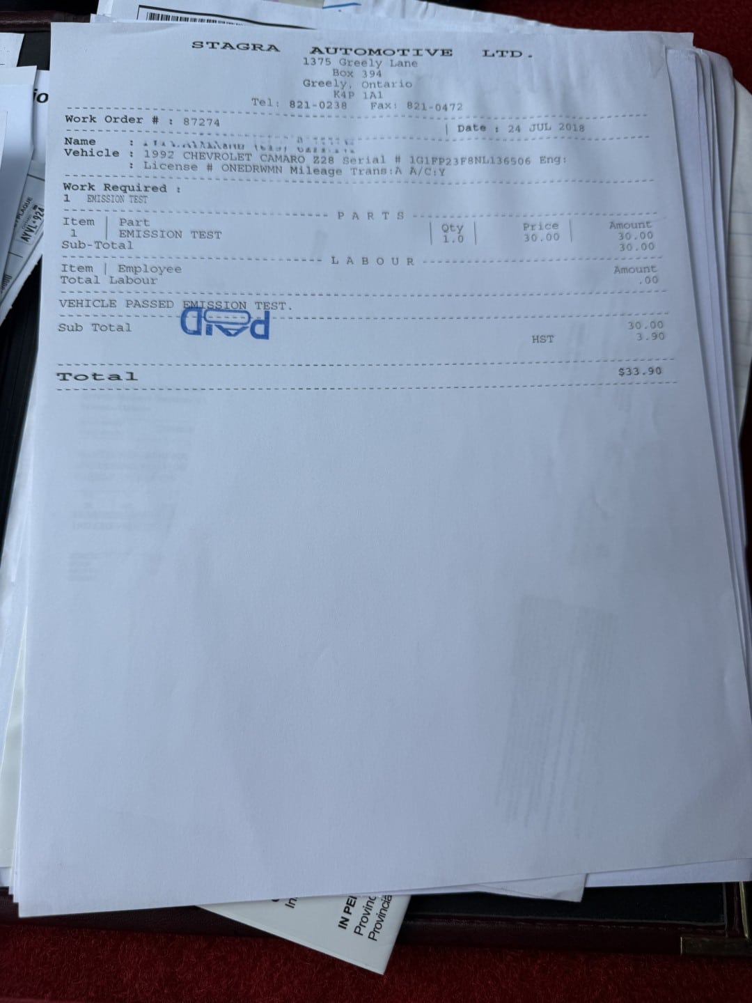 This 26K km 1992 Chevrolet Camaro Z28 25th Anniversary is available with factory documentation, re-created GM build sheet, T-tops, collision-free Carfax, and Ontario Safety Standards Certificate from the 14-year owner in Ottawa, Ontario.