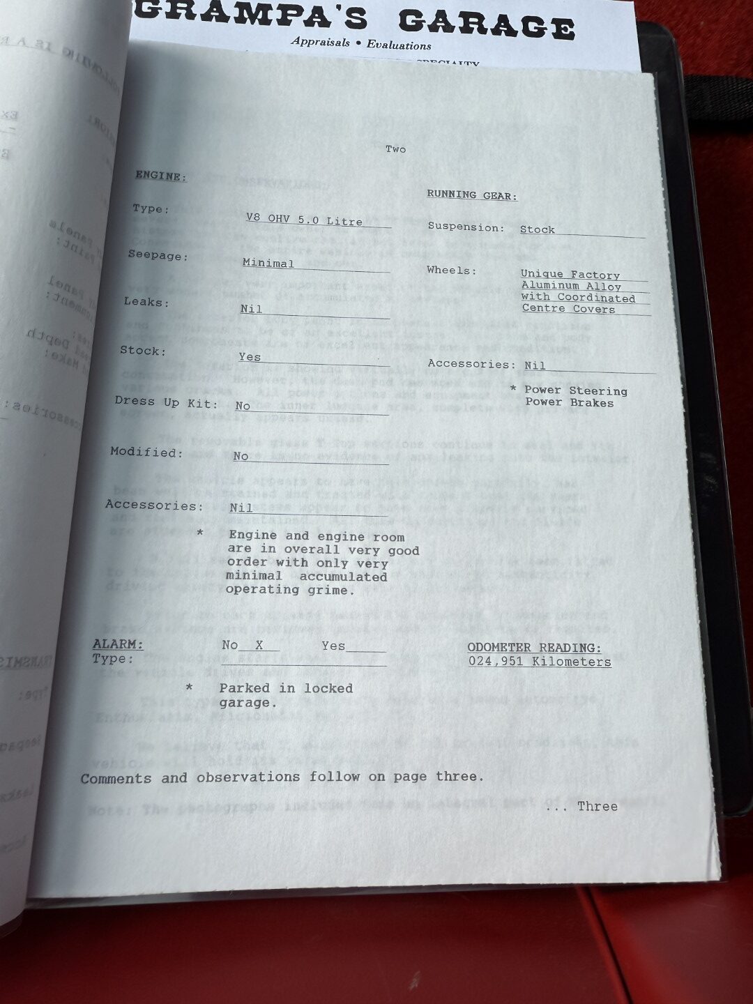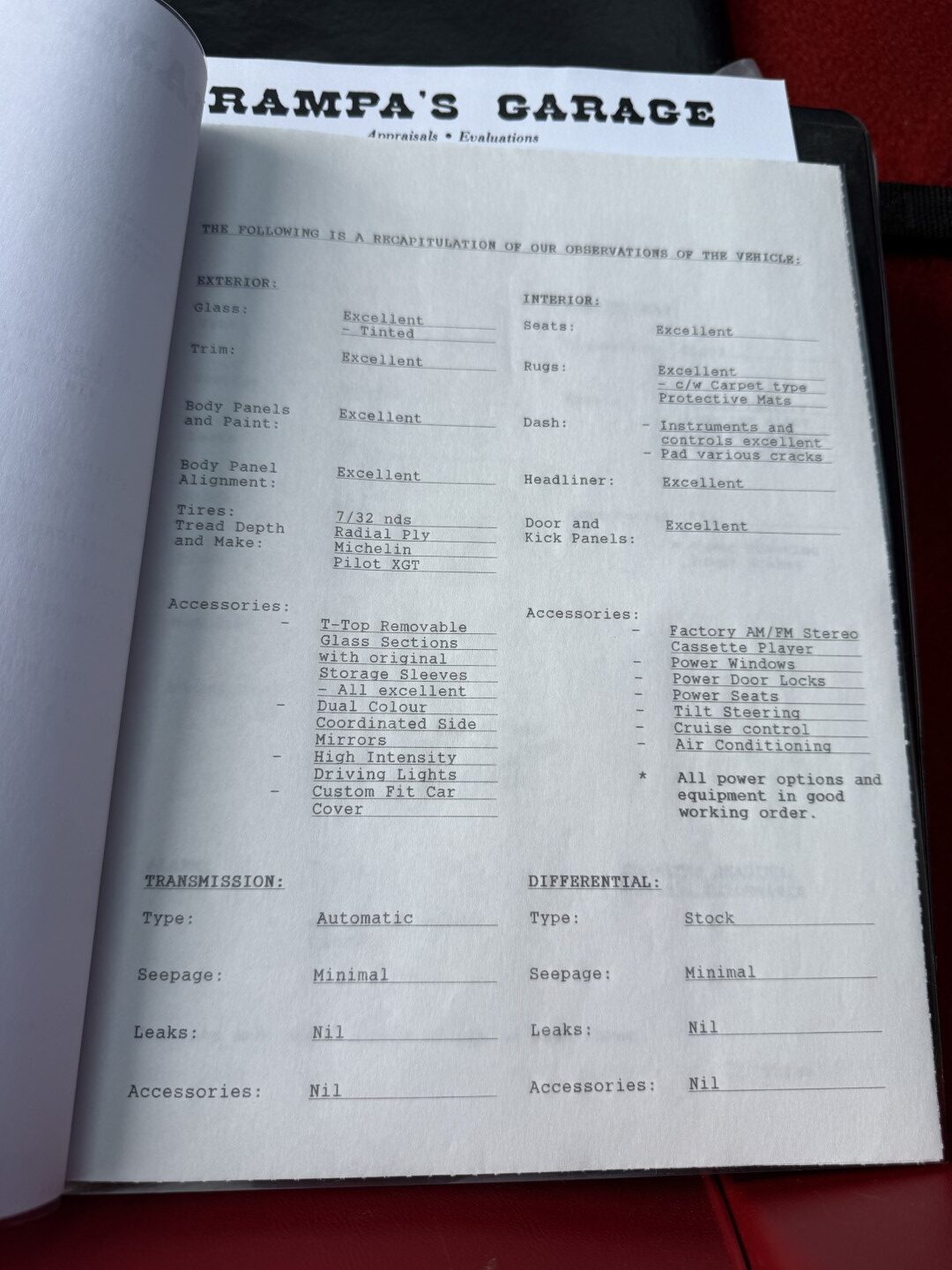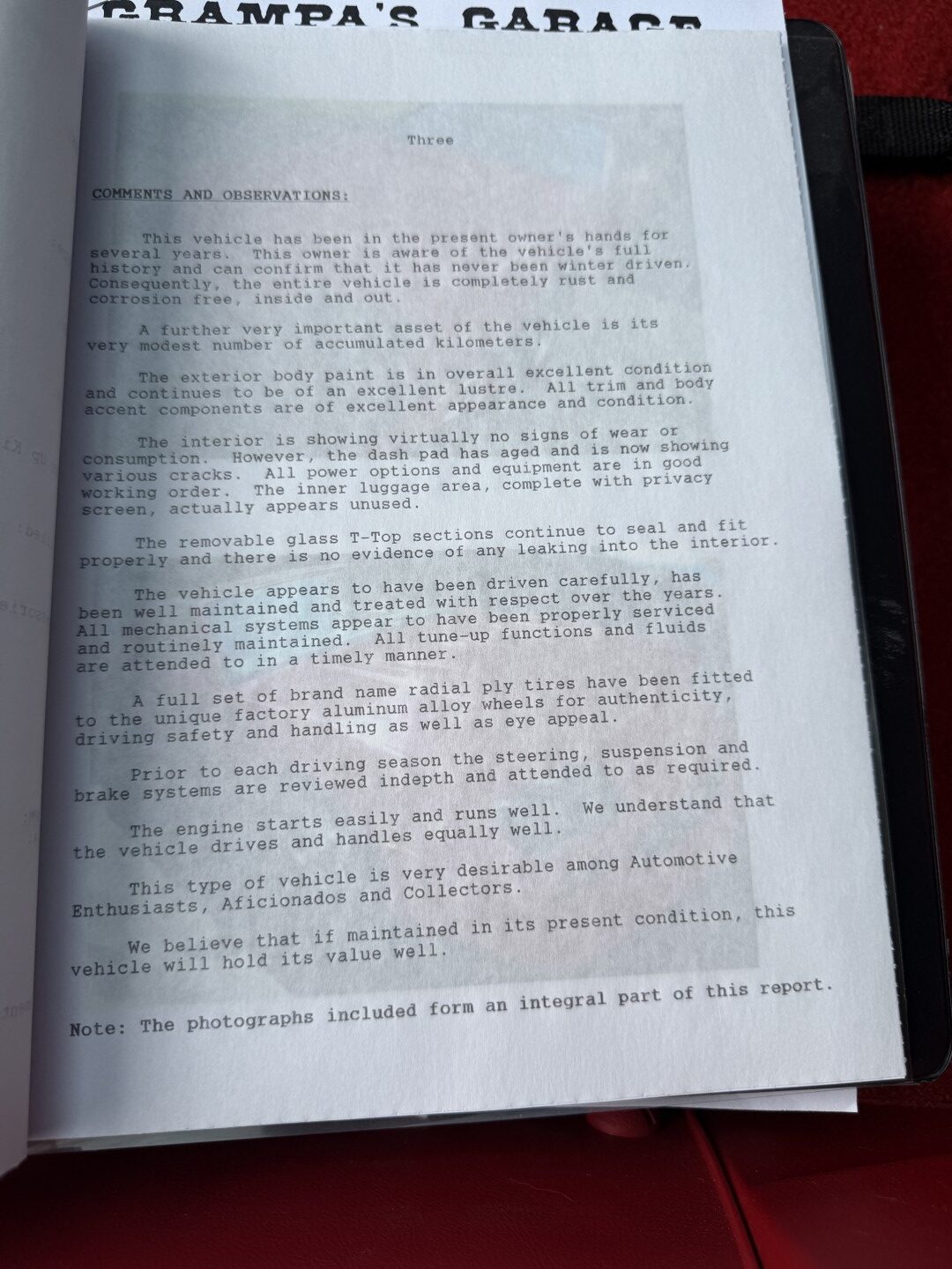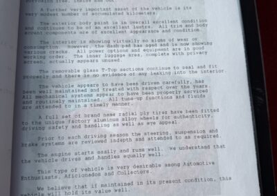 The car has always been stored indoors, and has never been winter driven. I’ve been careful about where it is driven, taking it out for a spin on roads I know are in good condition. I have all the documents for the car, including the original manual that car with it when it was a new purchase, an appraisal done back when the car was purchased by us, and again when I decided to sell it.