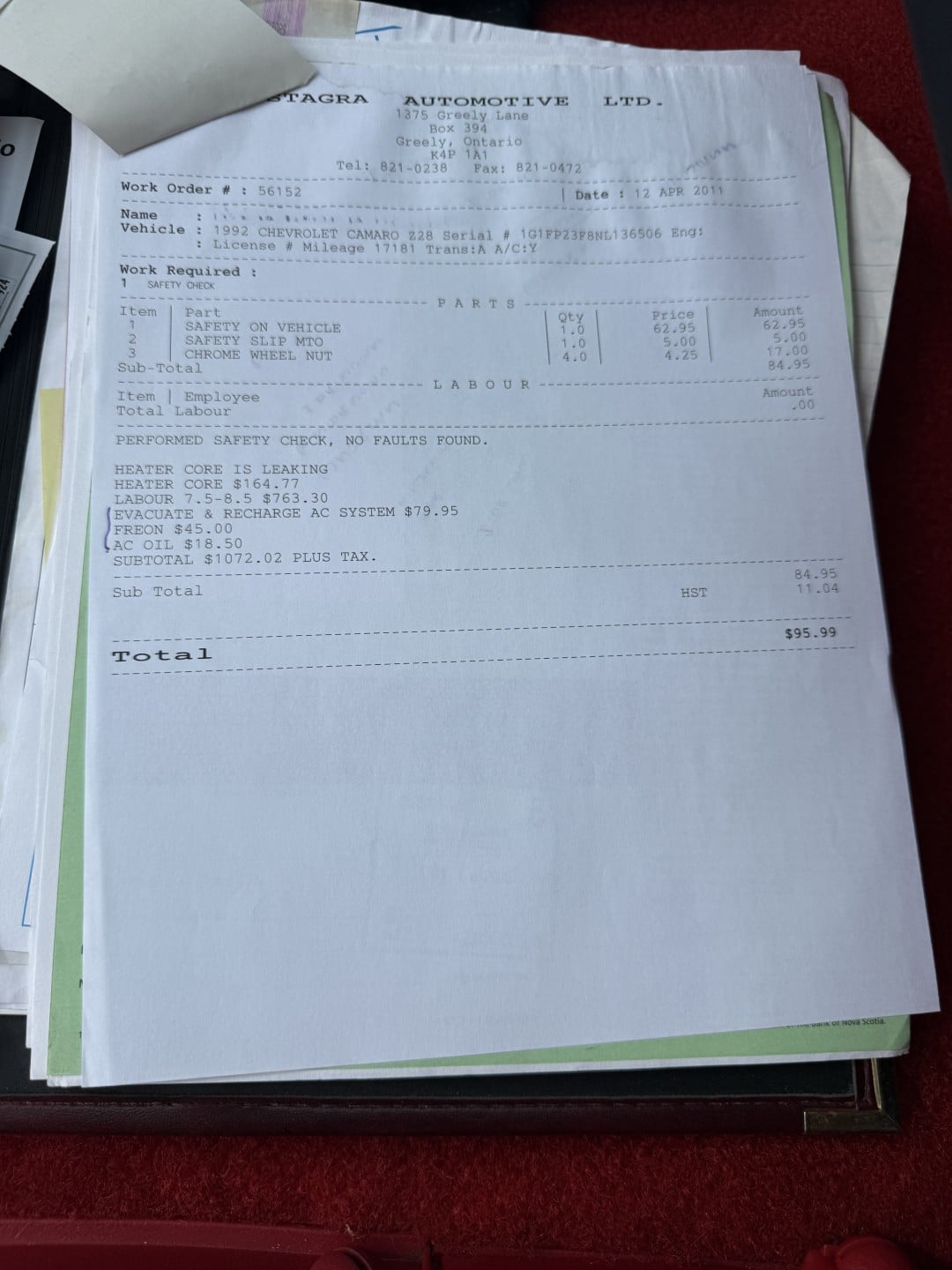 Straightliner asked about the leaking heater core, it is not leaking now (I don’t have the receipt for having it repaired). I had the garage double check, and the heater on the car works better than in my newer vehicles.
